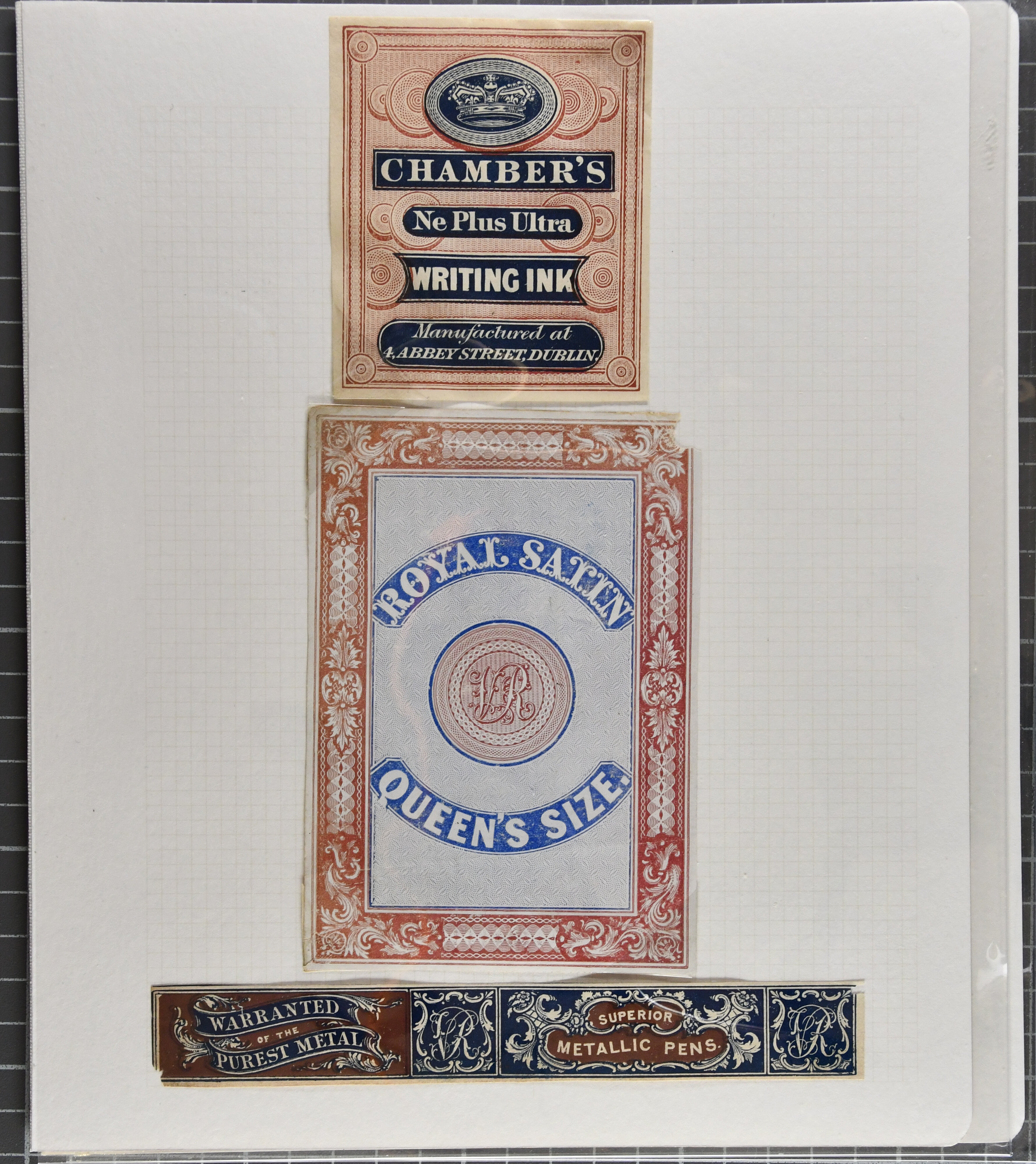 with a label for a pot of Writing Ink, printed in deep blue and brown, also printed by Charles Whiting. (Image 1)