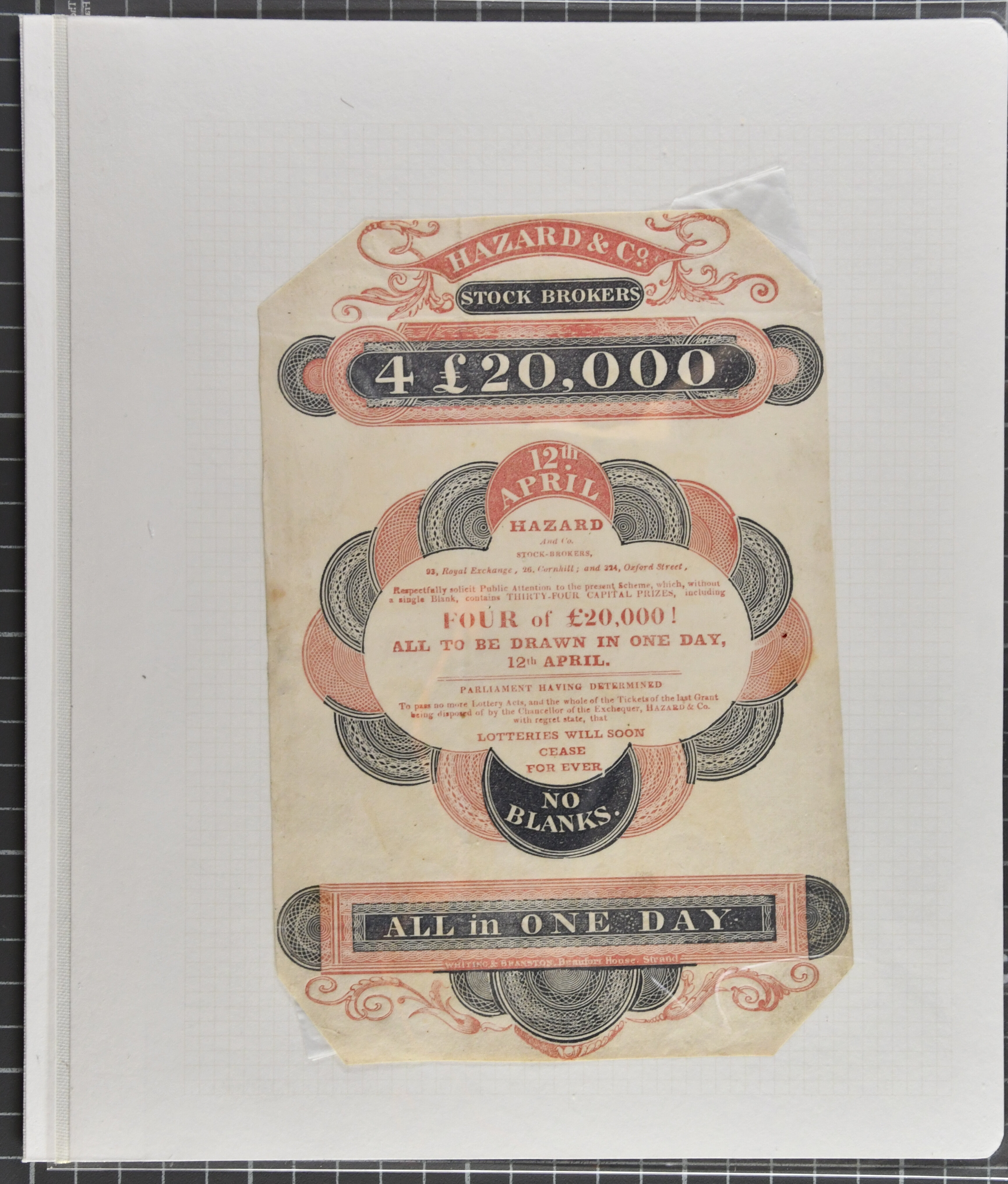 "Lotteries will soon cease forever" and imprints on each "Whiting & Branston, Beaufort House, The Strand" at base. Some edge wear but a charming pairing: the English State Lottery ran from 1594 and was closed in 1826; together with an album page
