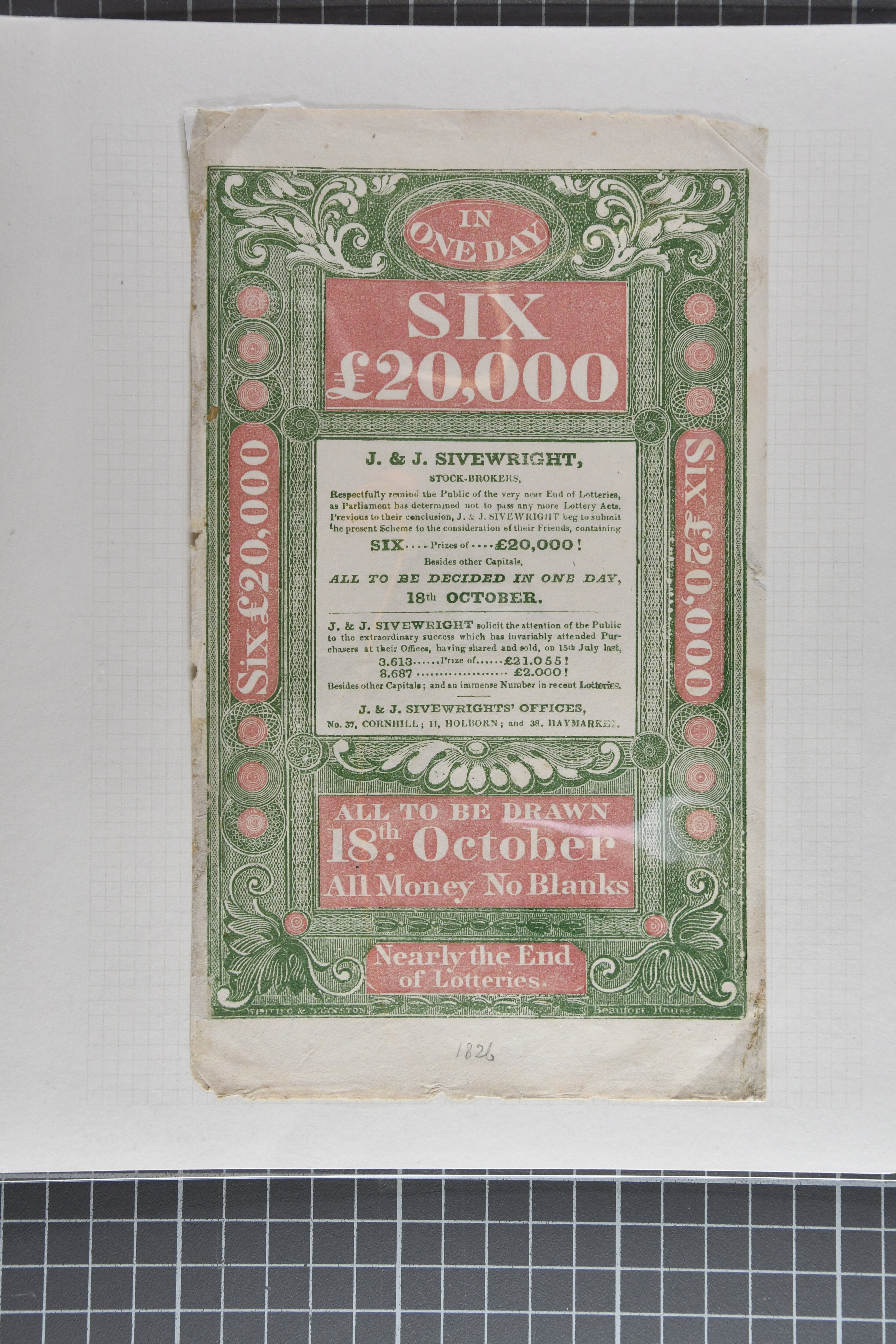 1826c.: Lottery Tickets (2), each showing engine-turned background by Charles Whiting; the earlier example printed in rose-pink & green with a top Prize of six £ 20'000 winning tickets, with the comment