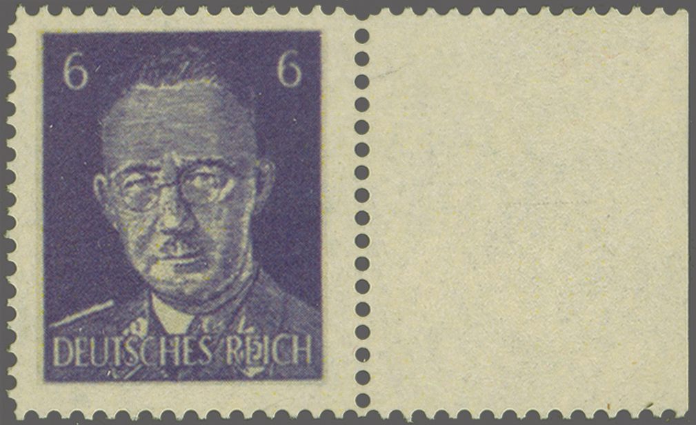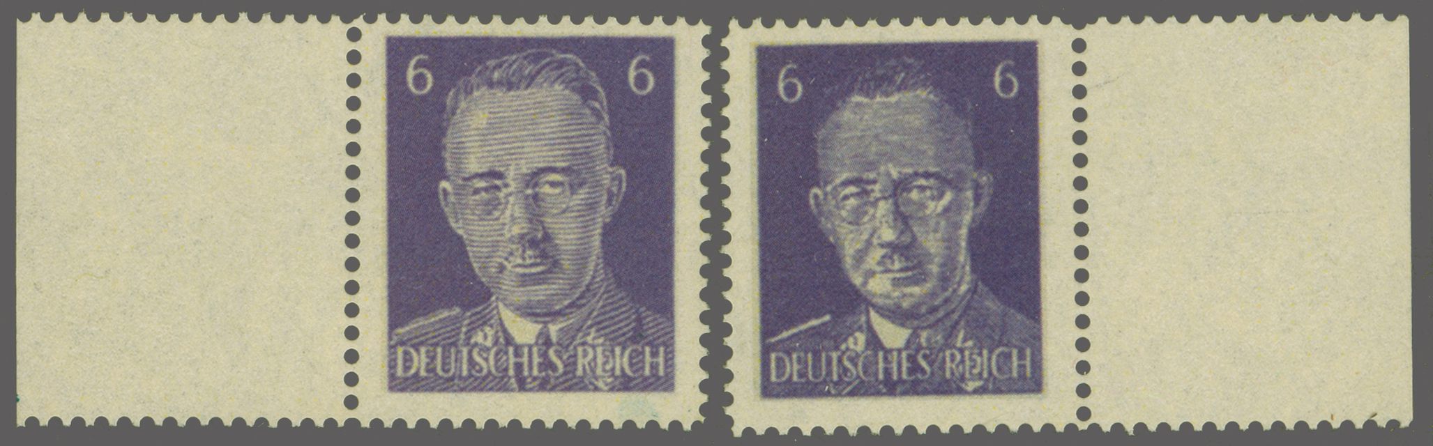 1701 imageKriegs- und Propagandafälschungen 1943: Himmler 6 Pf. violett im Buchdruck. Type I mit weiten Linien mit Bogentand links, Type II mit engen Linie mit Bogenrand links. Mi = € 3'000 (Image 1) (Image 2)