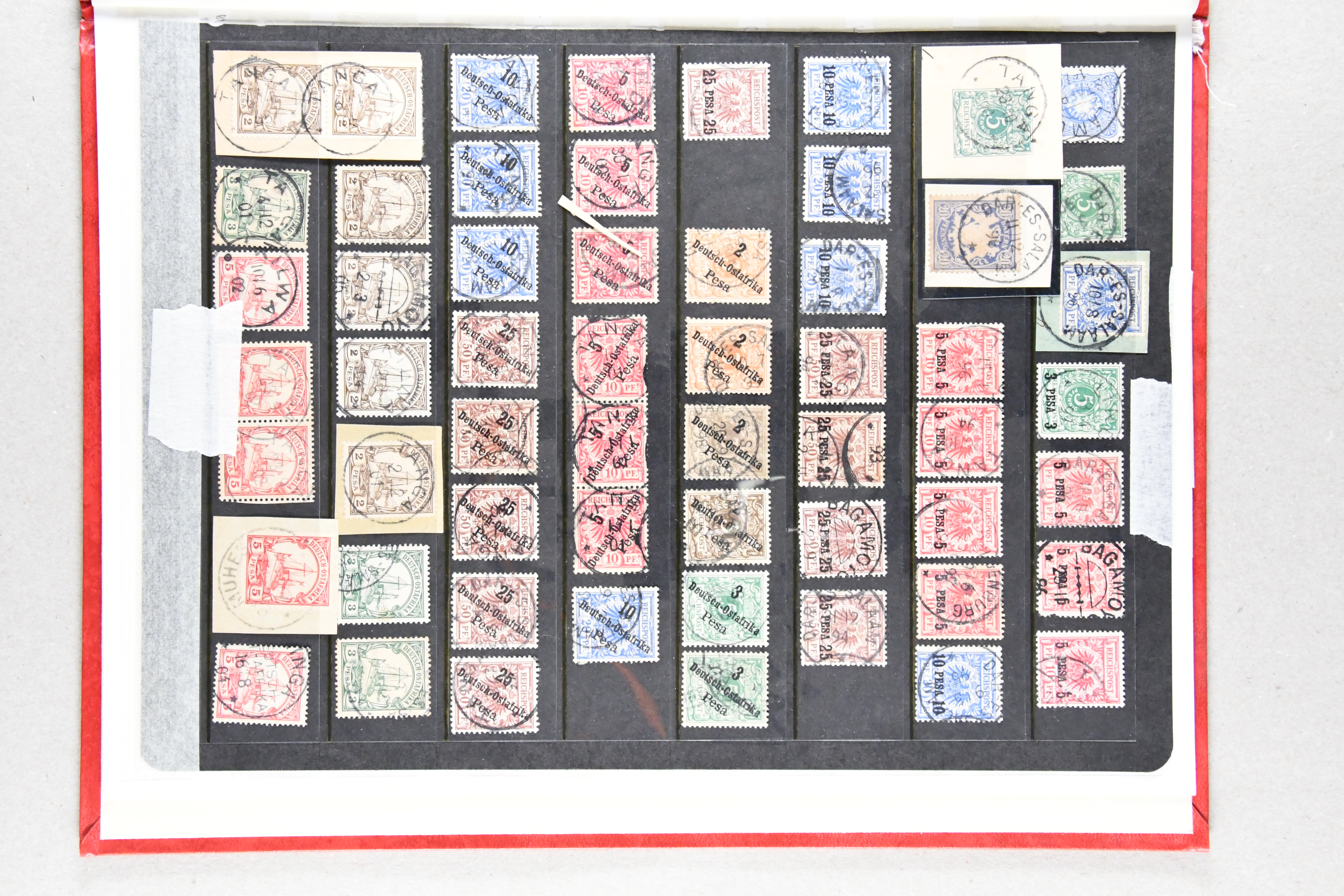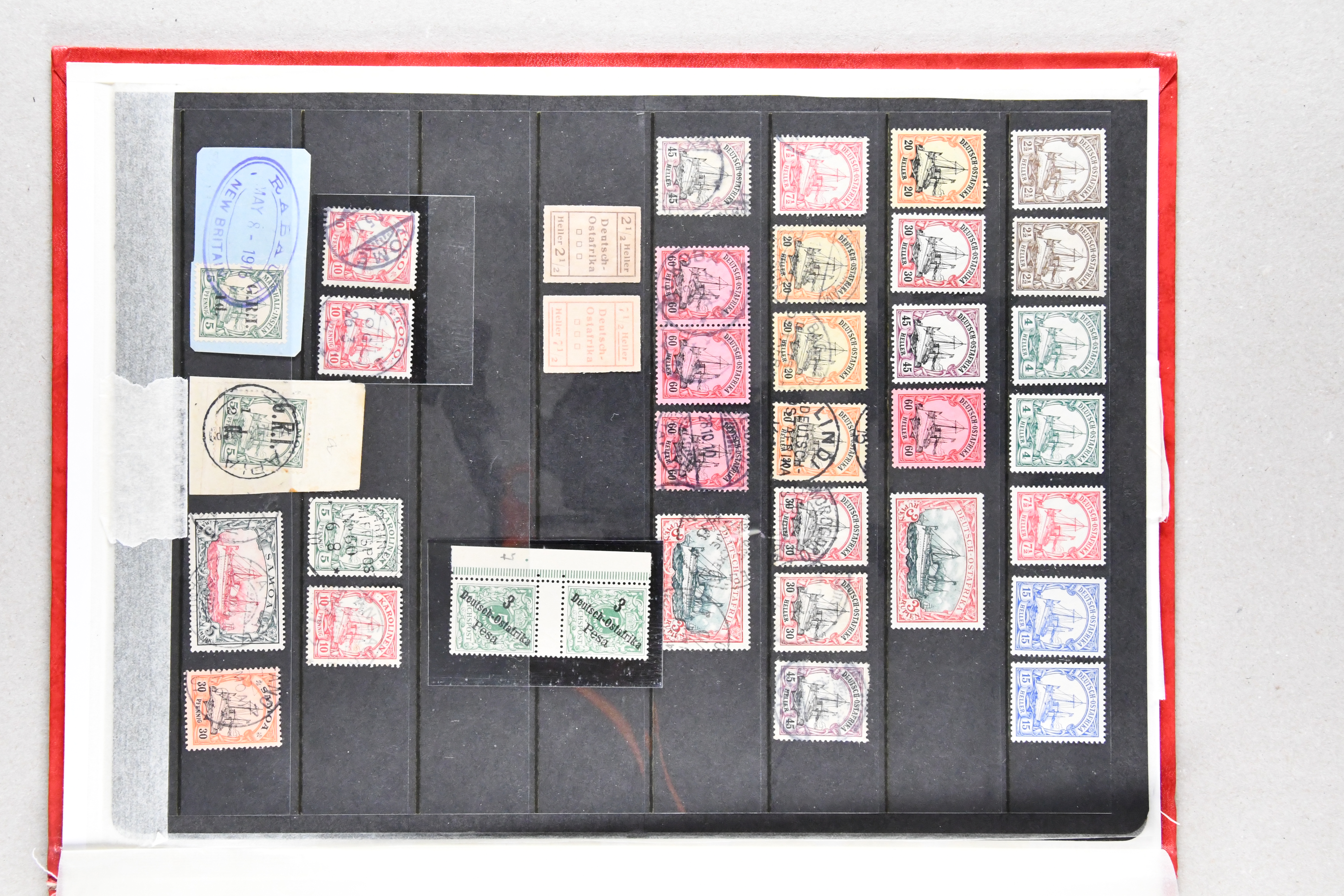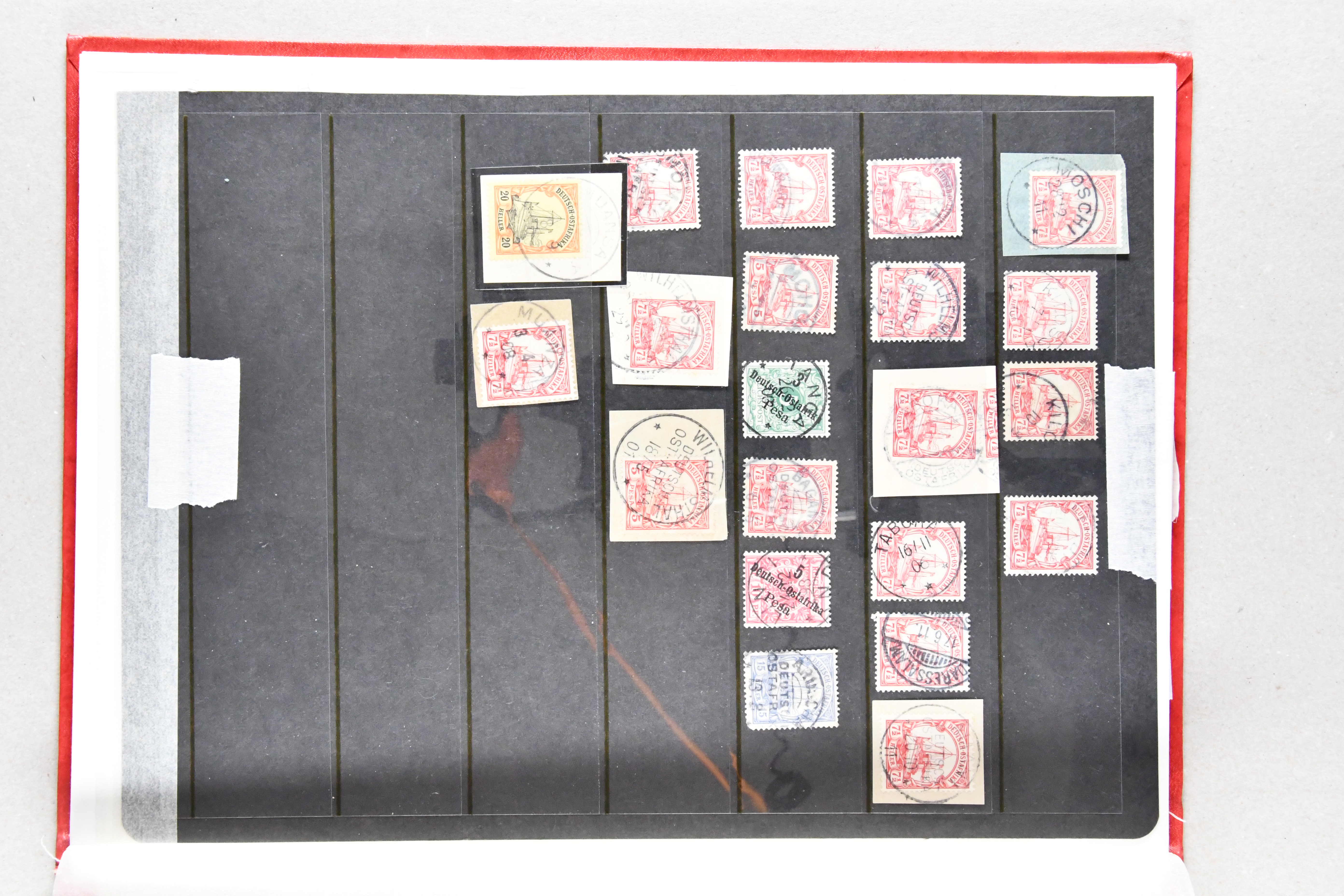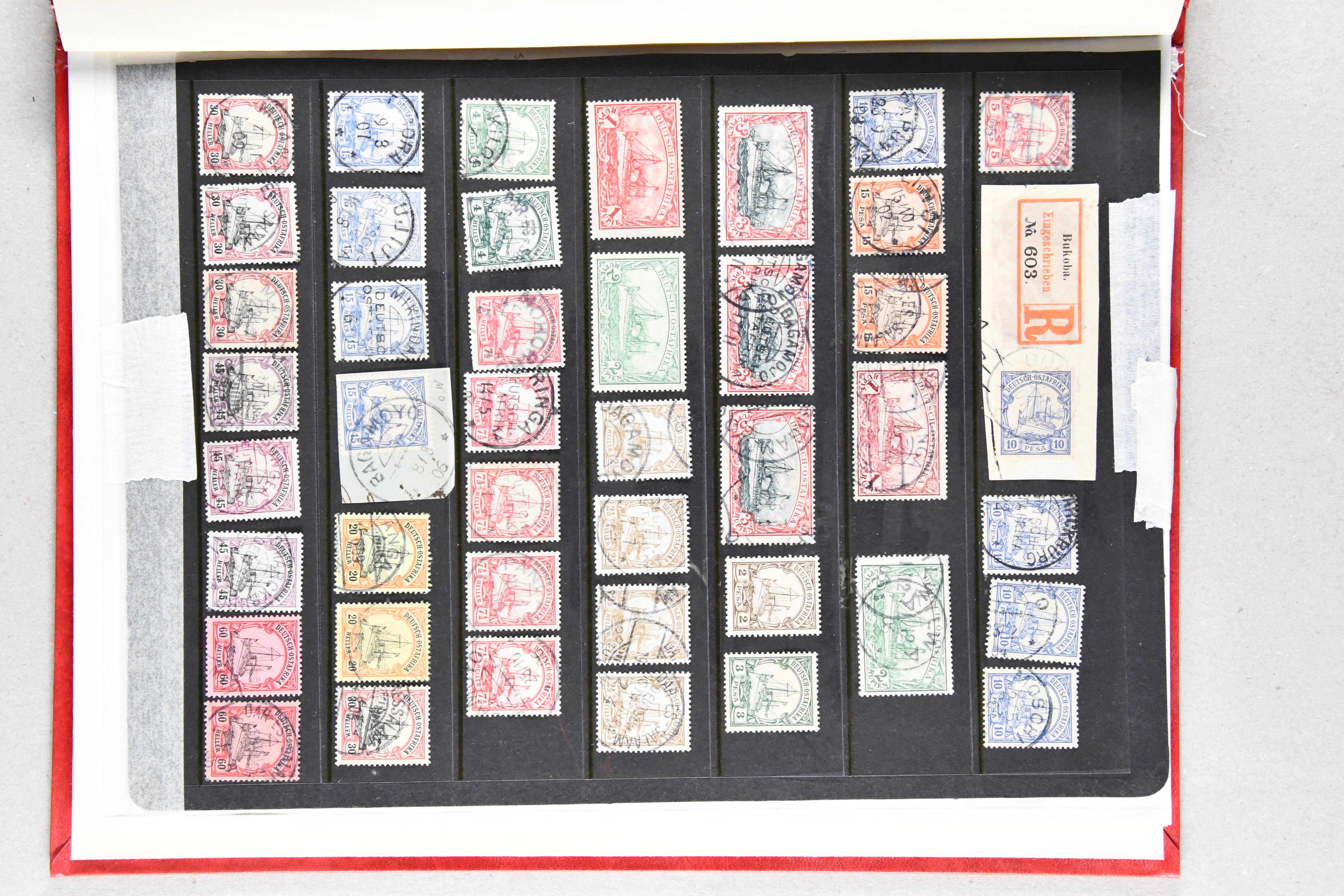 1812 image1891/1914ca: Lot 200 vorab gest. Marken / Briefstücke der deutschen Kolonialausgaben, vorab aus Deutsch-Ostafrika, dabei Mitläuferverwendungen in Lamu & Daressalam, auch auf Bayern, 1893/99 Aufdruckausgaben, Kaiseryacht bis zu 3 Rupien (4) mit Entwertungen auch von kleineren Ämtern wie BAGAMOJO oder KILWA, SONGEA in Violett auf 1905 45 H., WUGA-Ausgabe; weiterhin Marshall-Inseln Britische Besetzung 1 d. au 5 Pf. auf Briefstück mit ovalem "RABAUL / NEW BRITAIN" - Datumsstempel; Samoa mit Besetzungsausgaben. Ein vor allem für den Stempelsammler interessantes Los (Image 1) (Image 2) (Image 3) (Image 4)