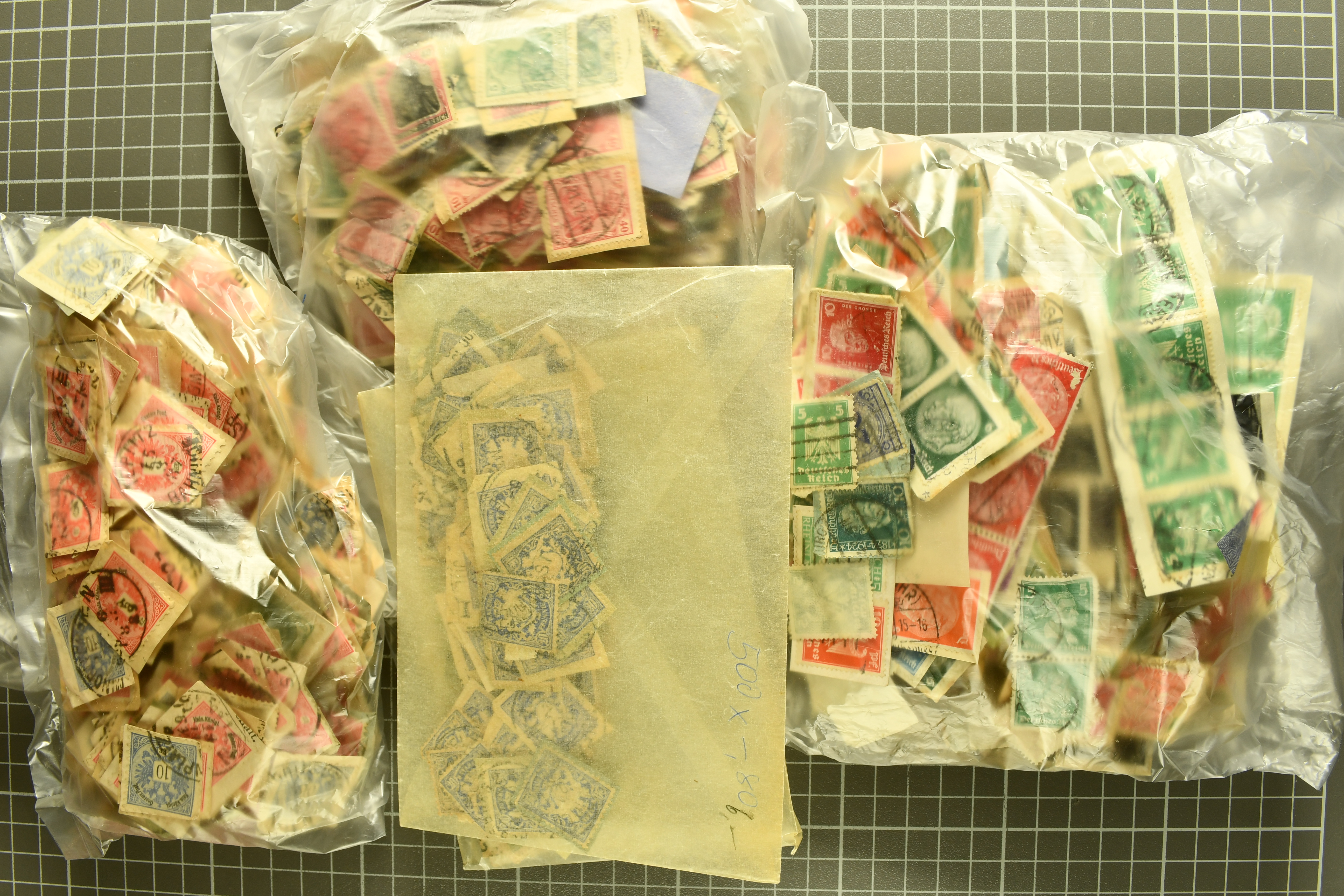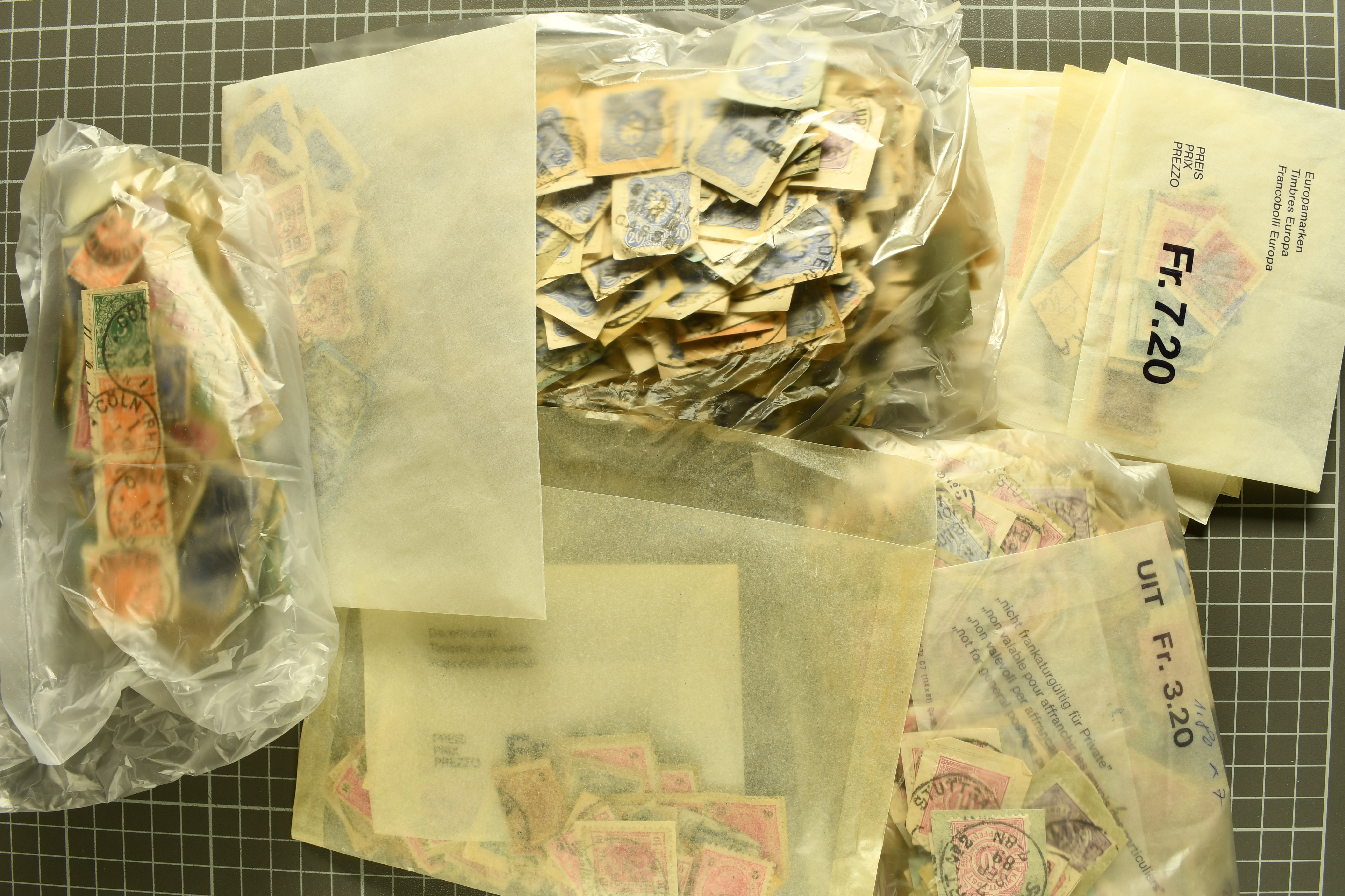 1702 imageSammlungen & Posten, 1872/1945: Posten Uraltkiloware aus dem Nachlass eines Schweiz-Sammlers (ca. 1,1 kg), mit Schwerpunkt auf der Pfennig-Ausgabe (Werte zu 5, 10, 20 und 25 Pfg., vorsortiert in Beuteln), dazu Krone/Adler sowie zeitgleiche Ausgaben von Bayern und Württemberg. Ferner Inflations- und Weimarer-Republik-Ausgaben, vereinzelt auch Bauten und andere Nachkriegswerte. Ebenfalls enthalten: ein Beutel mit Österreich. Ergänzt durch ein Doublettenalbum Deutsches Reich ab Brustschild-Ausgaben (bessere Infla gesehen) bis Ende Weimar. Durchaus fundträchtig (Image 1) (Image 2) (Image 3) (Image 4) (Image 5) (Image 6) (Image 7) (Image 8) (Image 9) (Image 10) (Image 11) (Image 12) (Image 13) (Image 14) (Image 15) (Image 16) (Image 17) (Image 18) (Image 19) (Image 20) (Image 21) (Image 22) (Image 23) (Image 24)