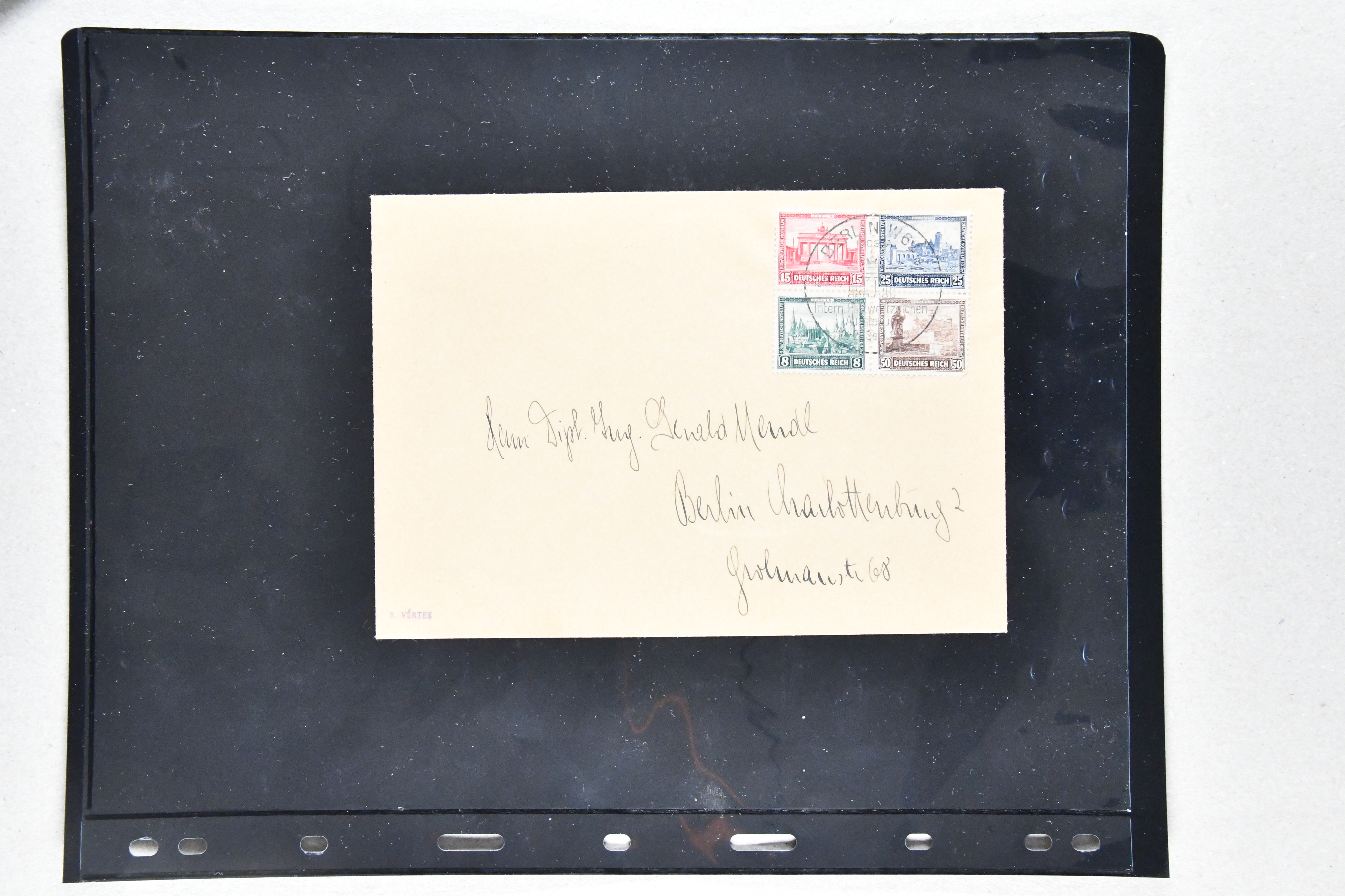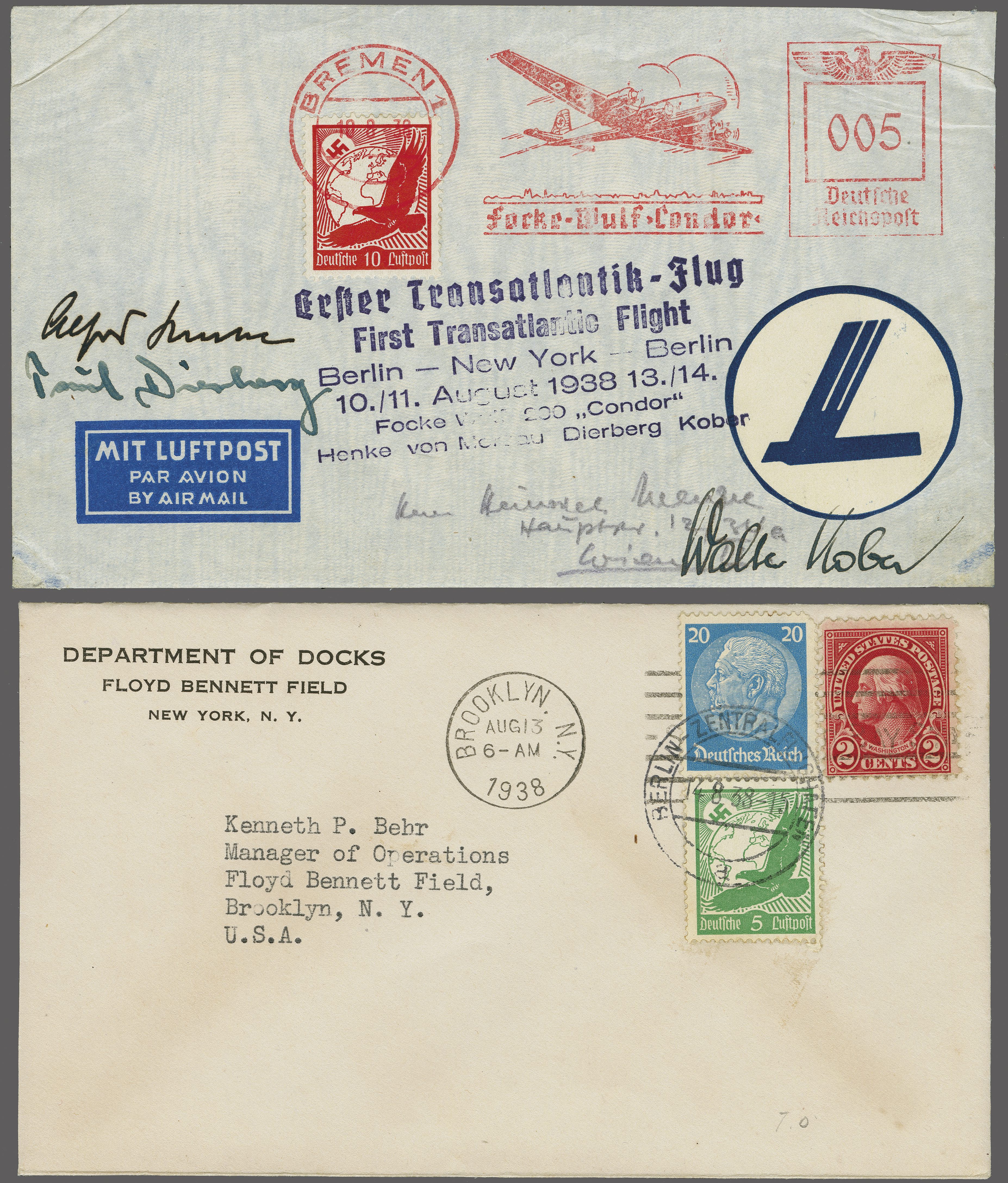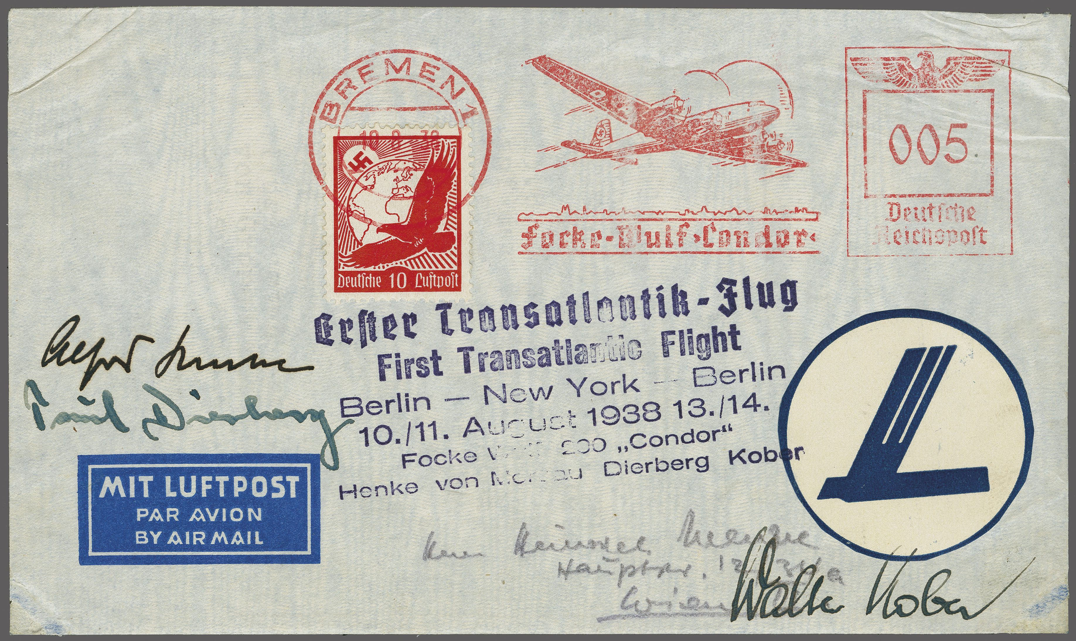 1713 cover imageFirst Transatlantic Flight / Berlin - New York - Berlin Focke Wulf 200 'Condor' 1938 (August 10./11.): Airmail envelope franked with 10 Pfg. airpost tied by "Focke - Wulf - Condor - 008 (Pfg.) Bremen 1 10.8.38", signed by crew Alfred Henke, Hptm. Rudolf von Moreau (2nd Pilot), Paul Dietbergand Walter Kober, together with envelope the return flight (Aug. 13) with US and German mixed franking of 2c US for printed matters and 25 Pfg. UPU rate, tied on arrival "Berlin Zentralflughafen 14.8.38-15". Fine and scarce (Image 1) (Image 2)