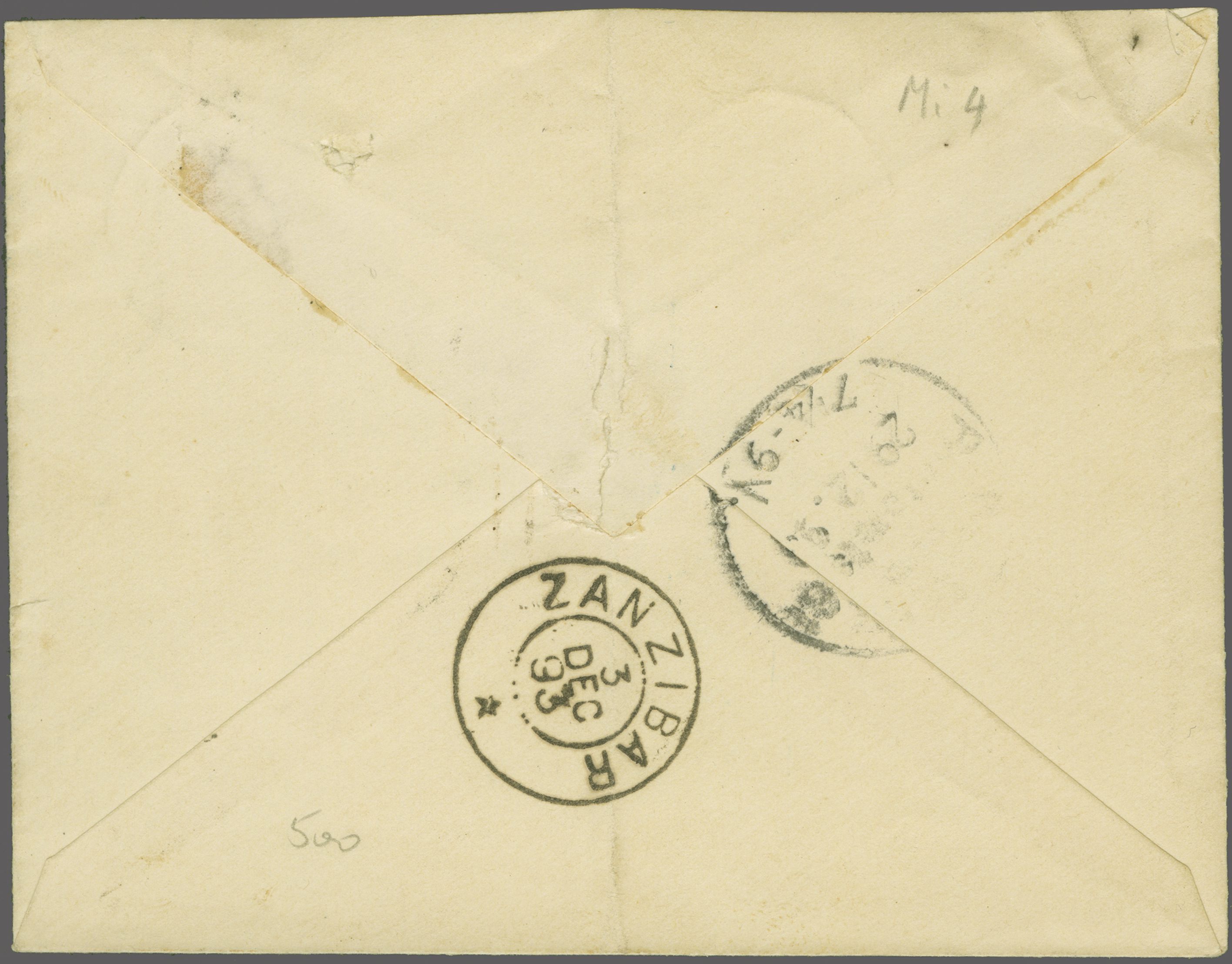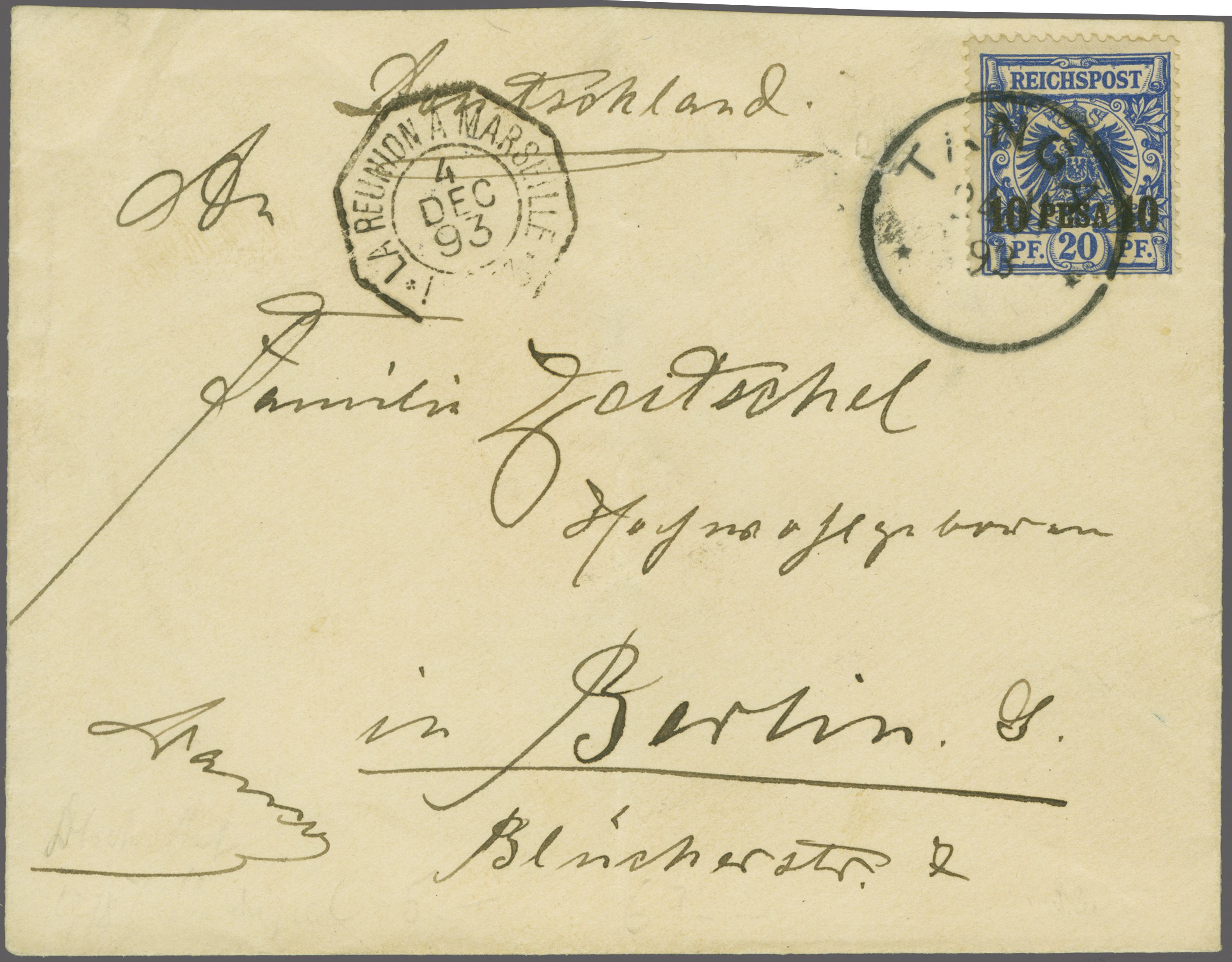 5196 cover imageDeutsch-Ostafrika 1893 (24. Nov.): Umschlag von Tanga nach Berlin frankiert mit 1893 10 P. / 20 Pf. ultramarin, entw mit Einkreiser TANGA, rücks. Zweikreiser ZANZIBAR, transportiert mit franz. Schiffspost "LA REUNION A MARSEILLE" (4. Dez.) sowie rücks. Ausgabestp. vom 29. Dezember (Image 1) (Image 2)