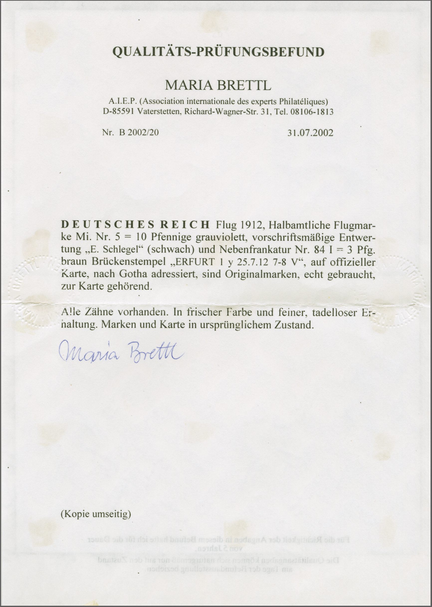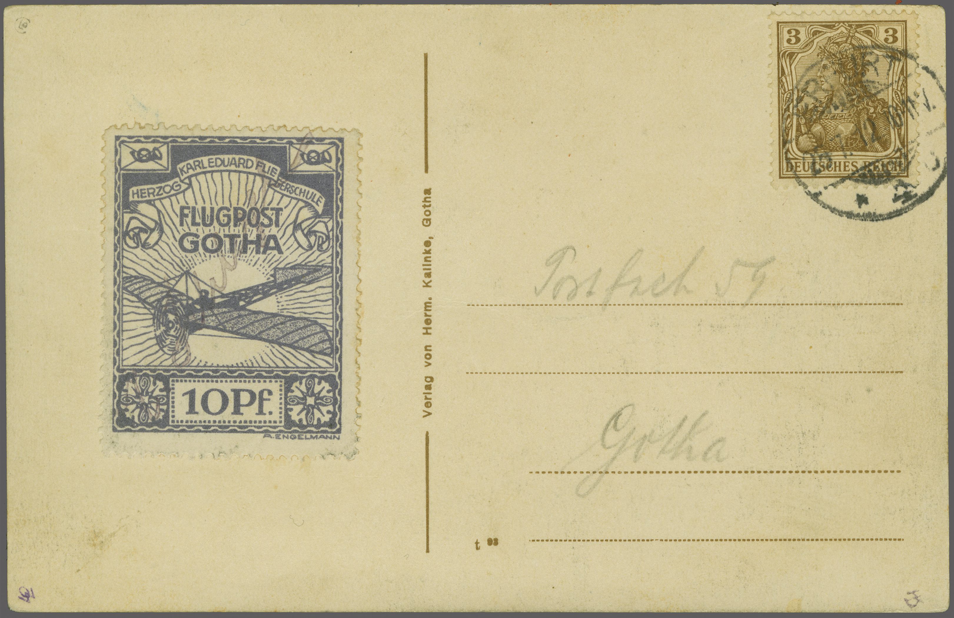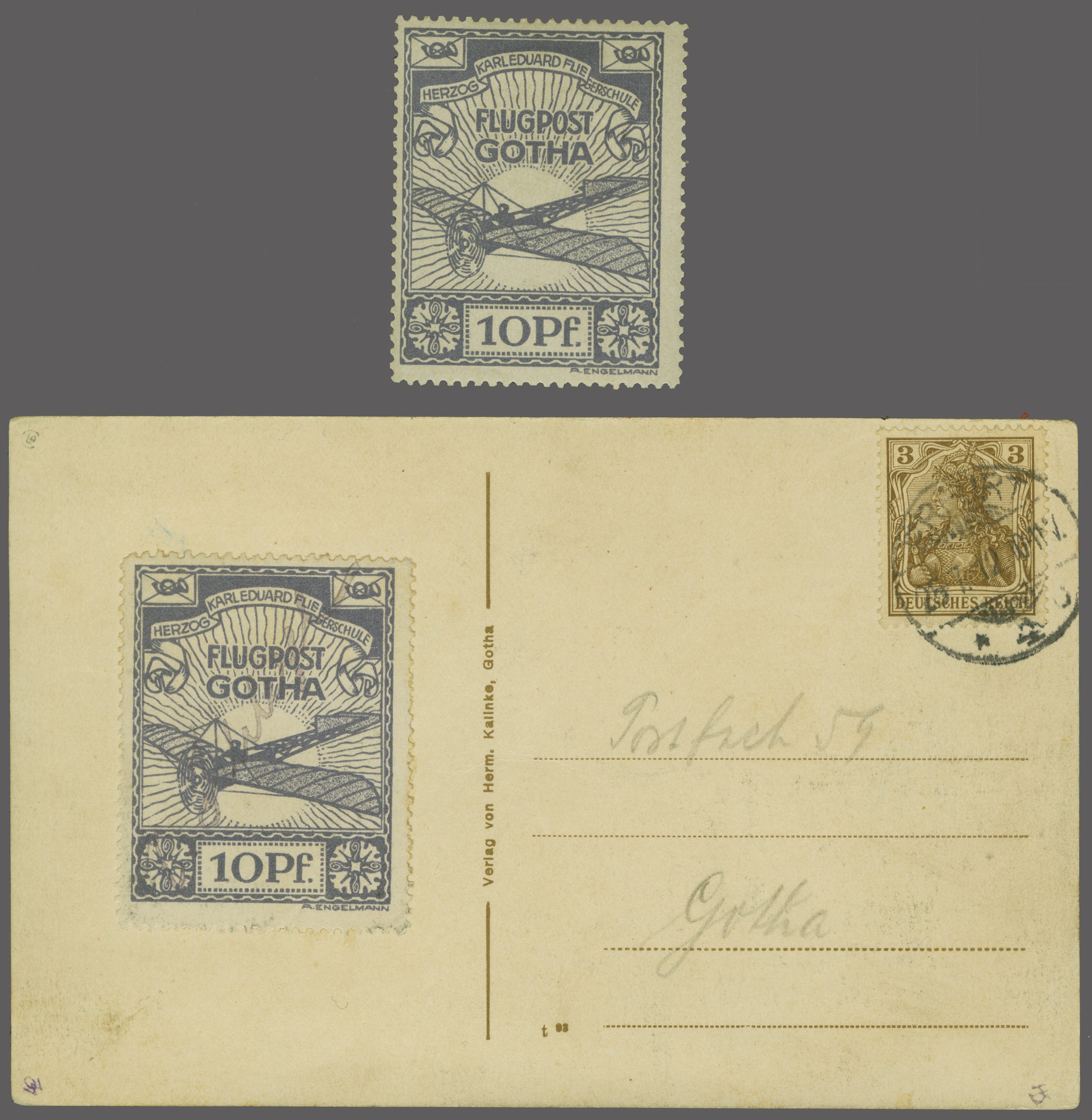 1708 cover image1912 (25. Juli): Flugpost Gotha 10 Pf. grauviolett mit etwas ausgebleichter Signatur 'E.Schlegel' zusammen mit Germania 3 Pf. gest. "Erfurt 25.7.12 10-11V" auf offiz. Ansichtskarte 'Ing. Schlegel, Leiter der Offizier-Fliegerschule Gotha', dazu ungebr. Vignette 10 Pfg. grauviolett, mit leicht gebräuntem Gummi und kl. Falzstelle. Die Karte mit Attest Brettl (2002) Mi PF 5+14.01 = € 1'600+. Ex. The ‘Izhak Barak’ Collection: The Development of Aviation and Transportation of Mail by Air until 1914 (Image 1) (Image 2) (Image 3)