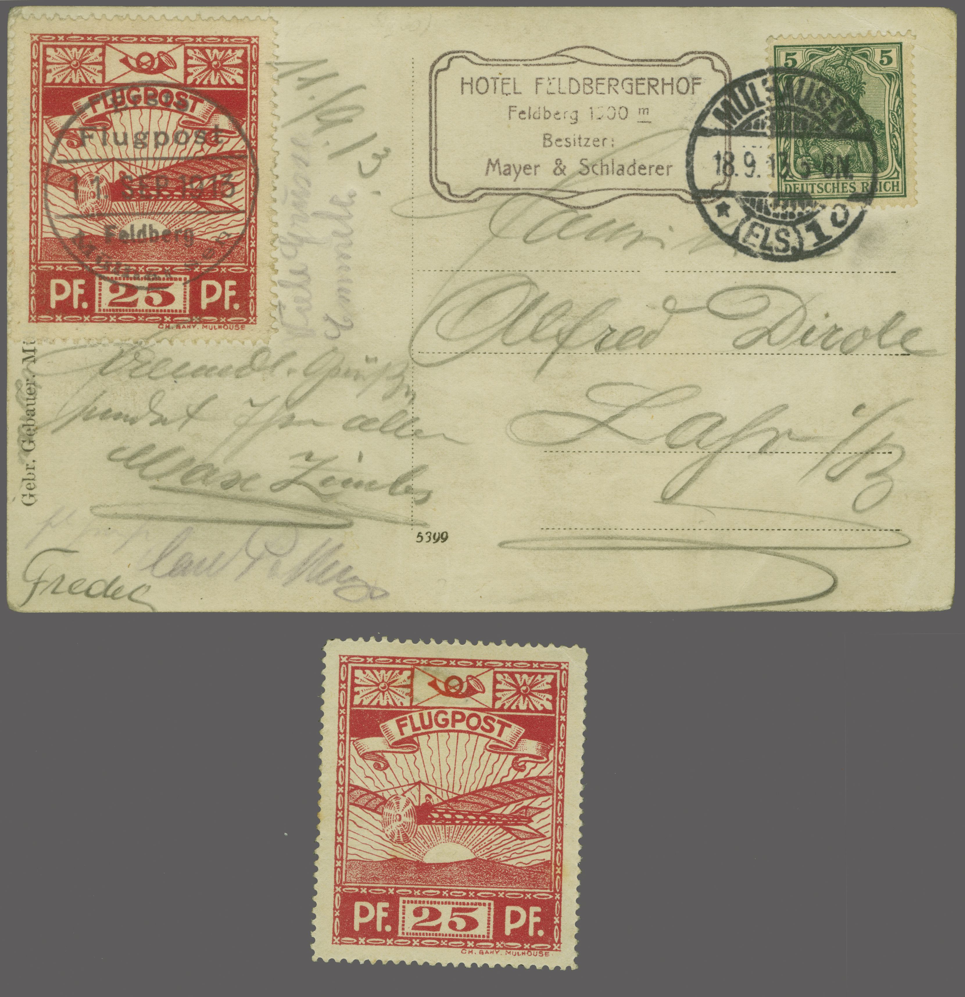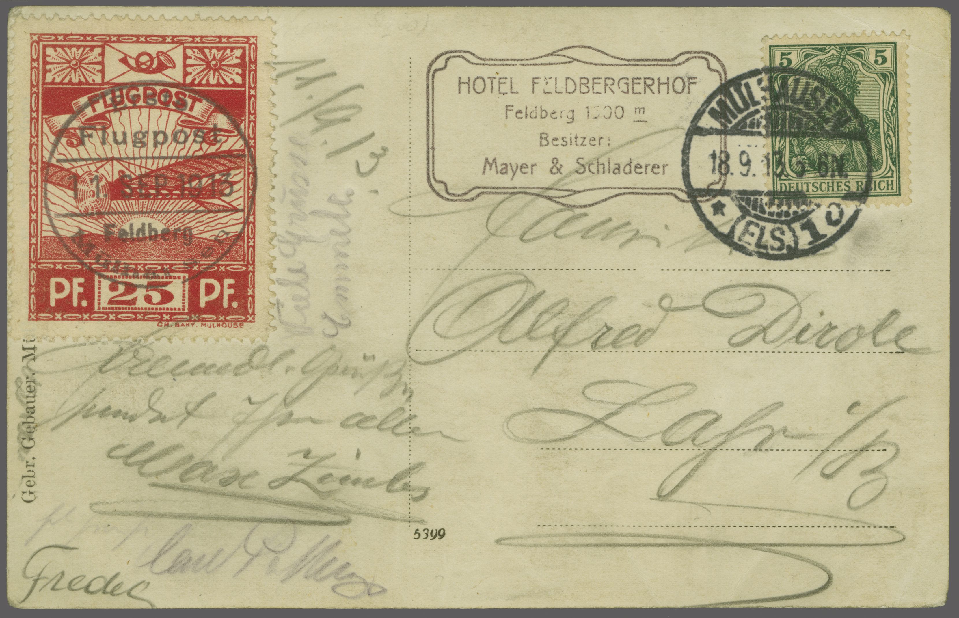 1710 cover image1913 (11. Sept.): Flug Feldberg - Mühlhausen, 25 Pfg. rot mit Stempel "Erste Flugpost 11. SEP 1913 Feldberg Mühlhausen" auf Fotokarte "G.Faller vor Flugmaschine" (auf Fotoseite eigenh. signiert) und Grussbotschaft, mit Zufrankatur Germania 5 Pfg. gest. "Mühlhausen (Els.) 18.9.13 5-6N" nach Lahr. Dazu ungebr. Vignette, rücks. etwas klimatisch gebräunt mit Falz, Karte in frischer Erhaltung. Mi. = Euro 2'100. Ex. The ‘Izhak Barak’ Collection: The Development of Aviation and Transportation of Mail by Air until 1914 (Image 1) (Image 2)