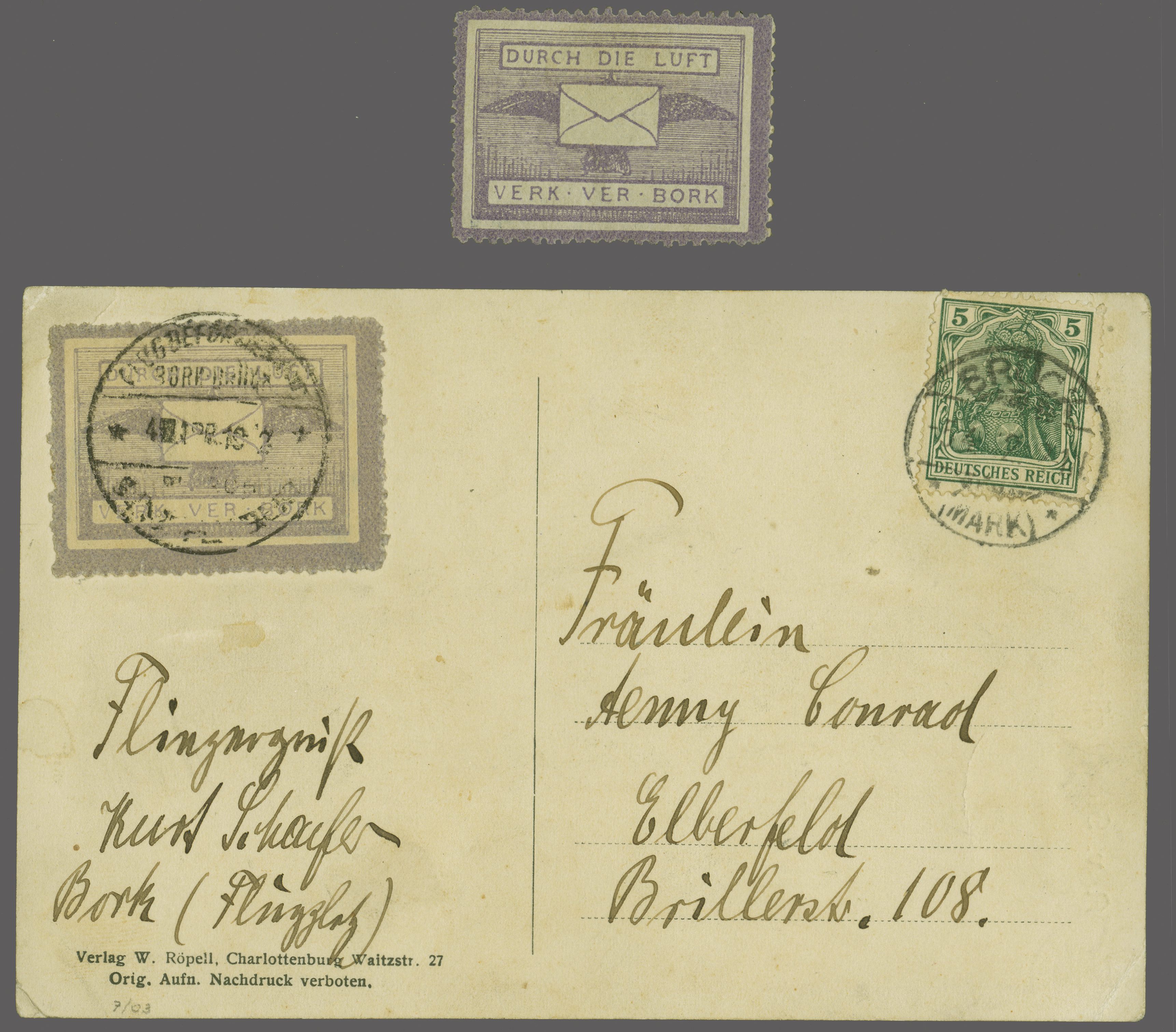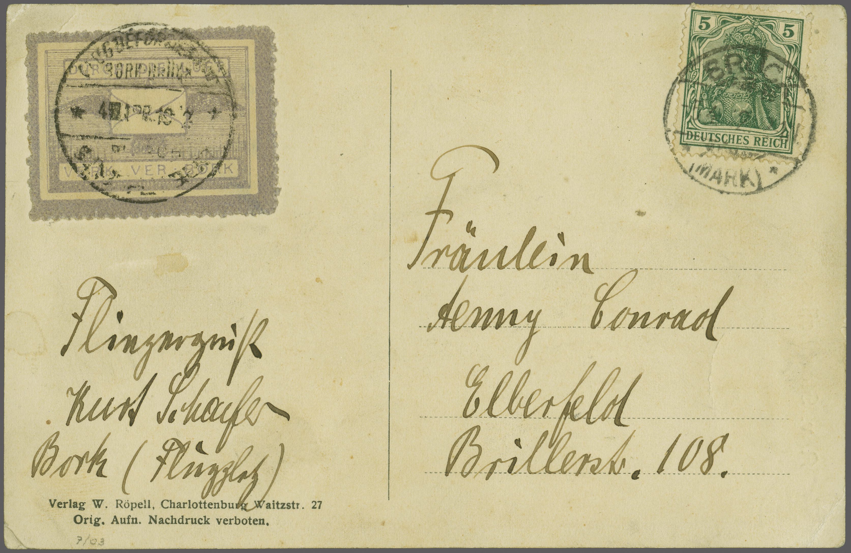 1707 cover image1912 (3./4. März): Flugpost Bork-Brück, 2. Ausgabe gezähnt, ungebraucht mit Gummi und Erstfalz, dazu Flugkarte mit Vignette, zentr. und leicht übergehend gest. mit Flugstp. 'Erste Flugpostbeförderung durch Gradeflieger von Bork nach Brück' (Typ e) zusammen mit 5 Pfg. Reichspostfrankatur etwas schwach gest. "Brück (Mark) 5.4.12" auf Fotokarte 'A.v. Stoephasius' mit Flugstp. Typ f in Schwarz. Leichte Patina, sonst in einwandfreier Erhaltung Mi = 2'500. Ex. The ‘Izhak Barak’ Collection: The Development of Aviation and Transportation of Mail by Air until 1914 (Image 1) (Image 2)