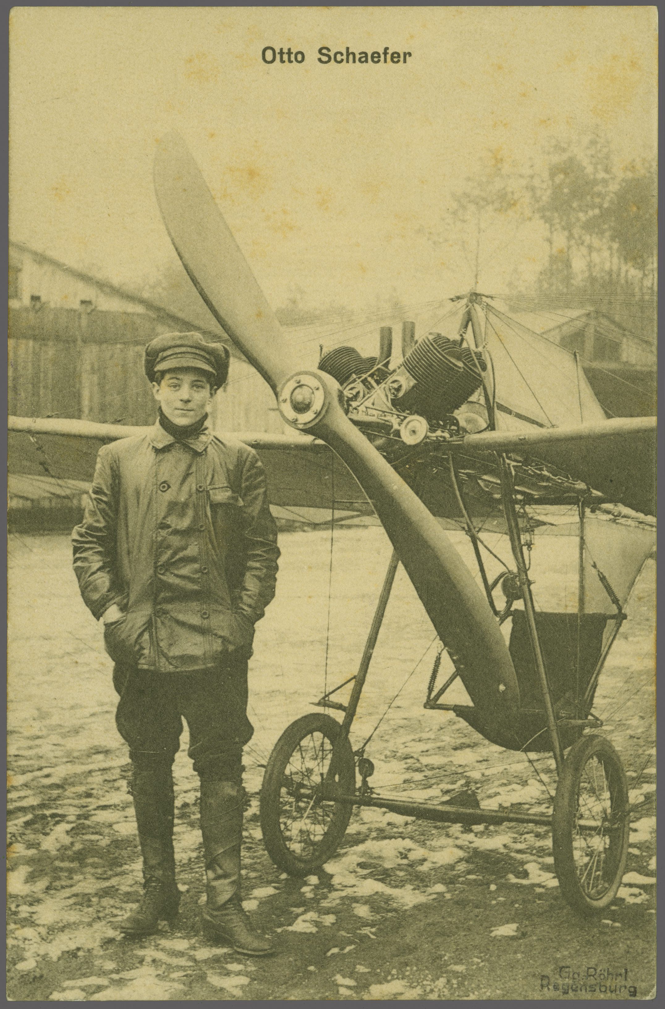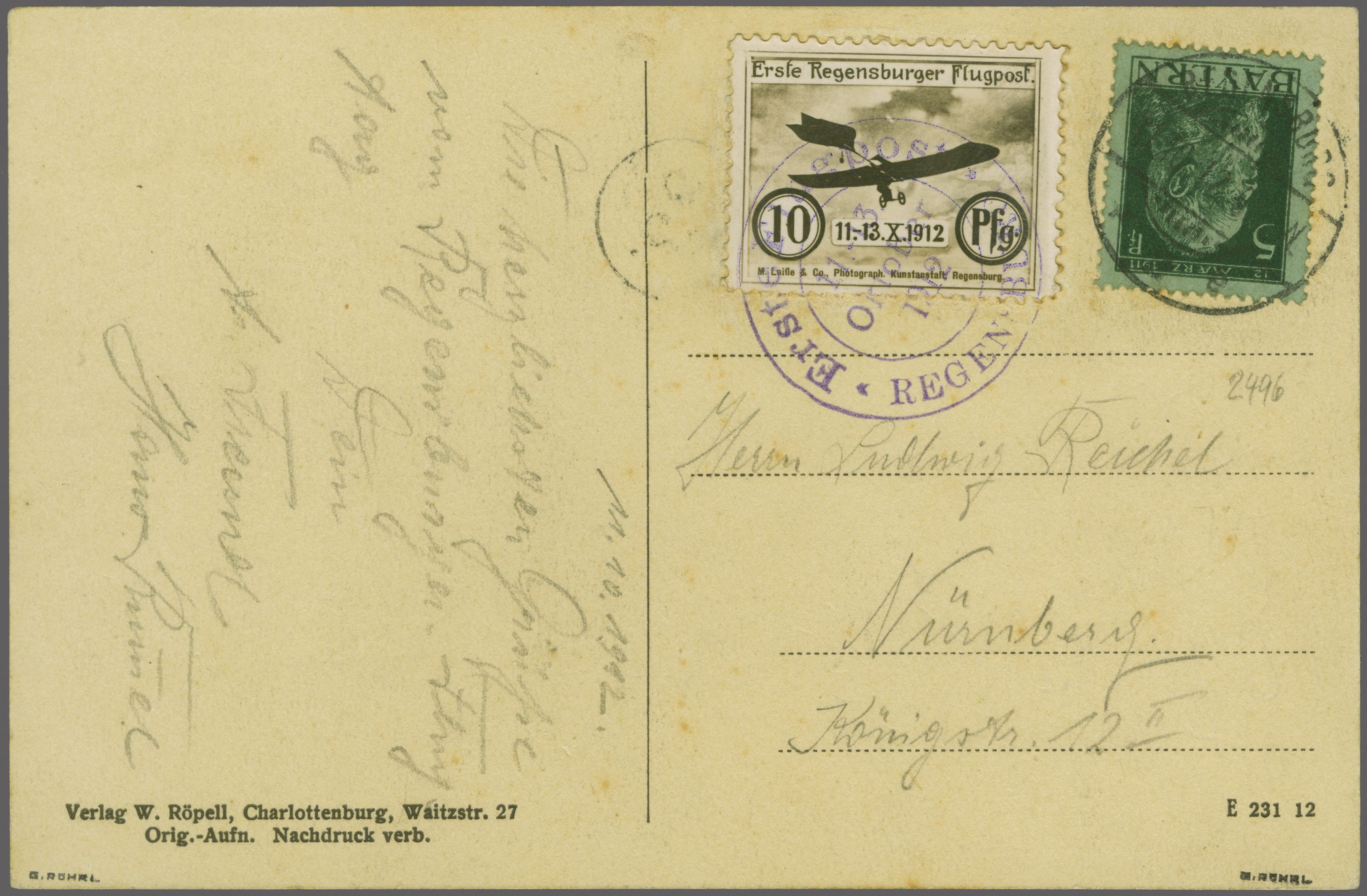 1709 cover image1912 (11. Okt.): Regensburger Fliegertage 10 Pfg Fotodruck-Marke mit violettem Flugstempel "Erste Flugpost Regensburg 11-13.Oktober 1912" auf Fotokarte "Otto Schäfer" vor seinem Monoplan, frankiert mit Bayern Luitpold 5 Pfg gest. "REGENSBURG 11.10.12", in guter Gesamterhaltung. Mi. 6 = Euro 2'000. Ex. The ‘Izhak Barak’ Collection: The Development of Aviation and Transportation of Mail by Air until 1914 (Image 1) (Image 2)