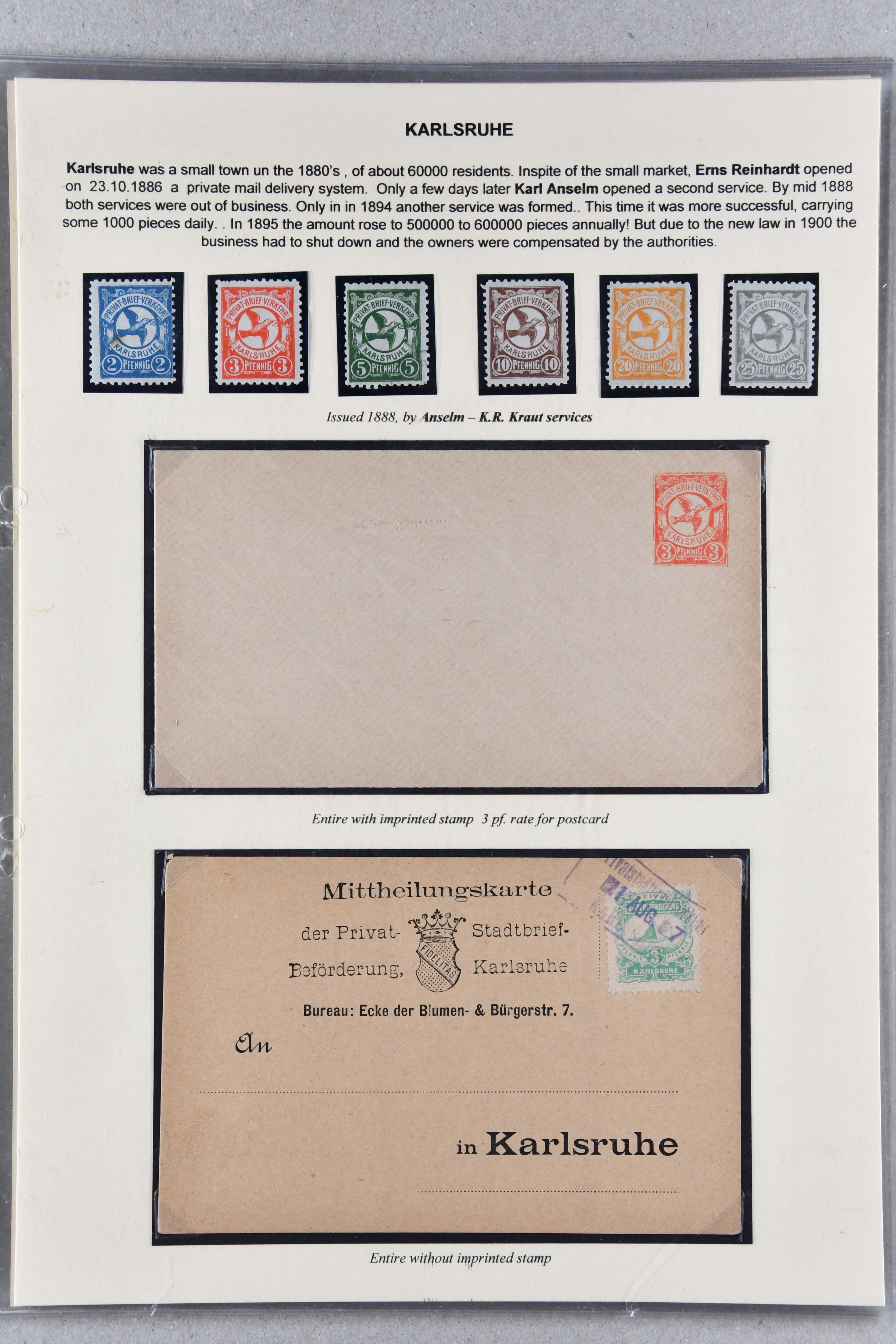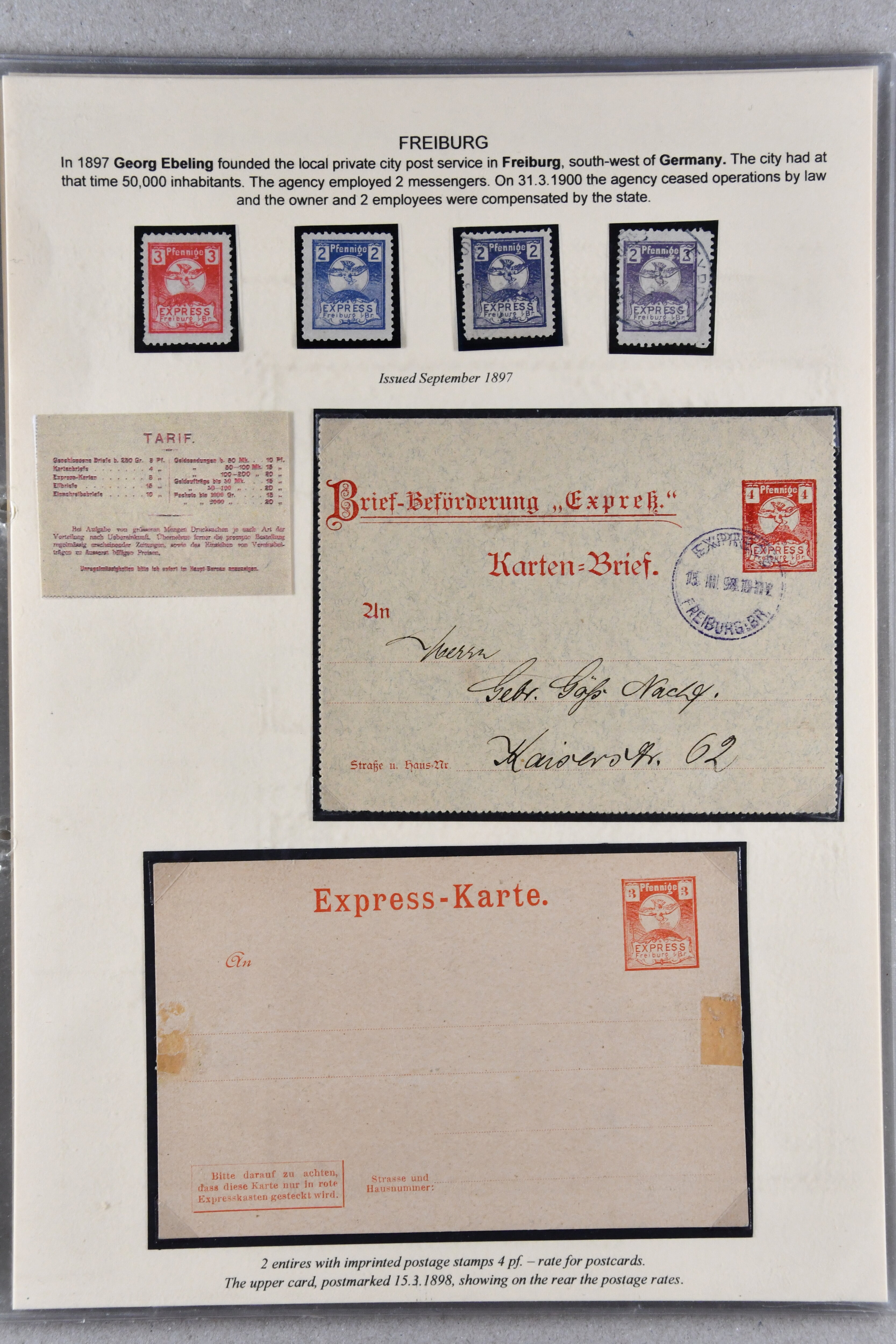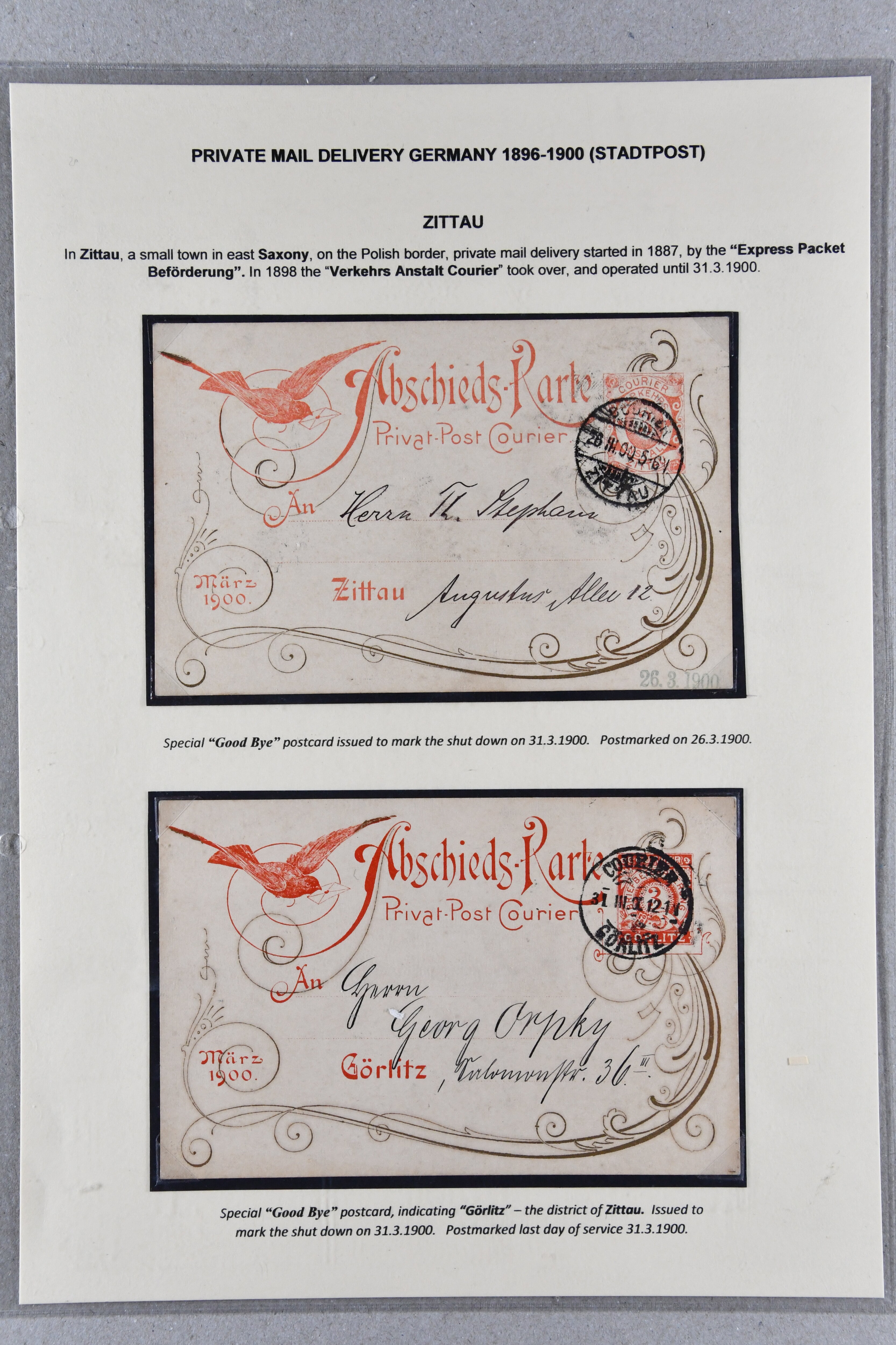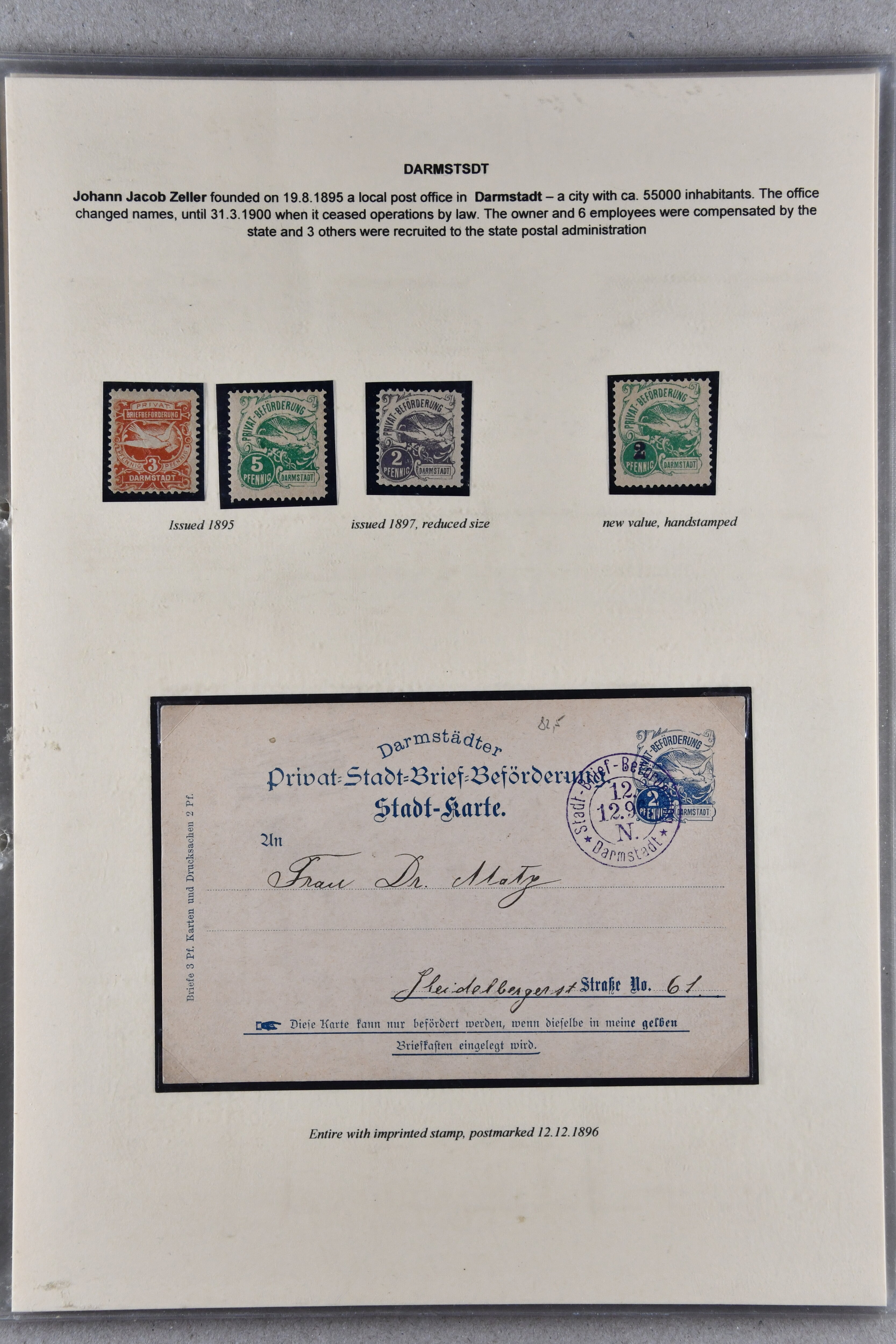 1703 imageDeutsches Reich - Stadtpost 1886/1900: Kl. Sammlung Stadtpostmarken, mehrheitlich ungest. und zwölf Belege von Bochum (1897), Darmstadt mit drei gest. 2 Pfg. 'Darmstädter Stadt-Karte' (1896), Freiburg mit Kartenbrief gest. ud und ungebr. Express-Karte (1897), Stadtpostmarken ungebr. von Mainz, Breslau udn Plauen, weiter mit einer schönen Auswahl Stadtpost Karlsruhe, inkl. 3 Pfg. Ganzsache ungebr., Mitteilungskarte gest., Karte 'Privat-Briefverkehr' ungebr., dazu zwei attraktive Abschieds-Karten gebr. von Zittau und Görlitz. Ex. The ‘Izhak Barak’ Collection: The Development of Aviation and Transportation of Mail by Air until 1914 (Image 1) (Image 2) (Image 3) (Image 4) (Image 5) (Image 6) (Image 7) (Image 8) (Image 9) (Image 10)
