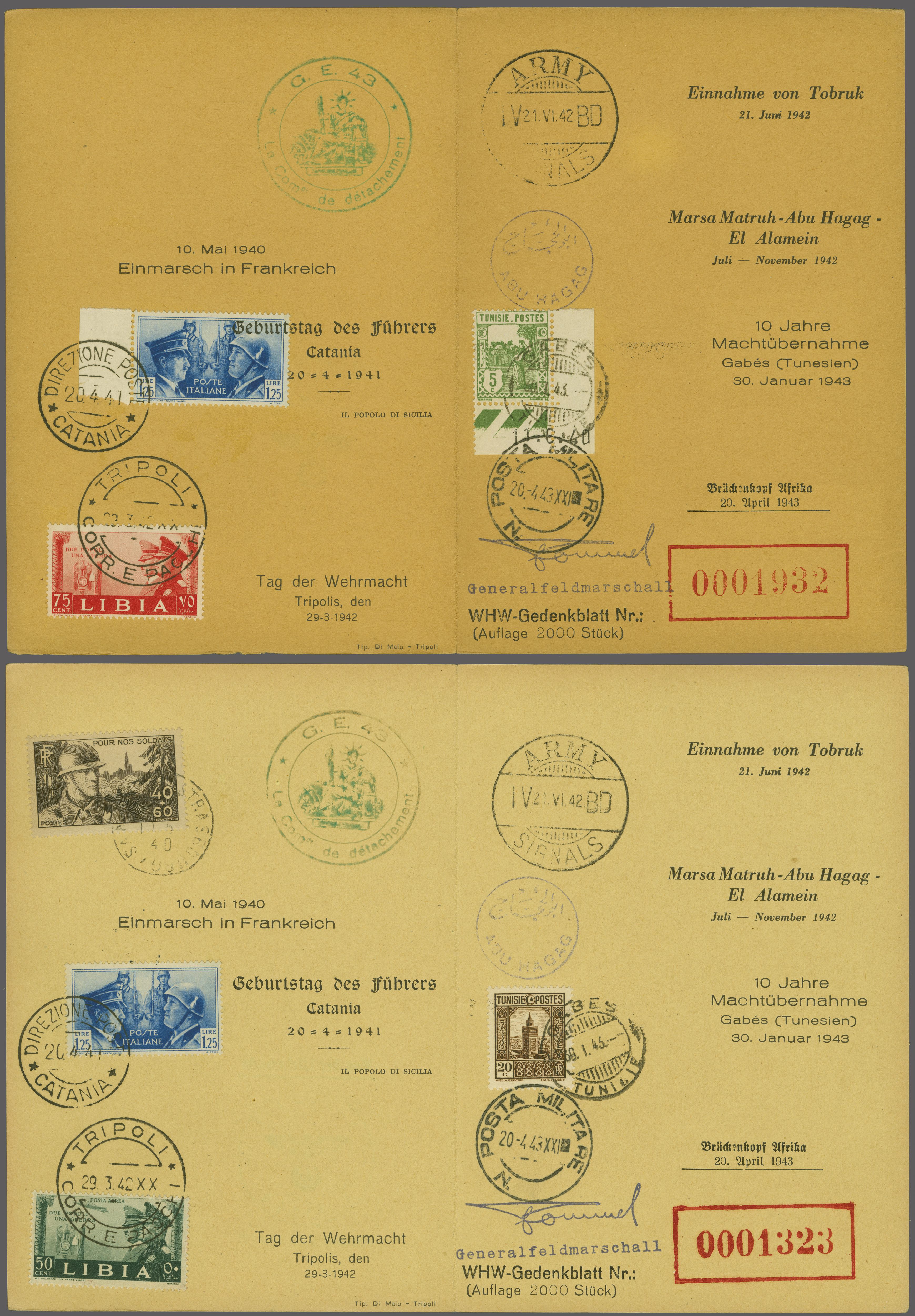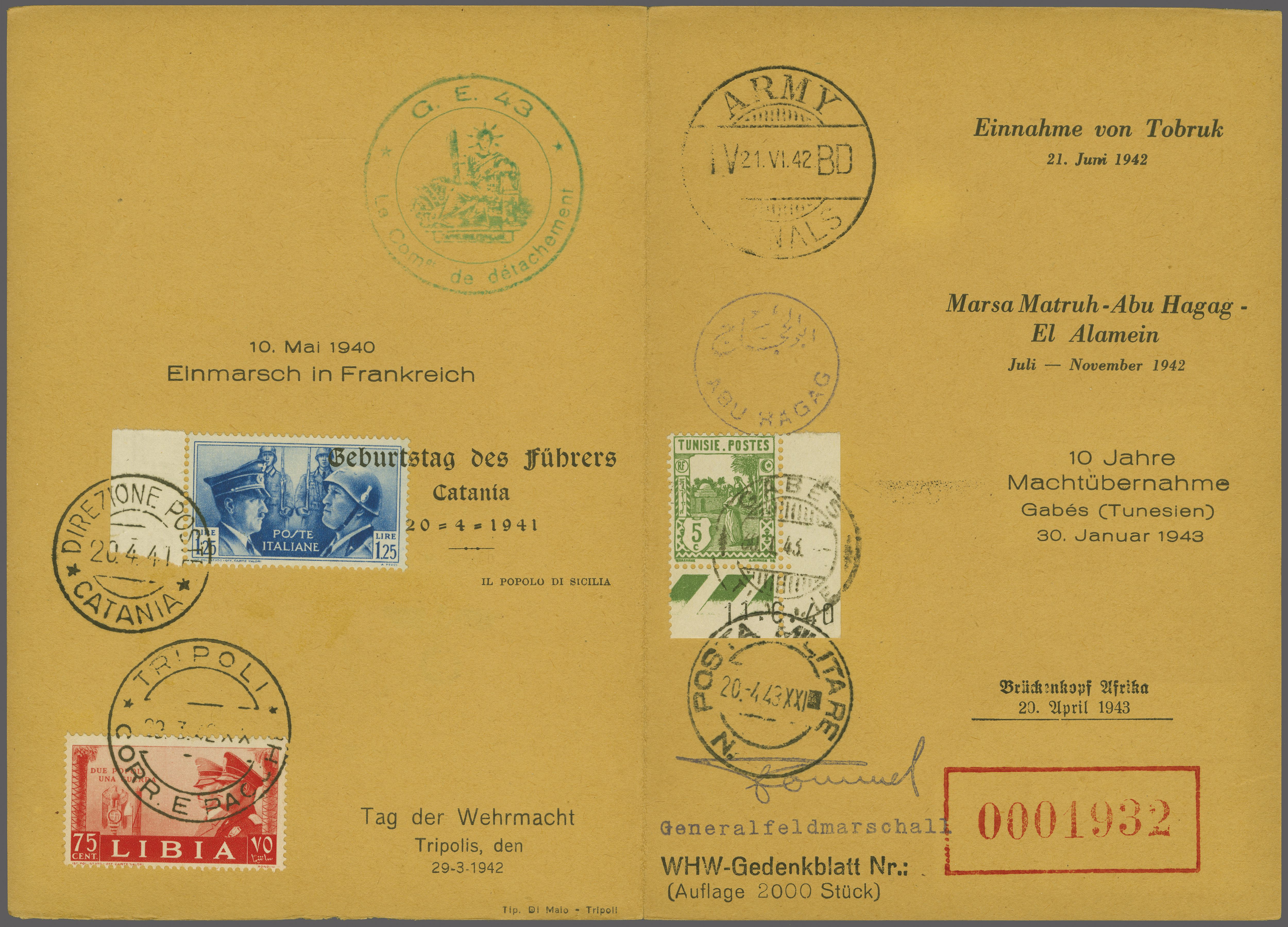 1700 cover image"Tag der Wehrmacht 1940", sog. "Rommel-Gedenkblatt", zwei Stück mit unterschiedlichen Marken, die Nummern Nr. 1323 & 1932 von insgesamt nur 2000 Exemplaren mit den Stationen des Vormarsches (Frankreich, Einnahme von Tobruk, El Alamein) und des Rückzuges auf den Brückenkopf Afrika; belegt durch entsprechende Briefmarken und Stempel sowie der Faksimile-Unterschrift von Generalfeldmarschall Rommel (Image 1) (Image 2)