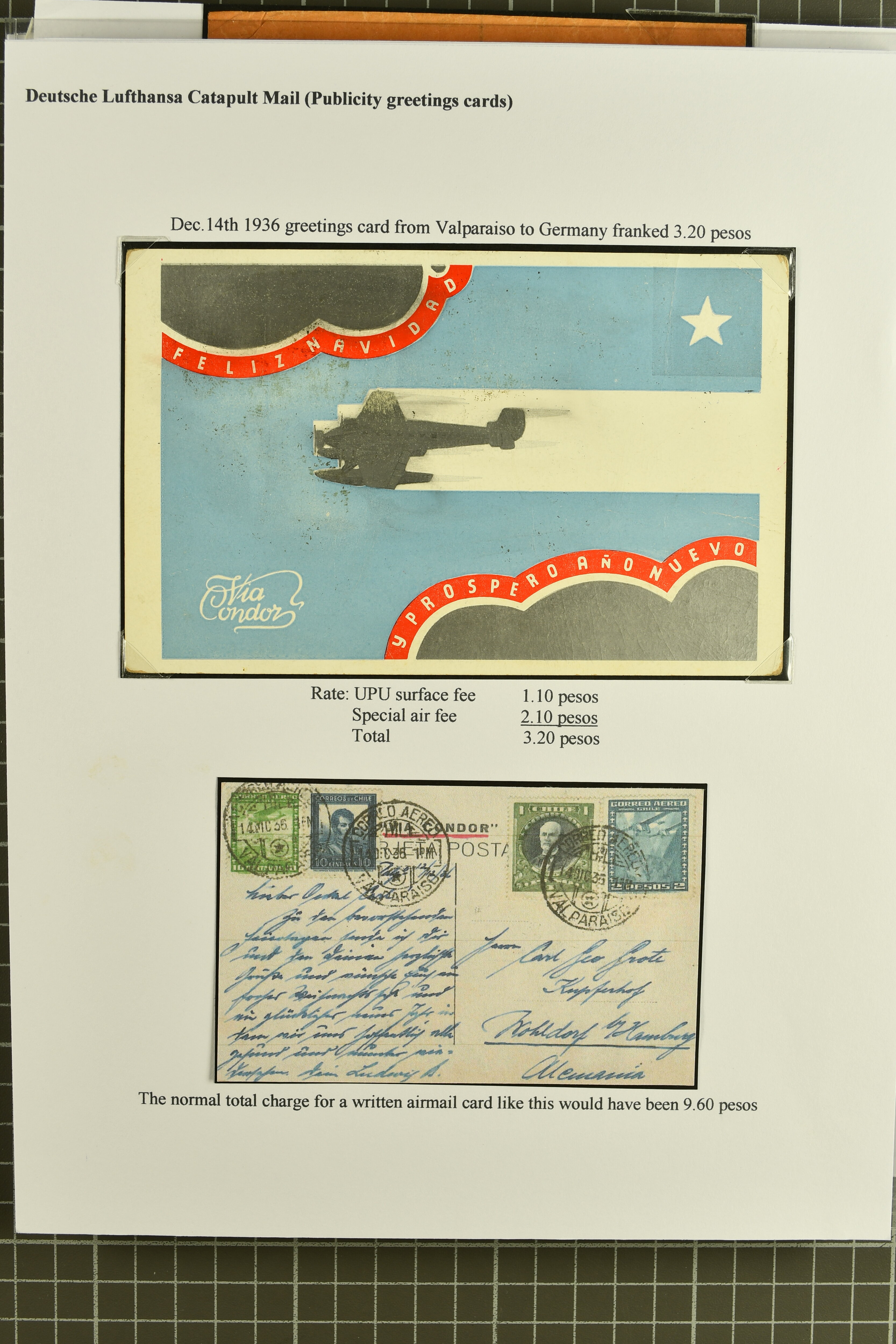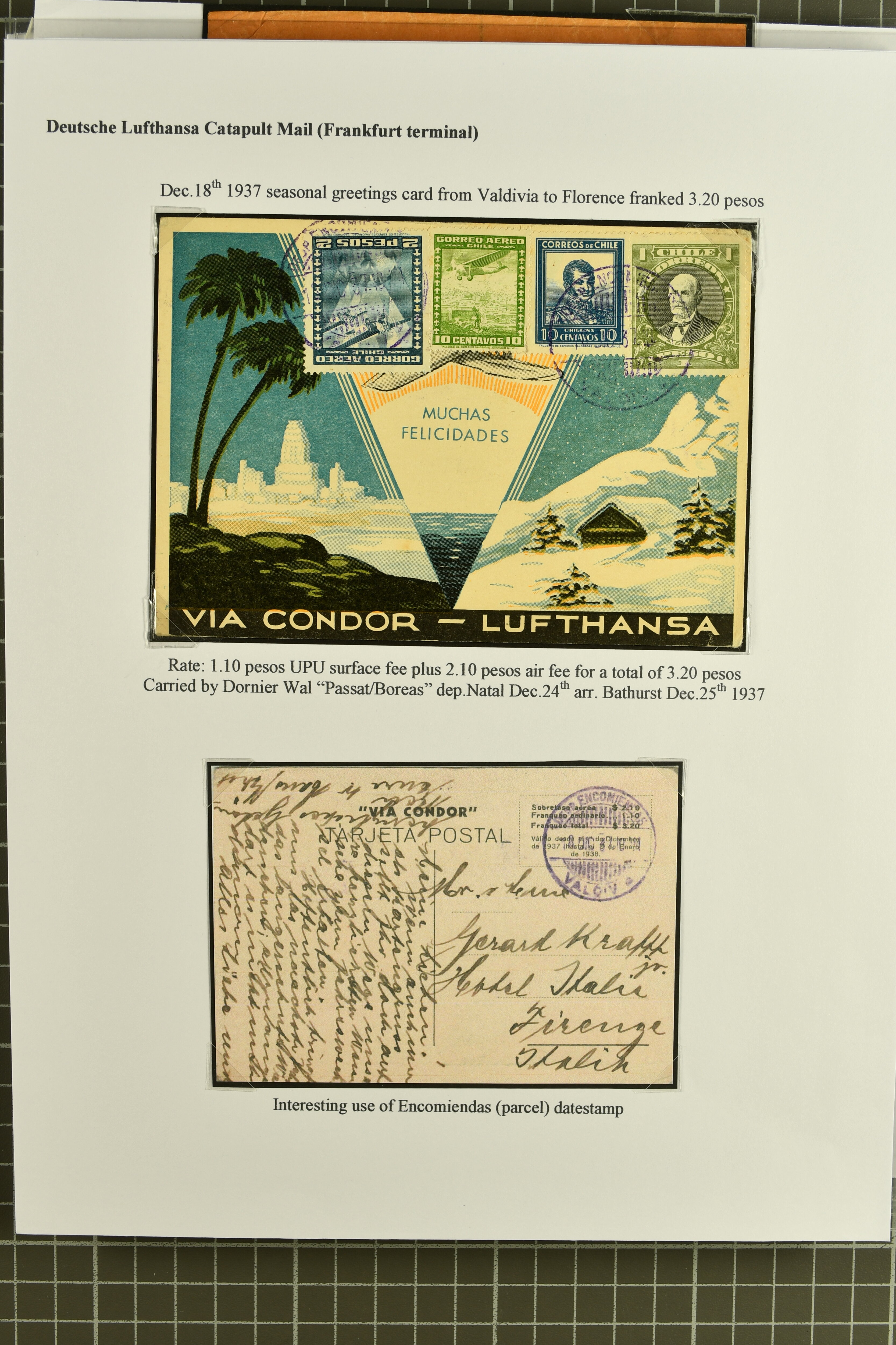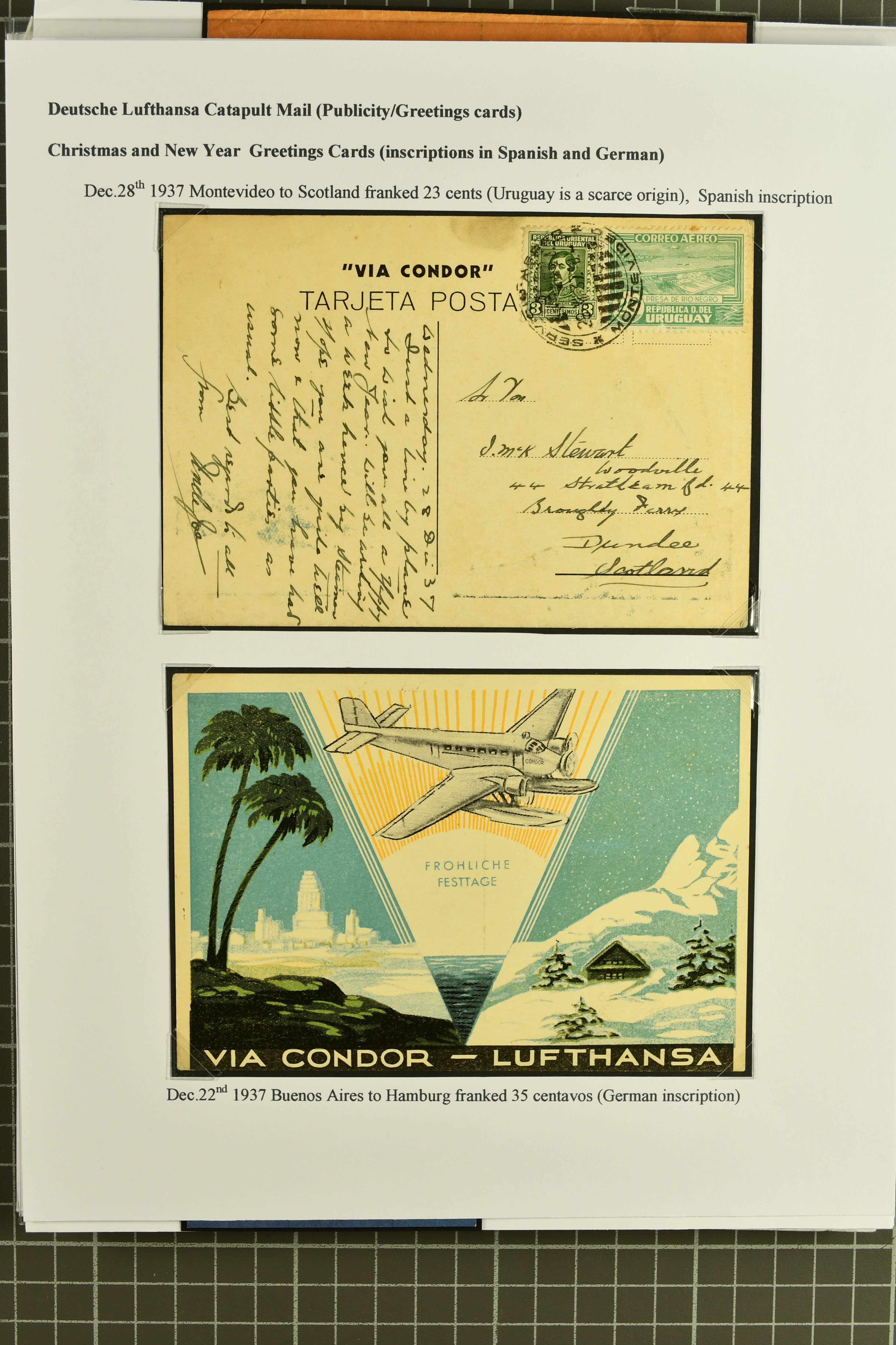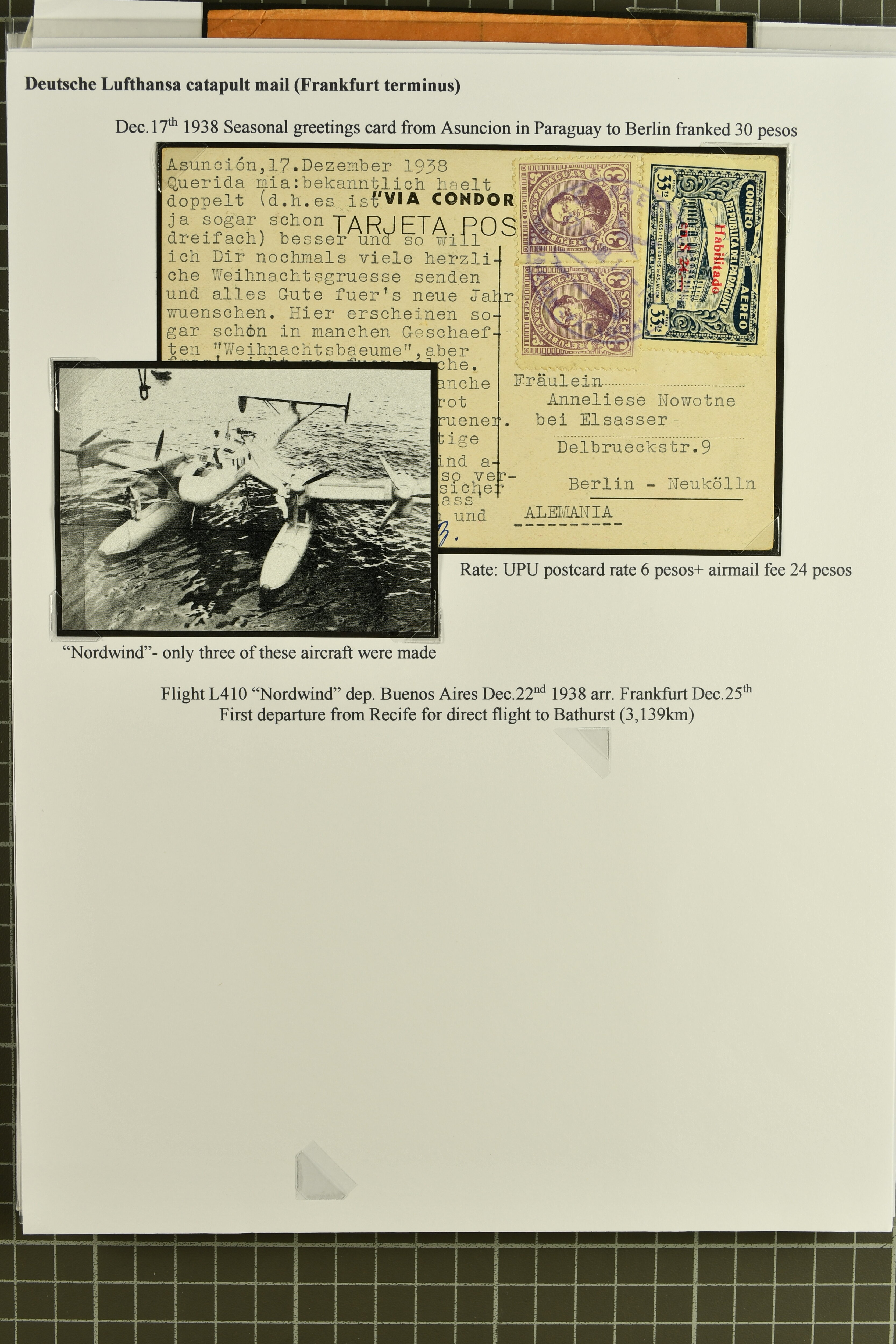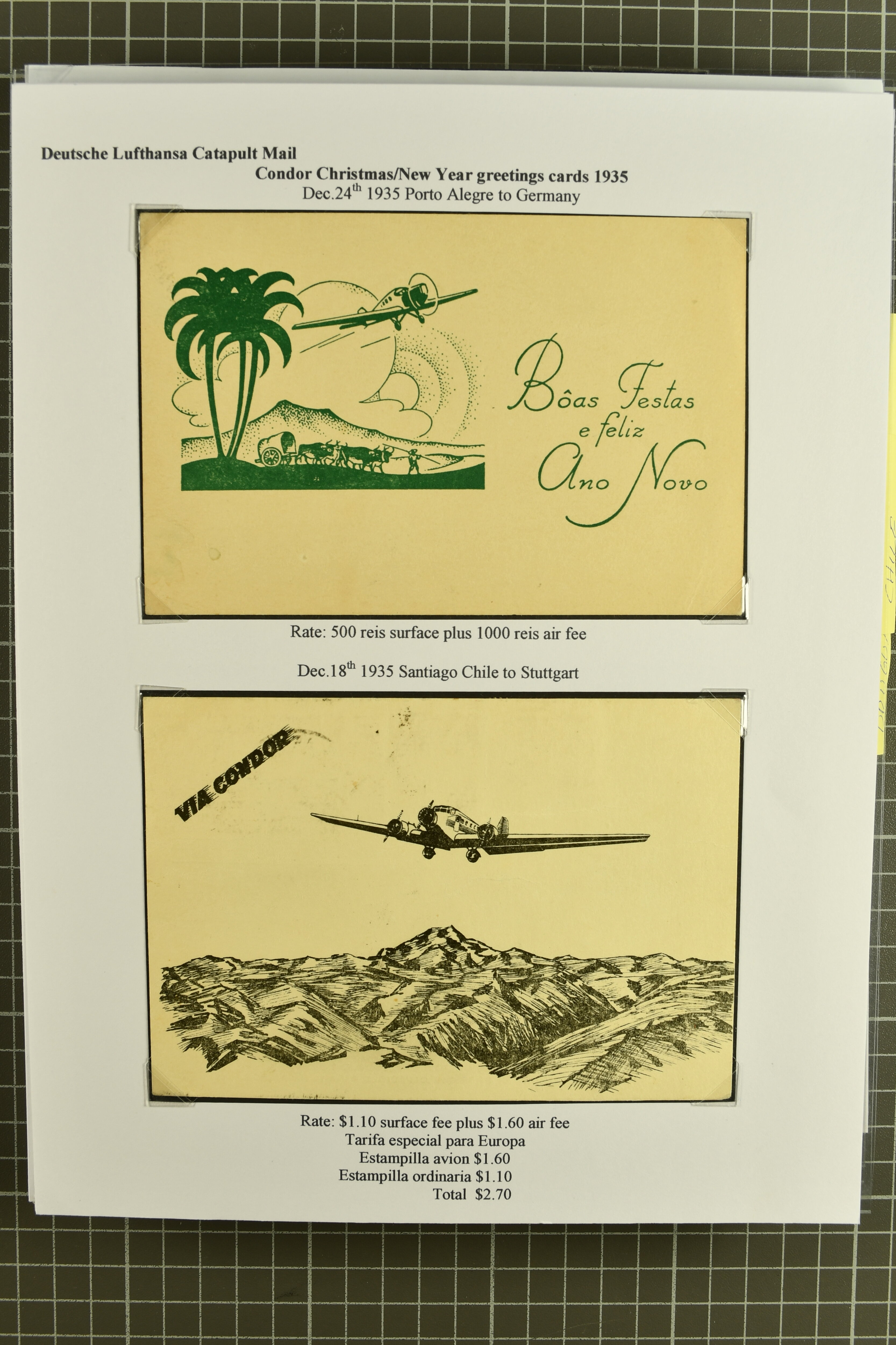 1714 cover imageKatapultpost Südatlantik 1934/39: Vielfältige Sammlung mit 65 geflogenen Belege sowie versch. Werbekarten und Drucksachen, dabei versch. Flugpläne, Postkarten, bezw. Neujahrskarten, ein ungebr. Condor-Lufthansa Mustersäcklein (12x18,5cm) ungebr., Bedarfspost wie R-Brief von Hamburg nach Punta Arenas (Magallenes 37.5.37), weiter ein Flugtarifplan ab Argentinien, R-Drucksache ab Hamburg mit 9.55 RM Frankatur nach Santiago de Chile, Argentinien mit div. Festtagskarten (6, inkl. Karte nach Budapest 1939), Post ab Brasilien 17 Belege mit 1932 Zeppelinzuleitung von Porto Alegre zur Zeppelin-Rückfahrt der 8. SA-Fahrt nach London, sechs versch. Werbekarten mit 1935/37 Weihnachtskarten 'Boas Festas', 1935 zwei frankierte Stoffmustersäckchen (11,5x26 cm), davon eines nach Hamburg, resp. das zweite nach London adressiert, ferner Katapultpost ab Chile, ein Brief ab Uruguay nach Schottland, 1938 je eine Grusskarte ab Paraguay bezw. Peru, sowie div. Zuleitungspost ab Europa mit guten, teils hohen Frankaturen, aufgeliefert via Stuttgart oder Frankfurt, dabei Post von Belgien, Dänemark, England (8, inkl. einer Zuleitung ab Brit. Postamt in Tangier Brit. Marokko), Italien (3), Niederlande (1), Österreich (2) und ab der Schweiz (1). Ein sehr attraktives Los, alles Bedarfspost, Besichtigung empfohlen (Image 1) (Image 2) (Image 3) (Image 4) (Image 5) (Image 6) (Image 7) (Image 8) (Image 9) (Image 10) (Image 11) (Image 12) (Image 13) (Image 14) (Image 15) (Image 16) (Image 17) (Image 18) (Image 19) (Image 20) (Image 21) (Image 22) (Image 23) (Image 24) (Image 25) (Image 26) (Image 27) (Image 28) (Image 29) (Image 30) (Image 31) (Image 32) (Image 33) (Image 34) (Image 35) (Image 36) (Image 37) (Image 38) (Image 39) (Image 40) (Image 41) (Image 42) (Image 43) (Image 44) (Image 45) (Image 46) (Image 47) (Image 48) (Image 49) (Image 50)