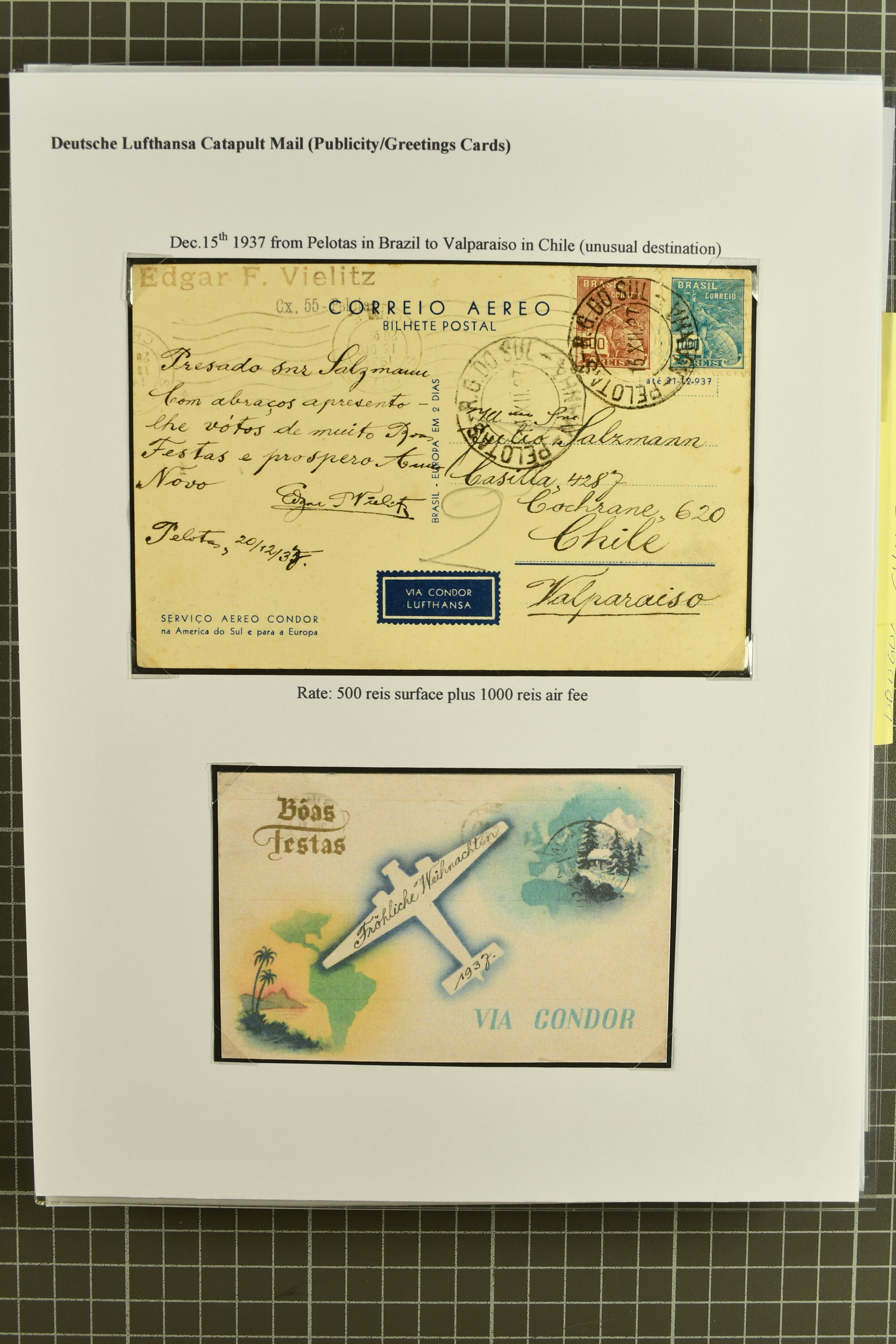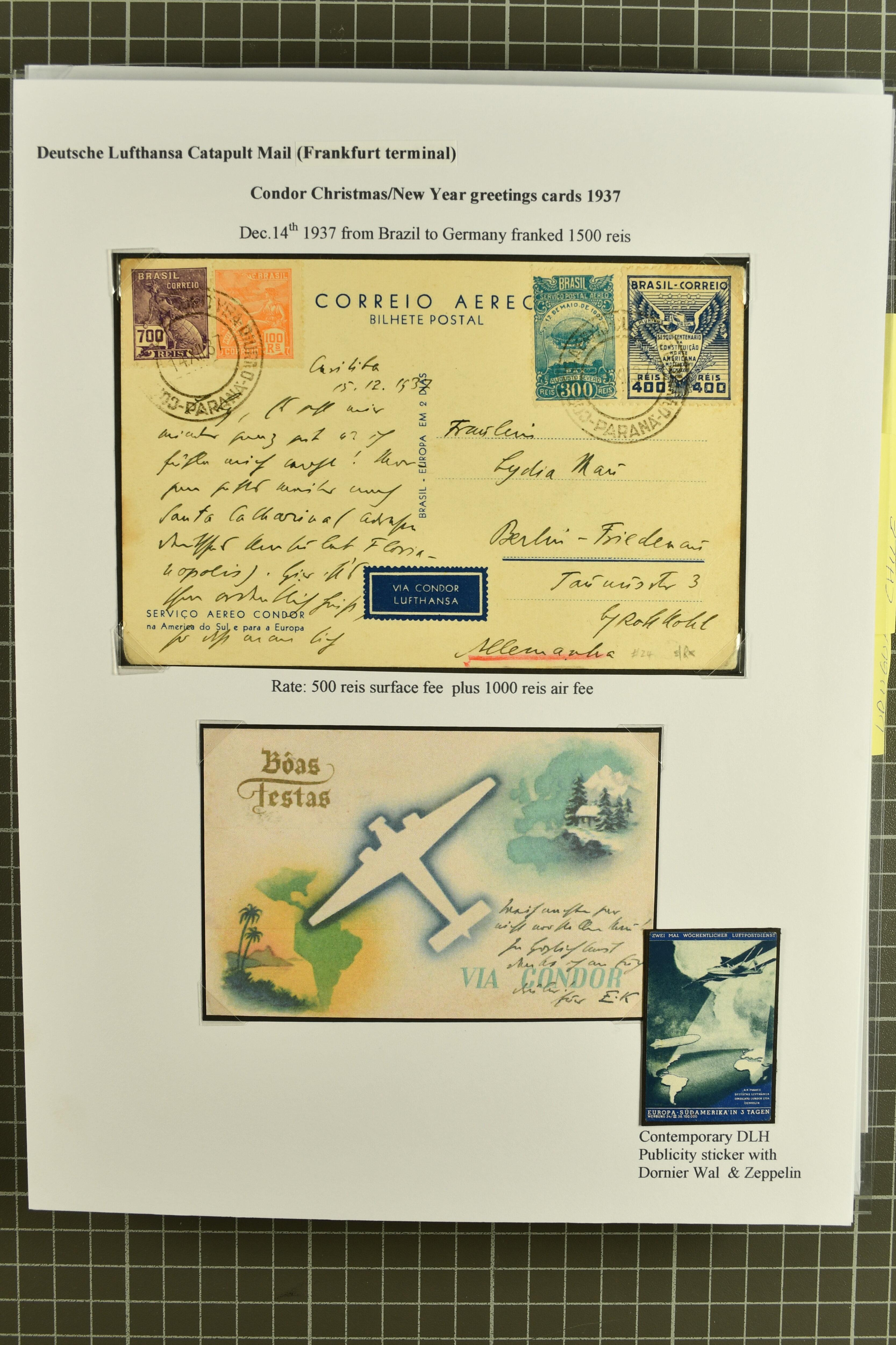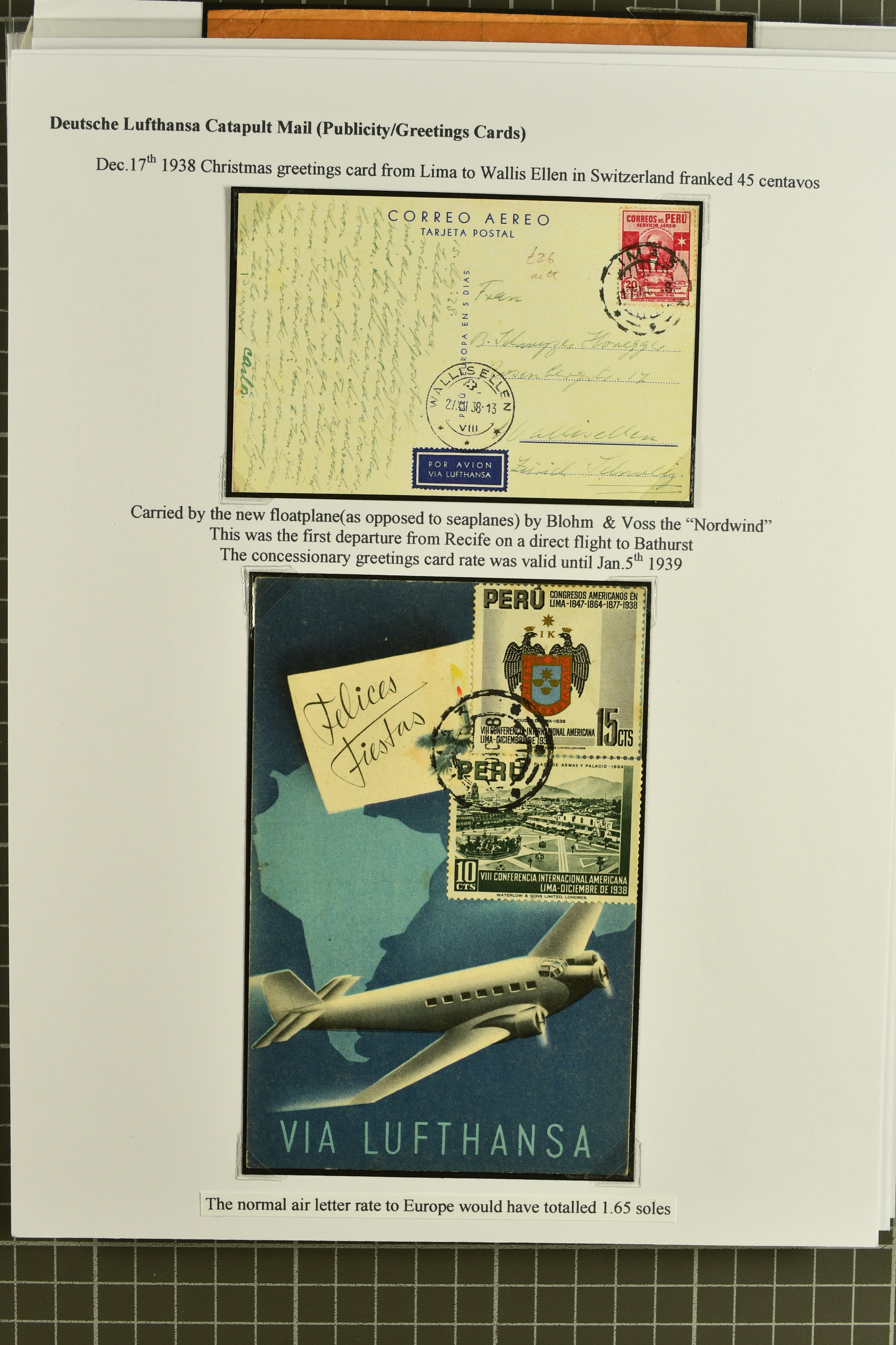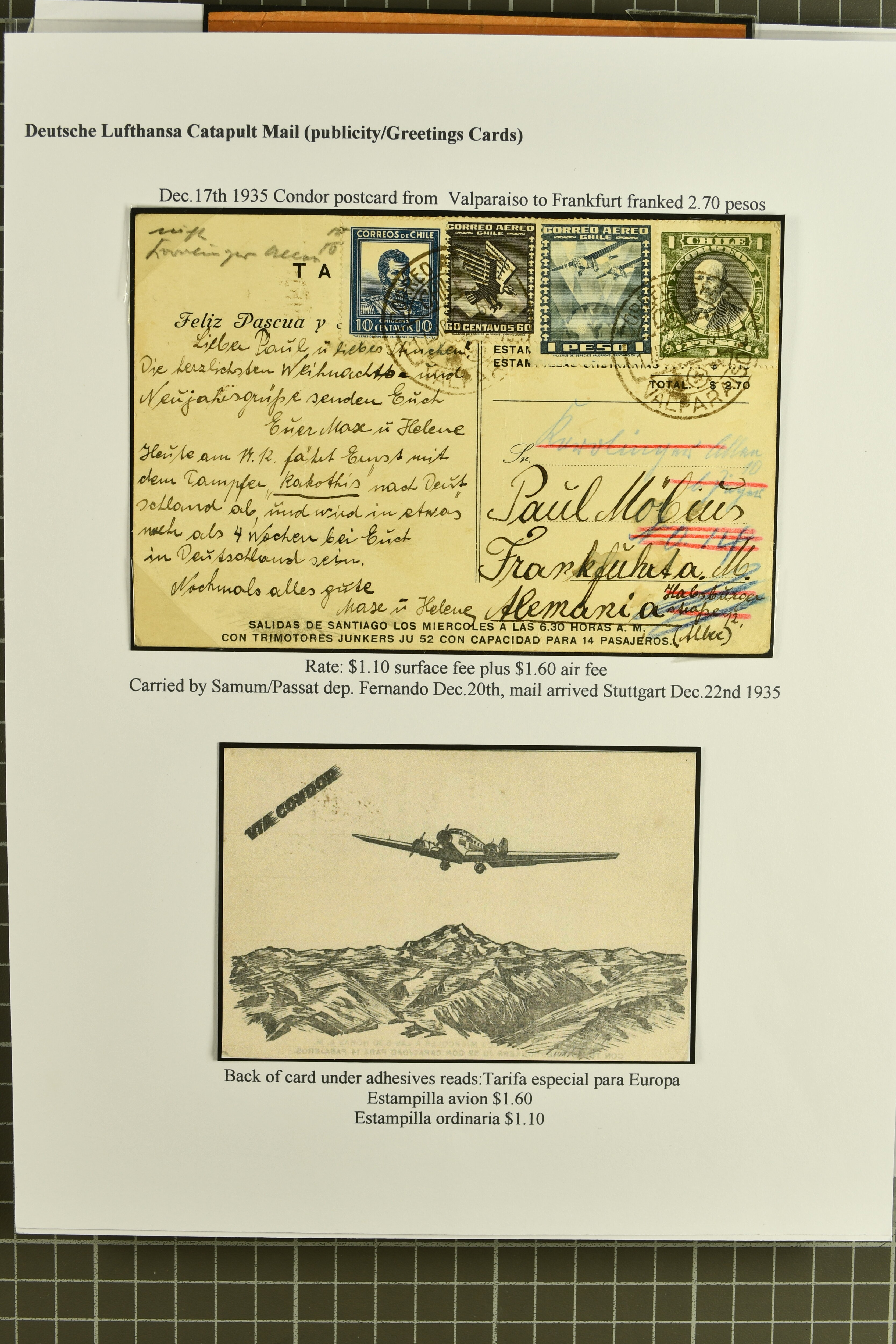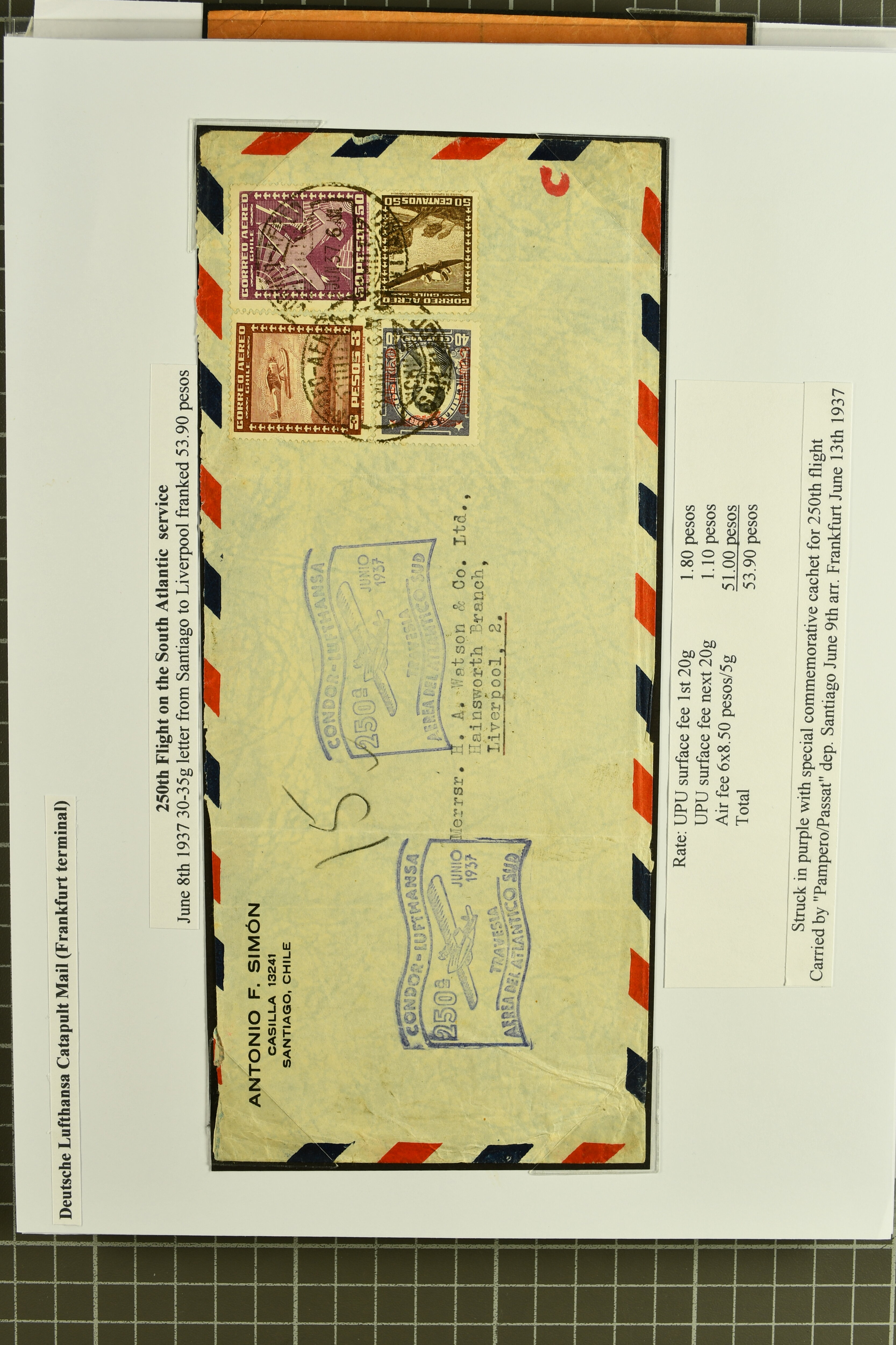 1714 cover imageKatapultpost Südatlantik 1934/39: Vielfältige Sammlung mit 65 geflogenen Belege sowie versch. Werbekarten und Drucksachen, dabei versch. Flugpläne, Postkarten, bezw. Neujahrskarten, ein ungebr. Condor-Lufthansa Mustersäcklein (12x18,5cm) ungebr., Bedarfspost wie R-Brief von Hamburg nach Punta Arenas (Magallenes 37.5.37), weiter ein Flugtarifplan ab Argentinien, R-Drucksache ab Hamburg mit 9.55 RM Frankatur nach Santiago de Chile, Argentinien mit div. Festtagskarten (6, inkl. Karte nach Budapest 1939), Post ab Brasilien 17 Belege mit 1932 Zeppelinzuleitung von Porto Alegre zur Zeppelin-Rückfahrt der 8. SA-Fahrt nach London, sechs versch. Werbekarten mit 1935/37 Weihnachtskarten 'Boas Festas', 1935 zwei frankierte Stoffmustersäckchen (11,5x26 cm), davon eines nach Hamburg, resp. das zweite nach London adressiert, ferner Katapultpost ab Chile, ein Brief ab Uruguay nach Schottland, 1938 je eine Grusskarte ab Paraguay bezw. Peru, sowie div. Zuleitungspost ab Europa mit guten, teils hohen Frankaturen, aufgeliefert via Stuttgart oder Frankfurt, dabei Post von Belgien, Dänemark, England (8, inkl. einer Zuleitung ab Brit. Postamt in Tangier Brit. Marokko), Italien (3), Niederlande (1), Österreich (2) und ab der Schweiz (1). Ein sehr attraktives Los, alles Bedarfspost, Besichtigung empfohlen (Image 1) (Image 2) (Image 3) (Image 4) (Image 5) (Image 6) (Image 7) (Image 8) (Image 9) (Image 10) (Image 11) (Image 12) (Image 13) (Image 14) (Image 15) (Image 16) (Image 17) (Image 18) (Image 19) (Image 20) (Image 21) (Image 22) (Image 23) (Image 24) (Image 25) (Image 26) (Image 27) (Image 28) (Image 29) (Image 30) (Image 31) (Image 32) (Image 33) (Image 34) (Image 35) (Image 36) (Image 37) (Image 38) (Image 39) (Image 40) (Image 41) (Image 42) (Image 43) (Image 44) (Image 45) (Image 46) (Image 47) (Image 48) (Image 49) (Image 50)