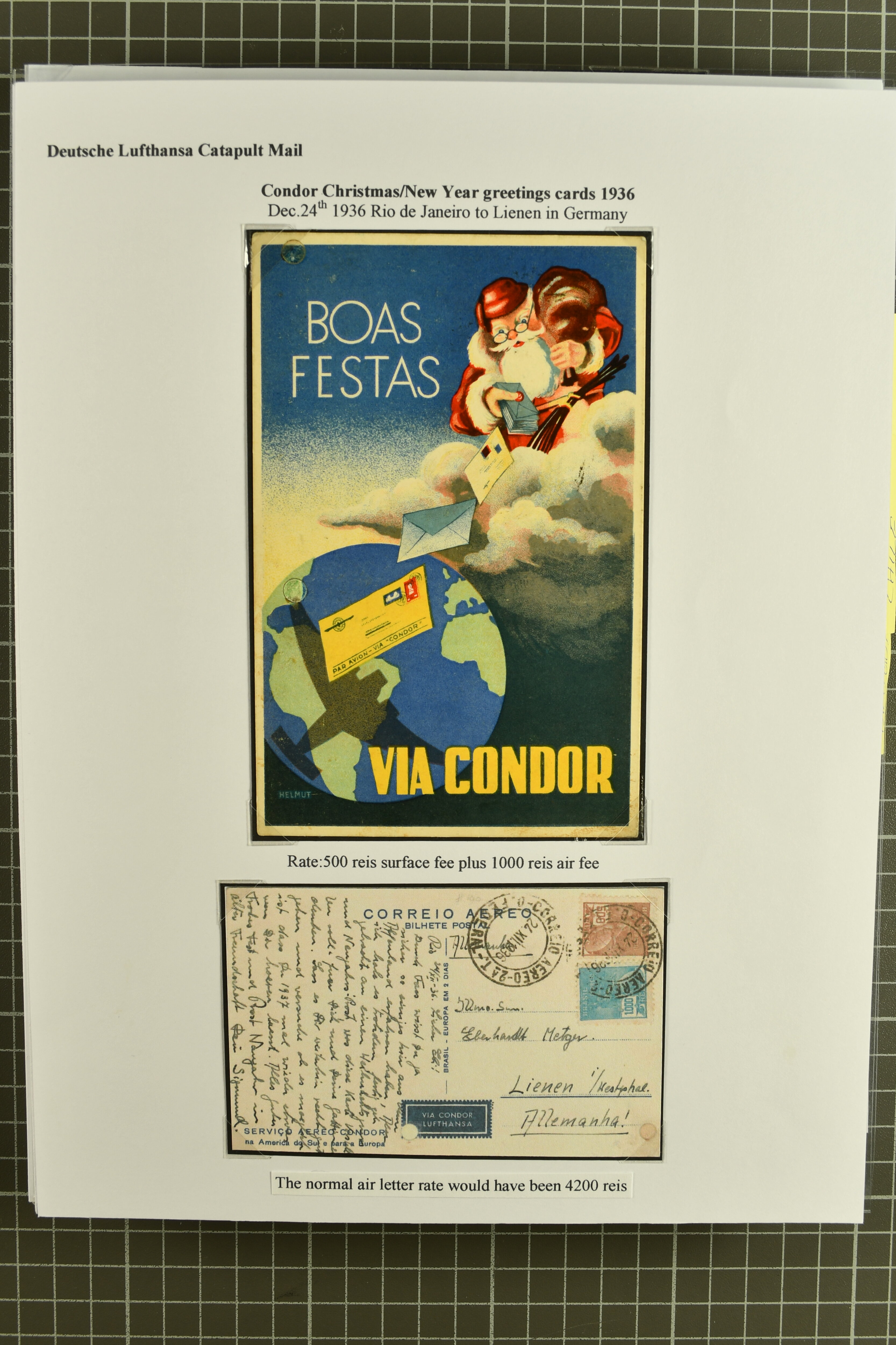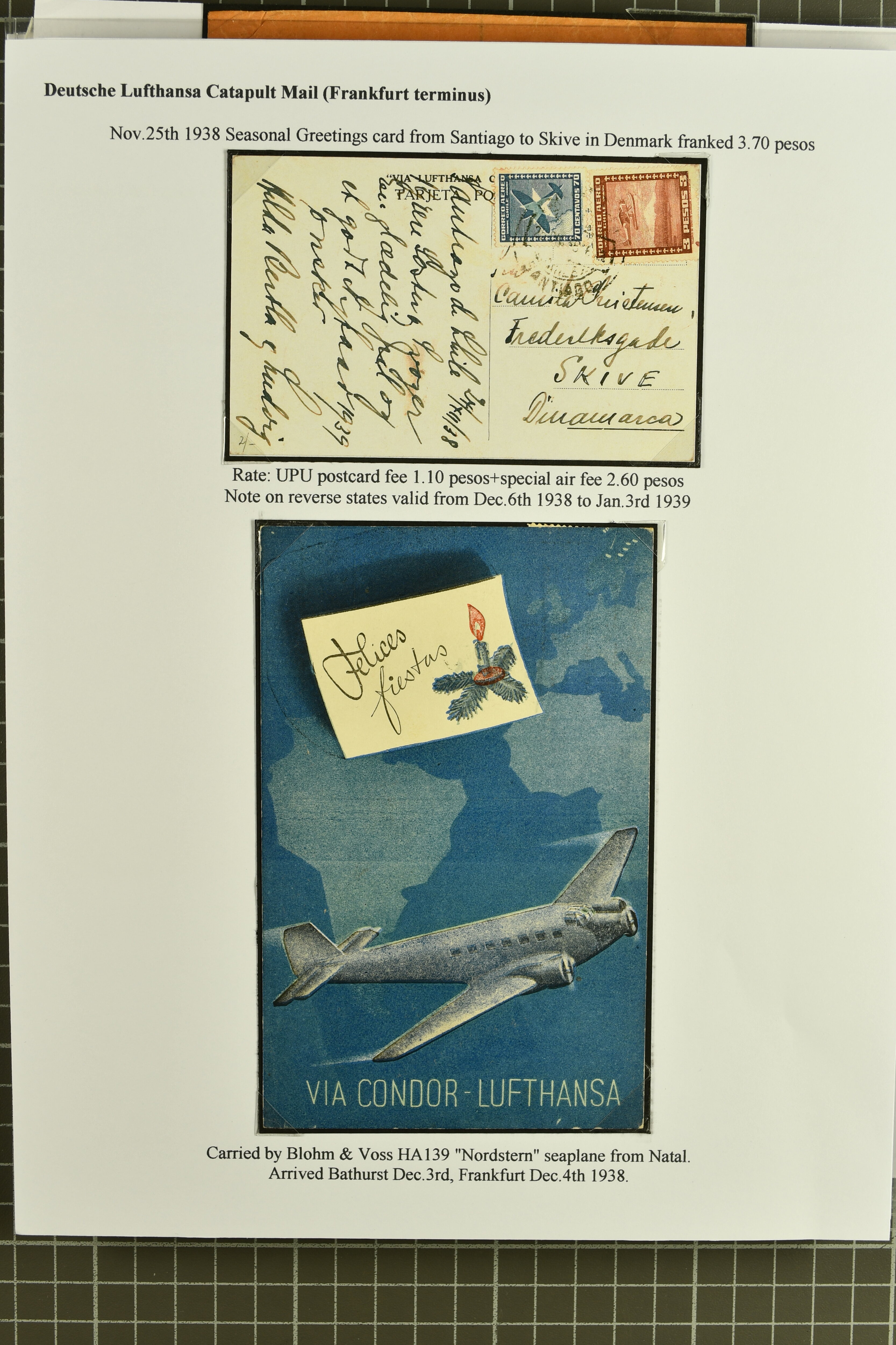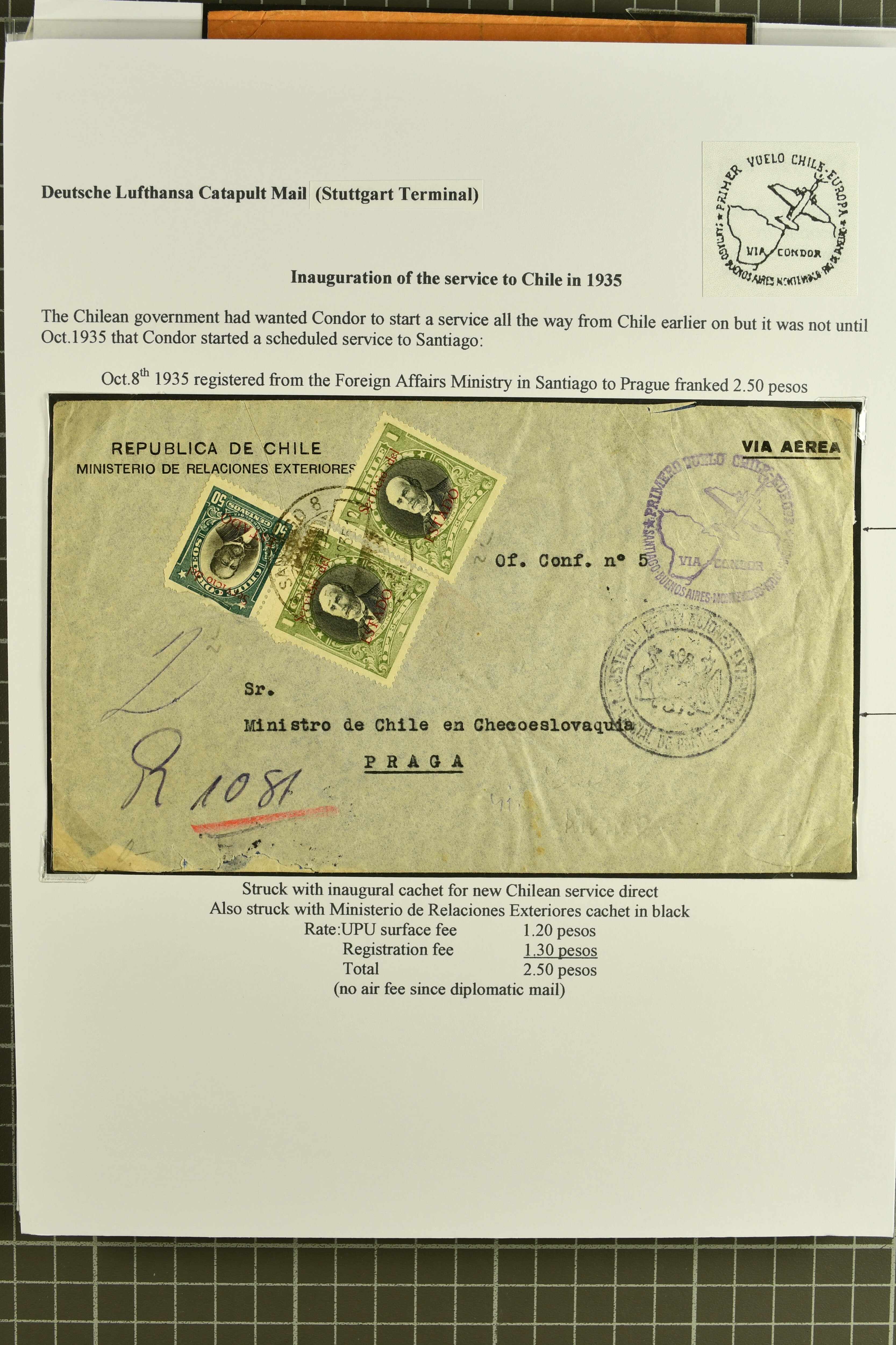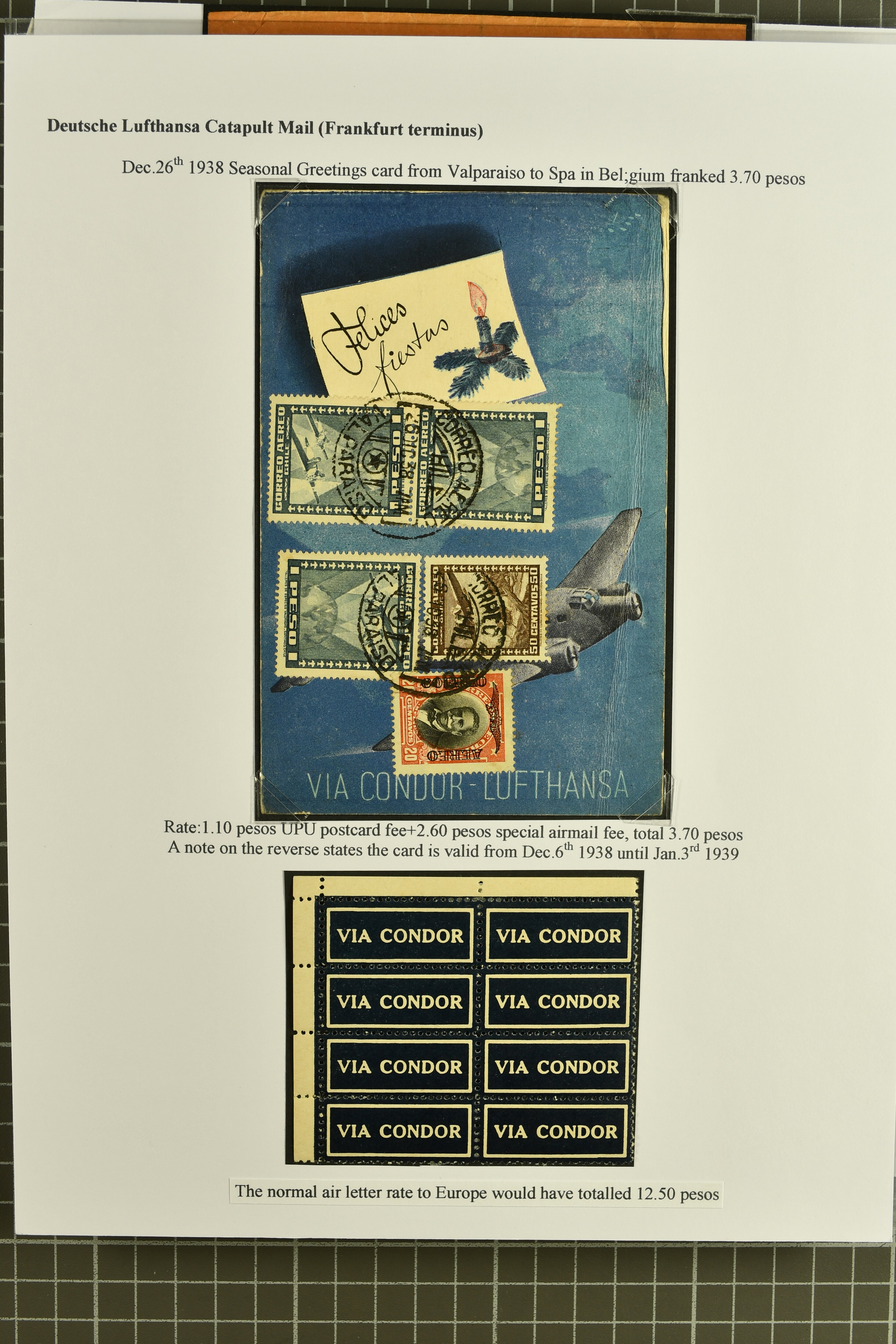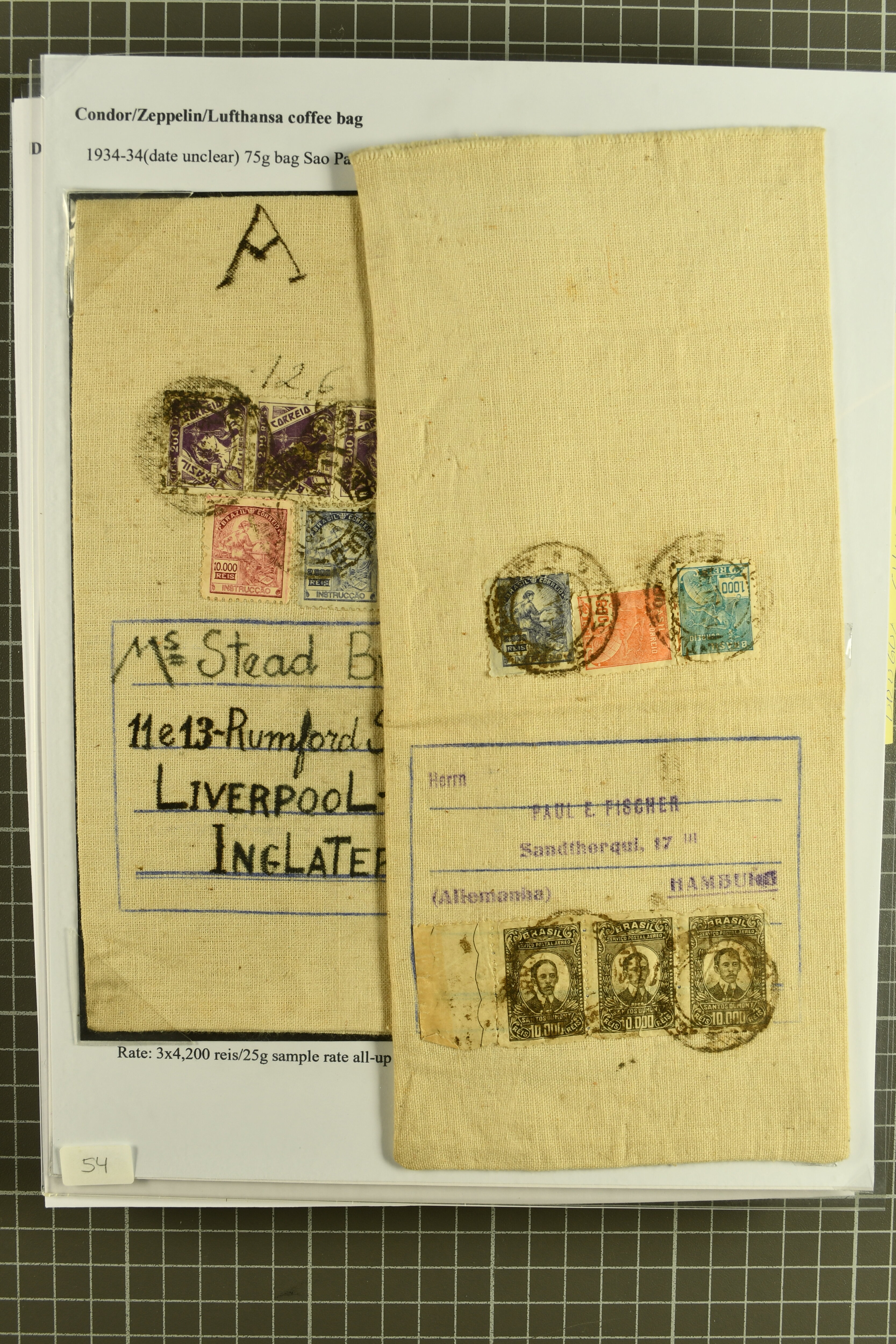 1714 cover imageKatapultpost Südatlantik 1934/39: Vielfältige Sammlung mit 65 geflogenen Belege sowie versch. Werbekarten und Drucksachen, dabei versch. Flugpläne, Postkarten, bezw. Neujahrskarten, ein ungebr. Condor-Lufthansa Mustersäcklein (12x18,5cm) ungebr., Bedarfspost wie R-Brief von Hamburg nach Punta Arenas (Magallenes 37.5.37), weiter ein Flugtarifplan ab Argentinien, R-Drucksache ab Hamburg mit 9.55 RM Frankatur nach Santiago de Chile, Argentinien mit div. Festtagskarten (6, inkl. Karte nach Budapest 1939), Post ab Brasilien 17 Belege mit 1932 Zeppelinzuleitung von Porto Alegre zur Zeppelin-Rückfahrt der 8. SA-Fahrt nach London, sechs versch. Werbekarten mit 1935/37 Weihnachtskarten 'Boas Festas', 1935 zwei frankierte Stoffmustersäckchen (11,5x26 cm), davon eines nach Hamburg, resp. das zweite nach London adressiert, ferner Katapultpost ab Chile, ein Brief ab Uruguay nach Schottland, 1938 je eine Grusskarte ab Paraguay bezw. Peru, sowie div. Zuleitungspost ab Europa mit guten, teils hohen Frankaturen, aufgeliefert via Stuttgart oder Frankfurt, dabei Post von Belgien, Dänemark, England (8, inkl. einer Zuleitung ab Brit. Postamt in Tangier Brit. Marokko), Italien (3), Niederlande (1), Österreich (2) und ab der Schweiz (1). Ein sehr attraktives Los, alles Bedarfspost, Besichtigung empfohlen (Image 1) (Image 2) (Image 3) (Image 4) (Image 5) (Image 6) (Image 7) (Image 8) (Image 9) (Image 10) (Image 11) (Image 12) (Image 13) (Image 14) (Image 15) (Image 16) (Image 17) (Image 18) (Image 19) (Image 20) (Image 21) (Image 22) (Image 23) (Image 24) (Image 25) (Image 26) (Image 27) (Image 28) (Image 29) (Image 30) (Image 31) (Image 32) (Image 33) (Image 34) (Image 35) (Image 36) (Image 37) (Image 38) (Image 39) (Image 40) (Image 41) (Image 42) (Image 43) (Image 44) (Image 45) (Image 46) (Image 47) (Image 48) (Image 49) (Image 50)