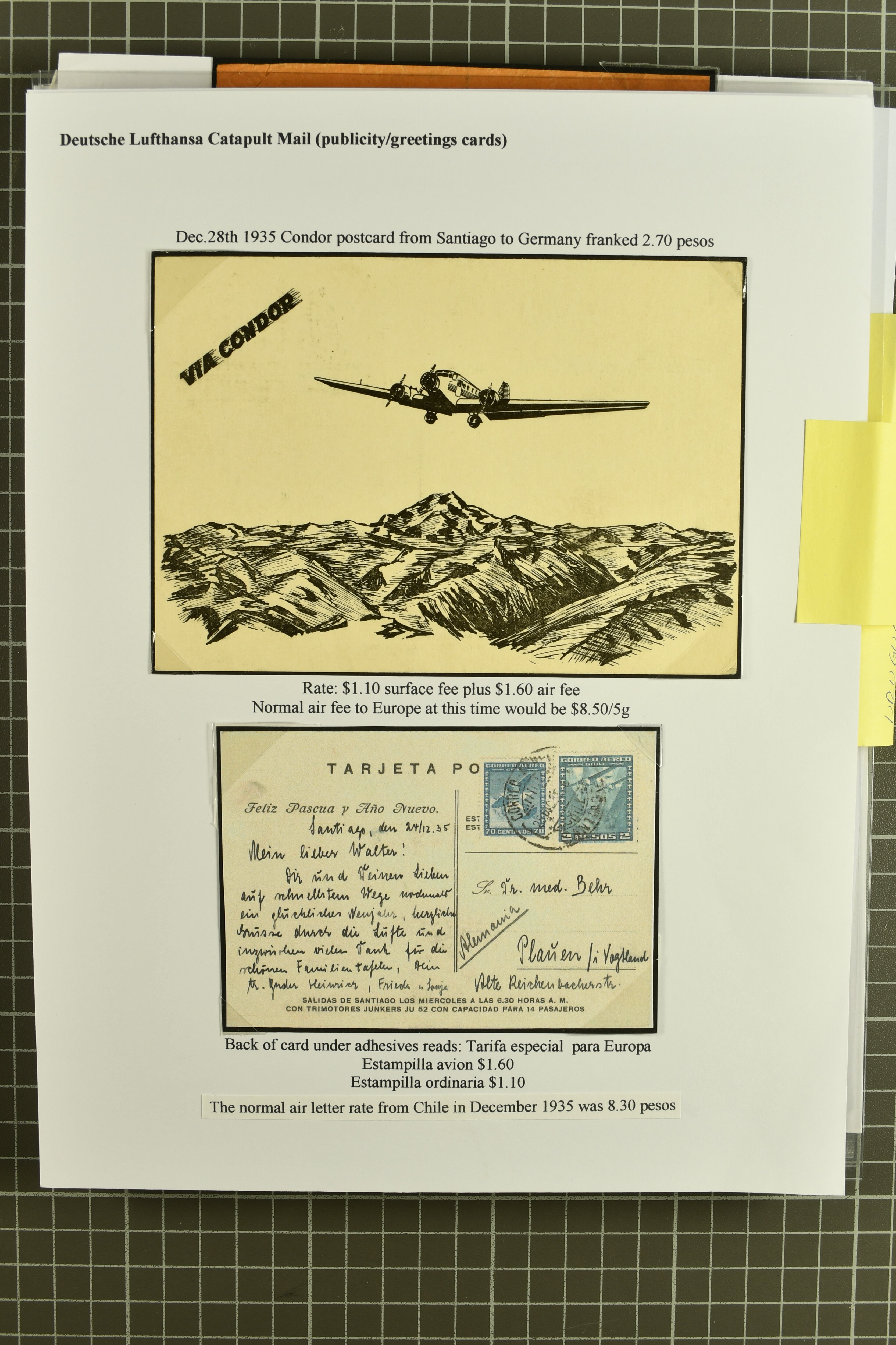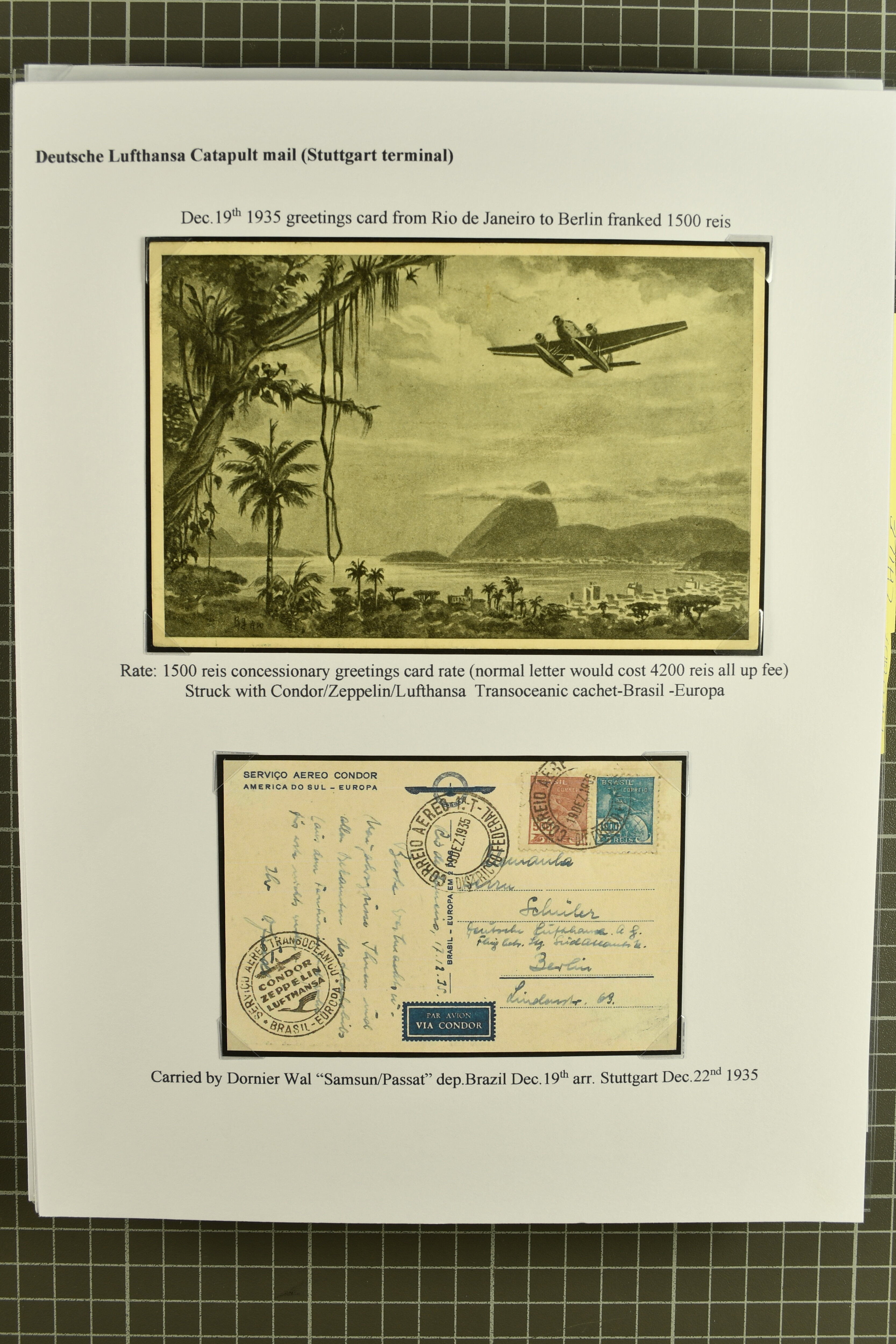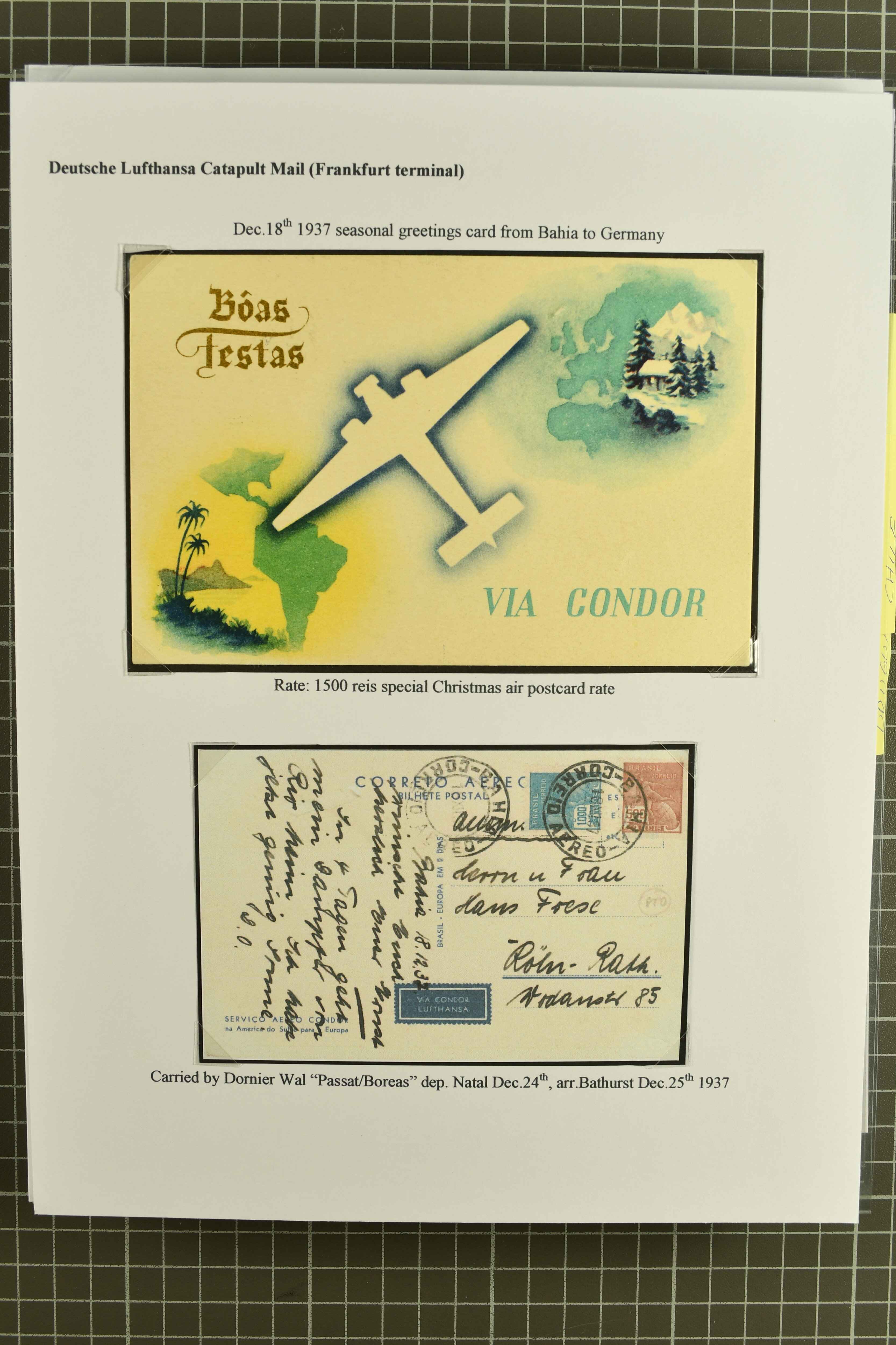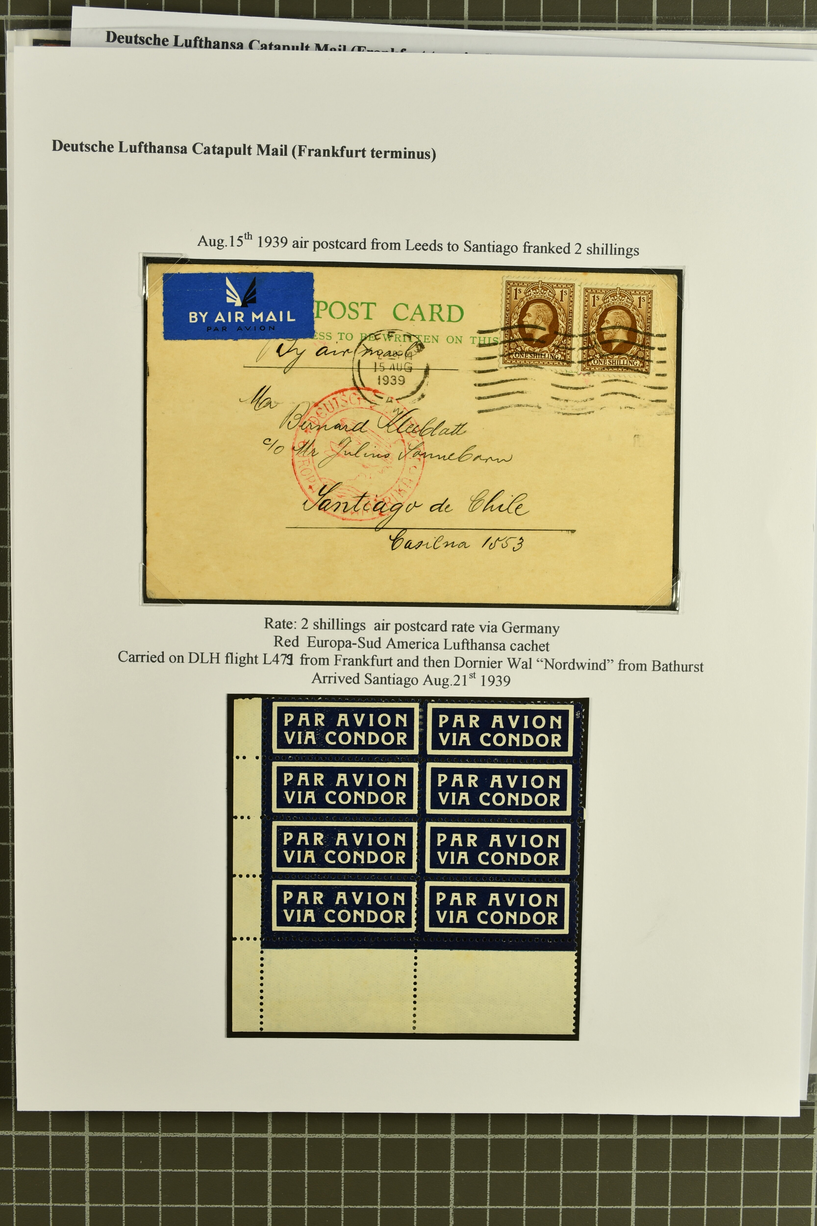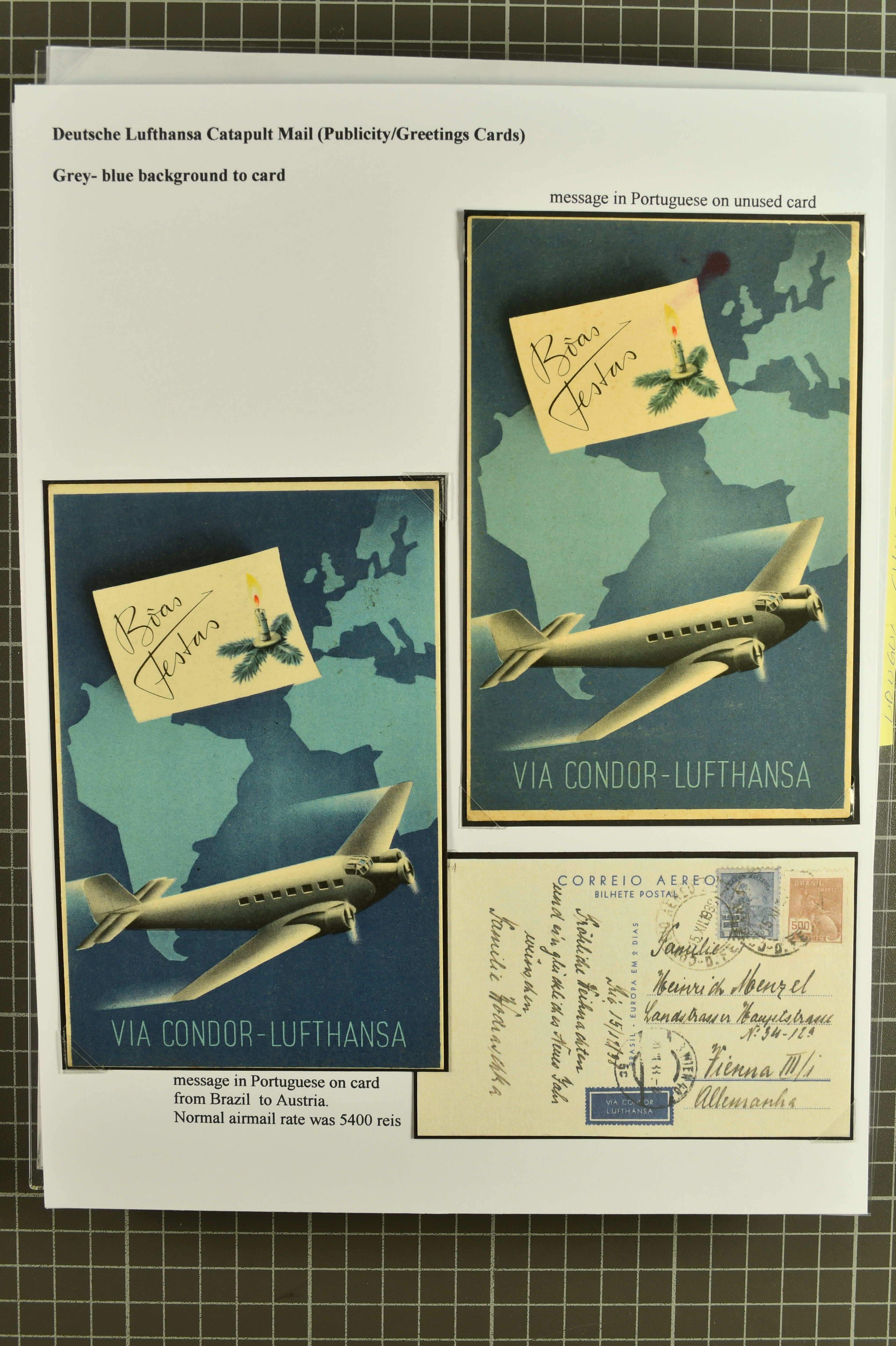 1714 cover imageKatapultpost Südatlantik 1934/39: Vielfältige Sammlung mit 65 geflogenen Belege sowie versch. Werbekarten und Drucksachen, dabei versch. Flugpläne, Postkarten, bezw. Neujahrskarten, ein ungebr. Condor-Lufthansa Mustersäcklein (12x18,5cm) ungebr., Bedarfspost wie R-Brief von Hamburg nach Punta Arenas (Magallenes 37.5.37), weiter ein Flugtarifplan ab Argentinien, R-Drucksache ab Hamburg mit 9.55 RM Frankatur nach Santiago de Chile, Argentinien mit div. Festtagskarten (6, inkl. Karte nach Budapest 1939), Post ab Brasilien 17 Belege mit 1932 Zeppelinzuleitung von Porto Alegre zur Zeppelin-Rückfahrt der 8. SA-Fahrt nach London, sechs versch. Werbekarten mit 1935/37 Weihnachtskarten 'Boas Festas', 1935 zwei frankierte Stoffmustersäckchen (11,5x26 cm), davon eines nach Hamburg, resp. das zweite nach London adressiert, ferner Katapultpost ab Chile, ein Brief ab Uruguay nach Schottland, 1938 je eine Grusskarte ab Paraguay bezw. Peru, sowie div. Zuleitungspost ab Europa mit guten, teils hohen Frankaturen, aufgeliefert via Stuttgart oder Frankfurt, dabei Post von Belgien, Dänemark, England (8, inkl. einer Zuleitung ab Brit. Postamt in Tangier Brit. Marokko), Italien (3), Niederlande (1), Österreich (2) und ab der Schweiz (1). Ein sehr attraktives Los, alles Bedarfspost, Besichtigung empfohlen (Image 1) (Image 2) (Image 3) (Image 4) (Image 5) (Image 6) (Image 7) (Image 8) (Image 9) (Image 10) (Image 11) (Image 12) (Image 13) (Image 14) (Image 15) (Image 16) (Image 17) (Image 18) (Image 19) (Image 20) (Image 21) (Image 22) (Image 23) (Image 24) (Image 25) (Image 26) (Image 27) (Image 28) (Image 29) (Image 30) (Image 31) (Image 32) (Image 33) (Image 34) (Image 35) (Image 36) (Image 37) (Image 38) (Image 39) (Image 40) (Image 41) (Image 42) (Image 43) (Image 44) (Image 45) (Image 46) (Image 47) (Image 48) (Image 49) (Image 50)