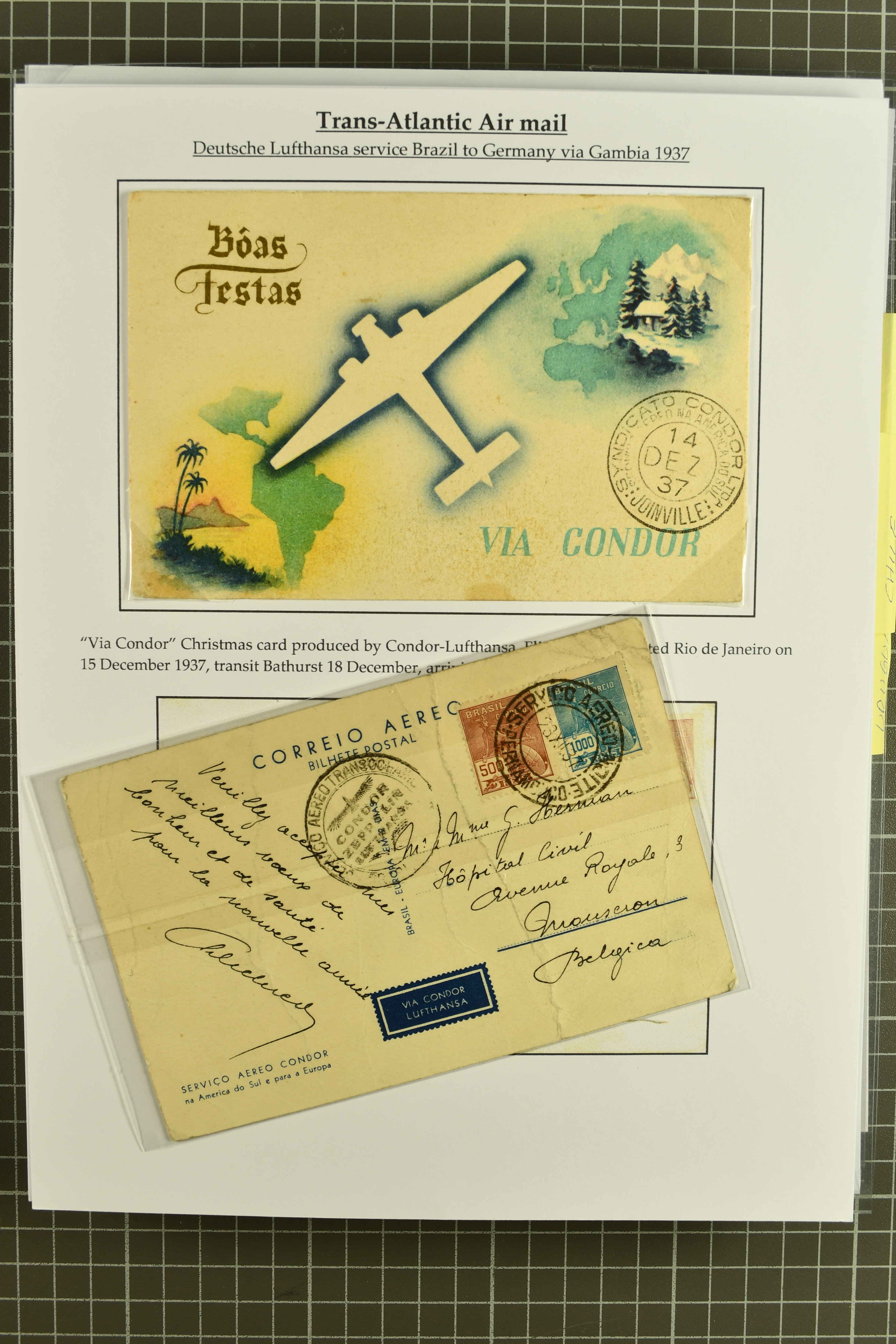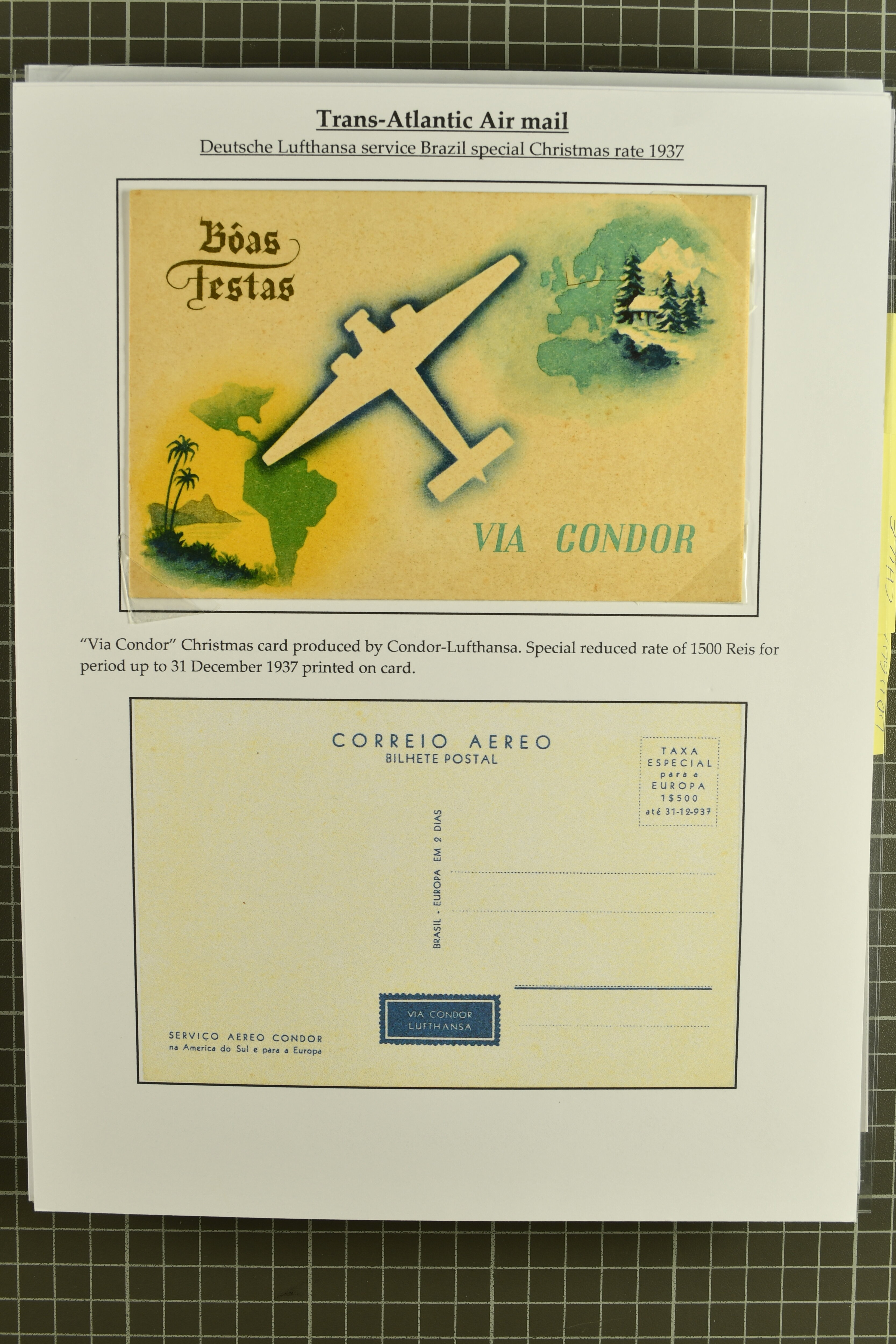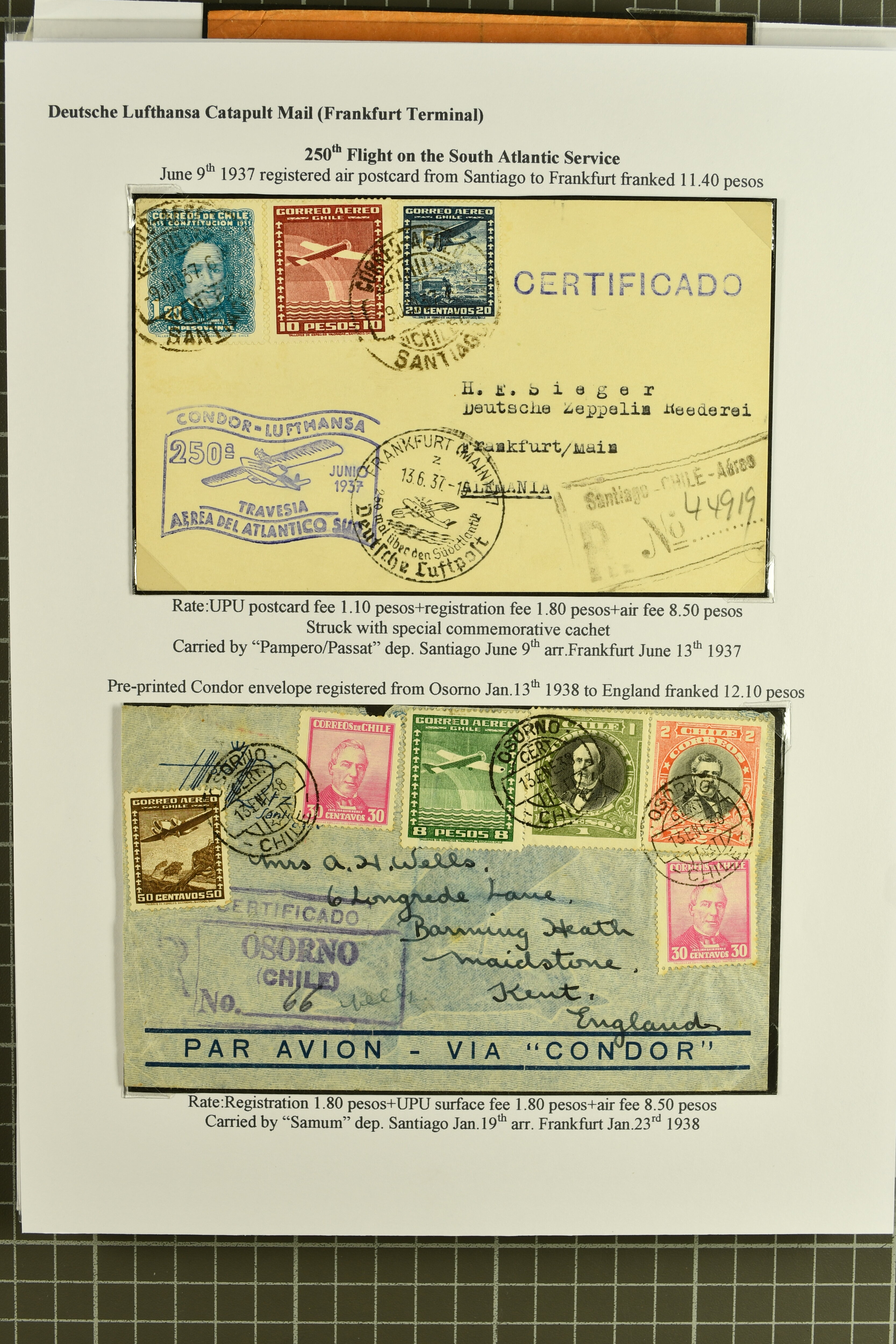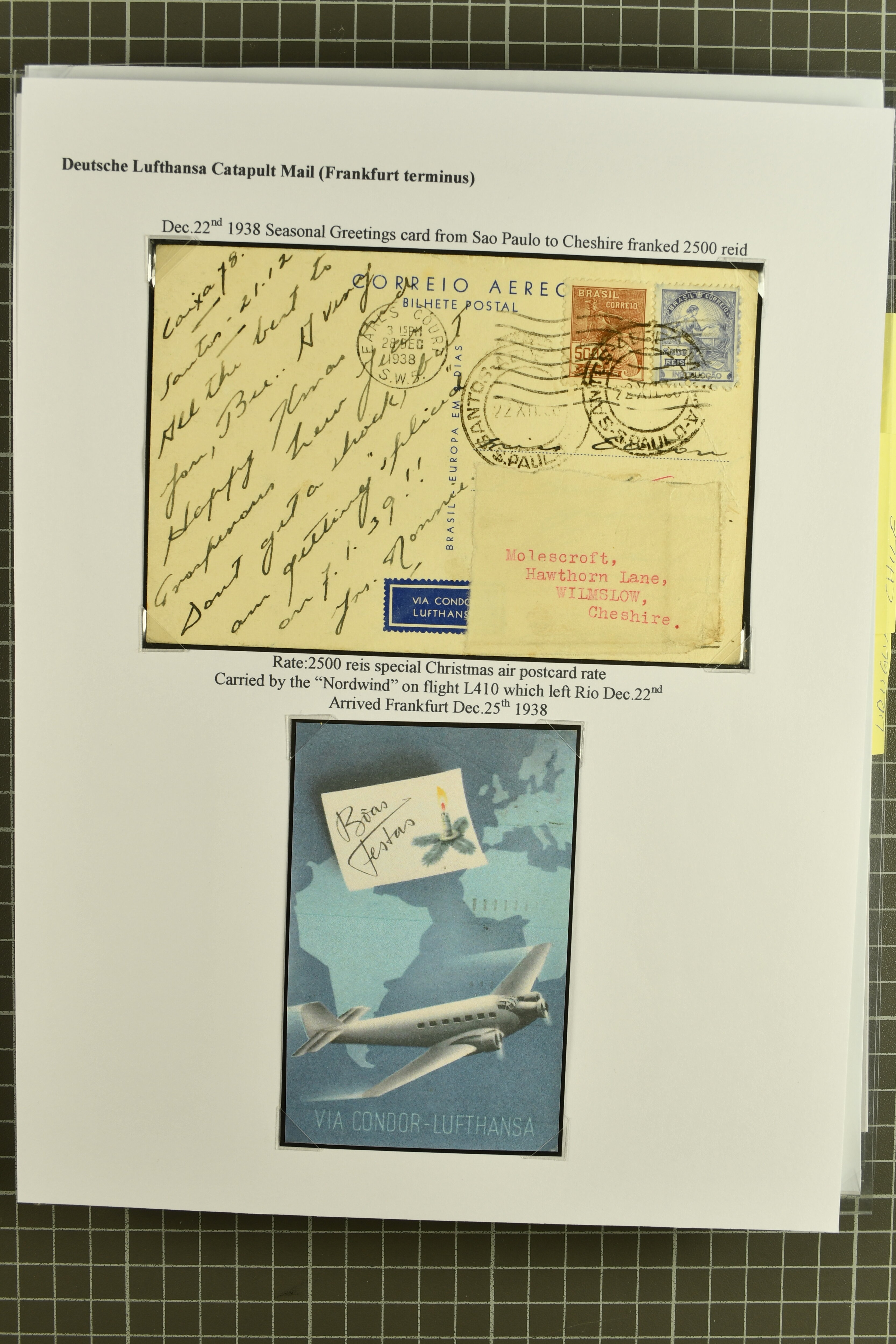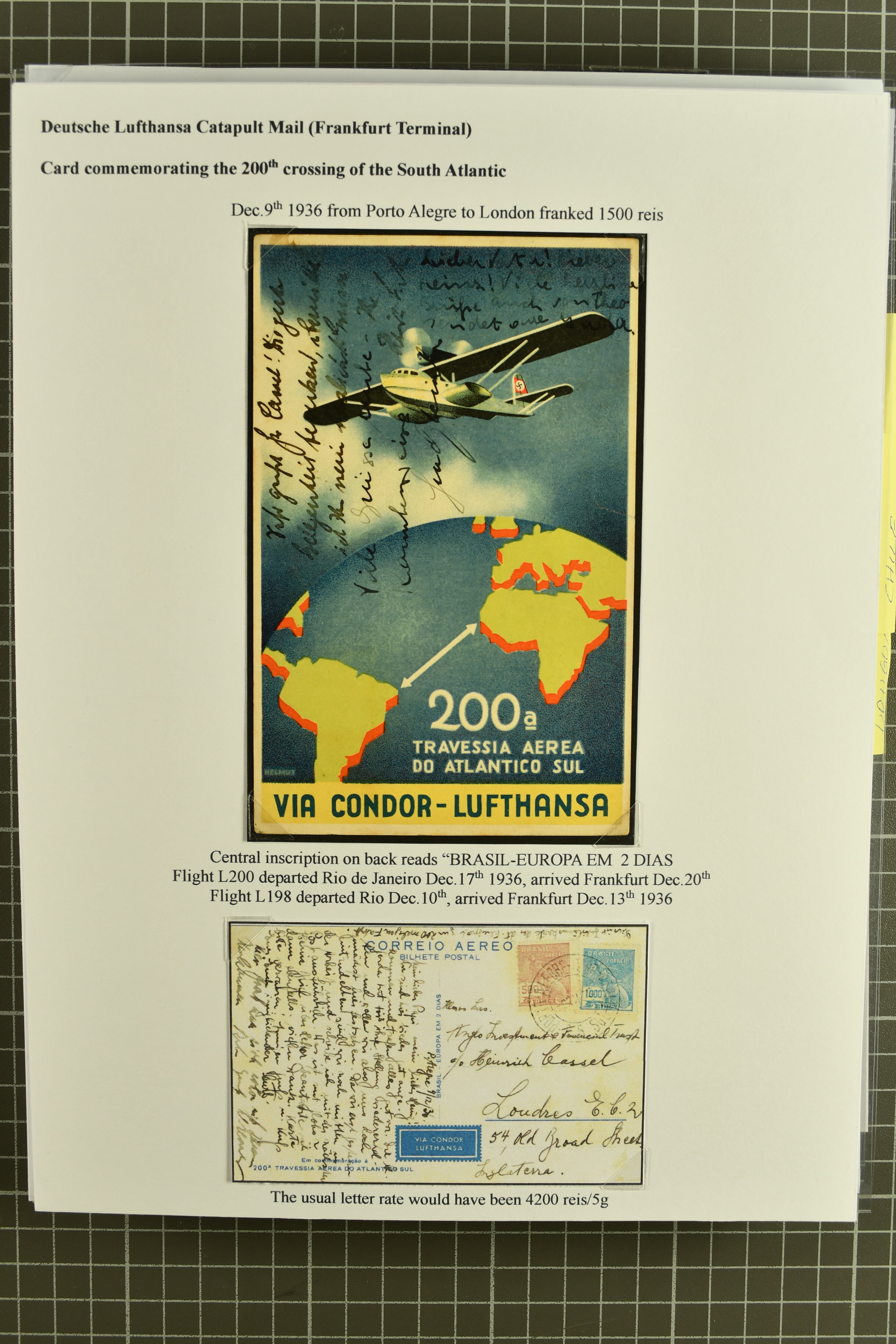 1714 cover imageKatapultpost Südatlantik 1934/39: Vielfältige Sammlung mit 65 geflogenen Belege sowie versch. Werbekarten und Drucksachen, dabei versch. Flugpläne, Postkarten, bezw. Neujahrskarten, ein ungebr. Condor-Lufthansa Mustersäcklein (12x18,5cm) ungebr., Bedarfspost wie R-Brief von Hamburg nach Punta Arenas (Magallenes 37.5.37), weiter ein Flugtarifplan ab Argentinien, R-Drucksache ab Hamburg mit 9.55 RM Frankatur nach Santiago de Chile, Argentinien mit div. Festtagskarten (6, inkl. Karte nach Budapest 1939), Post ab Brasilien 17 Belege mit 1932 Zeppelinzuleitung von Porto Alegre zur Zeppelin-Rückfahrt der 8. SA-Fahrt nach London, sechs versch. Werbekarten mit 1935/37 Weihnachtskarten 'Boas Festas', 1935 zwei frankierte Stoffmustersäckchen (11,5x26 cm), davon eines nach Hamburg, resp. das zweite nach London adressiert, ferner Katapultpost ab Chile, ein Brief ab Uruguay nach Schottland, 1938 je eine Grusskarte ab Paraguay bezw. Peru, sowie div. Zuleitungspost ab Europa mit guten, teils hohen Frankaturen, aufgeliefert via Stuttgart oder Frankfurt, dabei Post von Belgien, Dänemark, England (8, inkl. einer Zuleitung ab Brit. Postamt in Tangier Brit. Marokko), Italien (3), Niederlande (1), Österreich (2) und ab der Schweiz (1). Ein sehr attraktives Los, alles Bedarfspost, Besichtigung empfohlen (Image 1) (Image 2) (Image 3) (Image 4) (Image 5) (Image 6) (Image 7) (Image 8) (Image 9) (Image 10) (Image 11) (Image 12) (Image 13) (Image 14) (Image 15) (Image 16) (Image 17) (Image 18) (Image 19) (Image 20) (Image 21) (Image 22) (Image 23) (Image 24) (Image 25) (Image 26) (Image 27) (Image 28) (Image 29) (Image 30) (Image 31) (Image 32) (Image 33) (Image 34) (Image 35) (Image 36) (Image 37) (Image 38) (Image 39) (Image 40) (Image 41) (Image 42) (Image 43) (Image 44) (Image 45) (Image 46) (Image 47) (Image 48) (Image 49) (Image 50)
