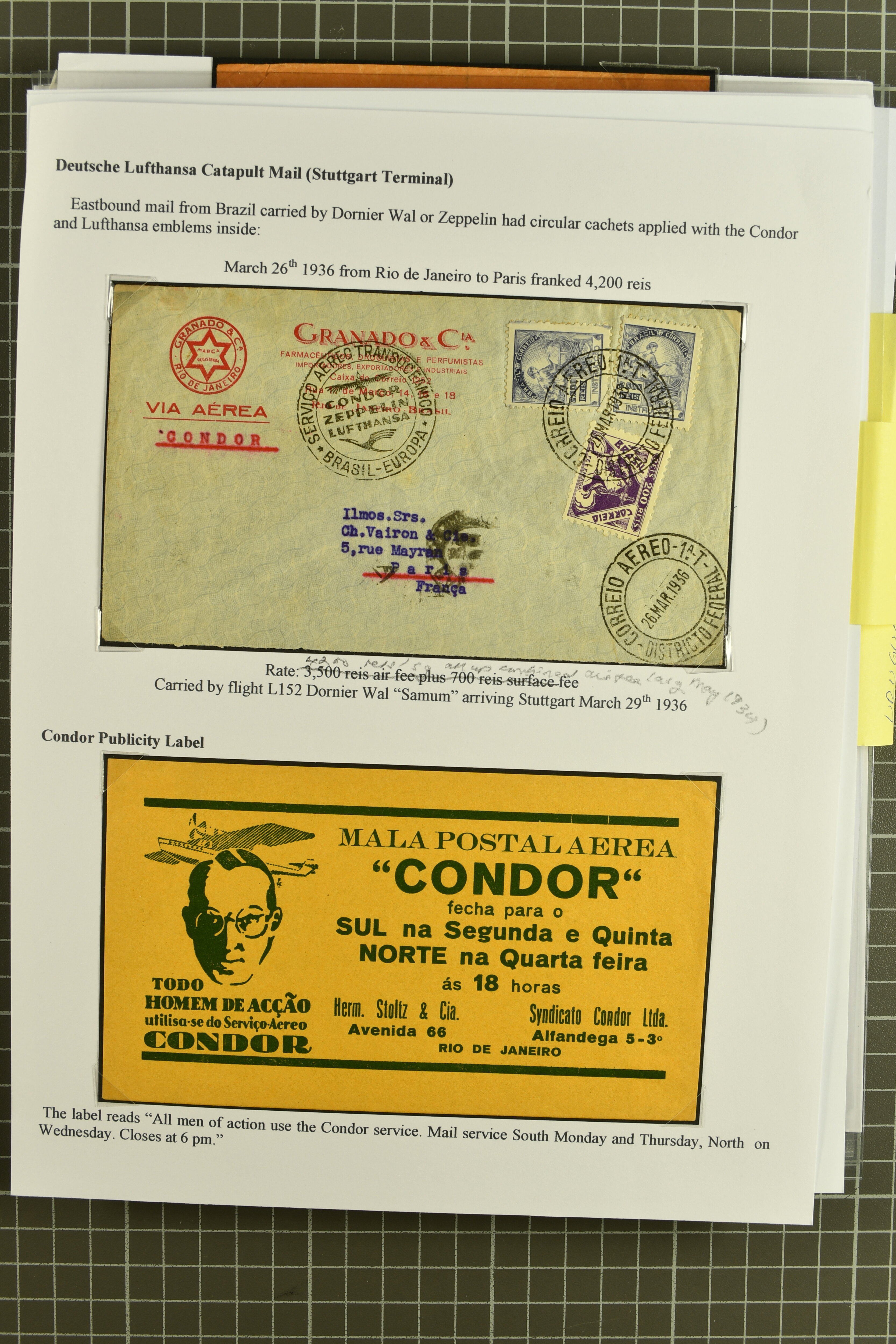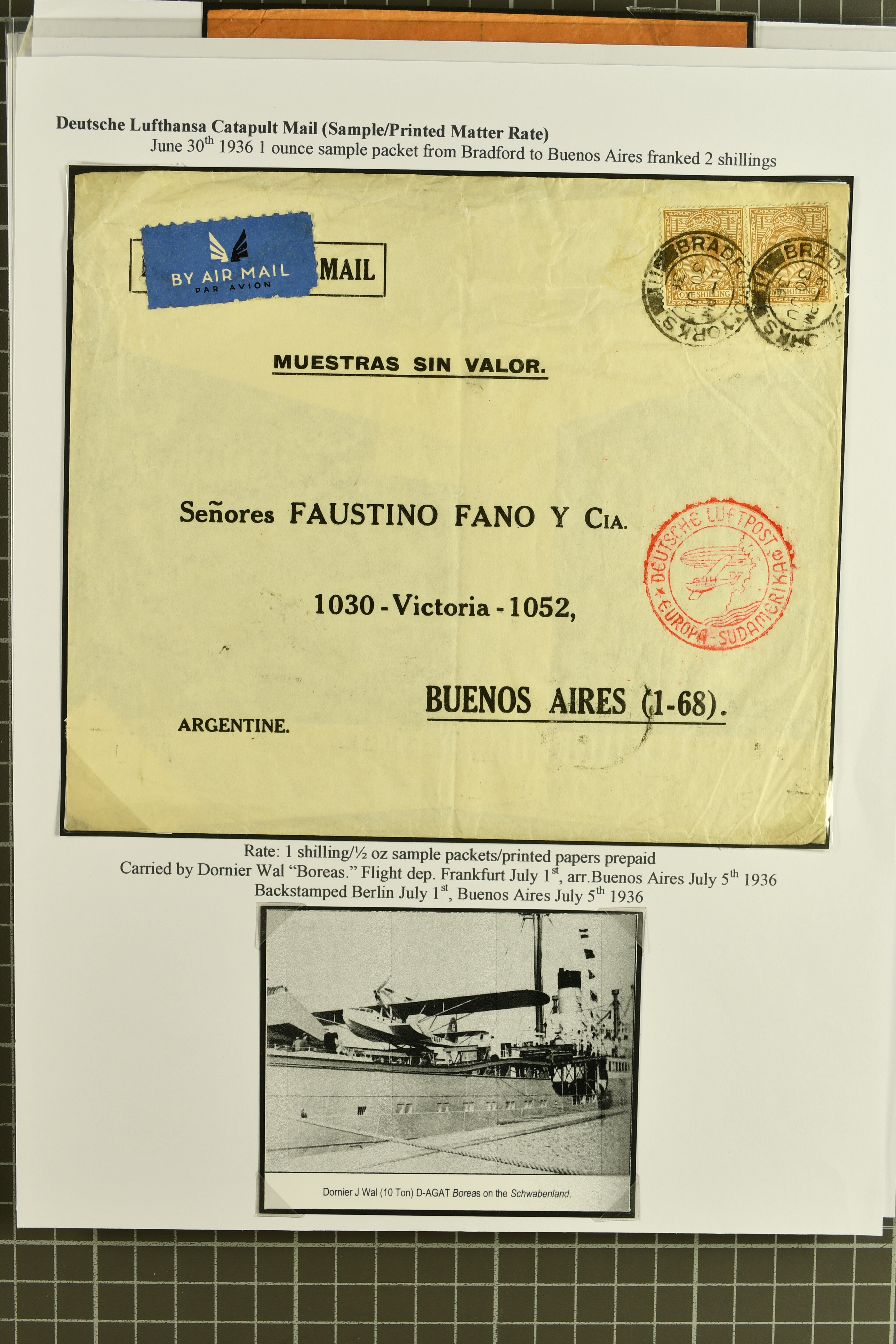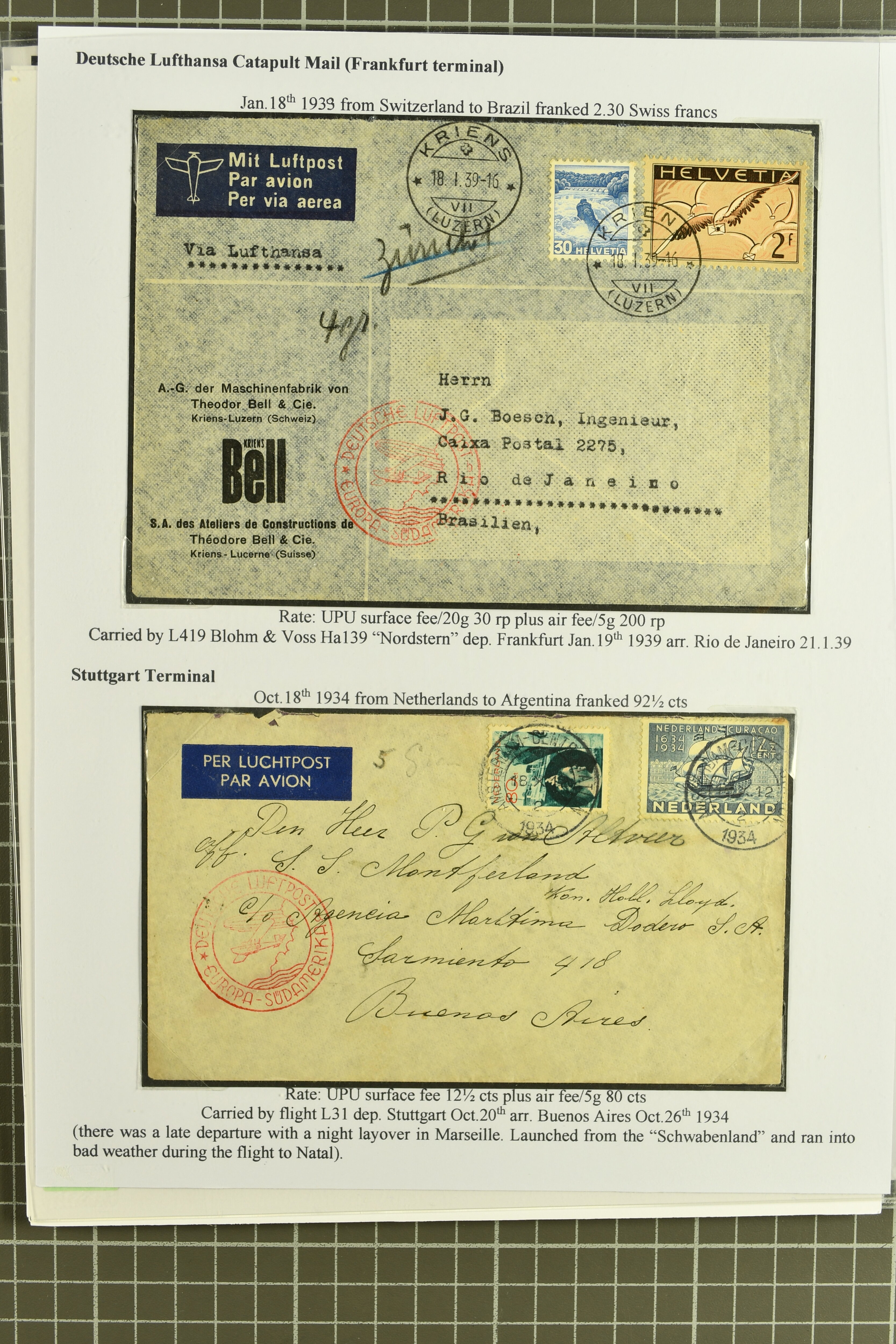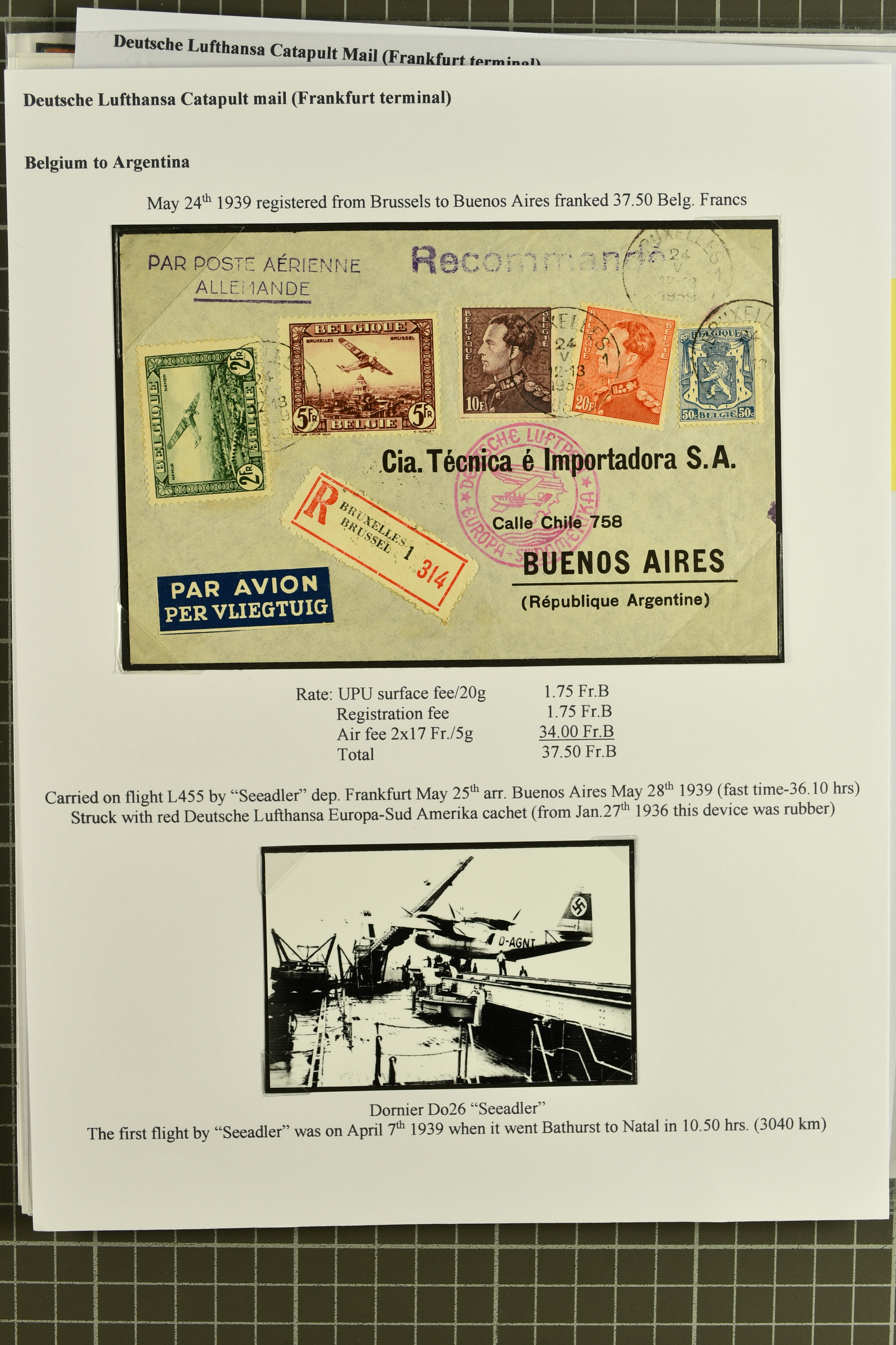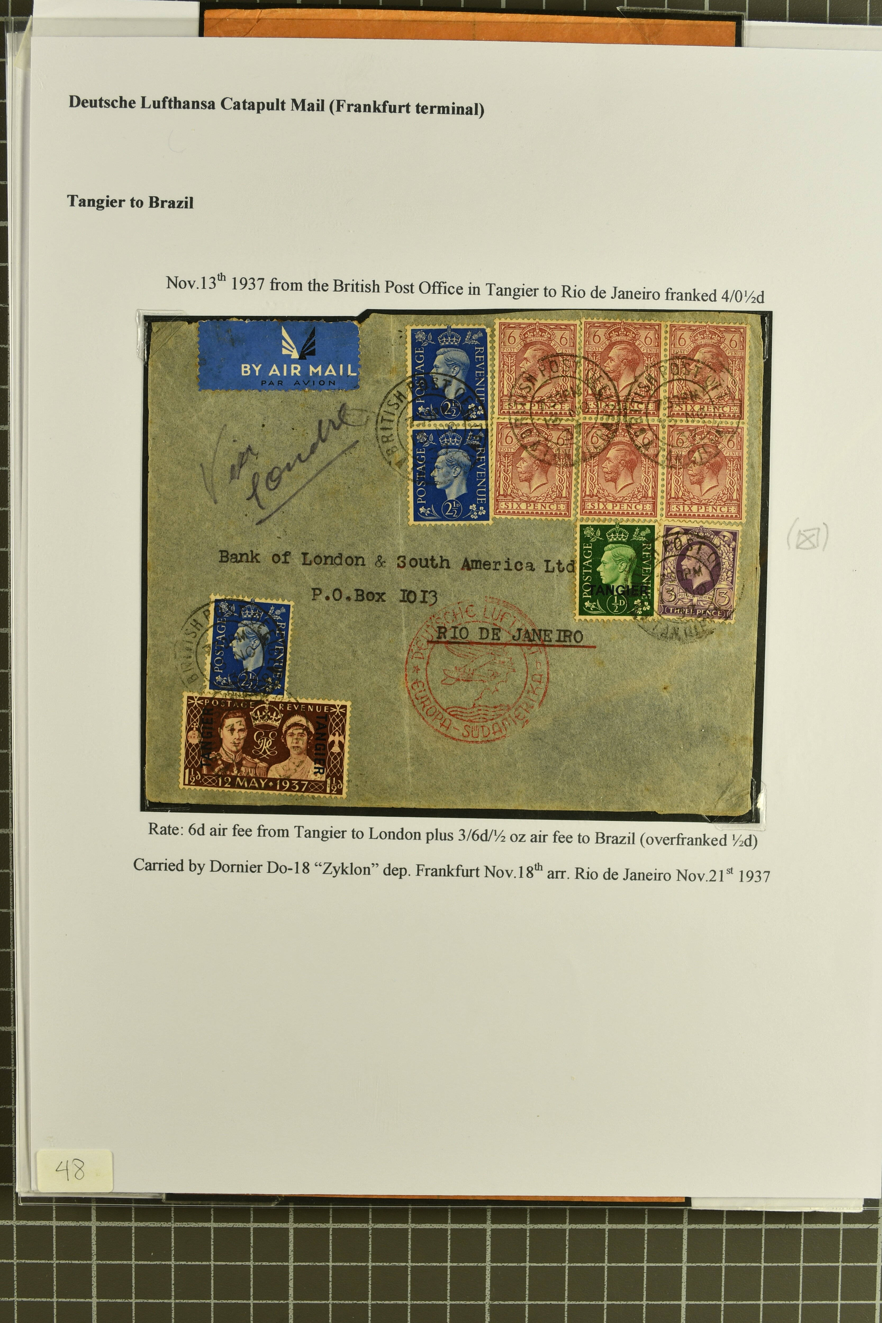1714 cover imageKatapultpost Südatlantik 1934/39: Vielfältige Sammlung mit 65 geflogenen Belege sowie versch. Werbekarten und Drucksachen, dabei versch. Flugpläne, Postkarten, bezw. Neujahrskarten, ein ungebr. Condor-Lufthansa Mustersäcklein (12x18,5cm) ungebr., Bedarfspost wie R-Brief von Hamburg nach Punta Arenas (Magallenes 37.5.37), weiter ein Flugtarifplan ab Argentinien, R-Drucksache ab Hamburg mit 9.55 RM Frankatur nach Santiago de Chile, Argentinien mit div. Festtagskarten (6, inkl. Karte nach Budapest 1939), Post ab Brasilien 17 Belege mit 1932 Zeppelinzuleitung von Porto Alegre zur Zeppelin-Rückfahrt der 8. SA-Fahrt nach London, sechs versch. Werbekarten mit 1935/37 Weihnachtskarten 'Boas Festas', 1935 zwei frankierte Stoffmustersäckchen (11,5x26 cm), davon eines nach Hamburg, resp. das zweite nach London adressiert, ferner Katapultpost ab Chile, ein Brief ab Uruguay nach Schottland, 1938 je eine Grusskarte ab Paraguay bezw. Peru, sowie div. Zuleitungspost ab Europa mit guten, teils hohen Frankaturen, aufgeliefert via Stuttgart oder Frankfurt, dabei Post von Belgien, Dänemark, England (8, inkl. einer Zuleitung ab Brit. Postamt in Tangier Brit. Marokko), Italien (3), Niederlande (1), Österreich (2) und ab der Schweiz (1). Ein sehr attraktives Los, alles Bedarfspost, Besichtigung empfohlen (Image 1) (Image 2) (Image 3) (Image 4) (Image 5) (Image 6) (Image 7) (Image 8) (Image 9) (Image 10) (Image 11) (Image 12) (Image 13) (Image 14) (Image 15) (Image 16) (Image 17) (Image 18) (Image 19) (Image 20) (Image 21) (Image 22) (Image 23) (Image 24) (Image 25) (Image 26) (Image 27) (Image 28) (Image 29) (Image 30) (Image 31) (Image 32) (Image 33) (Image 34) (Image 35) (Image 36) (Image 37) (Image 38) (Image 39) (Image 40) (Image 41) (Image 42) (Image 43) (Image 44) (Image 45) (Image 46) (Image 47) (Image 48) (Image 49) (Image 50)