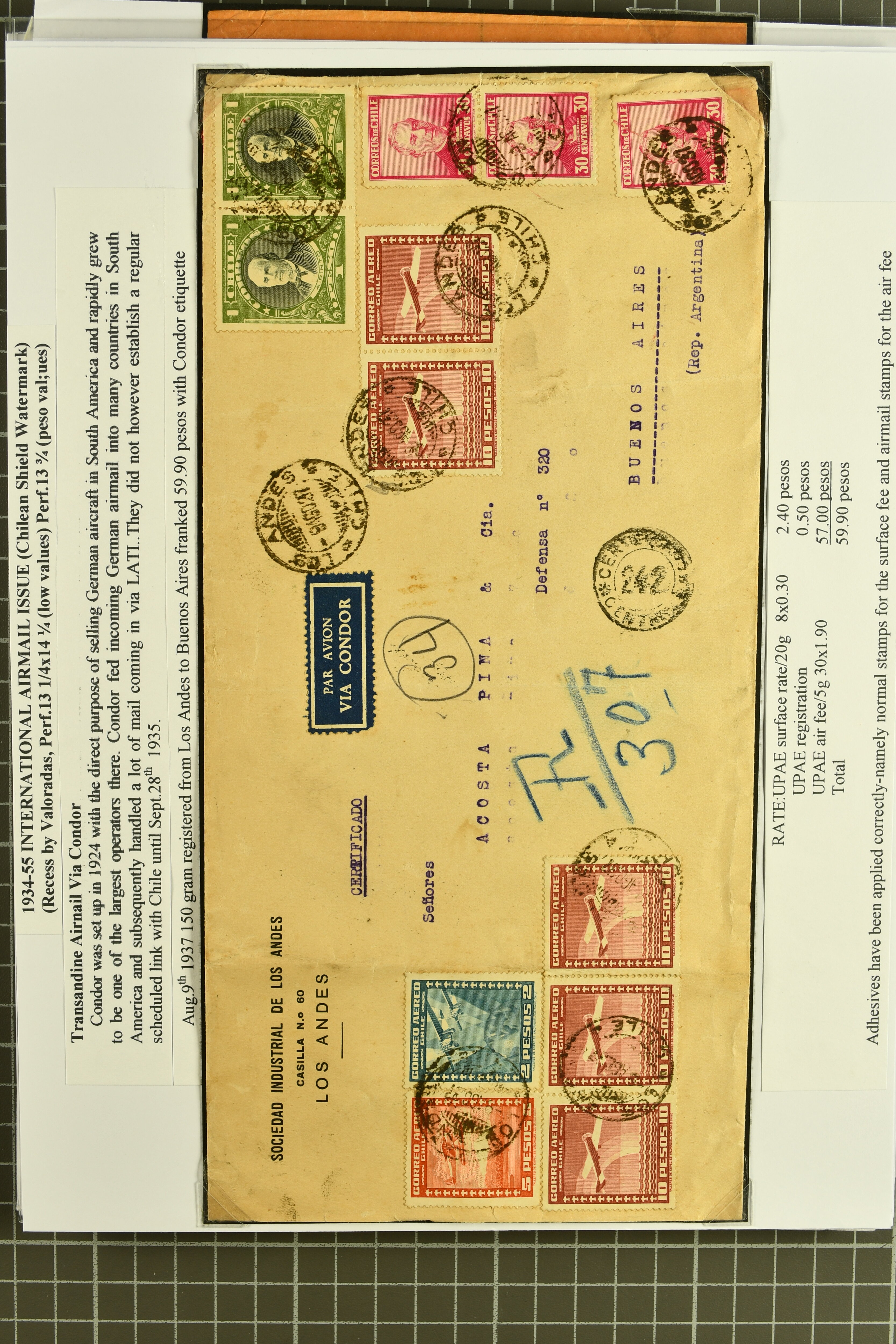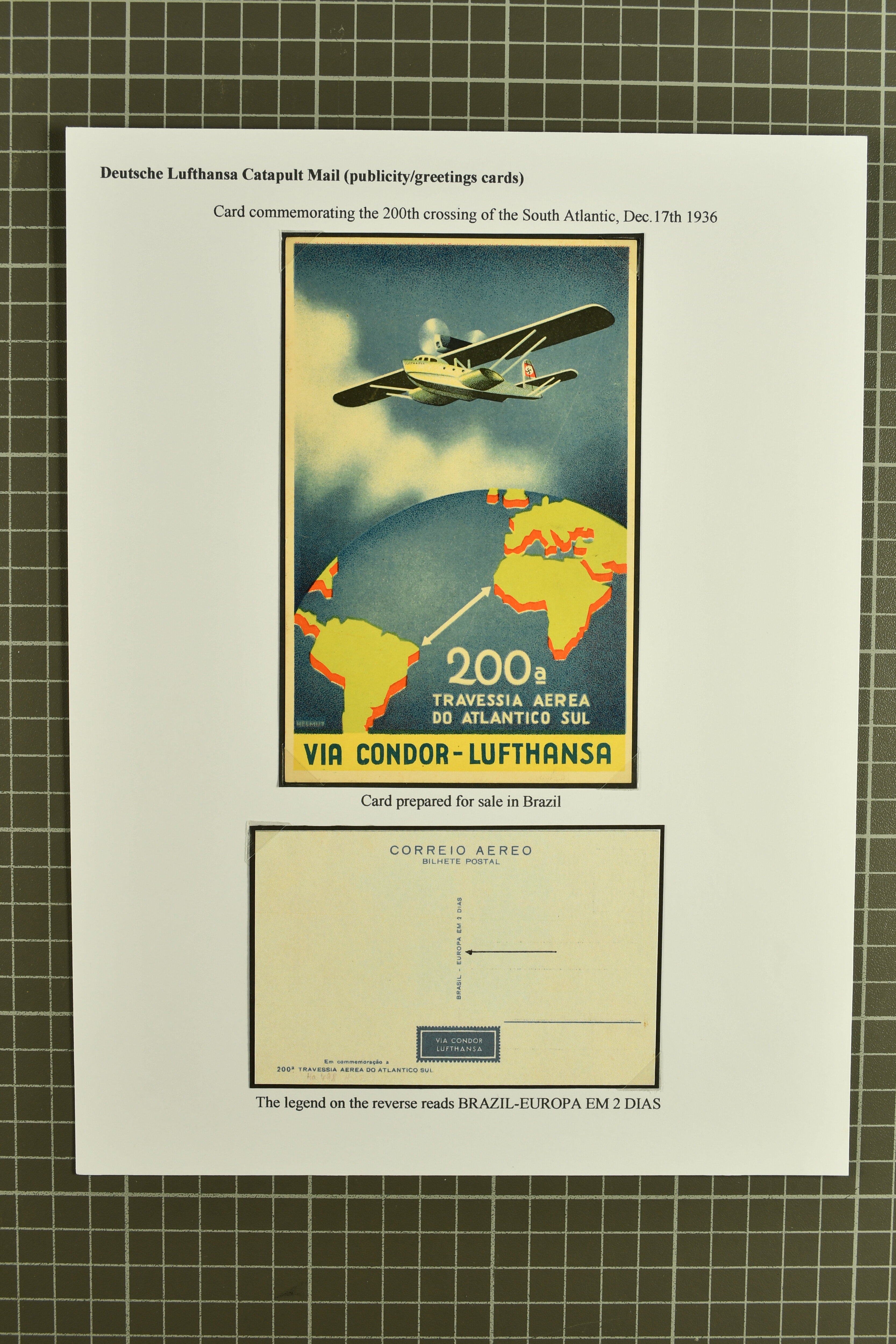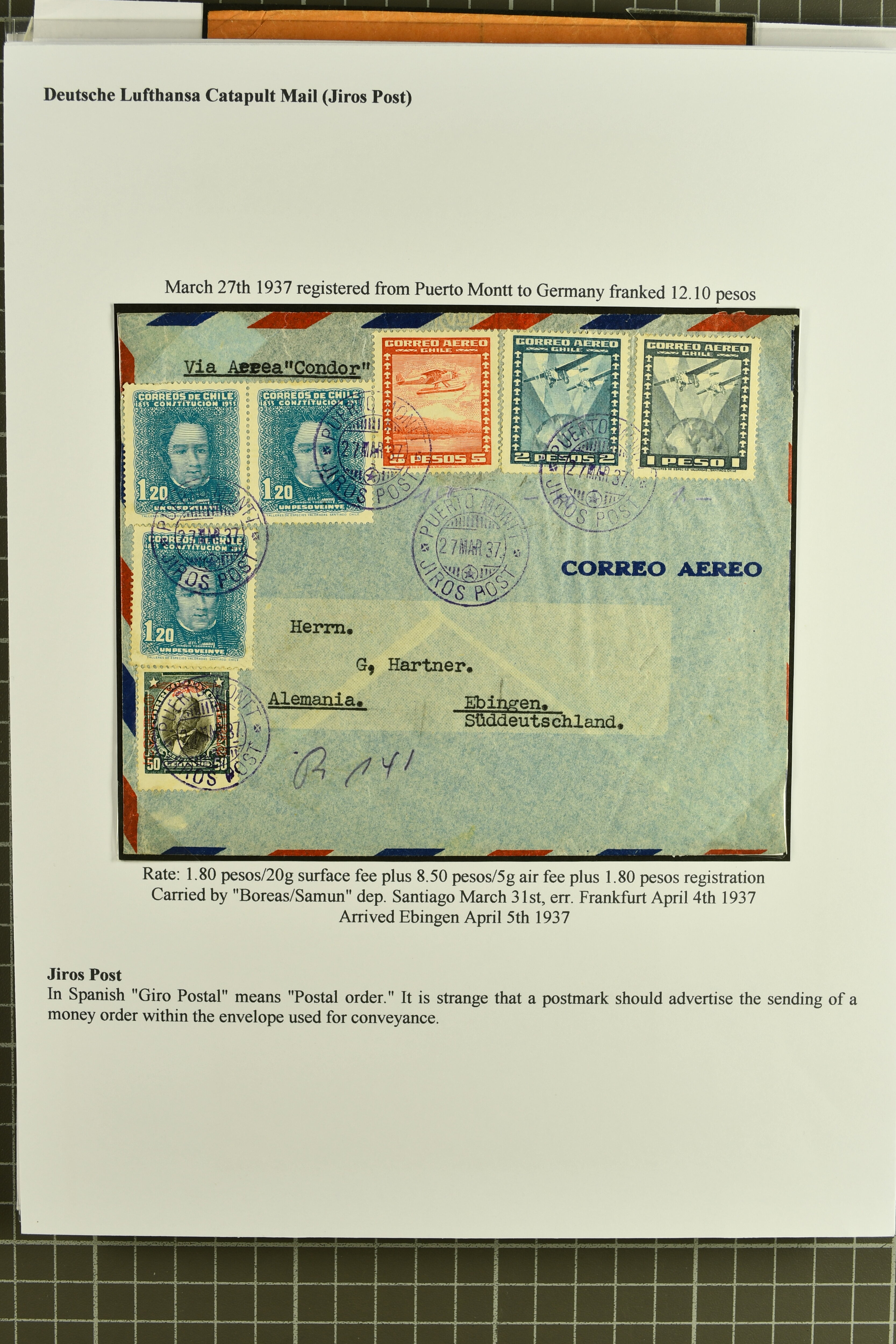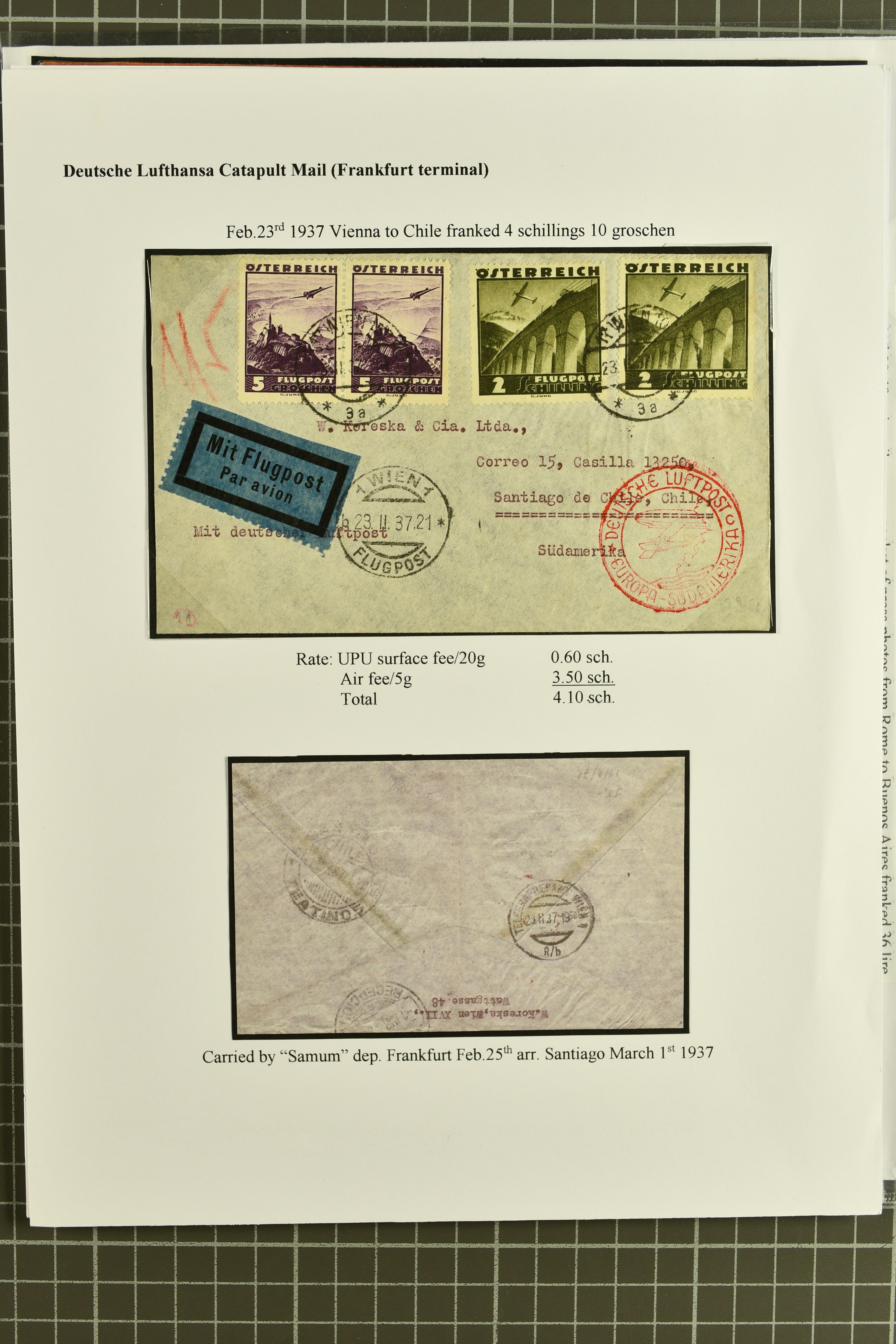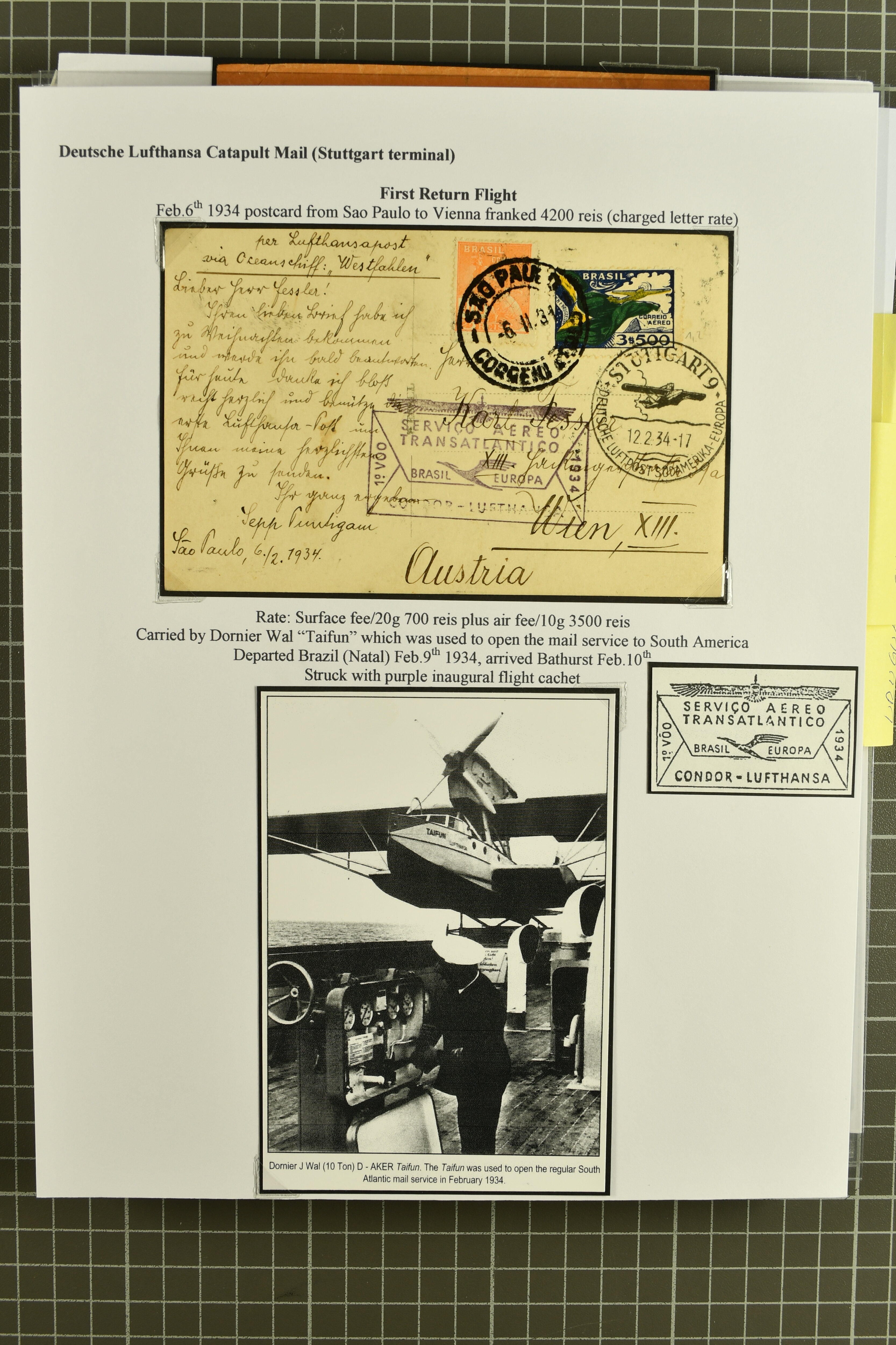 1714 cover imageKatapultpost Südatlantik 1934/39: Vielfältige Sammlung mit 65 geflogenen Belege sowie versch. Werbekarten und Drucksachen, dabei versch. Flugpläne, Postkarten, bezw. Neujahrskarten, ein ungebr. Condor-Lufthansa Mustersäcklein (12x18,5cm) ungebr., Bedarfspost wie R-Brief von Hamburg nach Punta Arenas (Magallenes 37.5.37), weiter ein Flugtarifplan ab Argentinien, R-Drucksache ab Hamburg mit 9.55 RM Frankatur nach Santiago de Chile, Argentinien mit div. Festtagskarten (6, inkl. Karte nach Budapest 1939), Post ab Brasilien 17 Belege mit 1932 Zeppelinzuleitung von Porto Alegre zur Zeppelin-Rückfahrt der 8. SA-Fahrt nach London, sechs versch. Werbekarten mit 1935/37 Weihnachtskarten 'Boas Festas', 1935 zwei frankierte Stoffmustersäckchen (11,5x26 cm), davon eines nach Hamburg, resp. das zweite nach London adressiert, ferner Katapultpost ab Chile, ein Brief ab Uruguay nach Schottland, 1938 je eine Grusskarte ab Paraguay bezw. Peru, sowie div. Zuleitungspost ab Europa mit guten, teils hohen Frankaturen, aufgeliefert via Stuttgart oder Frankfurt, dabei Post von Belgien, Dänemark, England (8, inkl. einer Zuleitung ab Brit. Postamt in Tangier Brit. Marokko), Italien (3), Niederlande (1), Österreich (2) und ab der Schweiz (1). Ein sehr attraktives Los, alles Bedarfspost, Besichtigung empfohlen (Image 1) (Image 2) (Image 3) (Image 4) (Image 5) (Image 6) (Image 7) (Image 8) (Image 9) (Image 10) (Image 11) (Image 12) (Image 13) (Image 14) (Image 15) (Image 16) (Image 17) (Image 18) (Image 19) (Image 20) (Image 21) (Image 22) (Image 23) (Image 24) (Image 25) (Image 26) (Image 27) (Image 28) (Image 29) (Image 30) (Image 31) (Image 32) (Image 33) (Image 34) (Image 35) (Image 36) (Image 37) (Image 38) (Image 39) (Image 40) (Image 41) (Image 42) (Image 43) (Image 44) (Image 45) (Image 46) (Image 47) (Image 48) (Image 49) (Image 50)