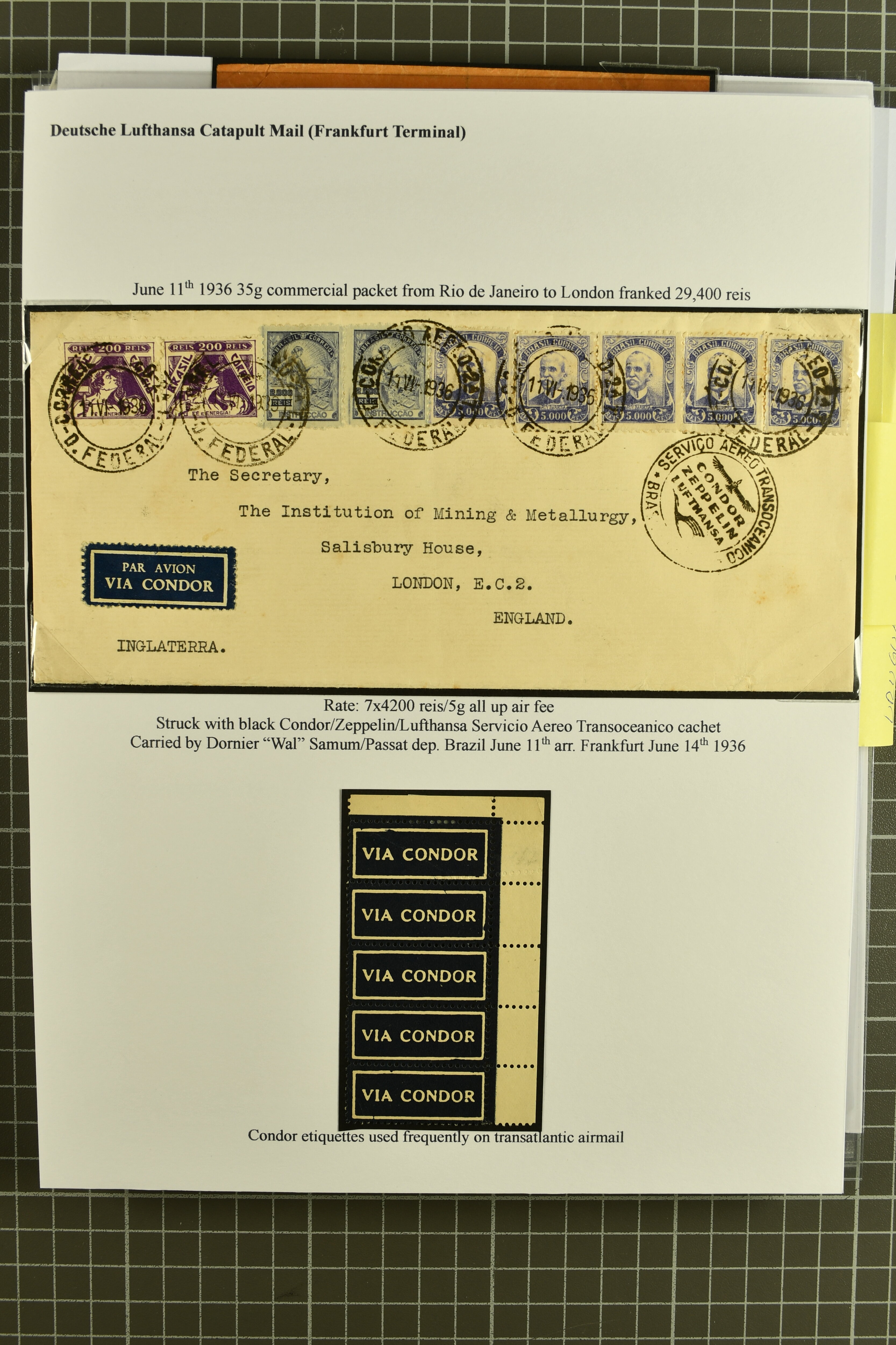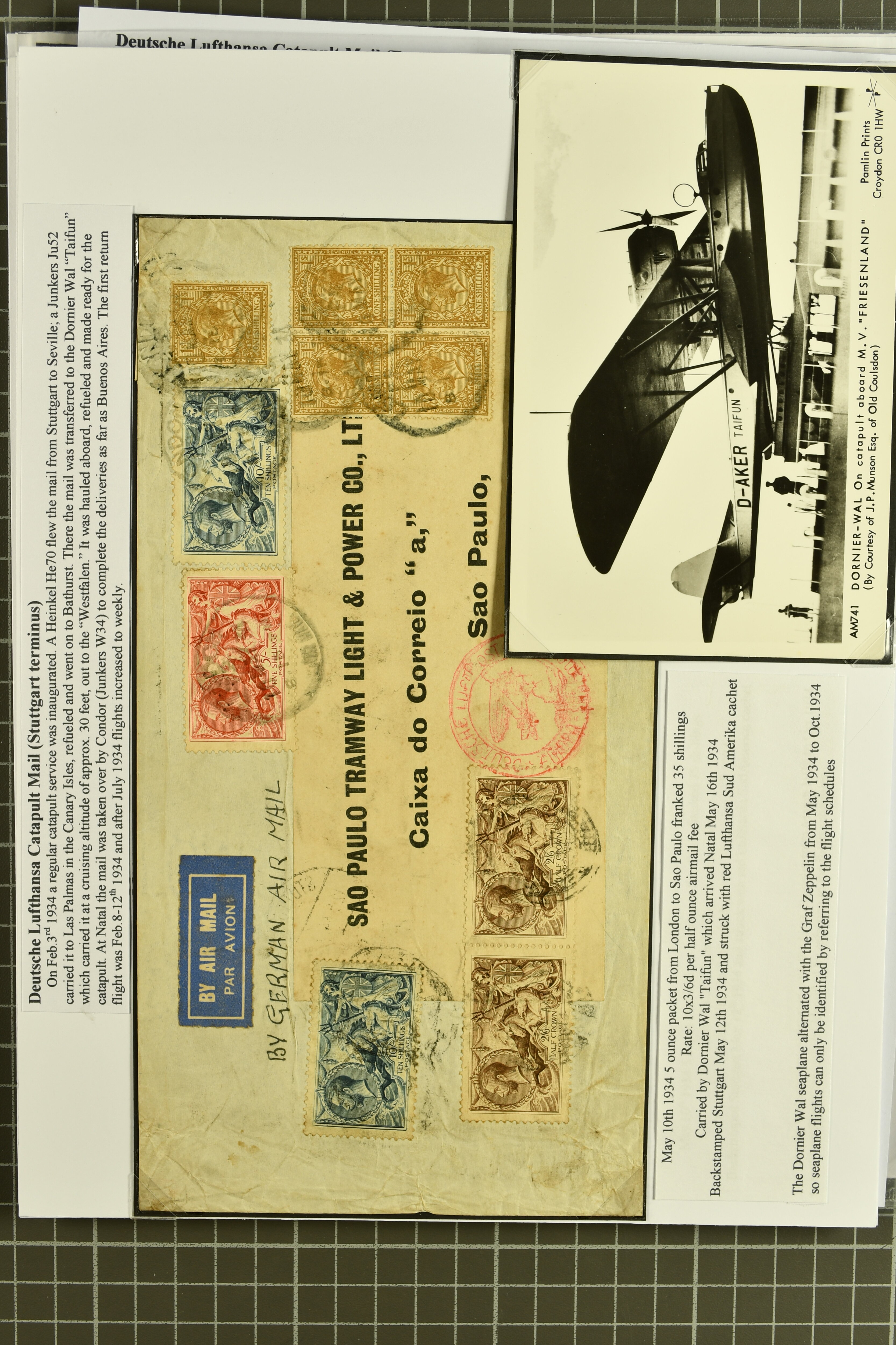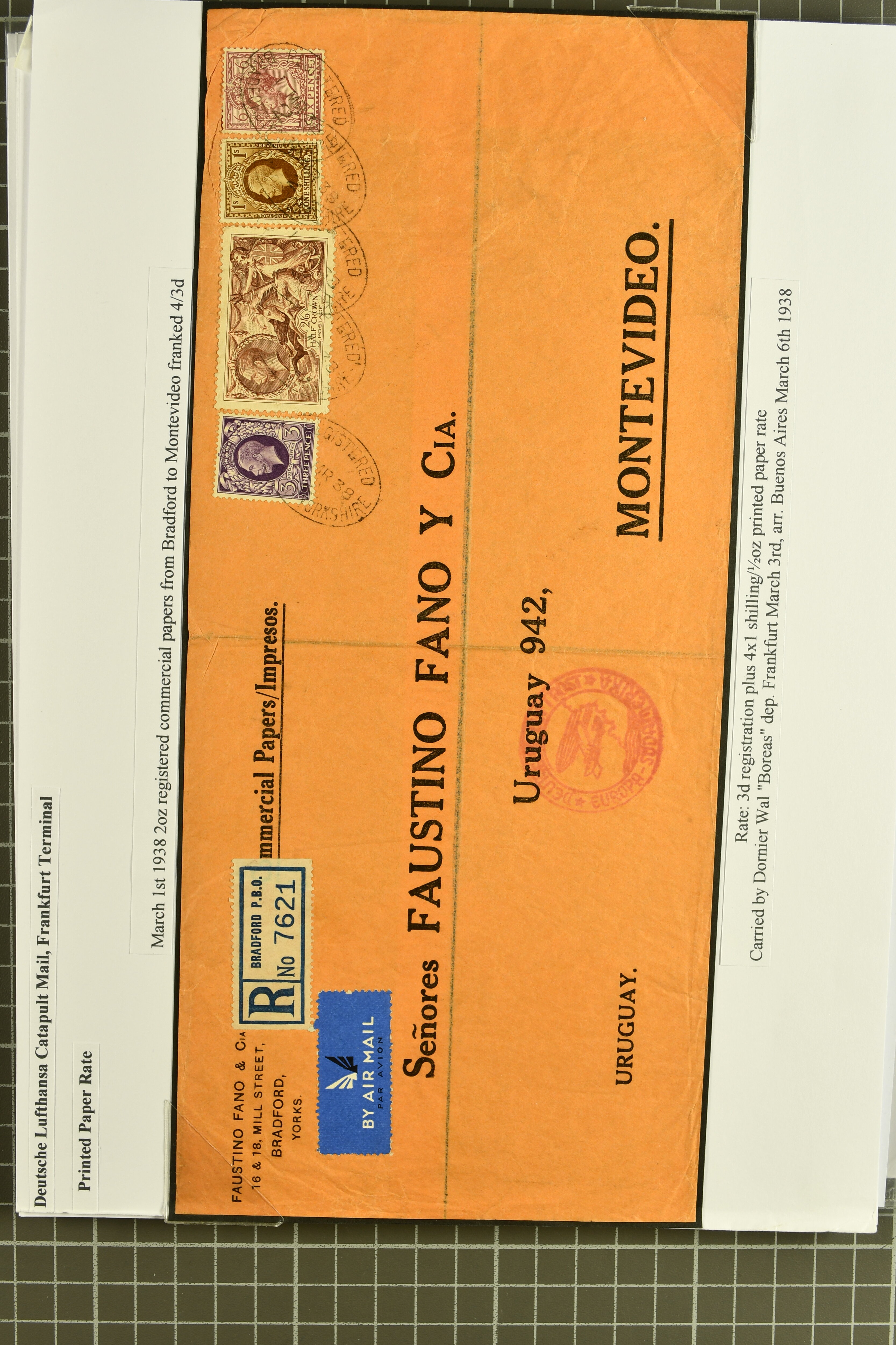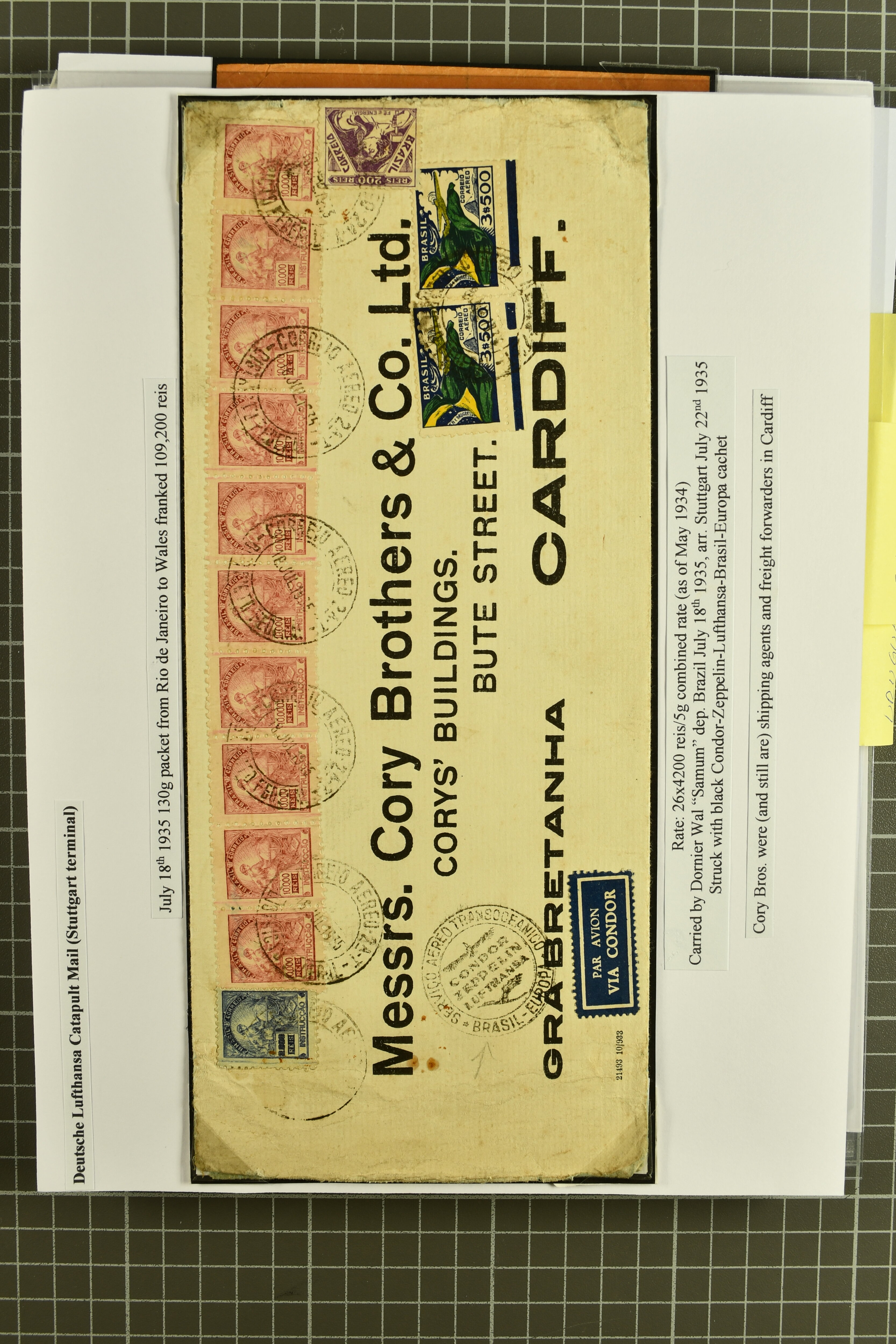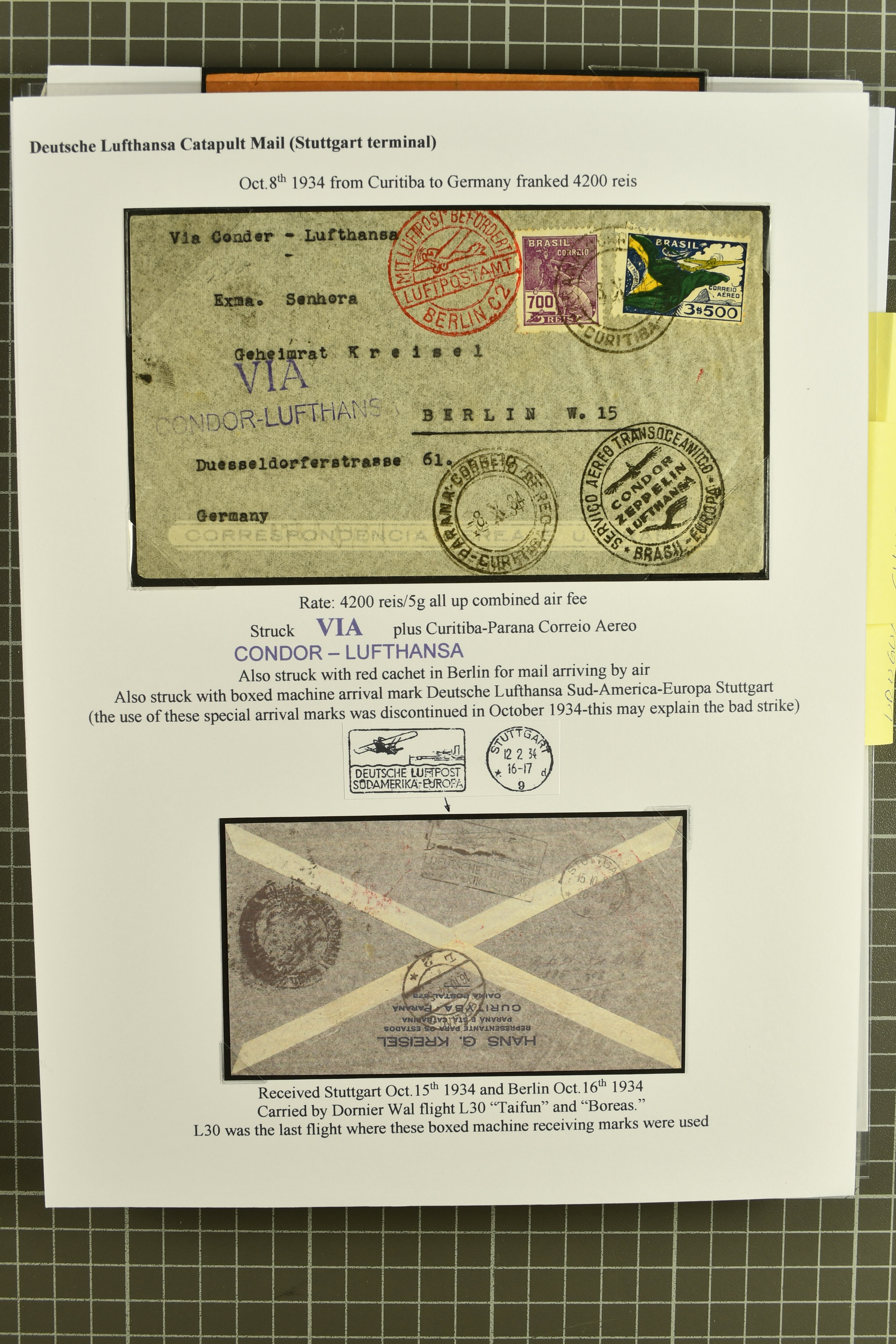 1714 cover imageKatapultpost Südatlantik 1934/39: Vielfältige Sammlung mit 65 geflogenen Belege sowie versch. Werbekarten und Drucksachen, dabei versch. Flugpläne, Postkarten, bezw. Neujahrskarten, ein ungebr. Condor-Lufthansa Mustersäcklein (12x18,5cm) ungebr., Bedarfspost wie R-Brief von Hamburg nach Punta Arenas (Magallenes 37.5.37), weiter ein Flugtarifplan ab Argentinien, R-Drucksache ab Hamburg mit 9.55 RM Frankatur nach Santiago de Chile, Argentinien mit div. Festtagskarten (6, inkl. Karte nach Budapest 1939), Post ab Brasilien 17 Belege mit 1932 Zeppelinzuleitung von Porto Alegre zur Zeppelin-Rückfahrt der 8. SA-Fahrt nach London, sechs versch. Werbekarten mit 1935/37 Weihnachtskarten 'Boas Festas', 1935 zwei frankierte Stoffmustersäckchen (11,5x26 cm), davon eines nach Hamburg, resp. das zweite nach London adressiert, ferner Katapultpost ab Chile, ein Brief ab Uruguay nach Schottland, 1938 je eine Grusskarte ab Paraguay bezw. Peru, sowie div. Zuleitungspost ab Europa mit guten, teils hohen Frankaturen, aufgeliefert via Stuttgart oder Frankfurt, dabei Post von Belgien, Dänemark, England (8, inkl. einer Zuleitung ab Brit. Postamt in Tangier Brit. Marokko), Italien (3), Niederlande (1), Österreich (2) und ab der Schweiz (1). Ein sehr attraktives Los, alles Bedarfspost, Besichtigung empfohlen (Image 1) (Image 2) (Image 3) (Image 4) (Image 5) (Image 6) (Image 7) (Image 8) (Image 9) (Image 10) (Image 11) (Image 12) (Image 13) (Image 14) (Image 15) (Image 16) (Image 17) (Image 18) (Image 19) (Image 20) (Image 21) (Image 22) (Image 23) (Image 24) (Image 25) (Image 26) (Image 27) (Image 28) (Image 29) (Image 30) (Image 31) (Image 32) (Image 33) (Image 34) (Image 35) (Image 36) (Image 37) (Image 38) (Image 39) (Image 40) (Image 41) (Image 42) (Image 43) (Image 44) (Image 45) (Image 46) (Image 47) (Image 48) (Image 49) (Image 50)