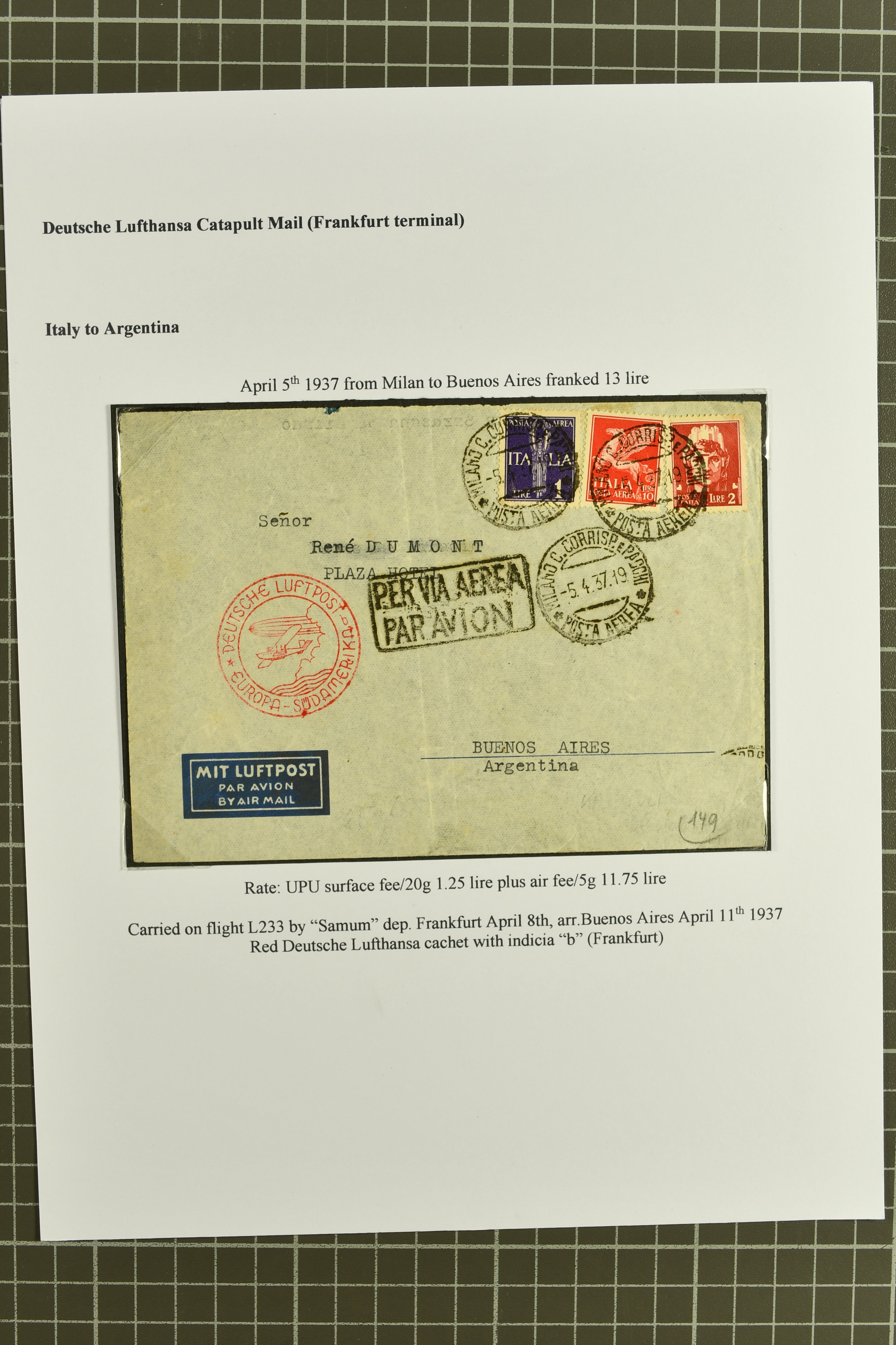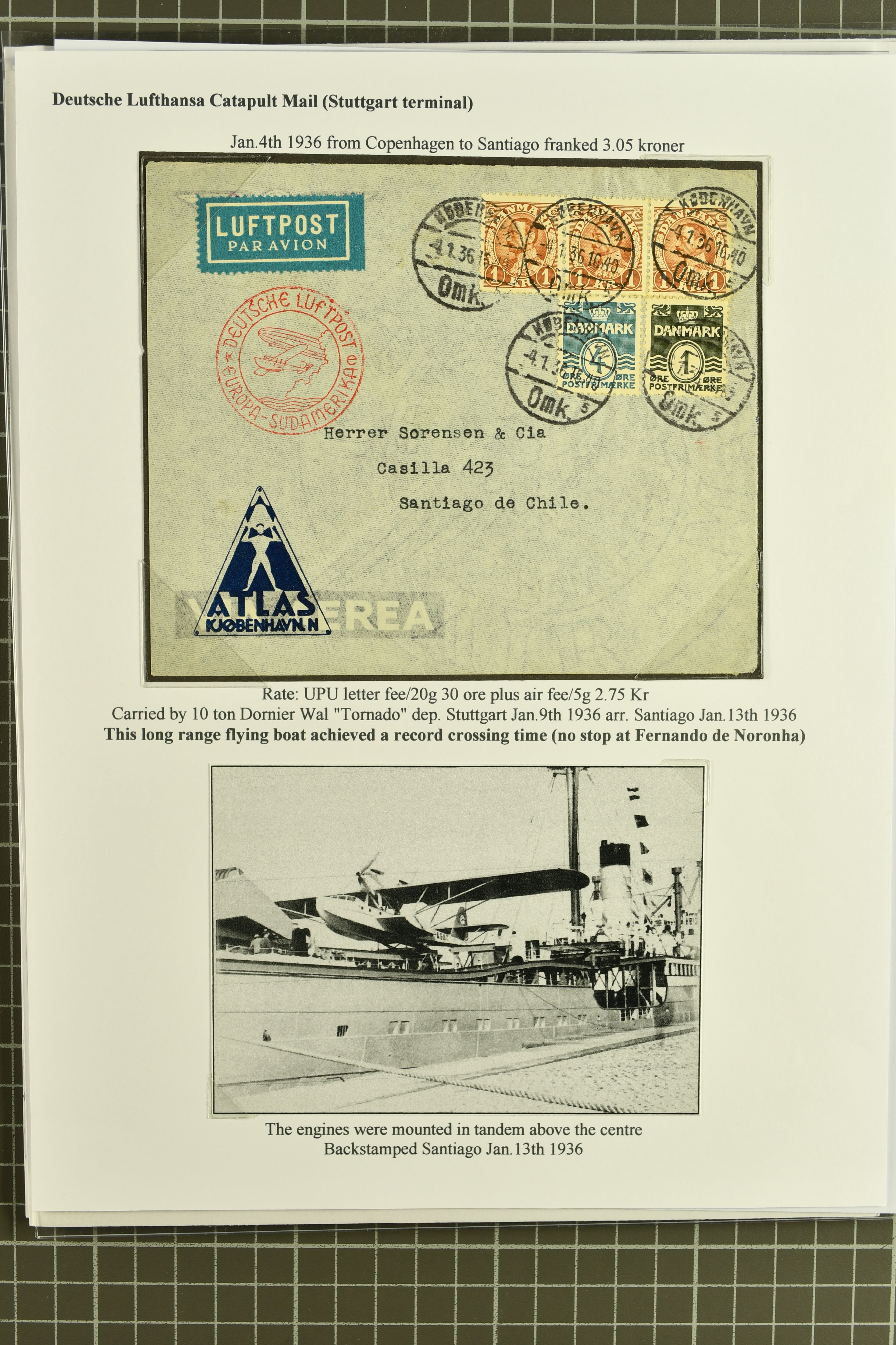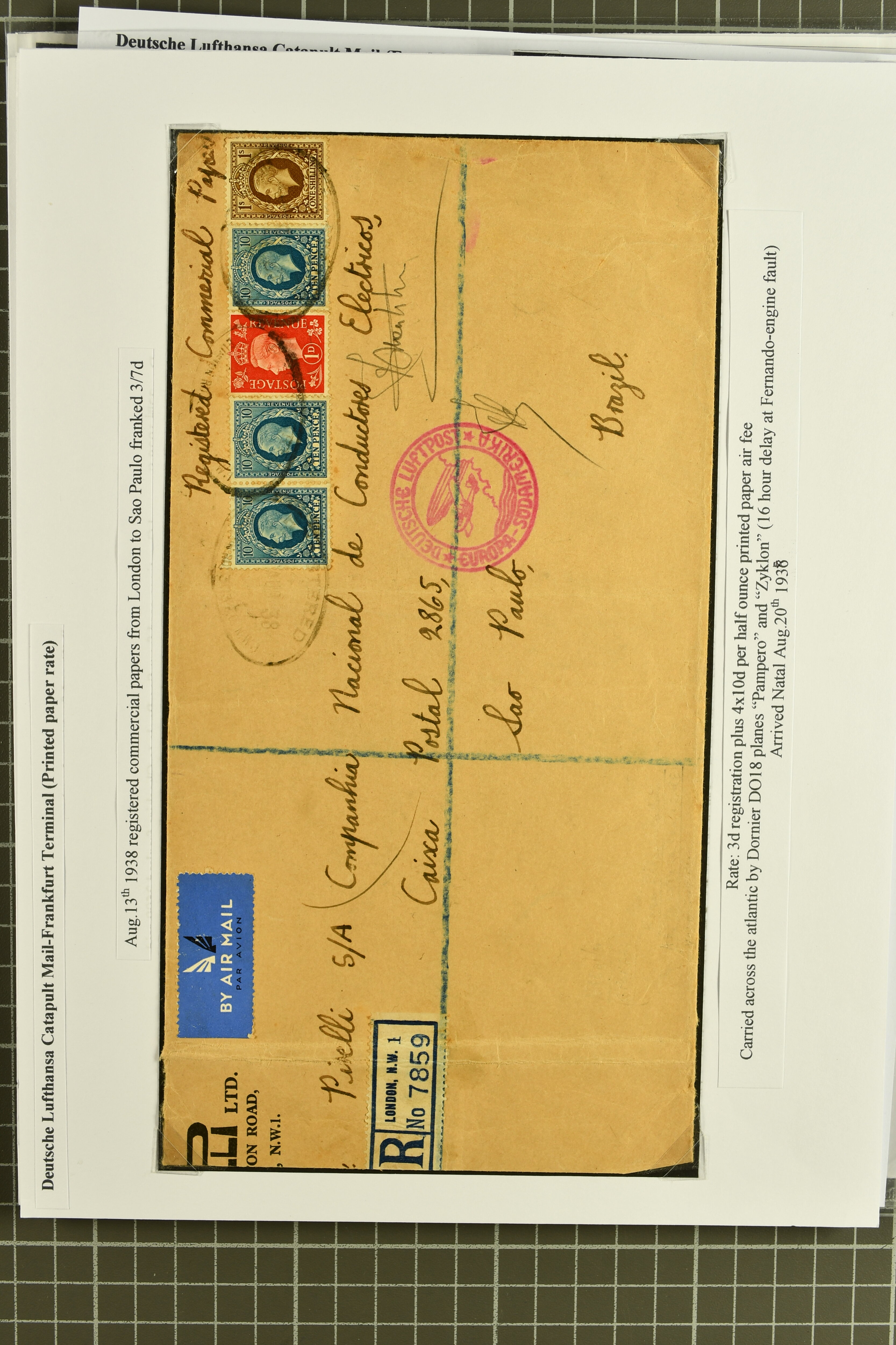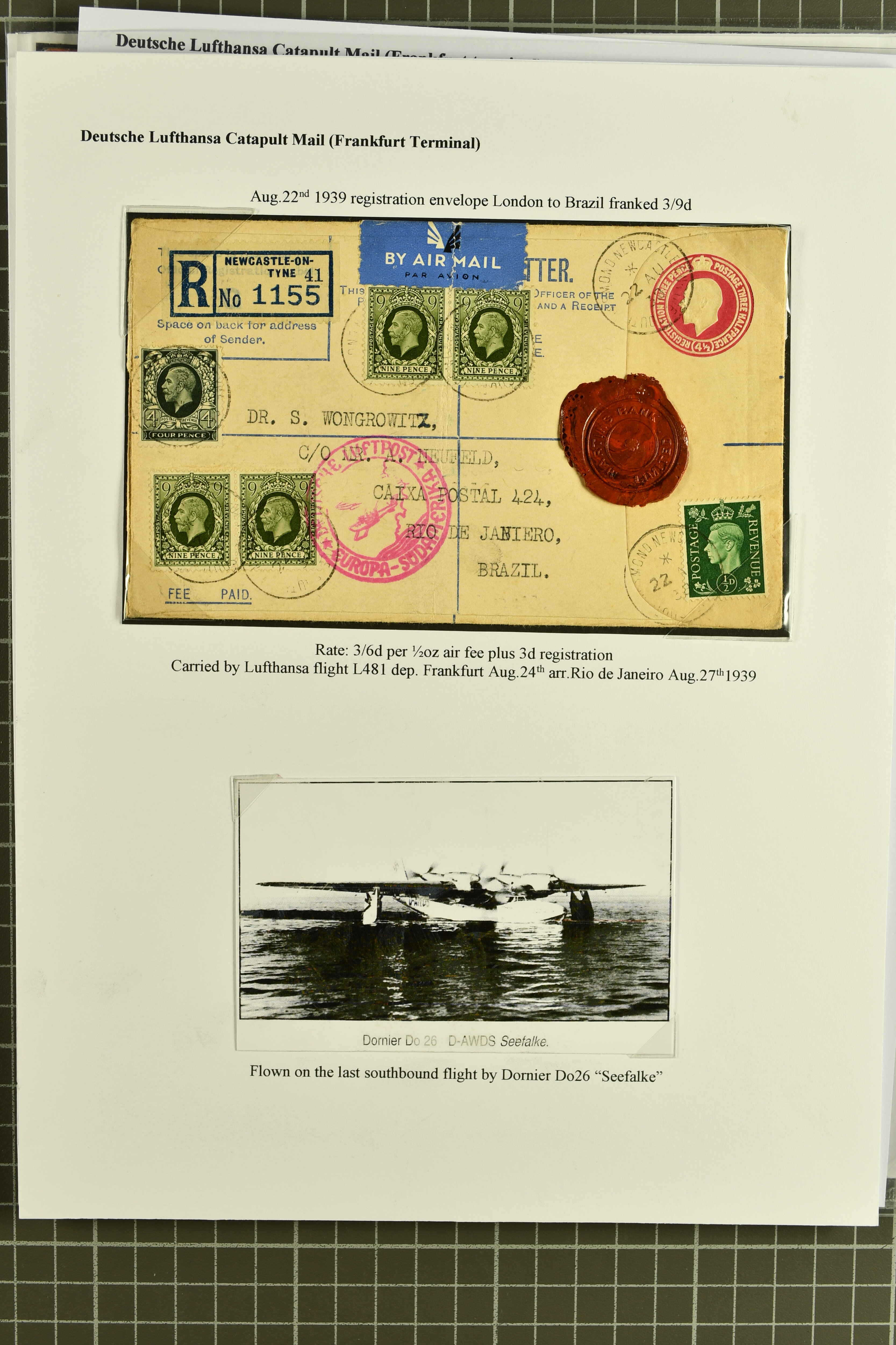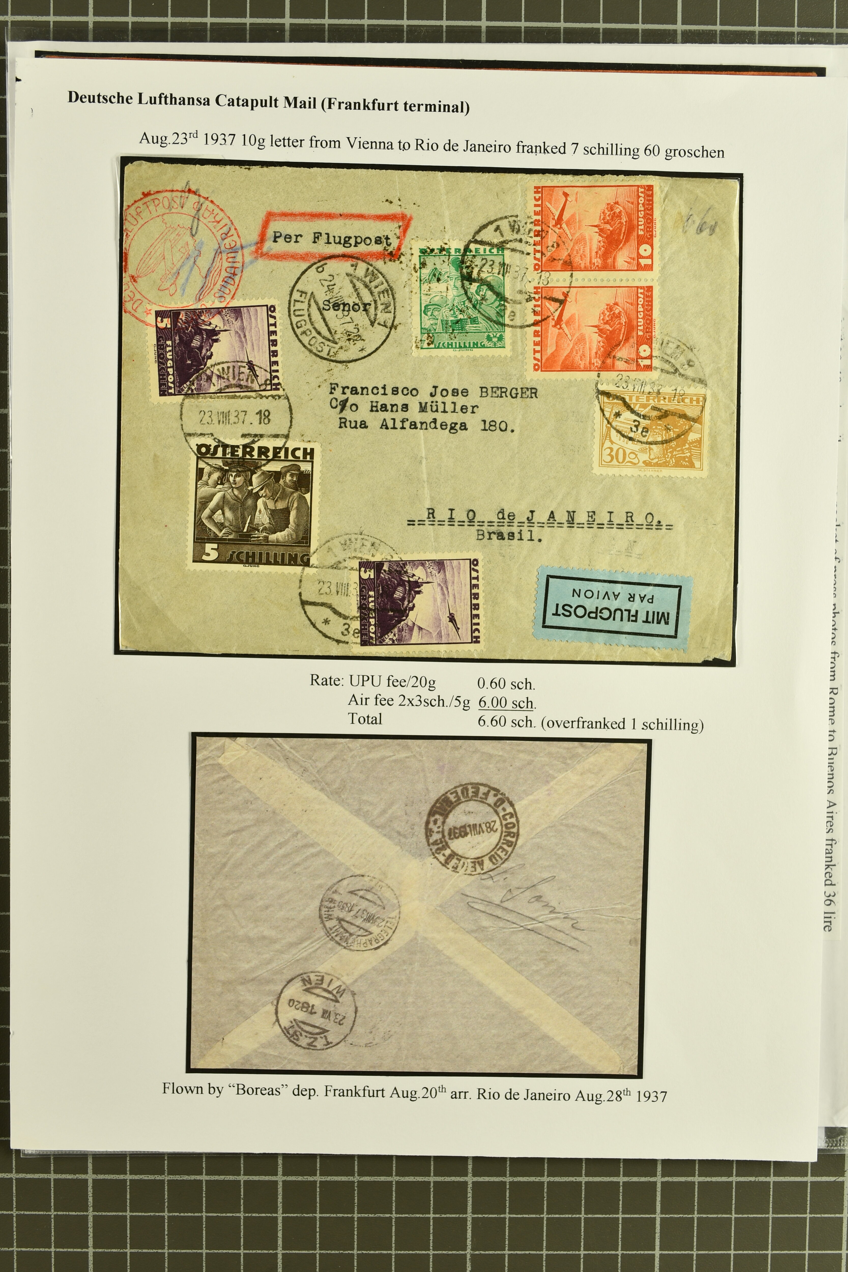 1714 cover imageKatapultpost Südatlantik 1934/39: Vielfältige Sammlung mit 65 geflogenen Belege sowie versch. Werbekarten und Drucksachen, dabei versch. Flugpläne, Postkarten, bezw. Neujahrskarten, ein ungebr. Condor-Lufthansa Mustersäcklein (12x18,5cm) ungebr., Bedarfspost wie R-Brief von Hamburg nach Punta Arenas (Magallenes 37.5.37), weiter ein Flugtarifplan ab Argentinien, R-Drucksache ab Hamburg mit 9.55 RM Frankatur nach Santiago de Chile, Argentinien mit div. Festtagskarten (6, inkl. Karte nach Budapest 1939), Post ab Brasilien 17 Belege mit 1932 Zeppelinzuleitung von Porto Alegre zur Zeppelin-Rückfahrt der 8. SA-Fahrt nach London, sechs versch. Werbekarten mit 1935/37 Weihnachtskarten 'Boas Festas', 1935 zwei frankierte Stoffmustersäckchen (11,5x26 cm), davon eines nach Hamburg, resp. das zweite nach London adressiert, ferner Katapultpost ab Chile, ein Brief ab Uruguay nach Schottland, 1938 je eine Grusskarte ab Paraguay bezw. Peru, sowie div. Zuleitungspost ab Europa mit guten, teils hohen Frankaturen, aufgeliefert via Stuttgart oder Frankfurt, dabei Post von Belgien, Dänemark, England (8, inkl. einer Zuleitung ab Brit. Postamt in Tangier Brit. Marokko), Italien (3), Niederlande (1), Österreich (2) und ab der Schweiz (1). Ein sehr attraktives Los, alles Bedarfspost, Besichtigung empfohlen (Image 1) (Image 2) (Image 3) (Image 4) (Image 5) (Image 6) (Image 7) (Image 8) (Image 9) (Image 10) (Image 11) (Image 12) (Image 13) (Image 14) (Image 15) (Image 16) (Image 17) (Image 18) (Image 19) (Image 20) (Image 21) (Image 22) (Image 23) (Image 24) (Image 25) (Image 26) (Image 27) (Image 28) (Image 29) (Image 30) (Image 31) (Image 32) (Image 33) (Image 34) (Image 35) (Image 36) (Image 37) (Image 38) (Image 39) (Image 40) (Image 41) (Image 42) (Image 43) (Image 44) (Image 45) (Image 46) (Image 47) (Image 48) (Image 49) (Image 50)