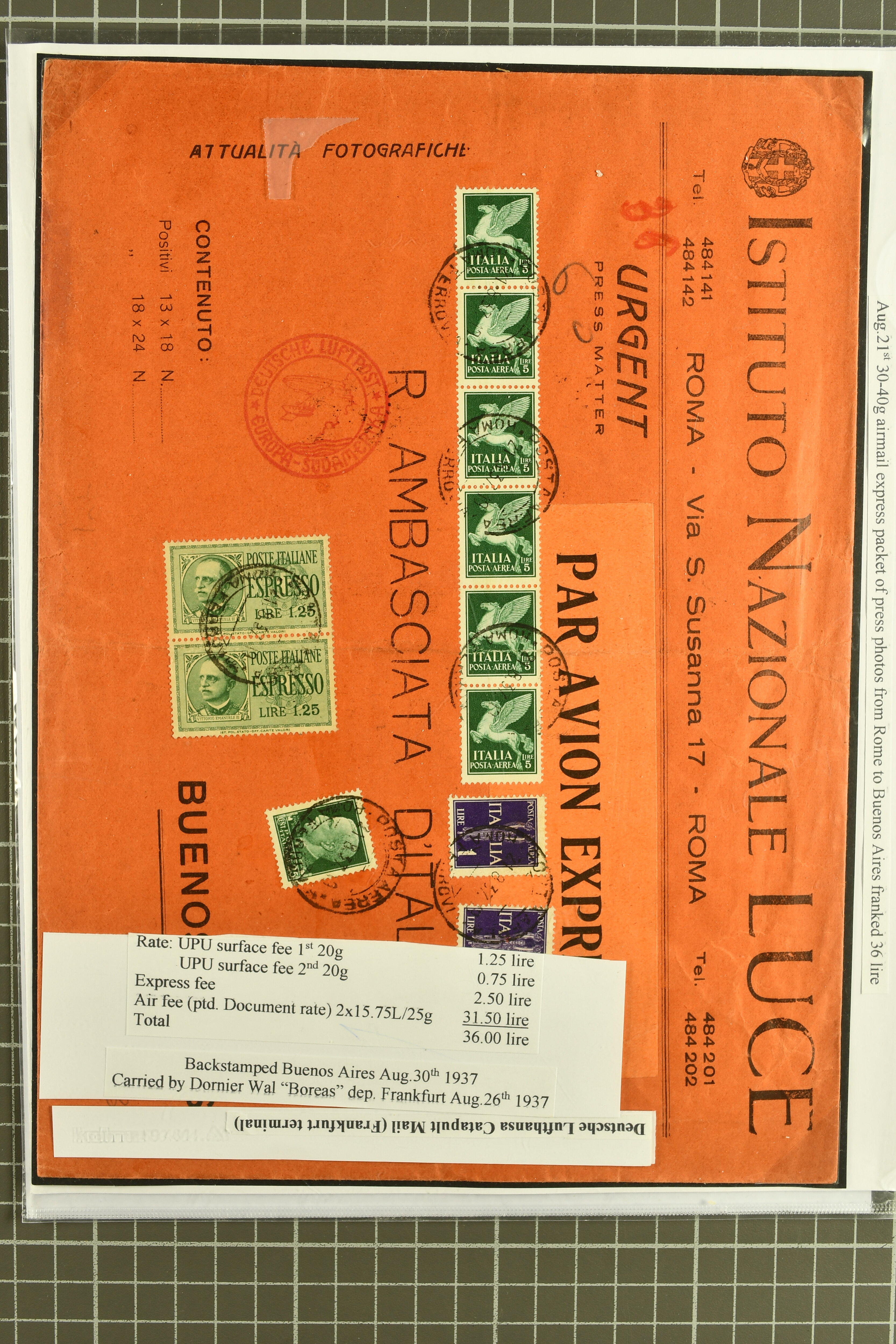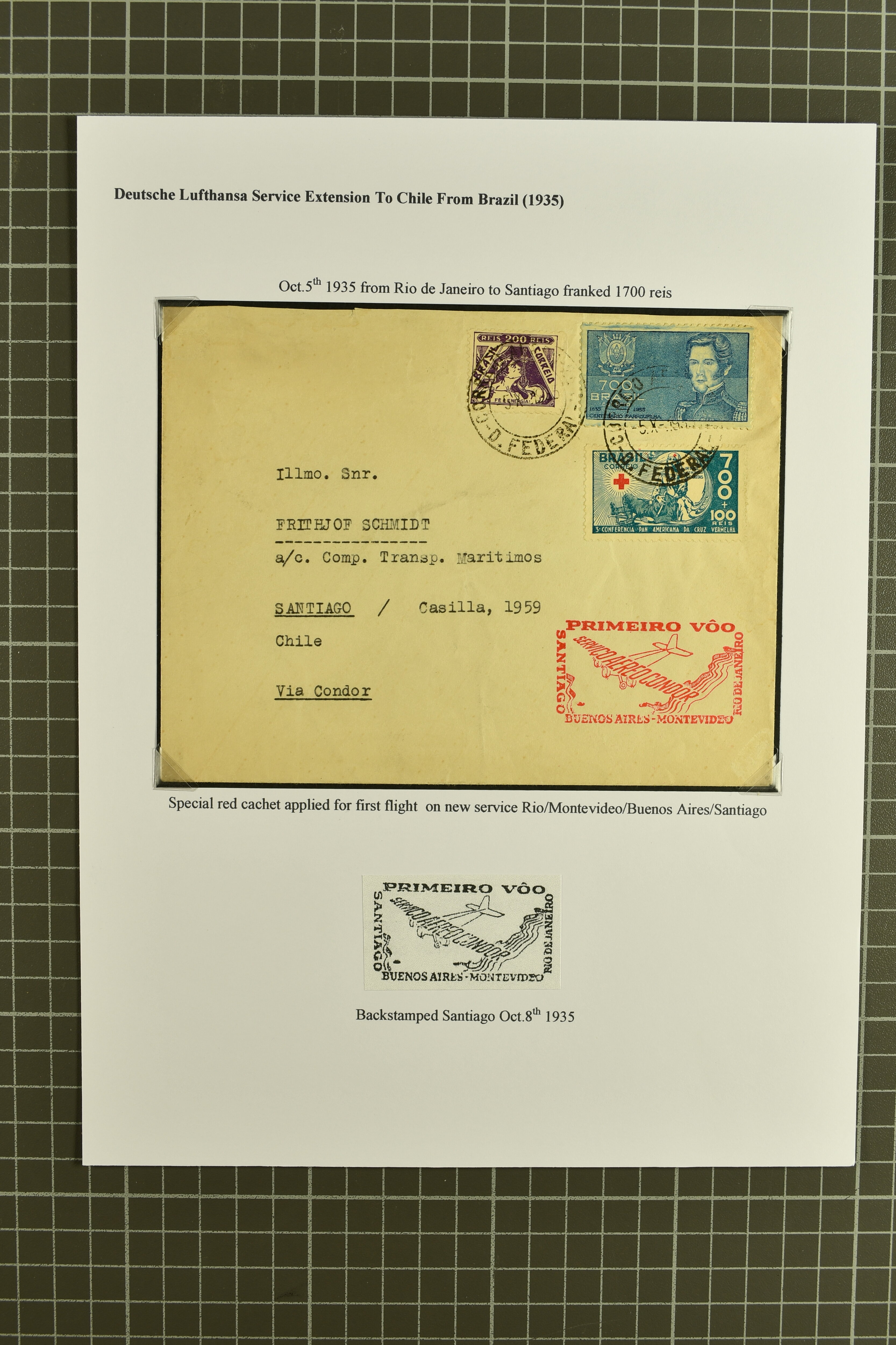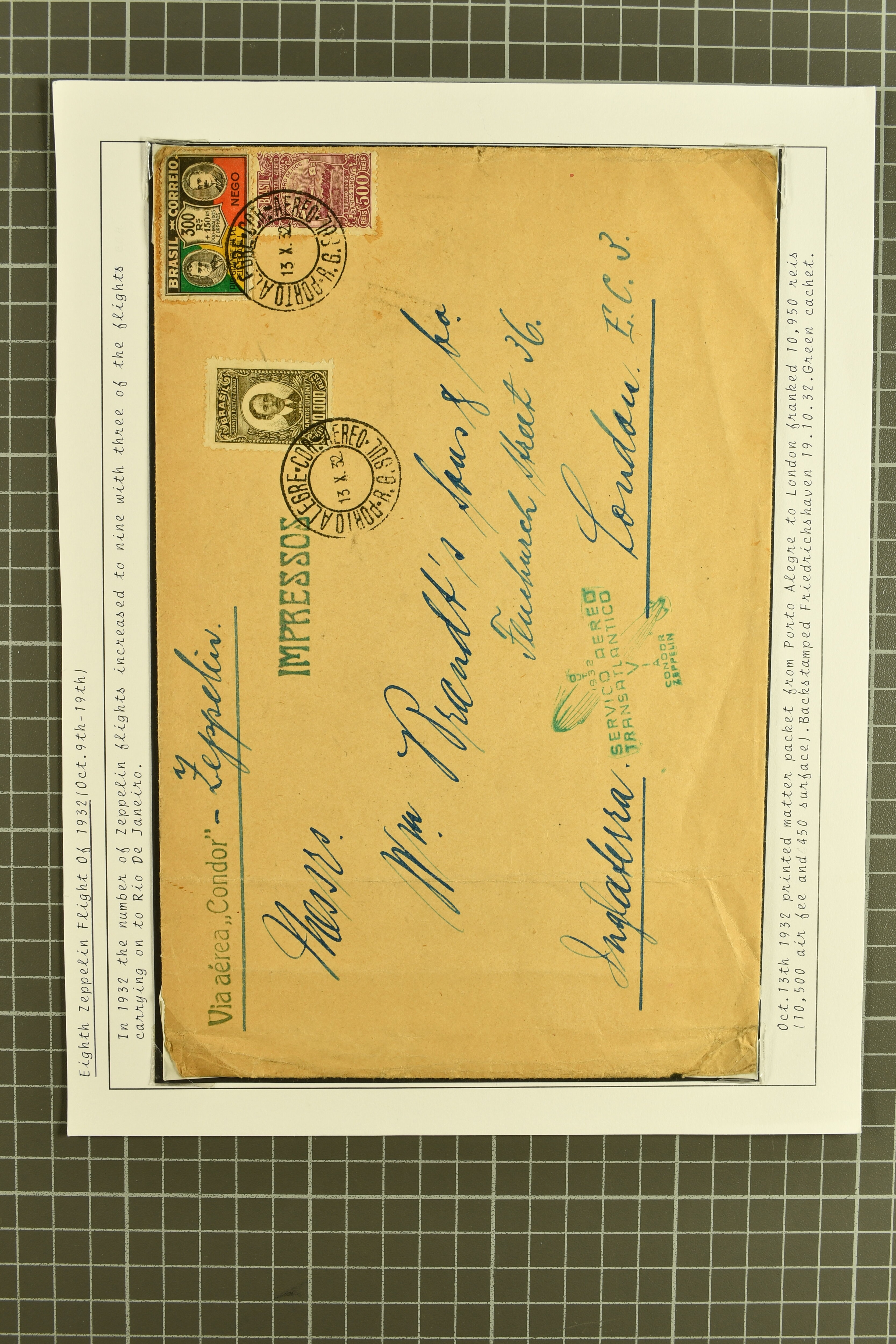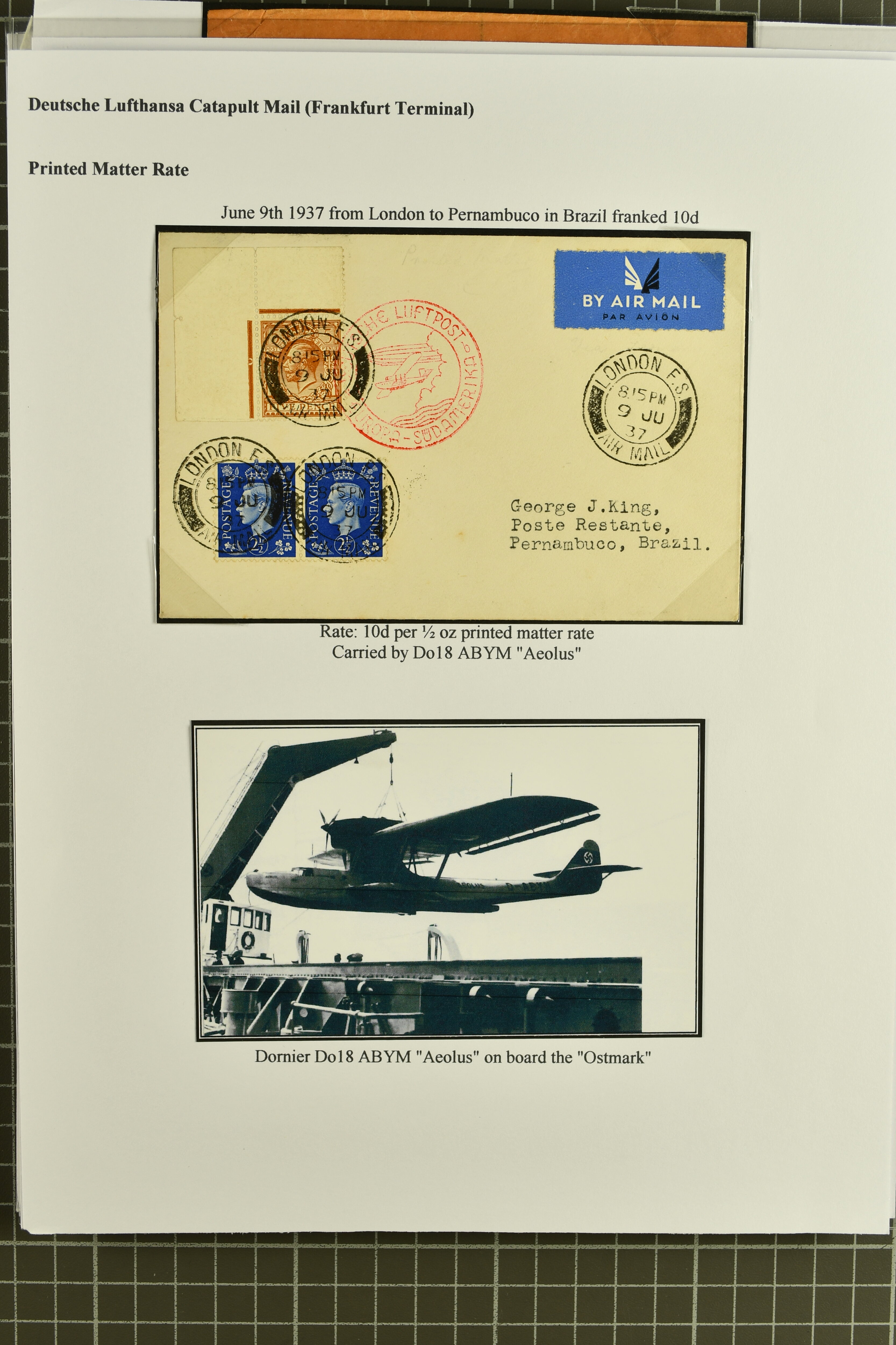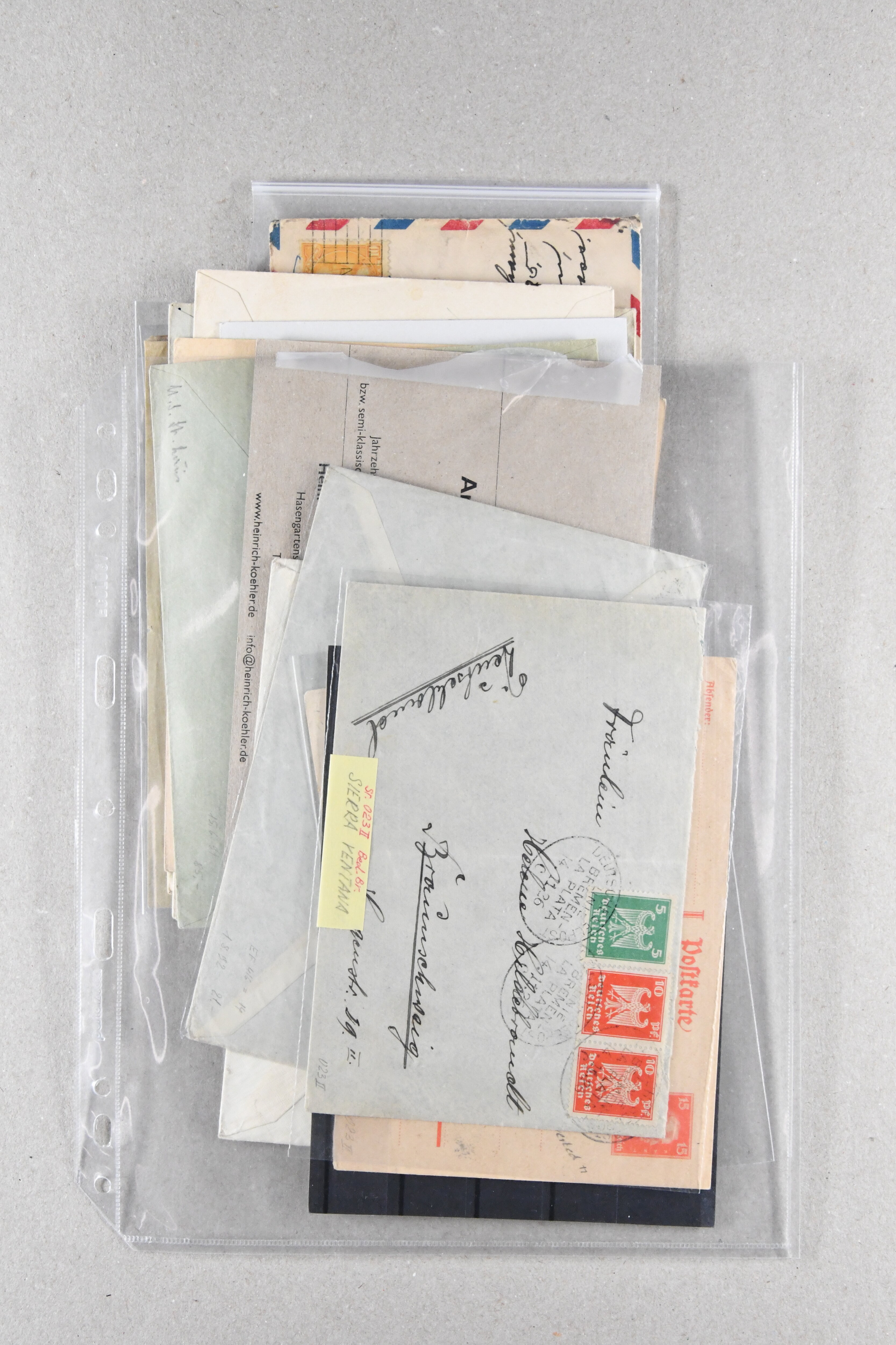 1714 cover imageKatapultpost Südatlantik 1934/39: Vielfältige Sammlung mit 65 geflogenen Belege sowie versch. Werbekarten und Drucksachen, dabei versch. Flugpläne, Postkarten, bezw. Neujahrskarten, ein ungebr. Condor-Lufthansa Mustersäcklein (12x18,5cm) ungebr., Bedarfspost wie R-Brief von Hamburg nach Punta Arenas (Magallenes 37.5.37), weiter ein Flugtarifplan ab Argentinien, R-Drucksache ab Hamburg mit 9.55 RM Frankatur nach Santiago de Chile, Argentinien mit div. Festtagskarten (6, inkl. Karte nach Budapest 1939), Post ab Brasilien 17 Belege mit 1932 Zeppelinzuleitung von Porto Alegre zur Zeppelin-Rückfahrt der 8. SA-Fahrt nach London, sechs versch. Werbekarten mit 1935/37 Weihnachtskarten 'Boas Festas', 1935 zwei frankierte Stoffmustersäckchen (11,5x26 cm), davon eines nach Hamburg, resp. das zweite nach London adressiert, ferner Katapultpost ab Chile, ein Brief ab Uruguay nach Schottland, 1938 je eine Grusskarte ab Paraguay bezw. Peru, sowie div. Zuleitungspost ab Europa mit guten, teils hohen Frankaturen, aufgeliefert via Stuttgart oder Frankfurt, dabei Post von Belgien, Dänemark, England (8, inkl. einer Zuleitung ab Brit. Postamt in Tangier Brit. Marokko), Italien (3), Niederlande (1), Österreich (2) und ab der Schweiz (1). Ein sehr attraktives Los, alles Bedarfspost, Besichtigung empfohlen (Image 1) (Image 2) (Image 3) (Image 4) (Image 5) (Image 6) (Image 7) (Image 8) (Image 9) (Image 10) (Image 11) (Image 12) (Image 13) (Image 14) (Image 15) (Image 16) (Image 17) (Image 18) (Image 19) (Image 20) (Image 21) (Image 22) (Image 23) (Image 24) (Image 25) (Image 26) (Image 27) (Image 28) (Image 29) (Image 30) (Image 31) (Image 32) (Image 33) (Image 34) (Image 35) (Image 36) (Image 37) (Image 38) (Image 39) (Image 40) (Image 41) (Image 42) (Image 43) (Image 44) (Image 45) (Image 46) (Image 47) (Image 48) (Image 49) (Image 50)