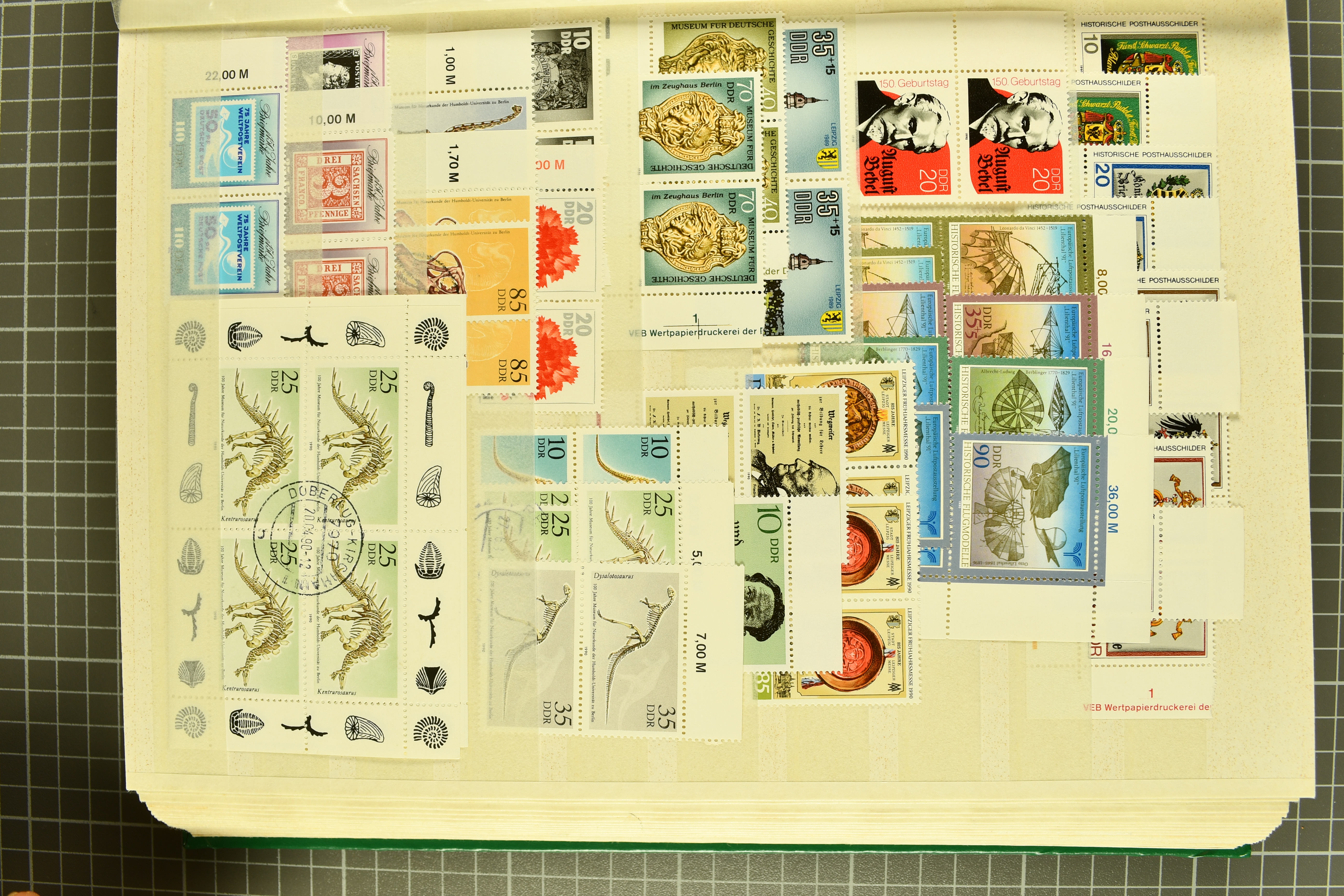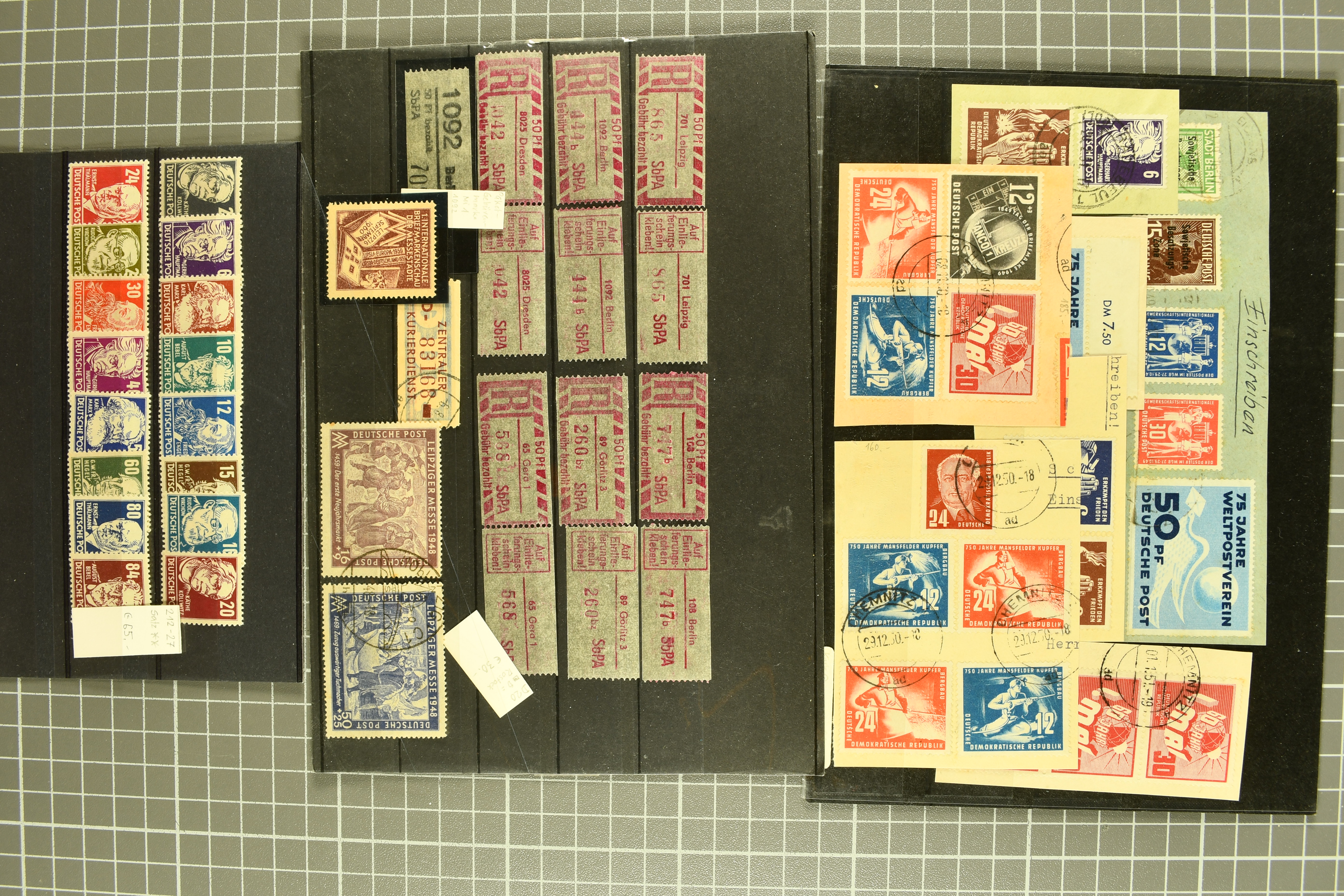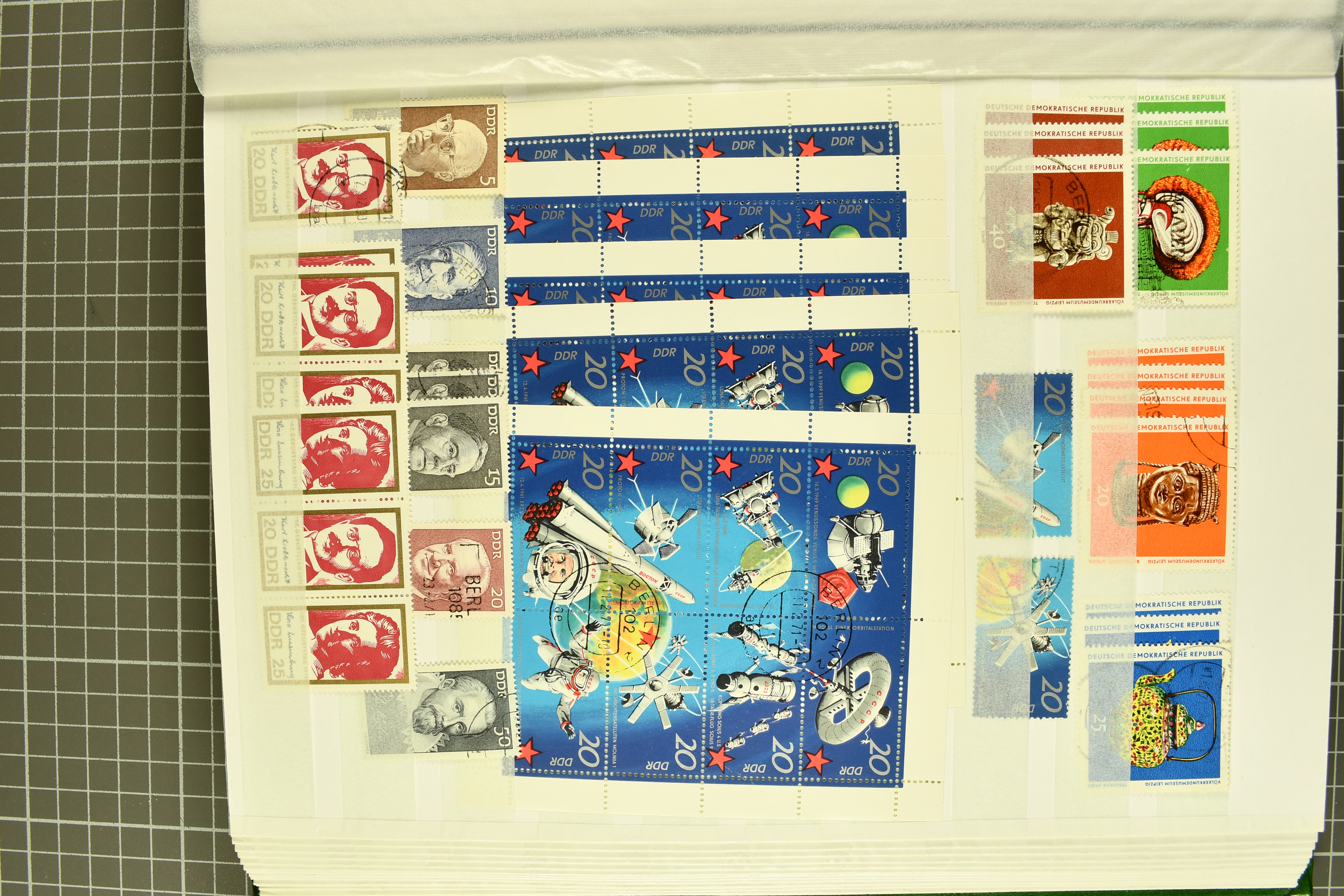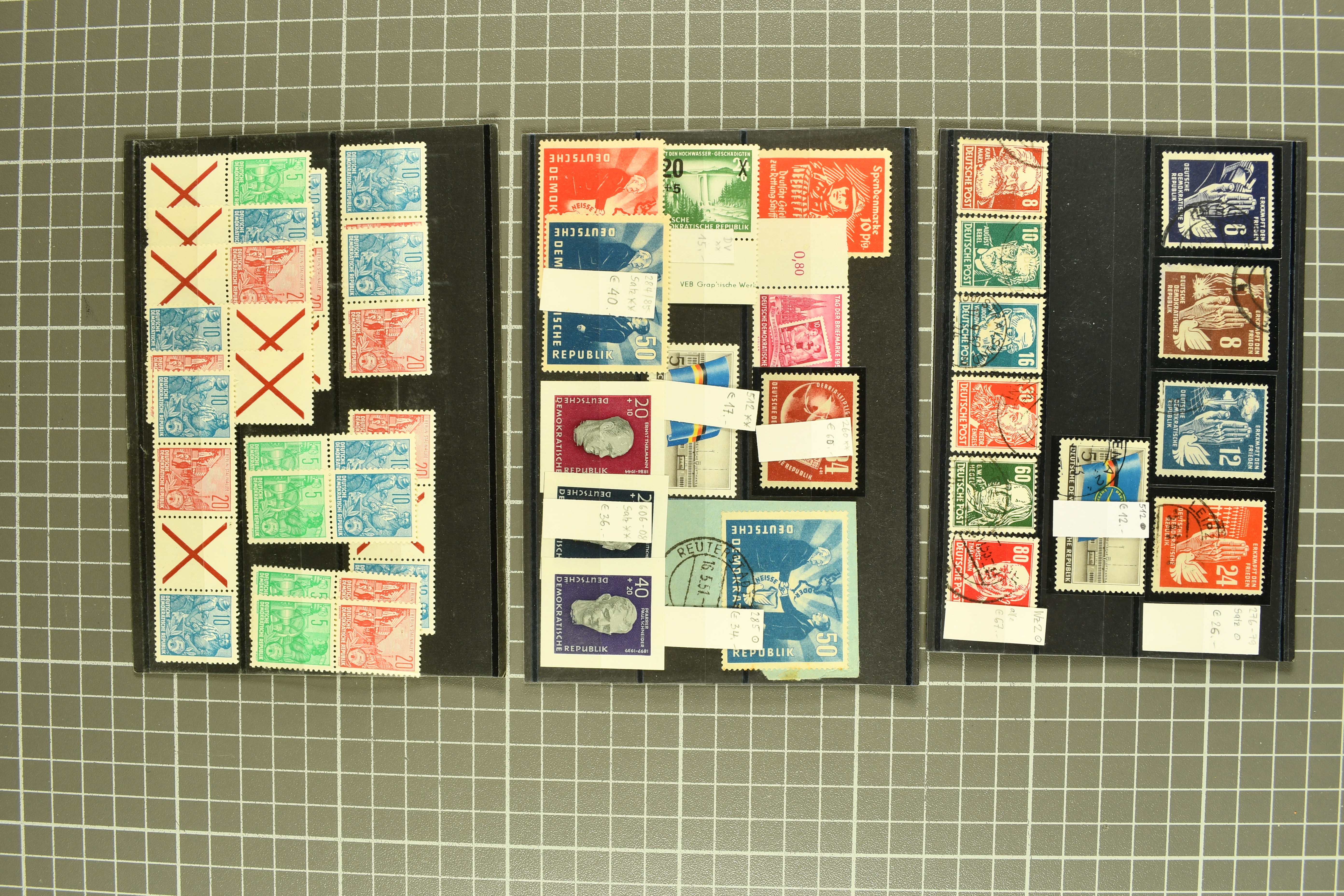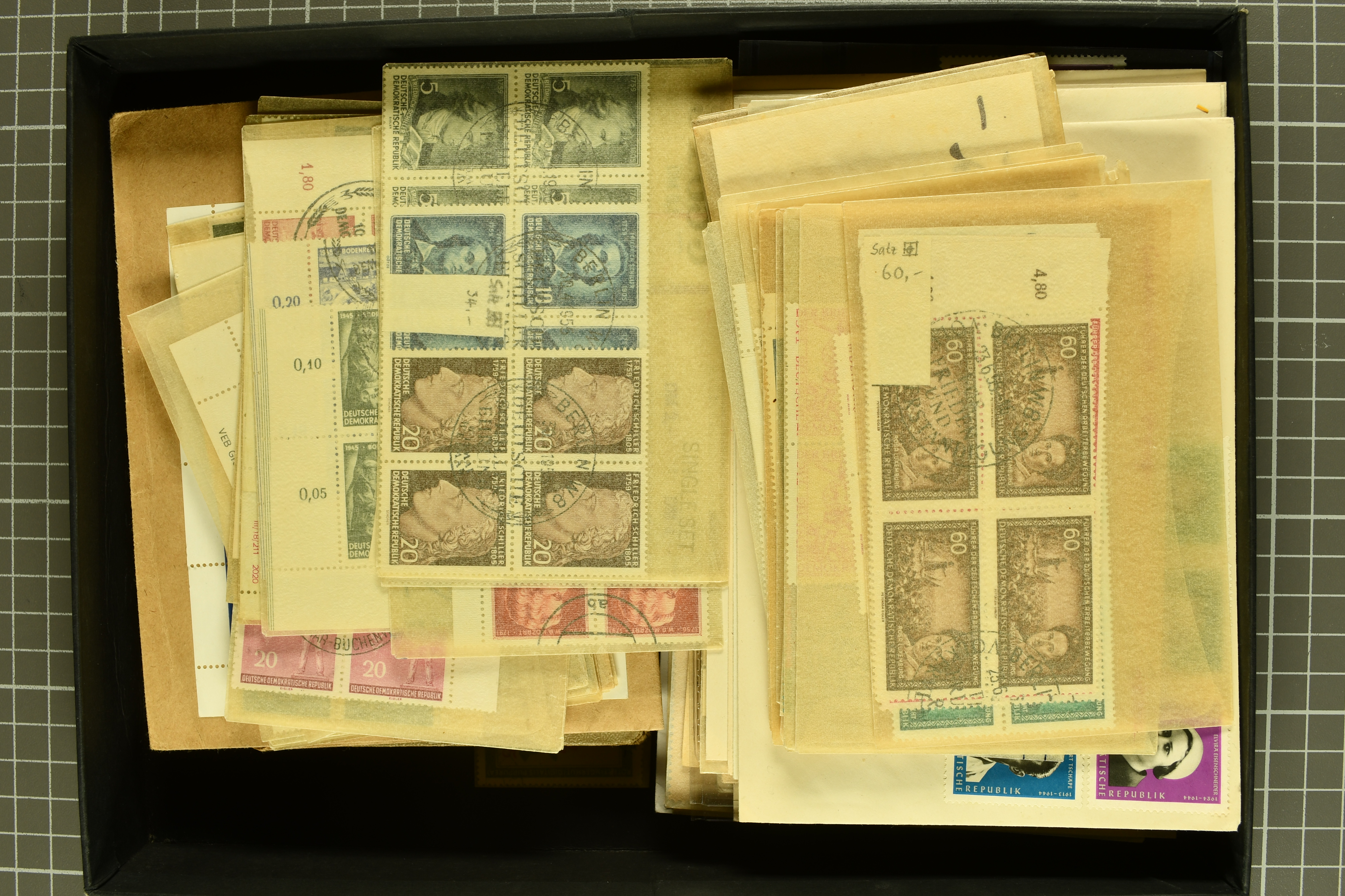 1822 imageDDR, 1945/89: Reichhaltiges Konvolut mit drei Einsteckbüchern, gebraucht und ungebraucht, lagermässig geordnet, dabei zahlreiche bessere Werte, u.a. Marx-Blocks. Weiterhin ein Einsteckalbum mit Ausgaben der Serie 'Köpfe', teils etwas spezialisiert; ein Bogenalbum mit vielen Dienstmarkenbogen sowie maschinengestempelten Bogen von der Versandstelle und einigen Zusammendruckbogen (teils mit hohem Katalogwert). Dazu eine Schachtel mit Steckkarten, Tüten und Briefen, vielfach mit besseren Ausgaben ab SBZ. Abgerundet durch ein Vordruckalbum mit den Ausgaben 1984–87 komplett. Insgesamt sehr gehaltvolle Fundgrube mit hohem Katalogwert (Image 1) (Image 2) (Image 3) (Image 4) (Image 5) (Image 6) (Image 7) (Image 8) (Image 9) (Image 10) (Image 11) (Image 12) (Image 13) (Image 14) (Image 15) (Image 16) (Image 17) (Image 18) (Image 19) (Image 20) (Image 21) (Image 22) (Image 23) (Image 24) (Image 25) (Image 26) (Image 27) (Image 28) (Image 29) (Image 30) (Image 31) (Image 32) (Image 33) (Image 34) (Image 35) (Image 36) (Image 37) (Image 38) (Image 39) (Image 40) (Image 41) (Image 42) (Image 43) (Image 44) (Image 45) (Image 46) (Image 47)