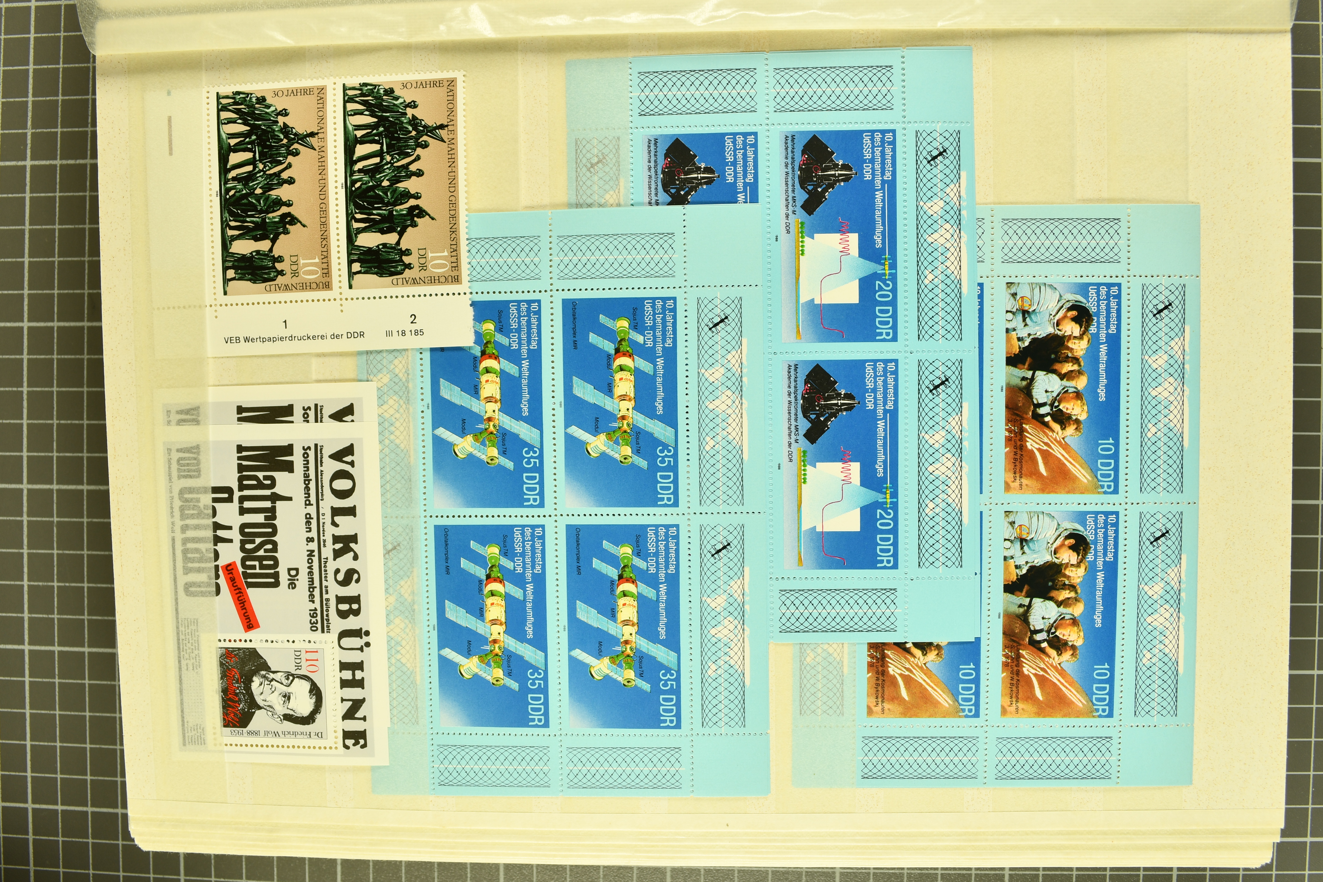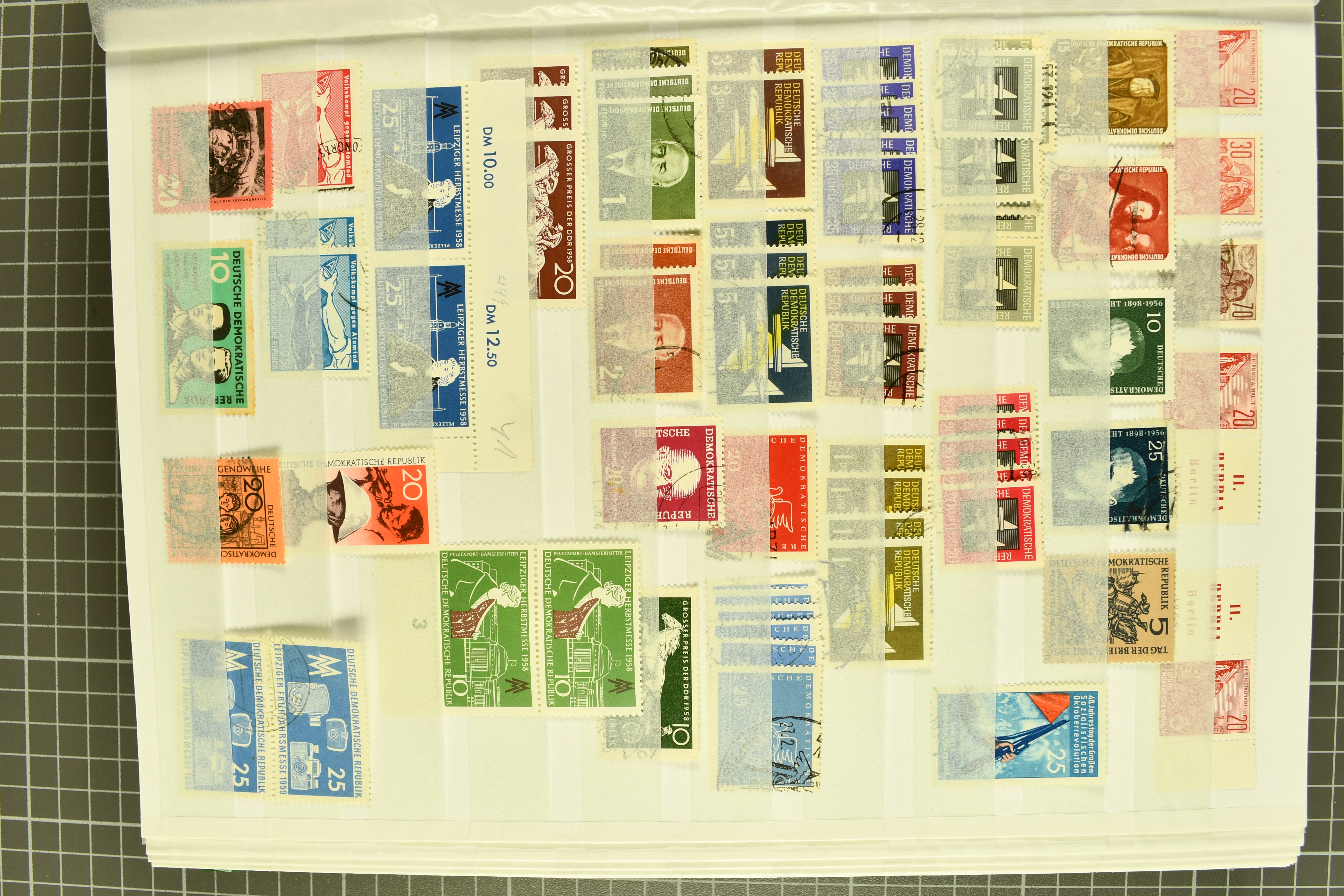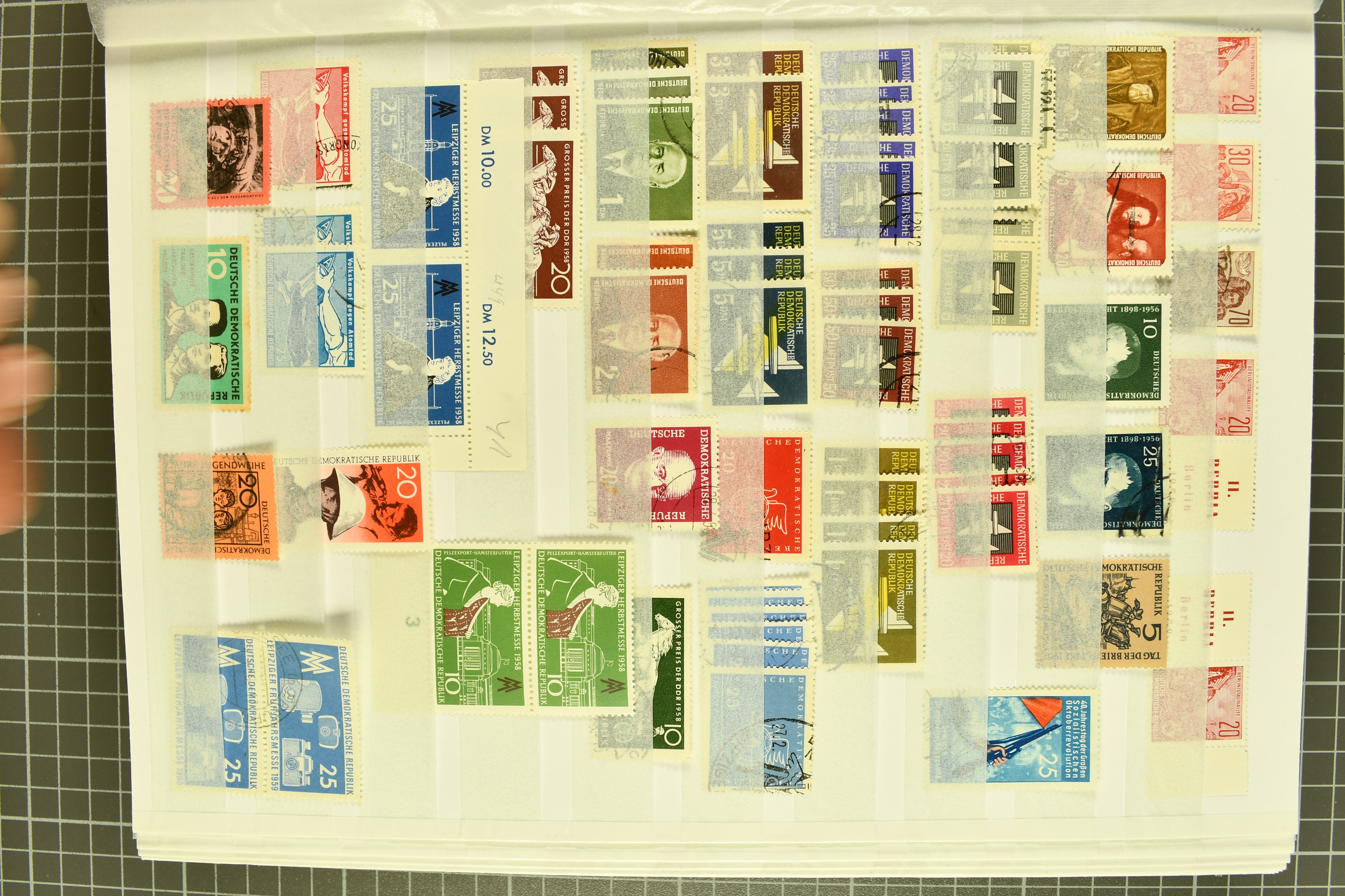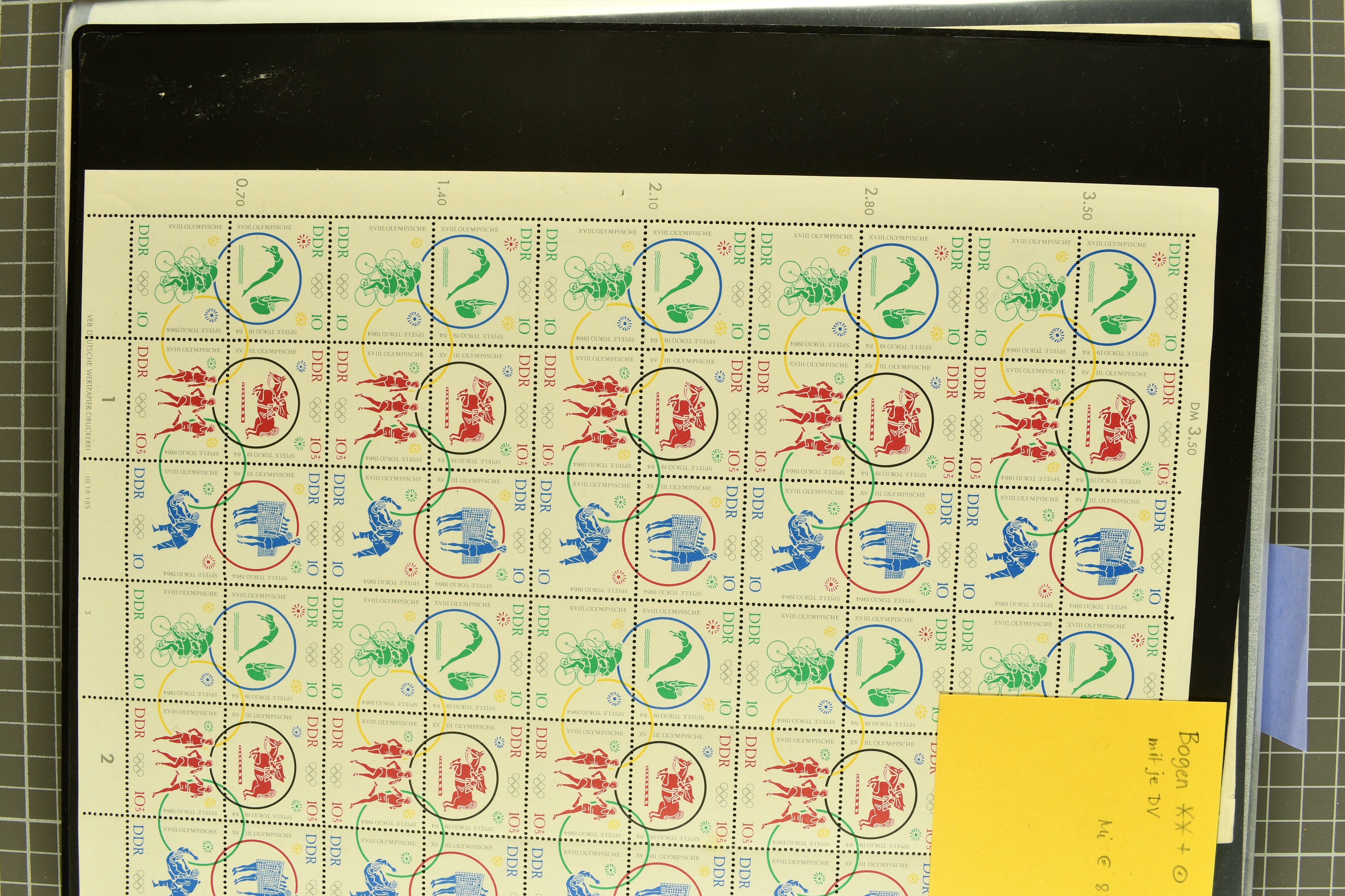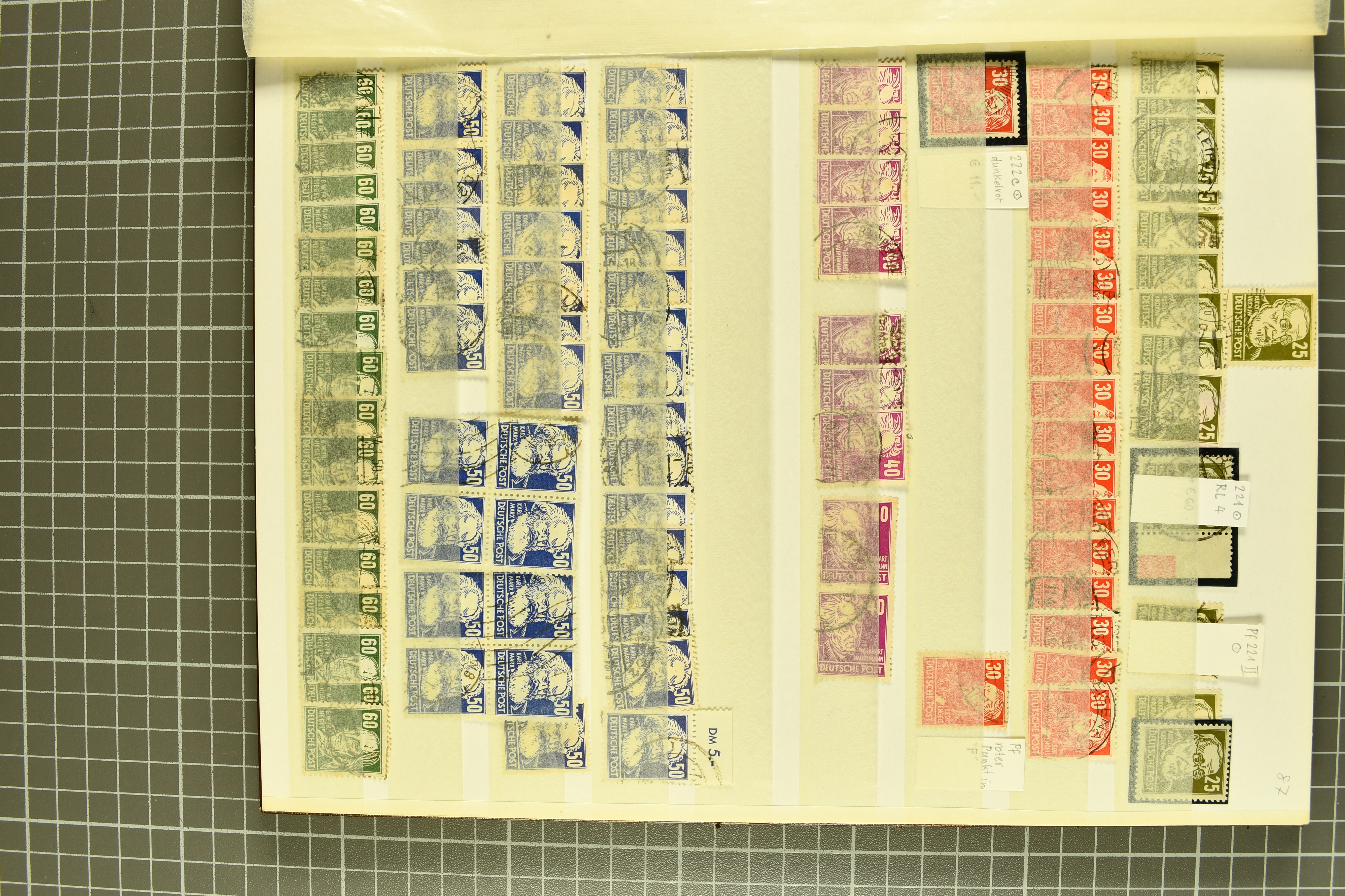 1822 imageDDR, 1945/89: Reichhaltiges Konvolut mit drei Einsteckbüchern, gebraucht und ungebraucht, lagermässig geordnet, dabei zahlreiche bessere Werte, u.a. Marx-Blocks. Weiterhin ein Einsteckalbum mit Ausgaben der Serie 'Köpfe', teils etwas spezialisiert; ein Bogenalbum mit vielen Dienstmarkenbogen sowie maschinengestempelten Bogen von der Versandstelle und einigen Zusammendruckbogen (teils mit hohem Katalogwert). Dazu eine Schachtel mit Steckkarten, Tüten und Briefen, vielfach mit besseren Ausgaben ab SBZ. Abgerundet durch ein Vordruckalbum mit den Ausgaben 1984–87 komplett. Insgesamt sehr gehaltvolle Fundgrube mit hohem Katalogwert (Image 1) (Image 2) (Image 3) (Image 4) (Image 5) (Image 6) (Image 7) (Image 8) (Image 9) (Image 10) (Image 11) (Image 12) (Image 13) (Image 14) (Image 15) (Image 16) (Image 17) (Image 18) (Image 19) (Image 20) (Image 21) (Image 22) (Image 23) (Image 24) (Image 25) (Image 26) (Image 27) (Image 28) (Image 29) (Image 30) (Image 31) (Image 32) (Image 33) (Image 34) (Image 35) (Image 36) (Image 37) (Image 38) (Image 39) (Image 40) (Image 41) (Image 42) (Image 43) (Image 44) (Image 45) (Image 46) (Image 47)