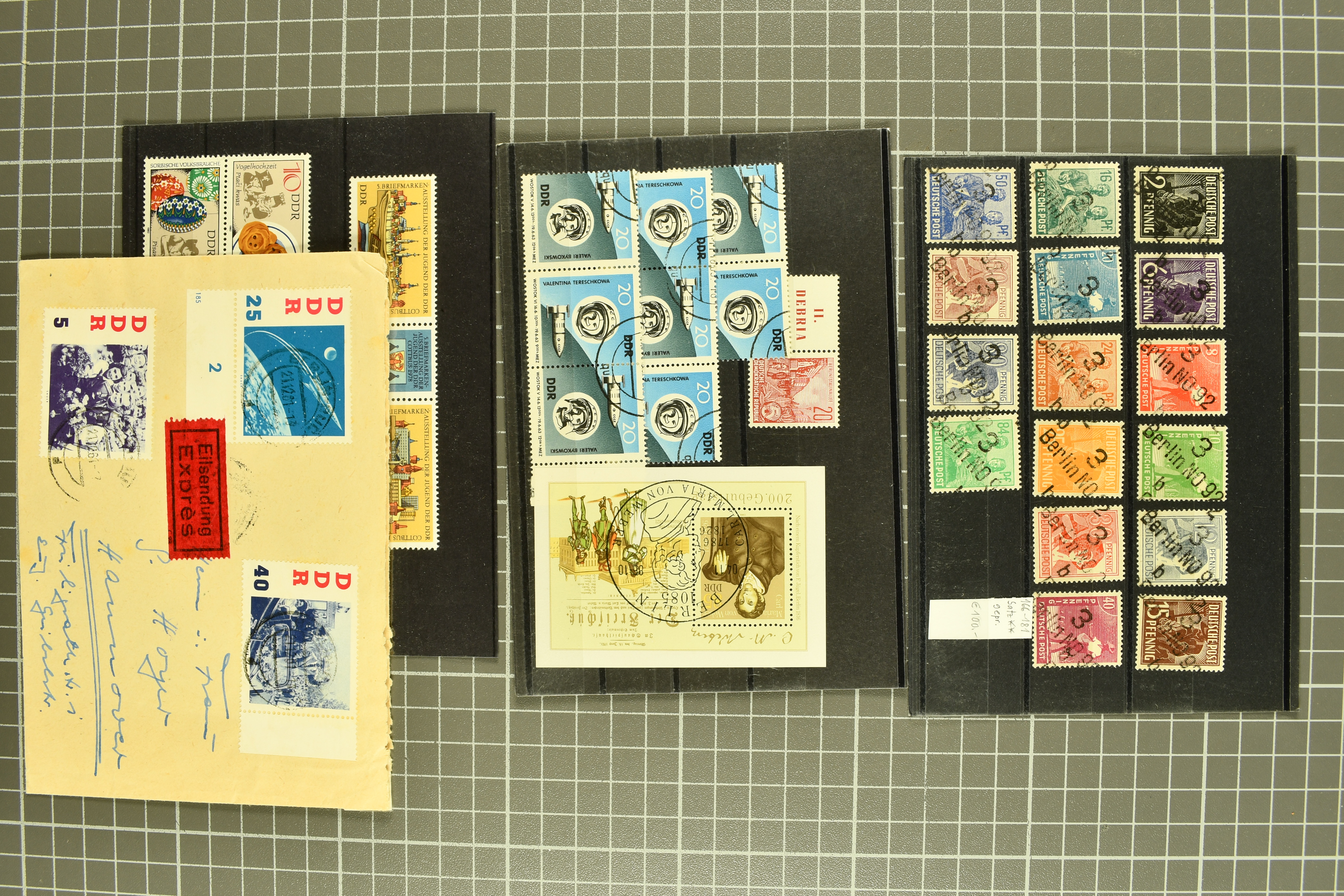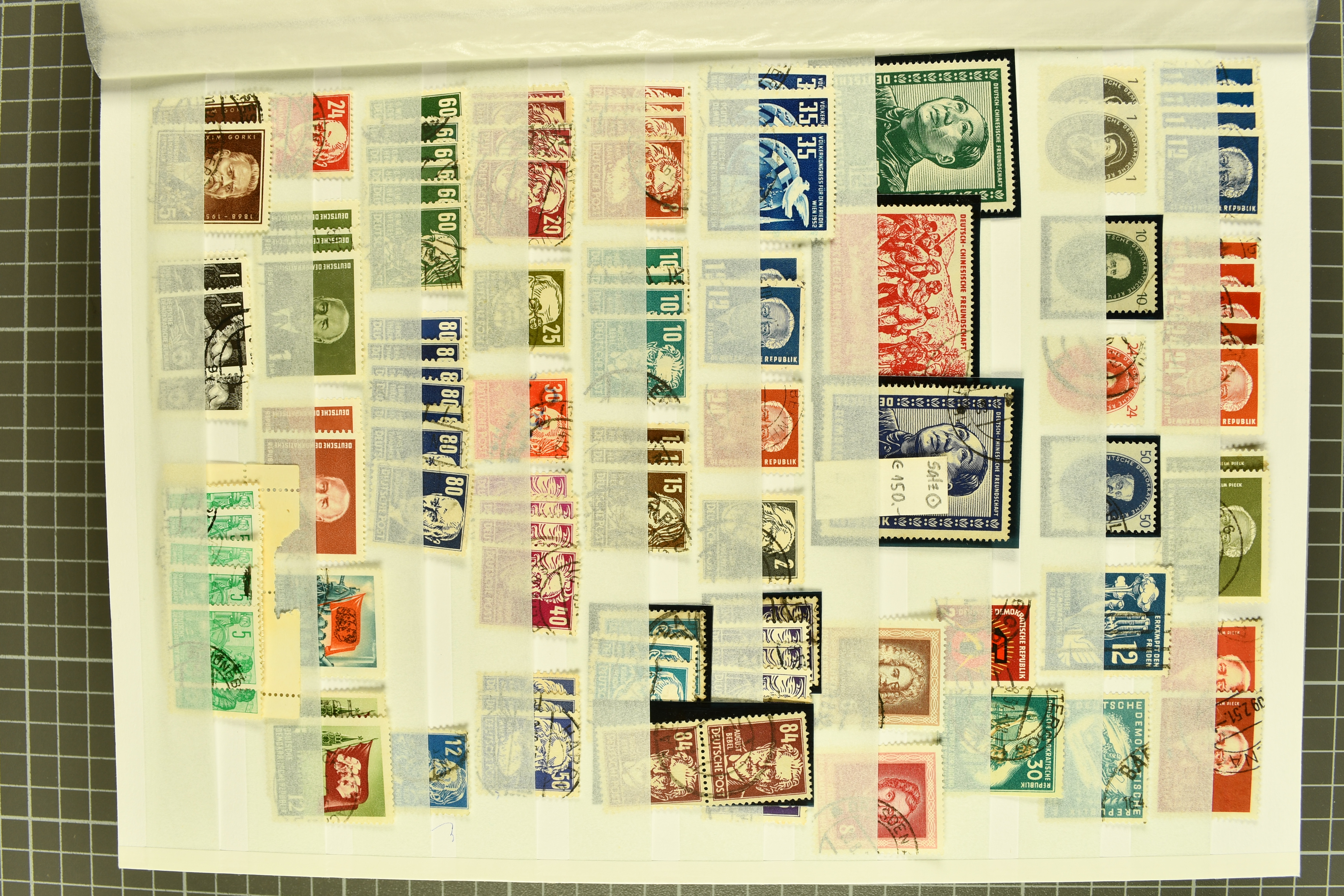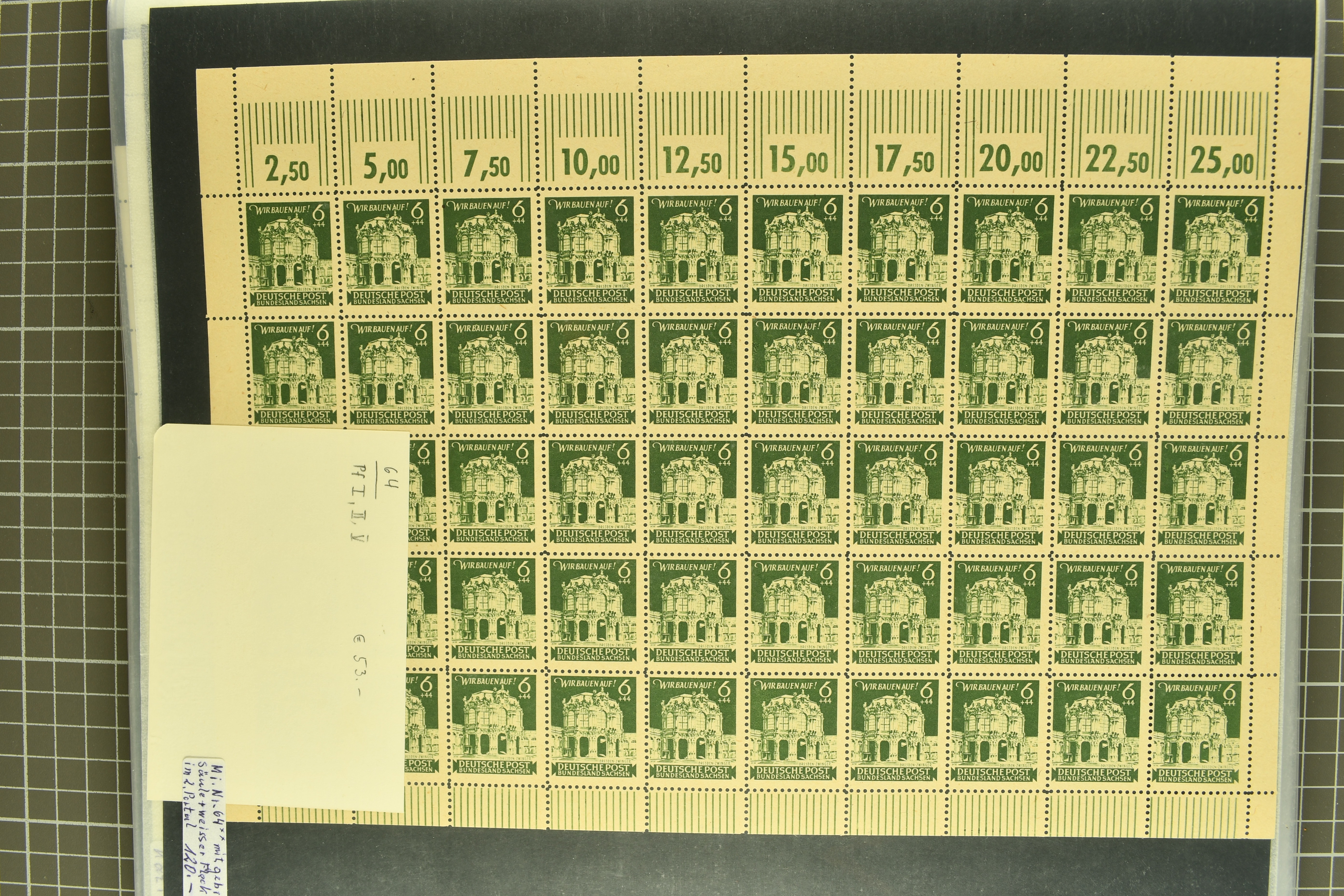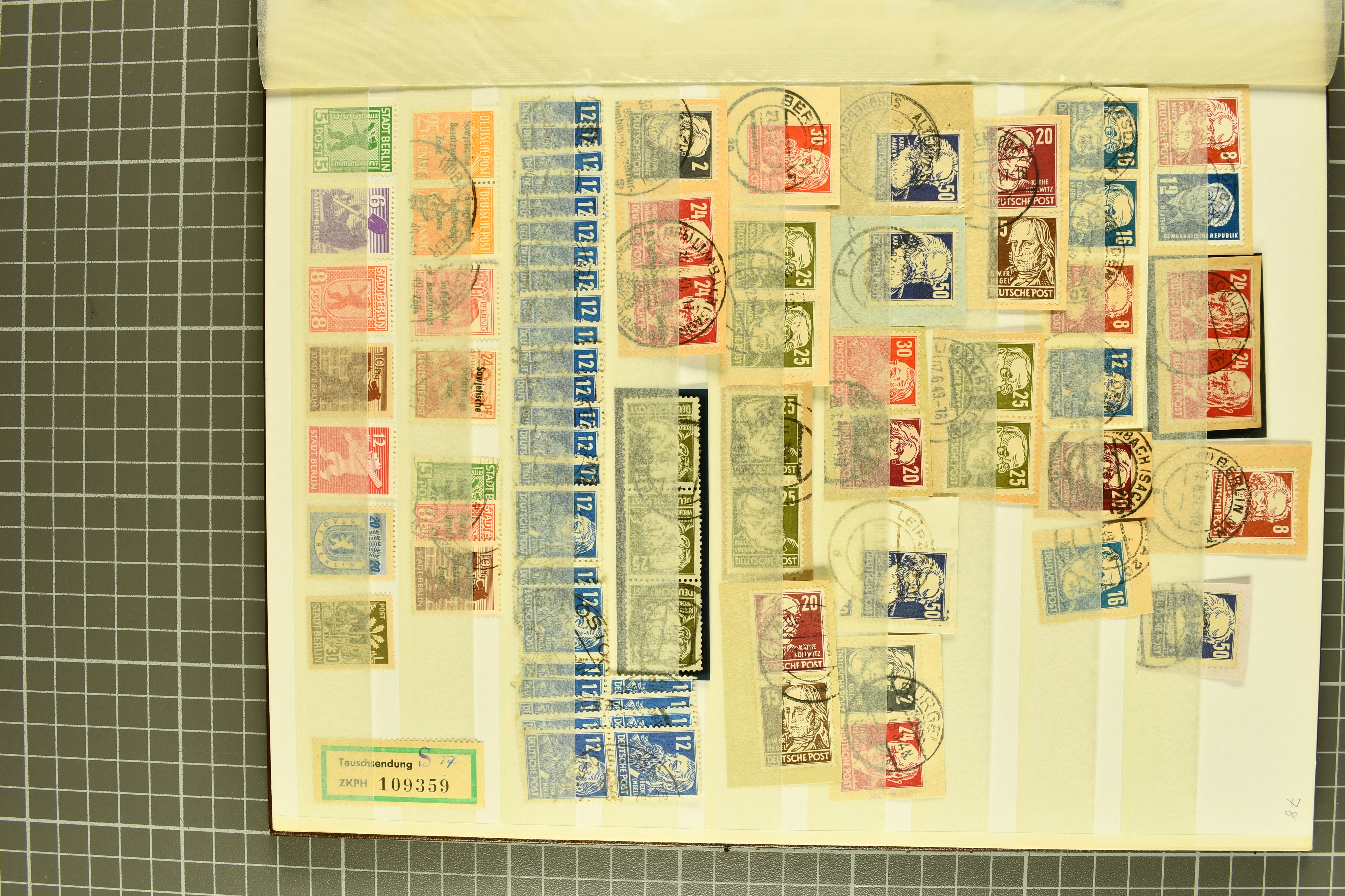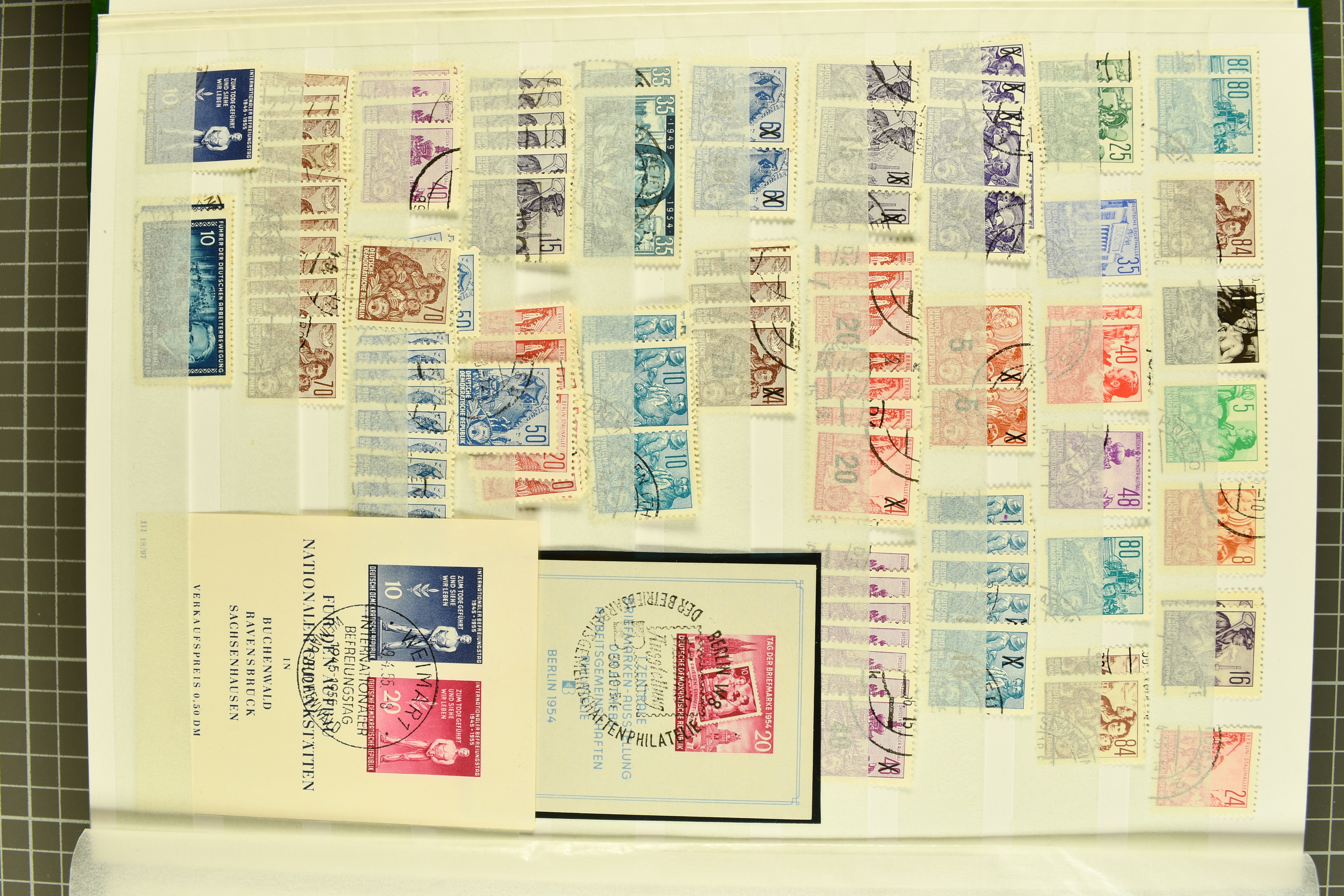 1822 imageDDR, 1945/89: Reichhaltiges Konvolut mit drei Einsteckbüchern, gebraucht und ungebraucht, lagermässig geordnet, dabei zahlreiche bessere Werte, u.a. Marx-Blocks. Weiterhin ein Einsteckalbum mit Ausgaben der Serie 'Köpfe', teils etwas spezialisiert; ein Bogenalbum mit vielen Dienstmarkenbogen sowie maschinengestempelten Bogen von der Versandstelle und einigen Zusammendruckbogen (teils mit hohem Katalogwert). Dazu eine Schachtel mit Steckkarten, Tüten und Briefen, vielfach mit besseren Ausgaben ab SBZ. Abgerundet durch ein Vordruckalbum mit den Ausgaben 1984–87 komplett. Insgesamt sehr gehaltvolle Fundgrube mit hohem Katalogwert (Image 1) (Image 2) (Image 3) (Image 4) (Image 5) (Image 6) (Image 7) (Image 8) (Image 9) (Image 10) (Image 11) (Image 12) (Image 13) (Image 14) (Image 15) (Image 16) (Image 17) (Image 18) (Image 19) (Image 20) (Image 21) (Image 22) (Image 23) (Image 24) (Image 25) (Image 26) (Image 27) (Image 28) (Image 29) (Image 30) (Image 31) (Image 32) (Image 33) (Image 34) (Image 35) (Image 36) (Image 37) (Image 38) (Image 39) (Image 40) (Image 41) (Image 42) (Image 43) (Image 44) (Image 45) (Image 46) (Image 47)