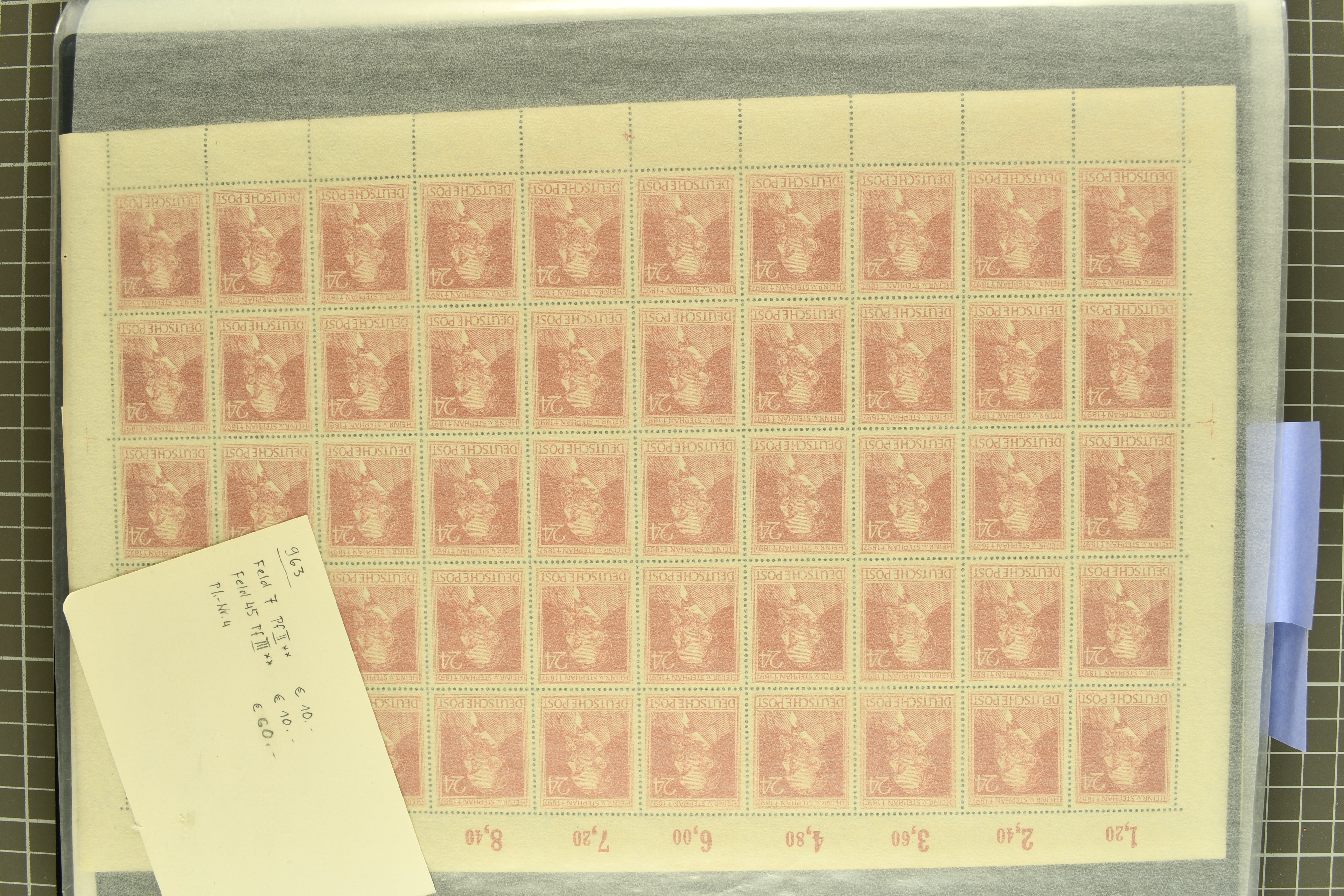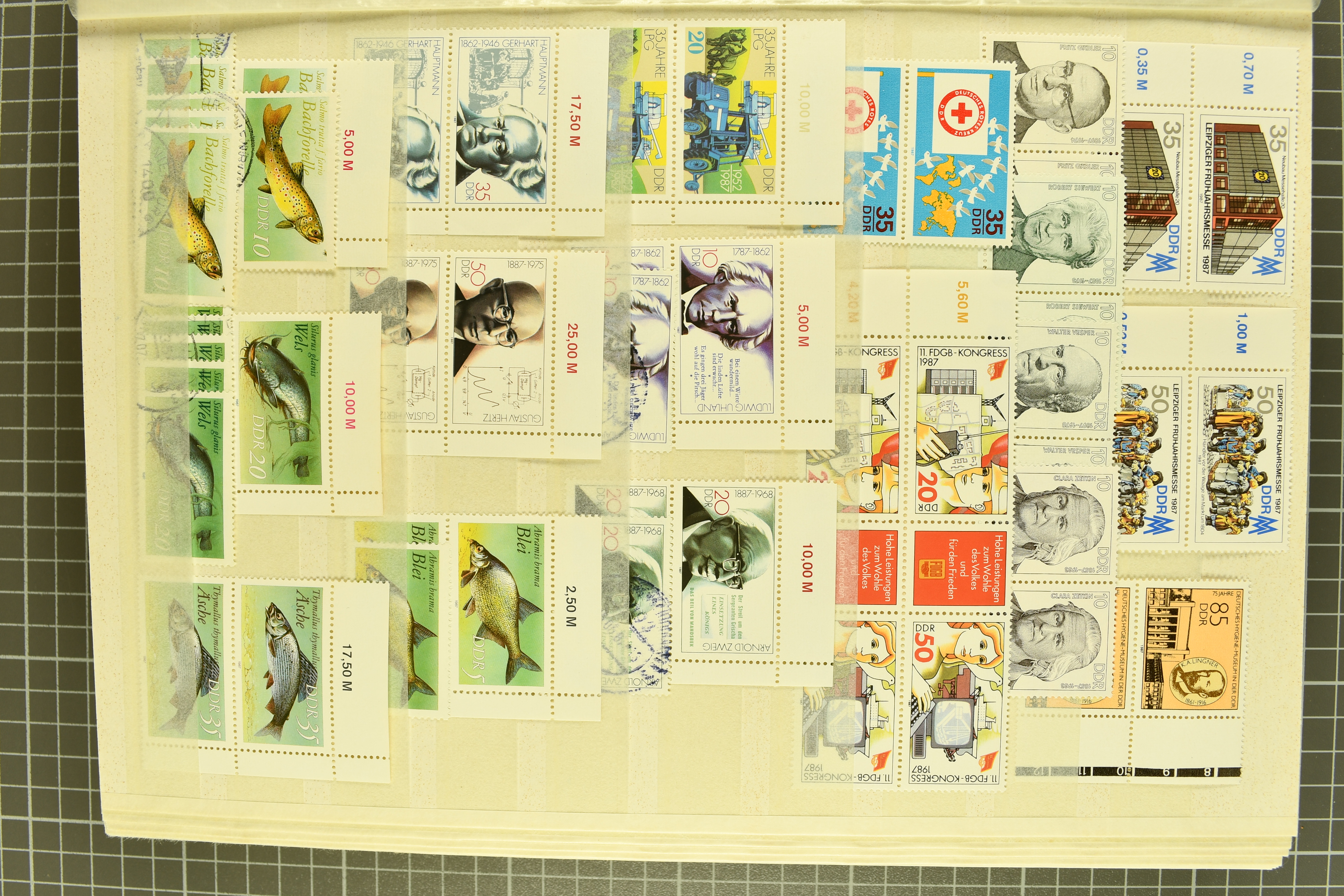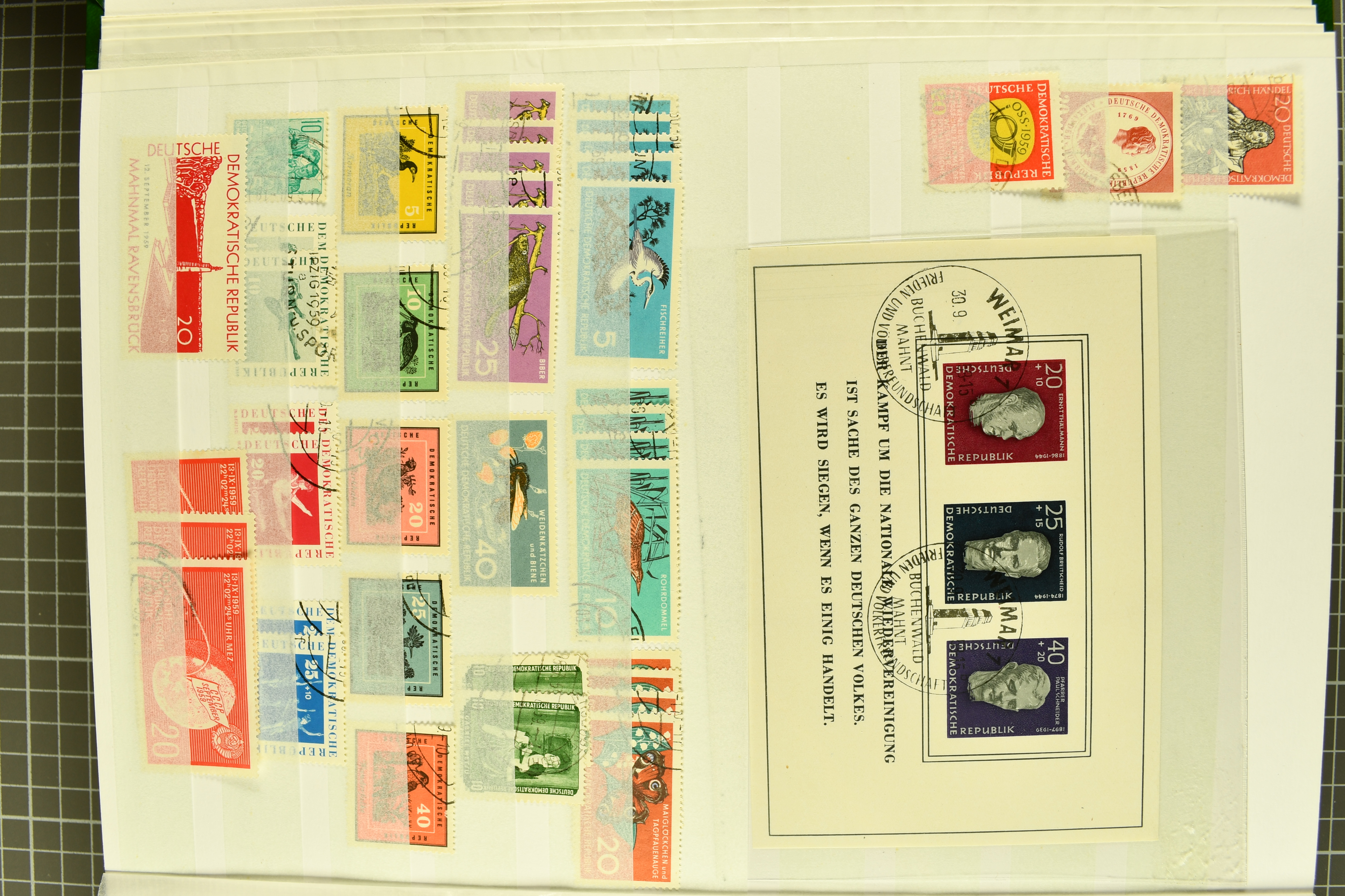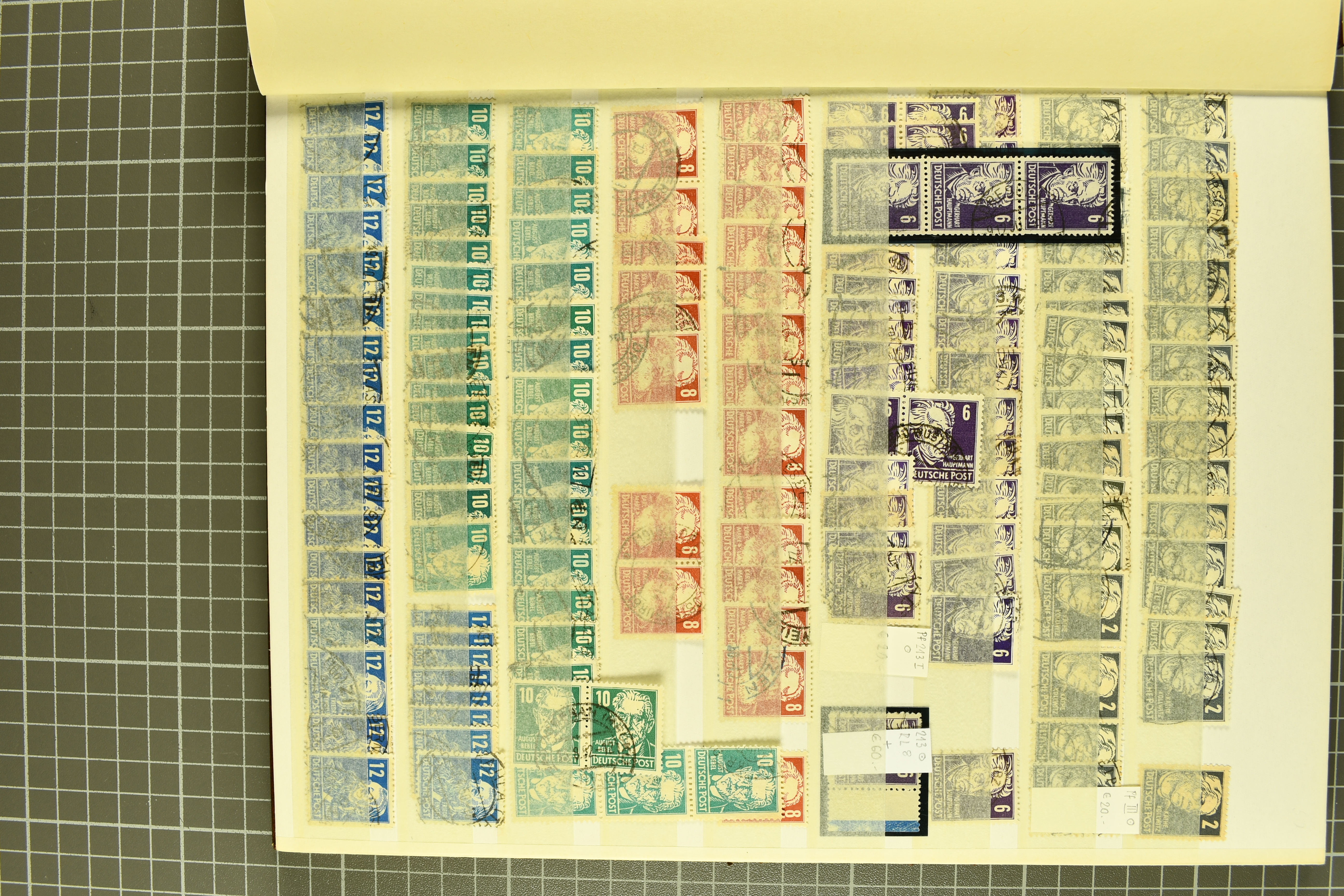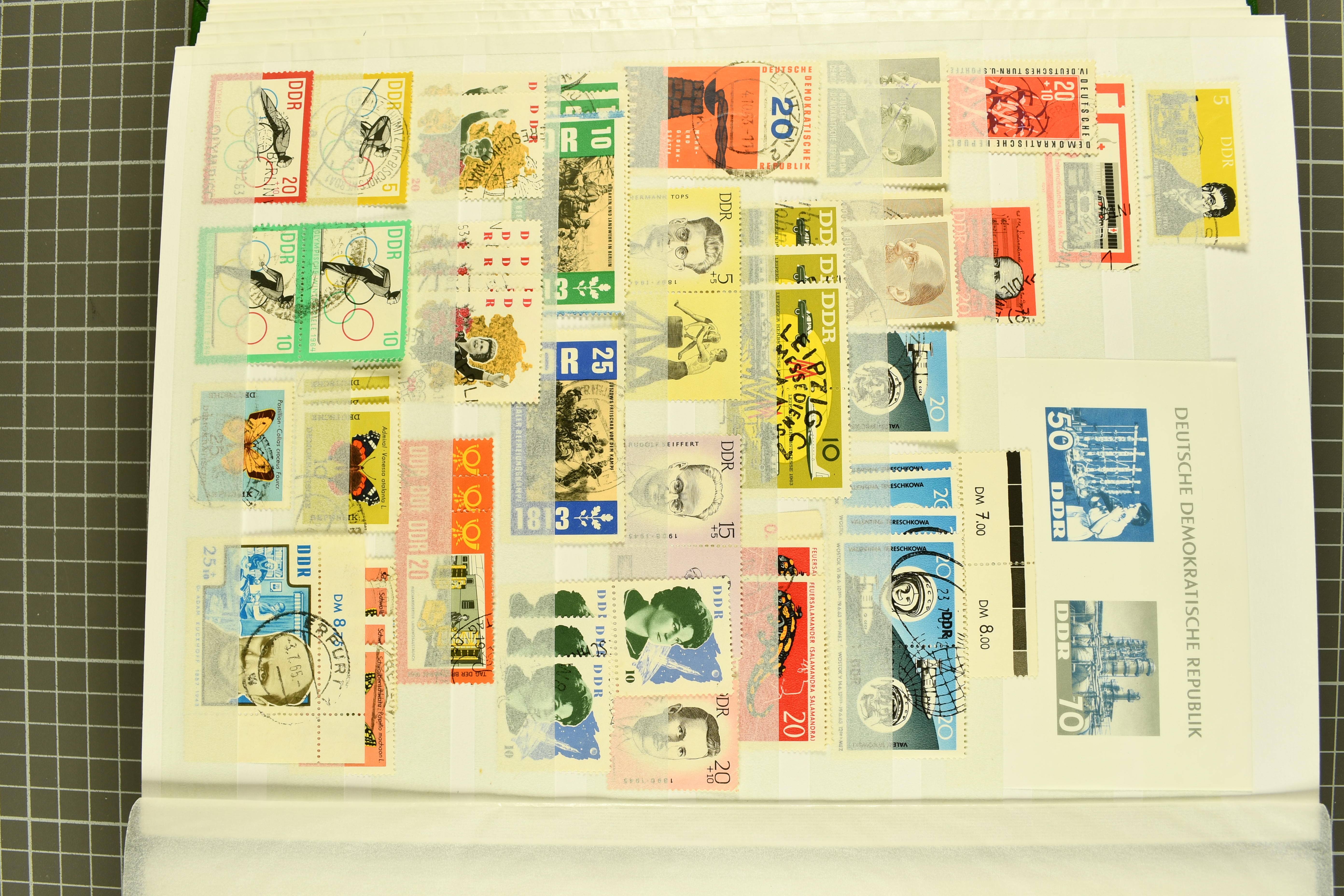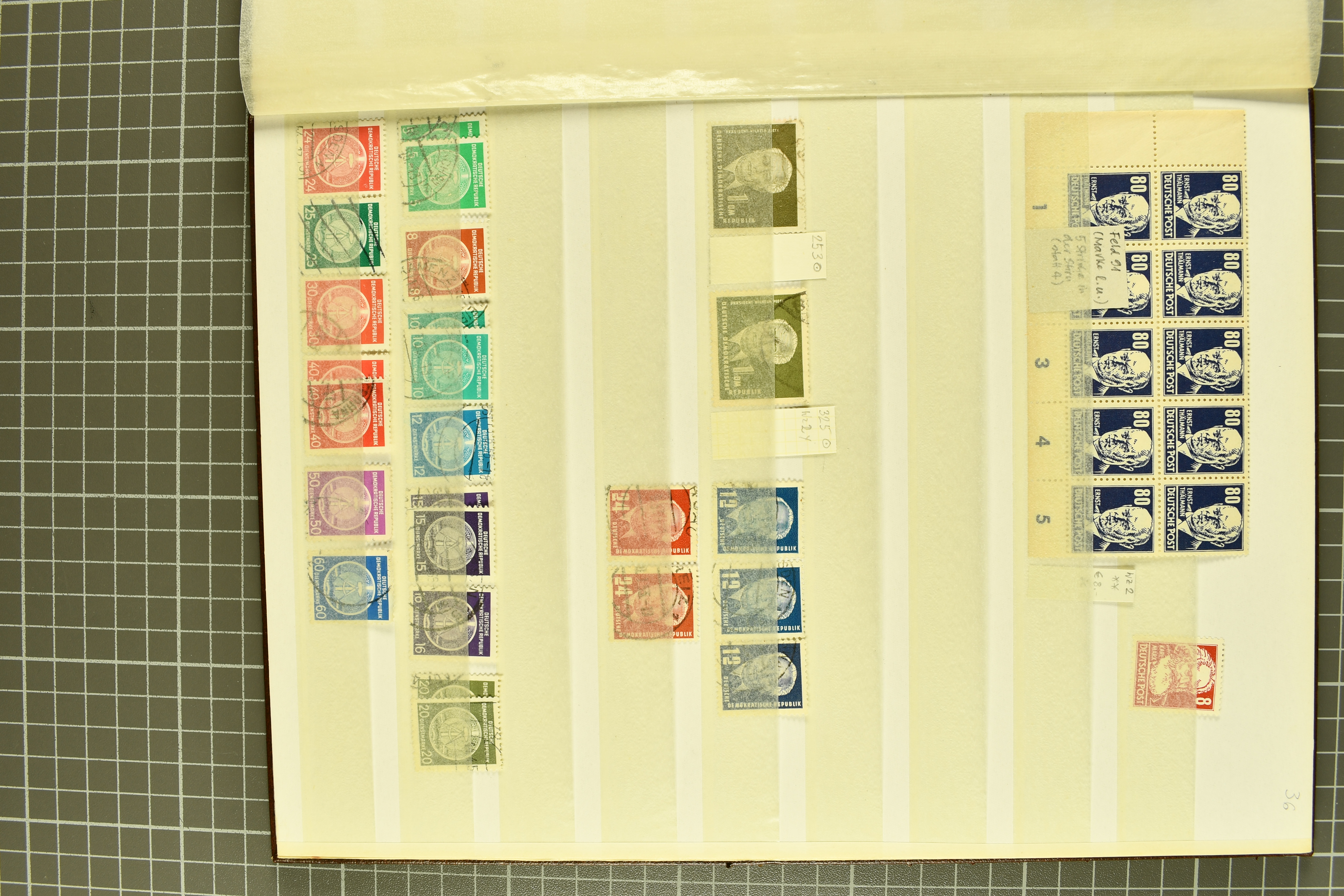 1822 imageDDR, 1945/89: Reichhaltiges Konvolut mit drei Einsteckbüchern, gebraucht und ungebraucht, lagermässig geordnet, dabei zahlreiche bessere Werte, u.a. Marx-Blocks. Weiterhin ein Einsteckalbum mit Ausgaben der Serie 'Köpfe', teils etwas spezialisiert; ein Bogenalbum mit vielen Dienstmarkenbogen sowie maschinengestempelten Bogen von der Versandstelle und einigen Zusammendruckbogen (teils mit hohem Katalogwert). Dazu eine Schachtel mit Steckkarten, Tüten und Briefen, vielfach mit besseren Ausgaben ab SBZ. Abgerundet durch ein Vordruckalbum mit den Ausgaben 1984–87 komplett. Insgesamt sehr gehaltvolle Fundgrube mit hohem Katalogwert (Image 1) (Image 2) (Image 3) (Image 4) (Image 5) (Image 6) (Image 7) (Image 8) (Image 9) (Image 10) (Image 11) (Image 12) (Image 13) (Image 14) (Image 15) (Image 16) (Image 17) (Image 18) (Image 19) (Image 20) (Image 21) (Image 22) (Image 23) (Image 24) (Image 25) (Image 26) (Image 27) (Image 28) (Image 29) (Image 30) (Image 31) (Image 32) (Image 33) (Image 34) (Image 35) (Image 36) (Image 37) (Image 38) (Image 39) (Image 40) (Image 41) (Image 42) (Image 43) (Image 44) (Image 45) (Image 46) (Image 47)