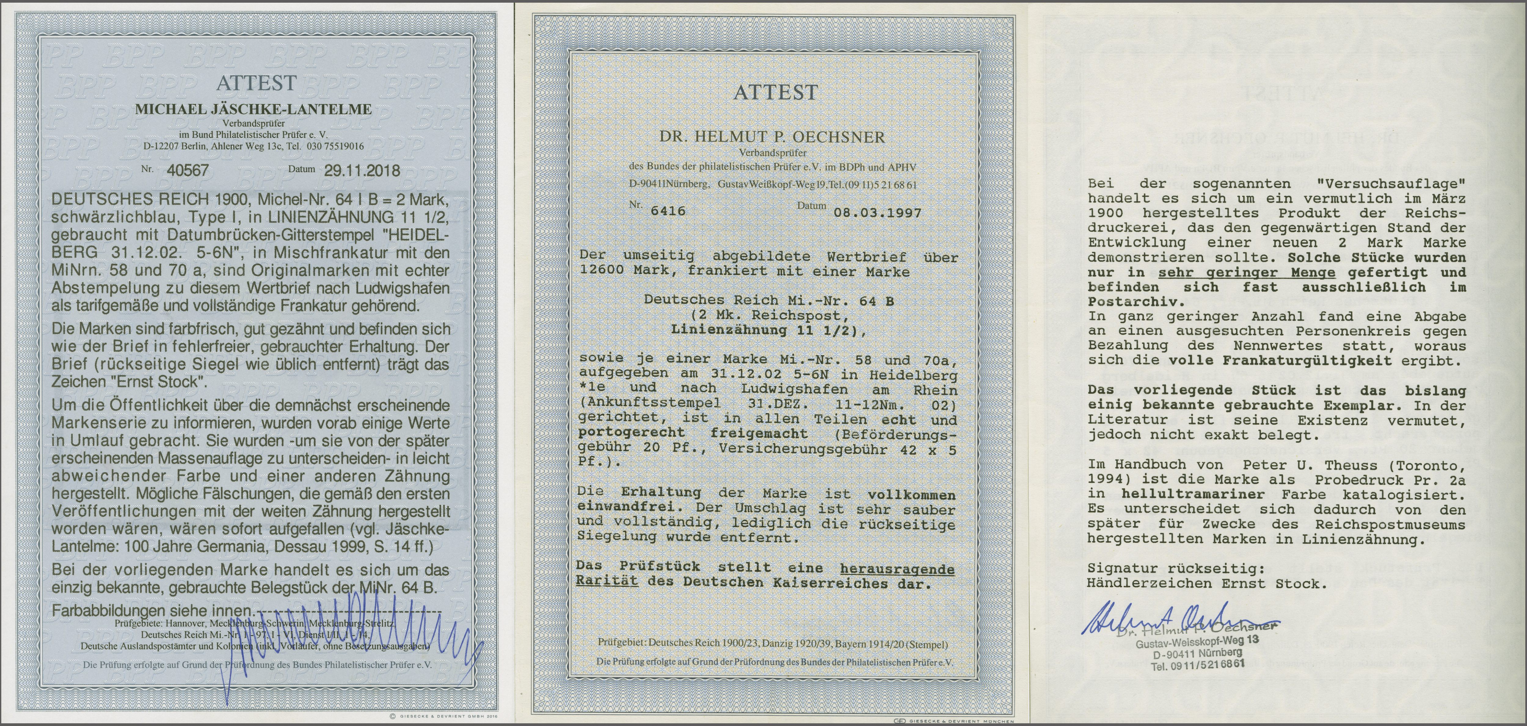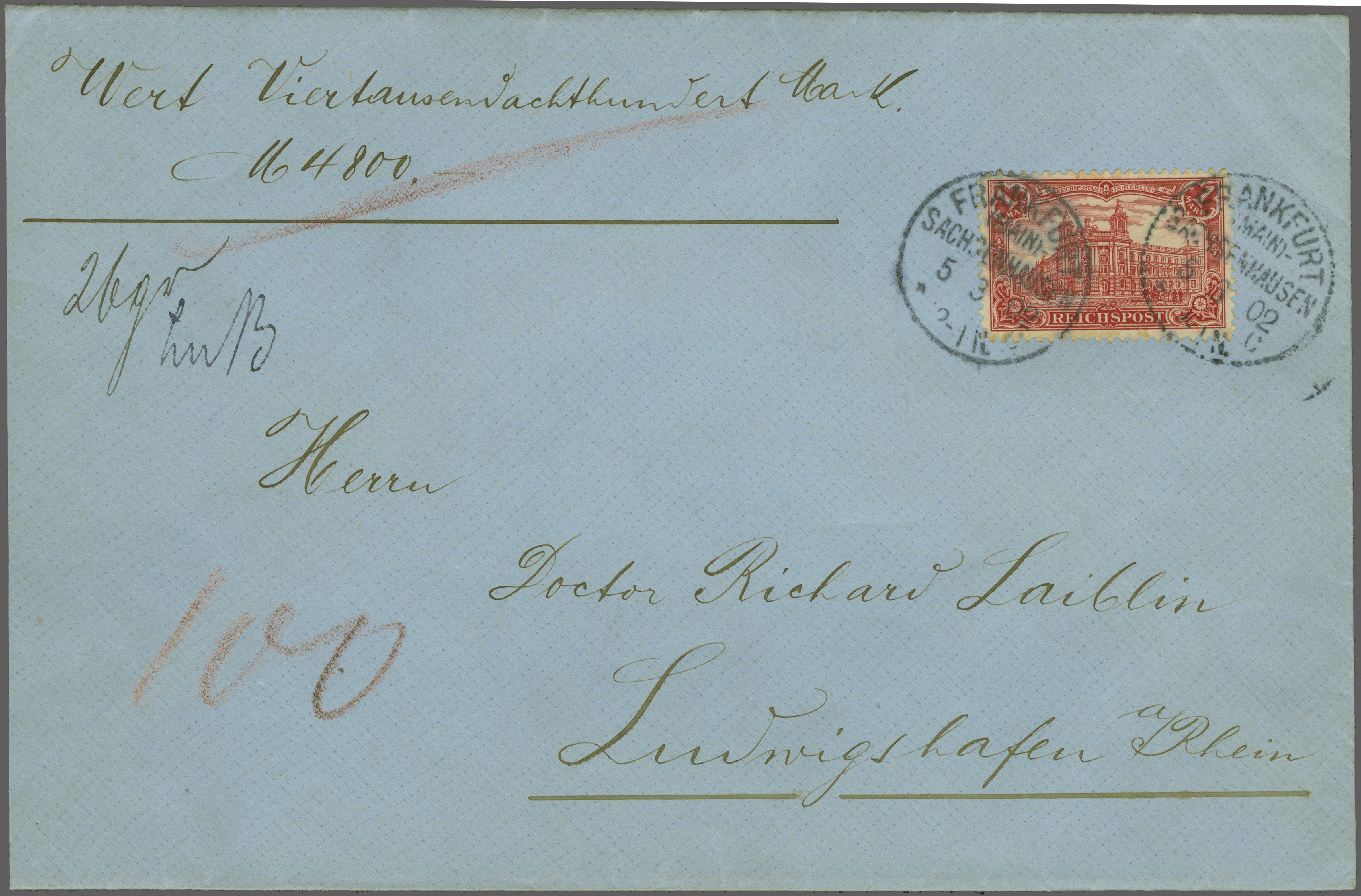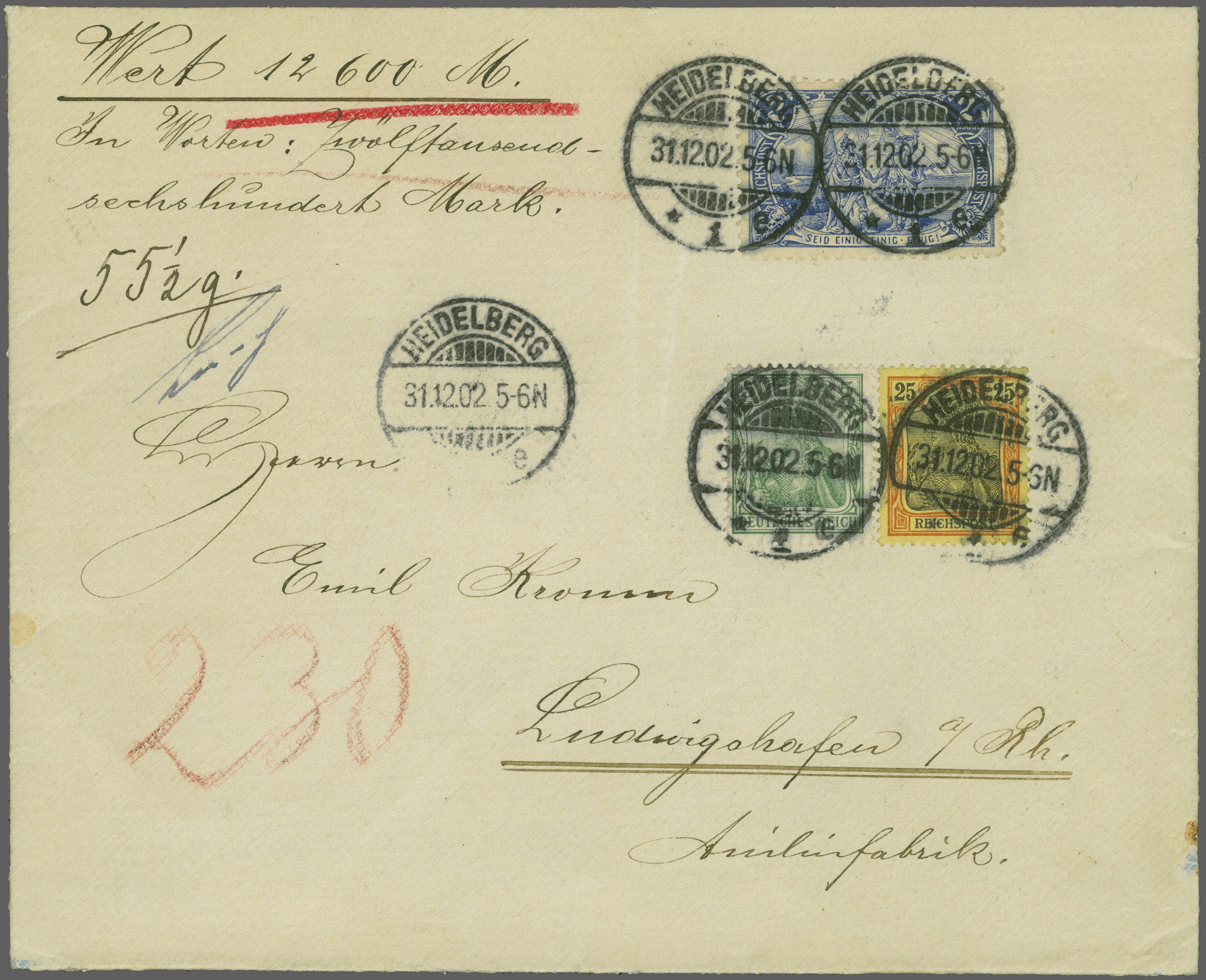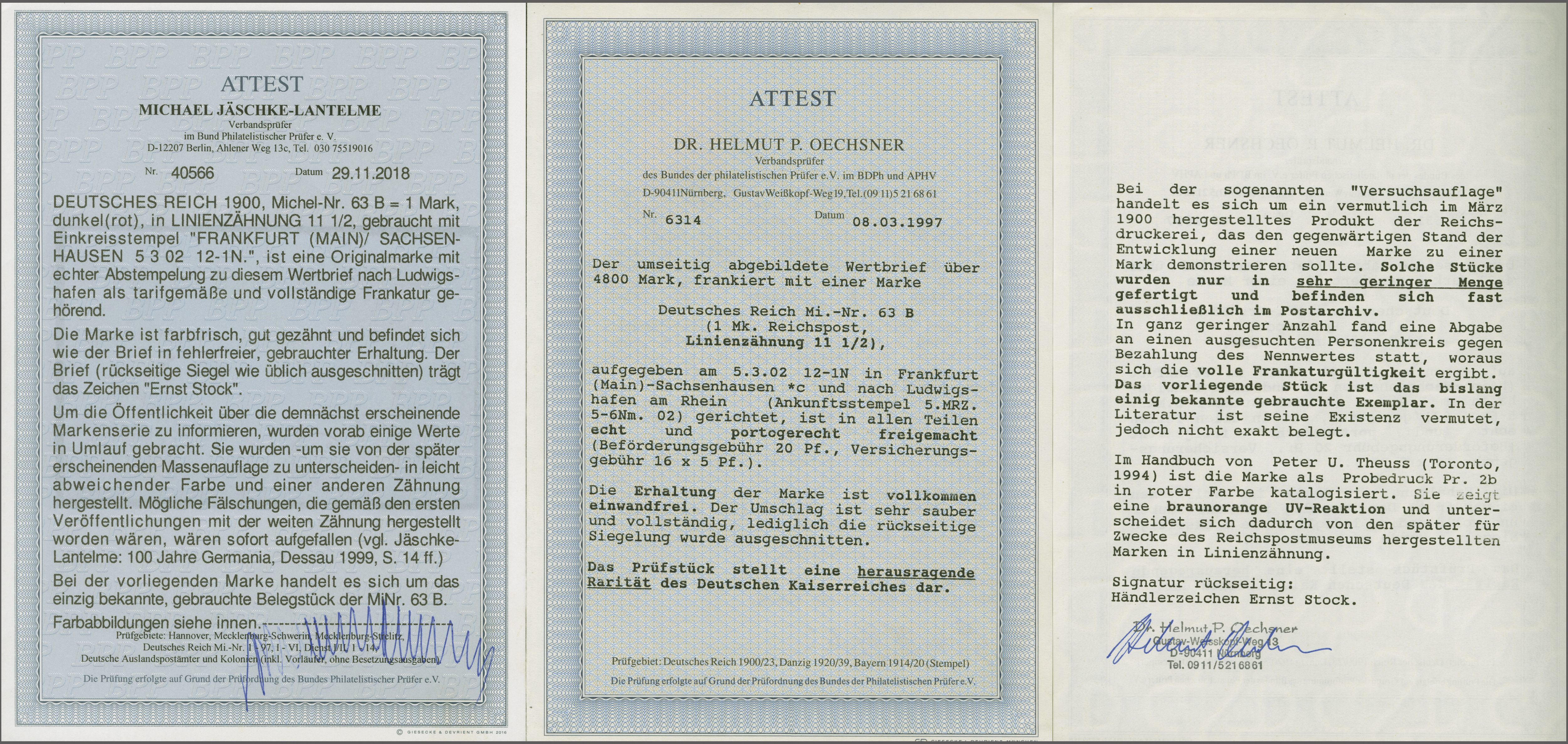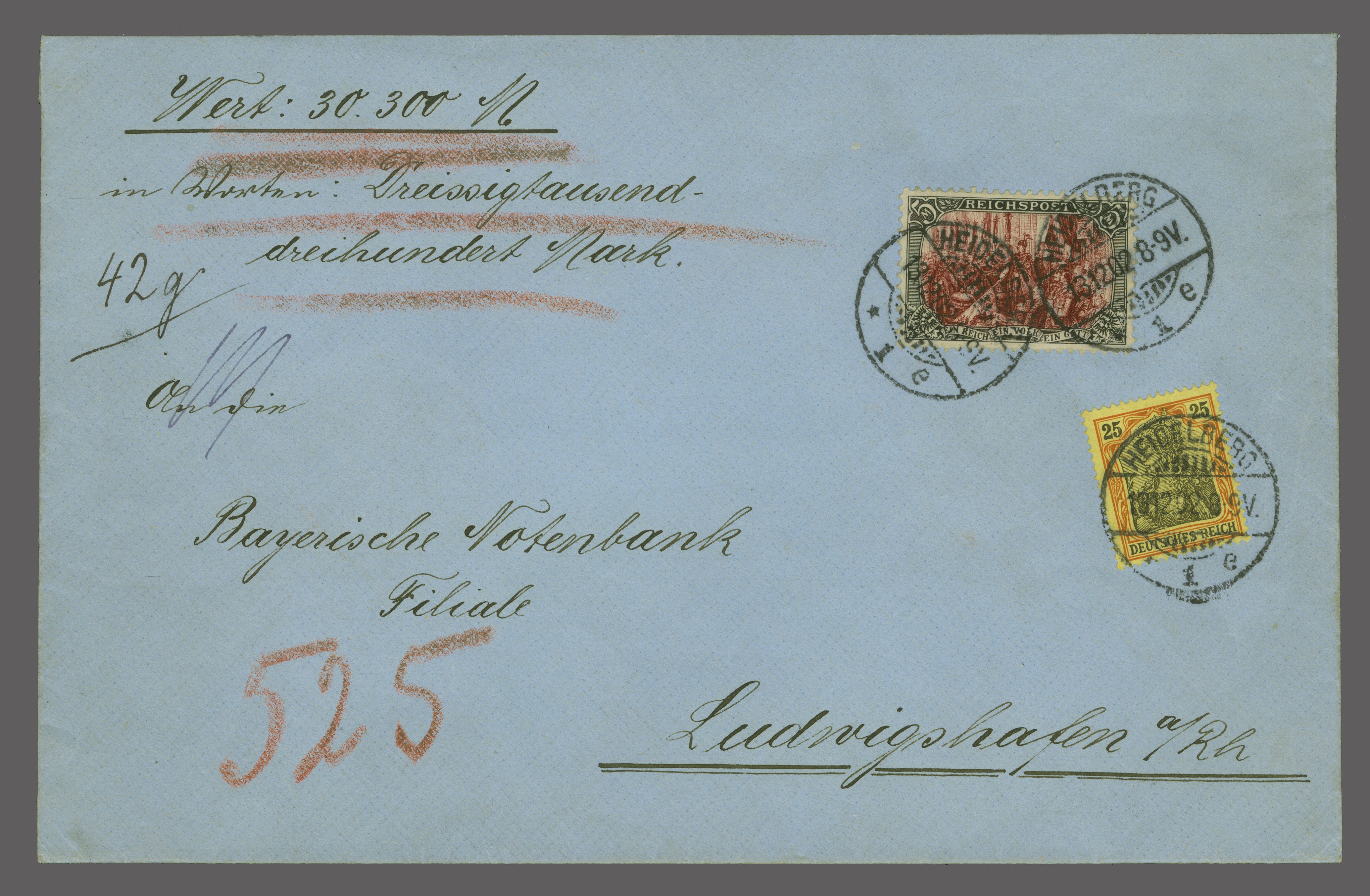 1699 cover image1900: Reichspost 1 - 5 Mark in ihrer Erstauflage mit weiter Linienzähnung 11½ und leicht abweichenden Farben auf insgesamt vier Wertbriefen aus dem Jahr 1902, alle tarifgerecht und bis auf die 1 Mk. mit weiteren Marken frankiert von HEIDELBERG bzw. FRANKFURT (MAIN) nach LUDWIGSHAFEN gelaufen. Alle farbfrischen und gut gezähnten Marken befinden sich ebenso wie die Umschläge in einwandfreier Qualität, die rückseitigen Lacksiegel wurden wie üblich entfernt. Dem seinerzeitigen hohen Porto angemessen, befinden sich alle vier Werte jeweils auf wunderschönen Wertbriefen: der 1-Mark-Wert dunkelrot als Einzelfrankatur auf Wertbrief über 4'800 Mark, die schwärzlichblaue 2-Mark-Marke in Mischfrankatur auf Wertbrief über 12'600 Mark, die violettschwarze 3-Mark-Marke in Mischfrankatur auf Wertbrief zu 18'600 Mark und die legendäre 5-Mark-Reichspost schwarz & lilarot in Mischfrankatur auf Wertbrief zu 30'300 Mark. Alle Marken sind farbfrisch, gut gezähnt und befinden sich, wie die Briefe selbst, in einwandfreier Qualität. Bei allen vier Marken handelt es sich um das jeweils einzig überhaupt bekannte Exemplar in gebrauchter Erhaltung - jedes einzelne Stück stellt für sich genommen somit eine Spitzen-Rarität der gesamten Deutschland-Philatelie dar. Jeder Brief rücks. signiert Ernst Stock, je doppelt attestiert Dr. Oechsner BPP (1997) sowie Jäschke-Lantelme BPP (2018). Bemerkung: Wie auch die Pfennig-Ausgaben wurden die Markwerte vor ihrer offiziellen Einführung in einer von der späteren Massenauflage abweichenden Form abgegeben. Der Unterschied bestand im Wesentlichen in der Zähnung. Im Gegensatz zur späteren Kammzähnung 14¼ beziehungsweise 14½ wies die sehr geringe Erstauflage der Werte zu 1, 2, 3 und 5 Mark eine weite Linienzähnung von 11½ auf. Diese Marken stellen schon in ungebrauchter Erhaltung gesuchte Raritäten dar. Gebraucht oder gar auf Brief potenziert sich ihre Seltenheit. Es ist wahrscheinlich, dass die weite Zähnung, ebenso wie die bekannte fette Inschrift der Erstauflage der Pfennigwerte, als Merkmal zum unmittelbaren Fälschungsschutz eingesetzt wurde (siehe auch Michael Jäschke-Lantelme: 100 Jahre Germania, Dessau 1999; S. 14ff.). Denn mögliche Fälschungen mit weiter Zähnung wären sofort aufgefallen. Absender / Empfänger der Briefe waren die Chemiker Dr. Richard Laiblin & Emil Kromm, die offensichtlich bei der BASF in Ludwigshafen beschäftigt waren, wenn sie nicht gerade derartige Preziosen produzierten. Provenienz: Einzeln angeboten bei der 292. Heinrich Köhler Raritäten-Auktion (Februar 1997), als Lose 592 bis 595 (Image 1) (Image 2) (Image 3) (Image 4) (Image 5) (Image 6) (Image 7) (Image 8) (Image 9) (Image 10)