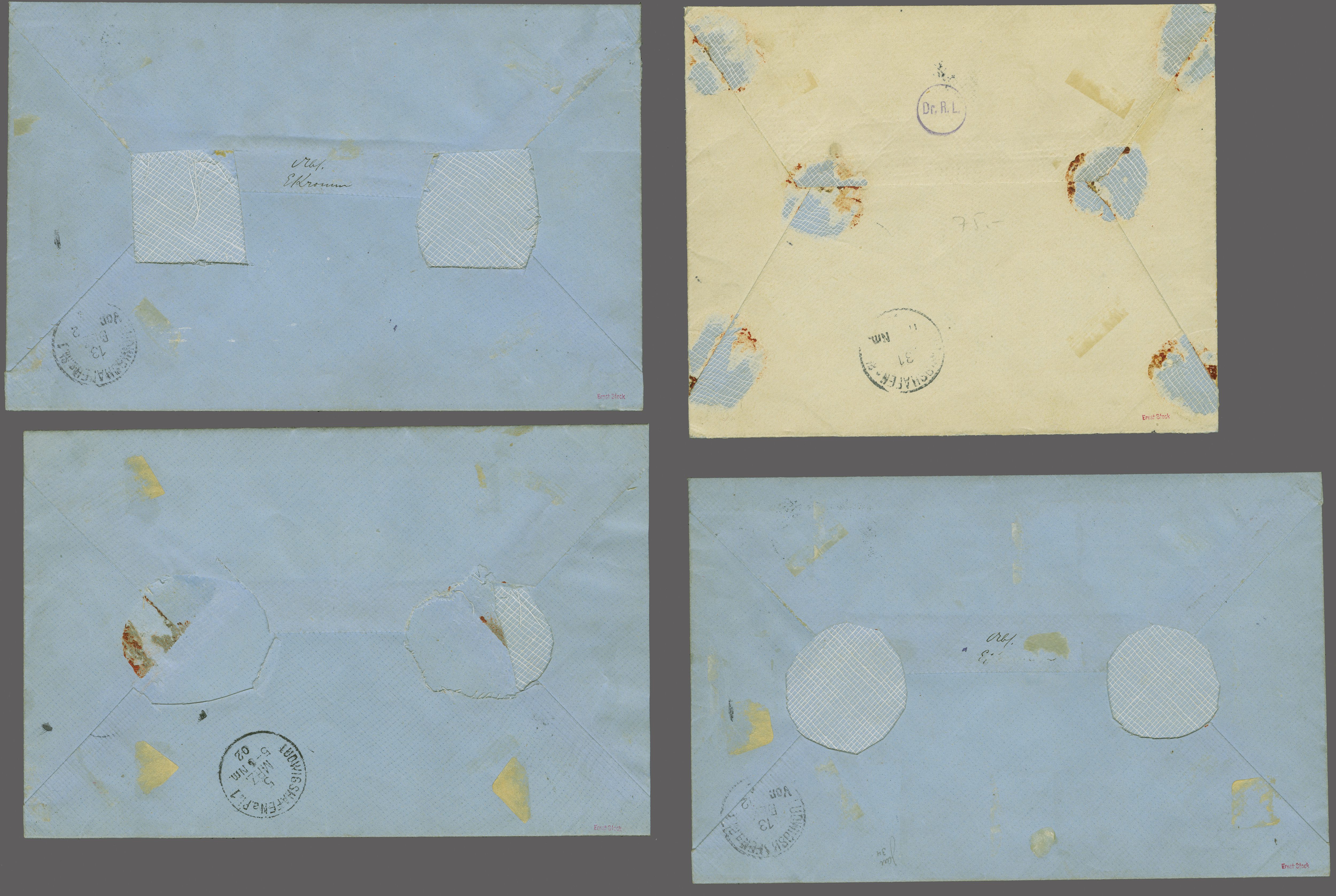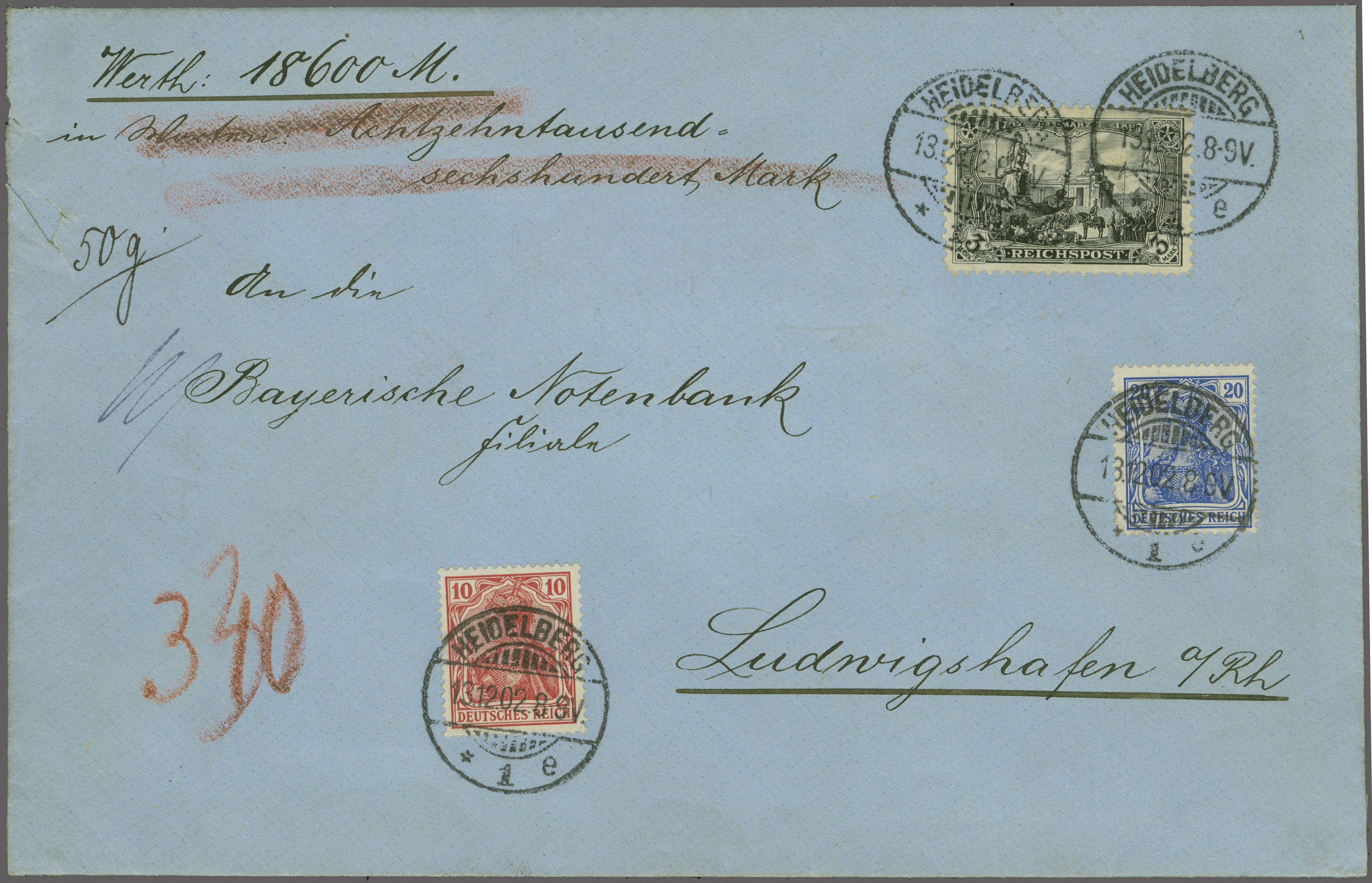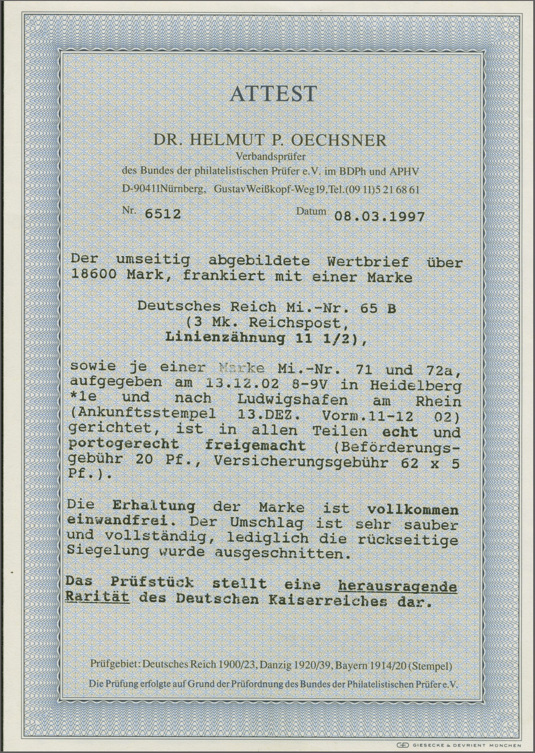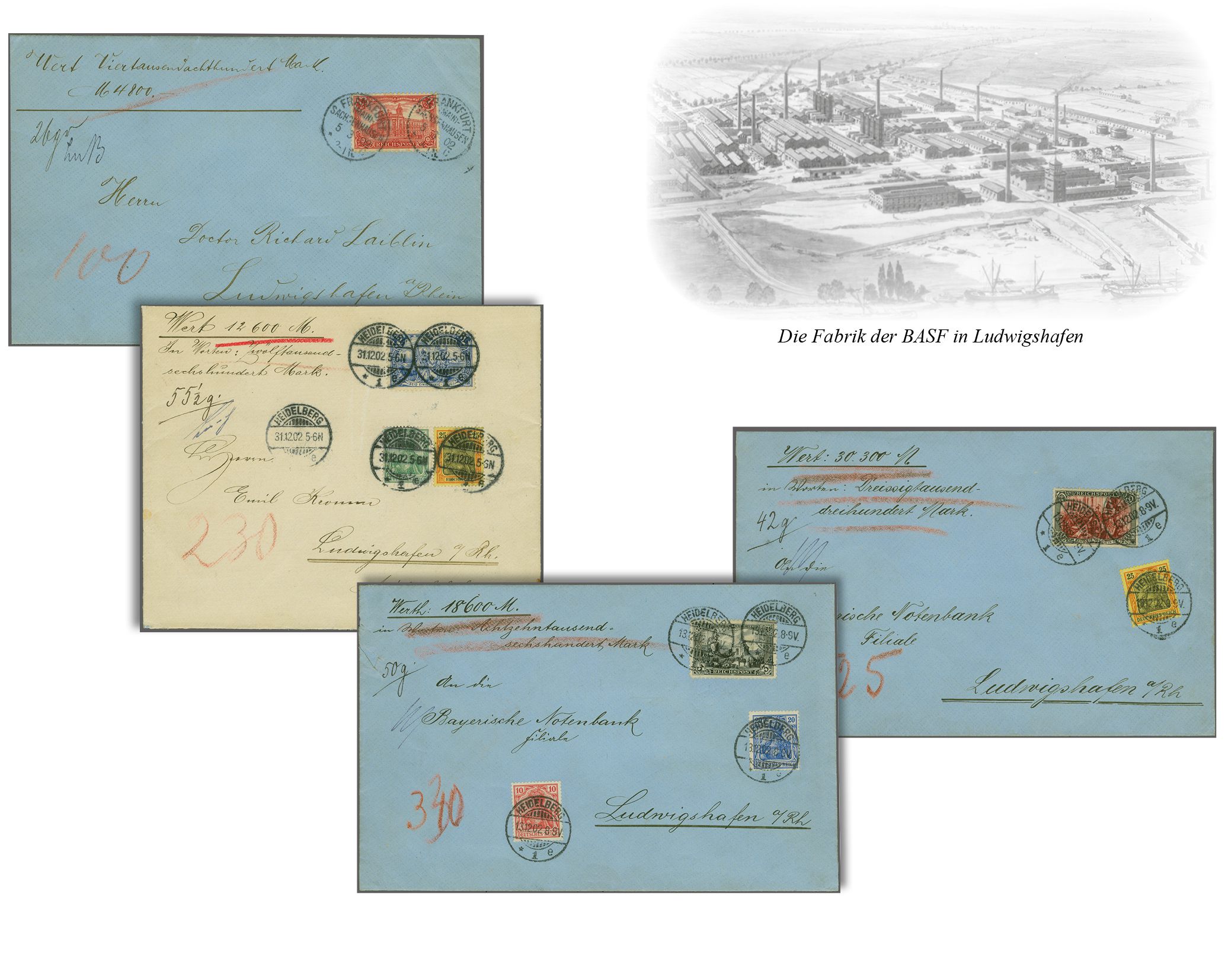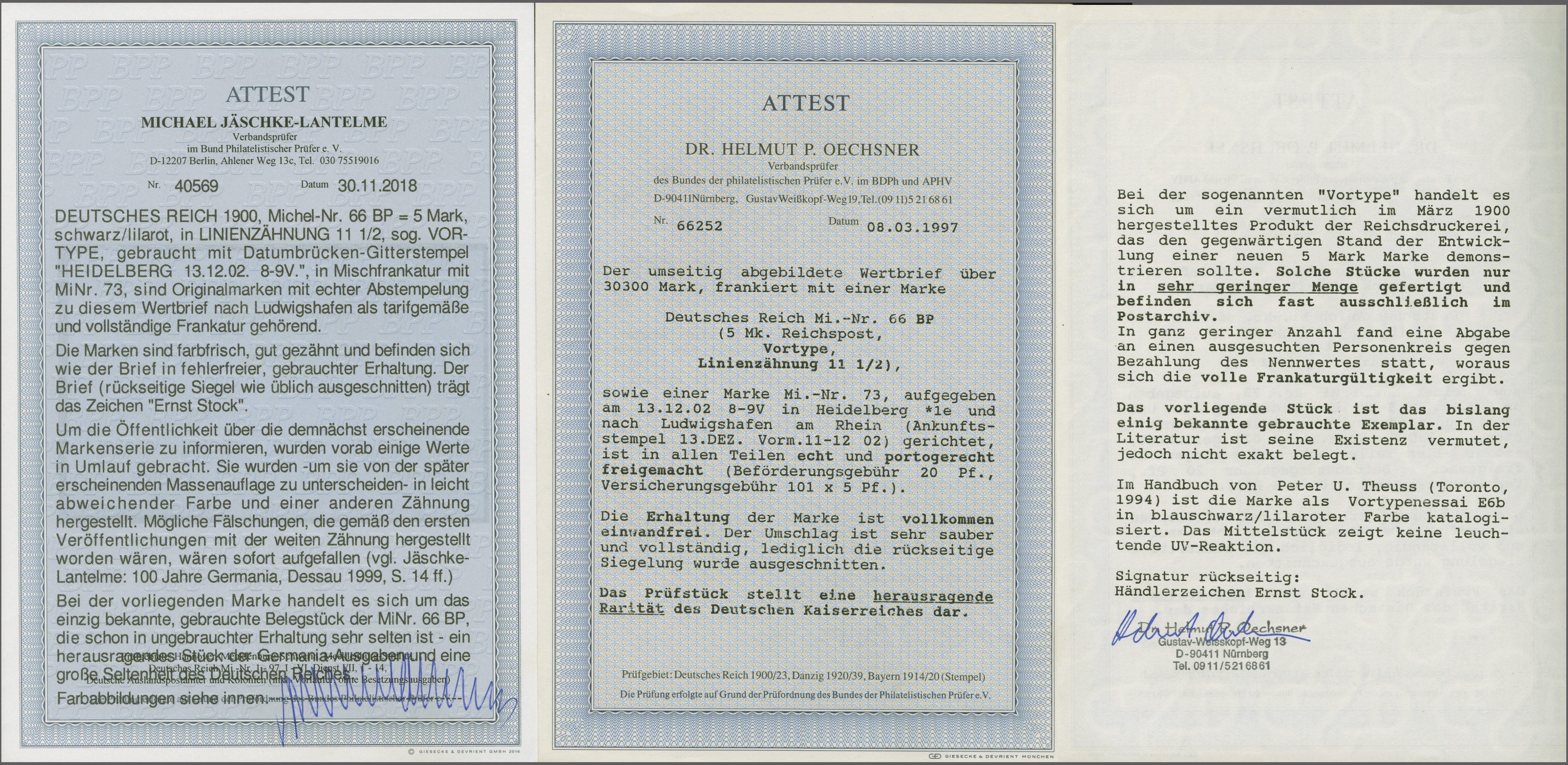 1699 cover image1900: Reichspost 1 - 5 Mark in ihrer Erstauflage mit weiter Linienzähnung 11½ und leicht abweichenden Farben auf insgesamt vier Wertbriefen aus dem Jahr 1902, alle tarifgerecht und bis auf die 1 Mk. mit weiteren Marken frankiert von HEIDELBERG bzw. FRANKFURT (MAIN) nach LUDWIGSHAFEN gelaufen. Alle farbfrischen und gut gezähnten Marken befinden sich ebenso wie die Umschläge in einwandfreier Qualität, die rückseitigen Lacksiegel wurden wie üblich entfernt. Dem seinerzeitigen hohen Porto angemessen, befinden sich alle vier Werte jeweils auf wunderschönen Wertbriefen: der 1-Mark-Wert dunkelrot als Einzelfrankatur auf Wertbrief über 4'800 Mark, die schwärzlichblaue 2-Mark-Marke in Mischfrankatur auf Wertbrief über 12'600 Mark, die violettschwarze 3-Mark-Marke in Mischfrankatur auf Wertbrief zu 18'600 Mark und die legendäre 5-Mark-Reichspost schwarz & lilarot in Mischfrankatur auf Wertbrief zu 30'300 Mark. Alle Marken sind farbfrisch, gut gezähnt und befinden sich, wie die Briefe selbst, in einwandfreier Qualität. Bei allen vier Marken handelt es sich um das jeweils einzig überhaupt bekannte Exemplar in gebrauchter Erhaltung - jedes einzelne Stück stellt für sich genommen somit eine Spitzen-Rarität der gesamten Deutschland-Philatelie dar. Jeder Brief rücks. signiert Ernst Stock, je doppelt attestiert Dr. Oechsner BPP (1997) sowie Jäschke-Lantelme BPP (2018). Bemerkung: Wie auch die Pfennig-Ausgaben wurden die Markwerte vor ihrer offiziellen Einführung in einer von der späteren Massenauflage abweichenden Form abgegeben. Der Unterschied bestand im Wesentlichen in der Zähnung. Im Gegensatz zur späteren Kammzähnung 14¼ beziehungsweise 14½ wies die sehr geringe Erstauflage der Werte zu 1, 2, 3 und 5 Mark eine weite Linienzähnung von 11½ auf. Diese Marken stellen schon in ungebrauchter Erhaltung gesuchte Raritäten dar. Gebraucht oder gar auf Brief potenziert sich ihre Seltenheit. Es ist wahrscheinlich, dass die weite Zähnung, ebenso wie die bekannte fette Inschrift der Erstauflage der Pfennigwerte, als Merkmal zum unmittelbaren Fälschungsschutz eingesetzt wurde (siehe auch Michael Jäschke-Lantelme: 100 Jahre Germania, Dessau 1999; S. 14ff.). Denn mögliche Fälschungen mit weiter Zähnung wären sofort aufgefallen. Absender / Empfänger der Briefe waren die Chemiker Dr. Richard Laiblin & Emil Kromm, die offensichtlich bei der BASF in Ludwigshafen beschäftigt waren, wenn sie nicht gerade derartige Preziosen produzierten. Provenienz: Einzeln angeboten bei der 292. Heinrich Köhler Raritäten-Auktion (Februar 1997), als Lose 592 bis 595 (Image 1) (Image 2) (Image 3) (Image 4) (Image 5) (Image 6) (Image 7) (Image 8) (Image 9) (Image 10)