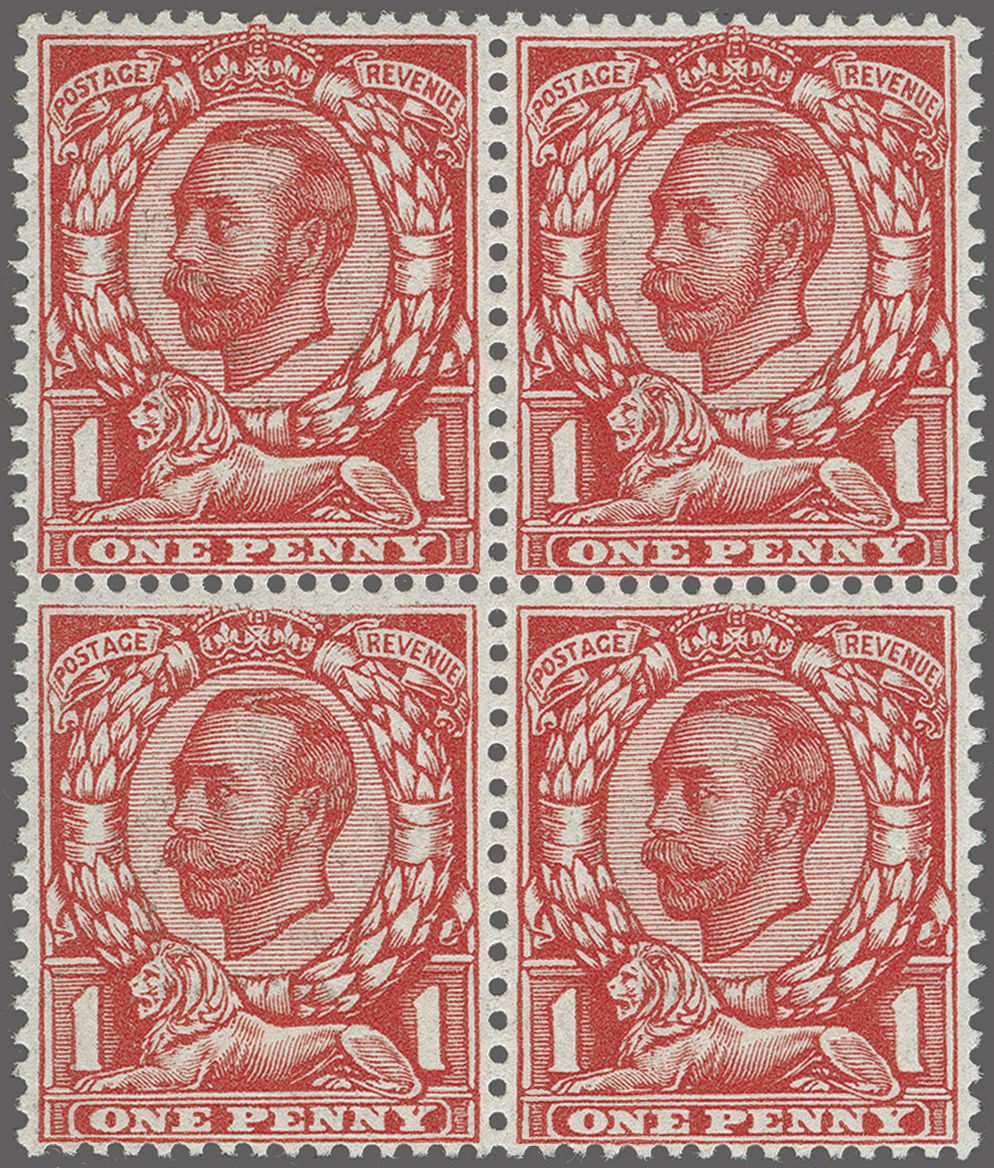1912 (Sept. 28): 1 d. aniline scarlet, wmk. Crown, die 2, an unused block of four, variety "No Cross on Crown" to the two bottom stamps, fresh colour, original gum. Some slight soiling to surface, otherwise very fine and