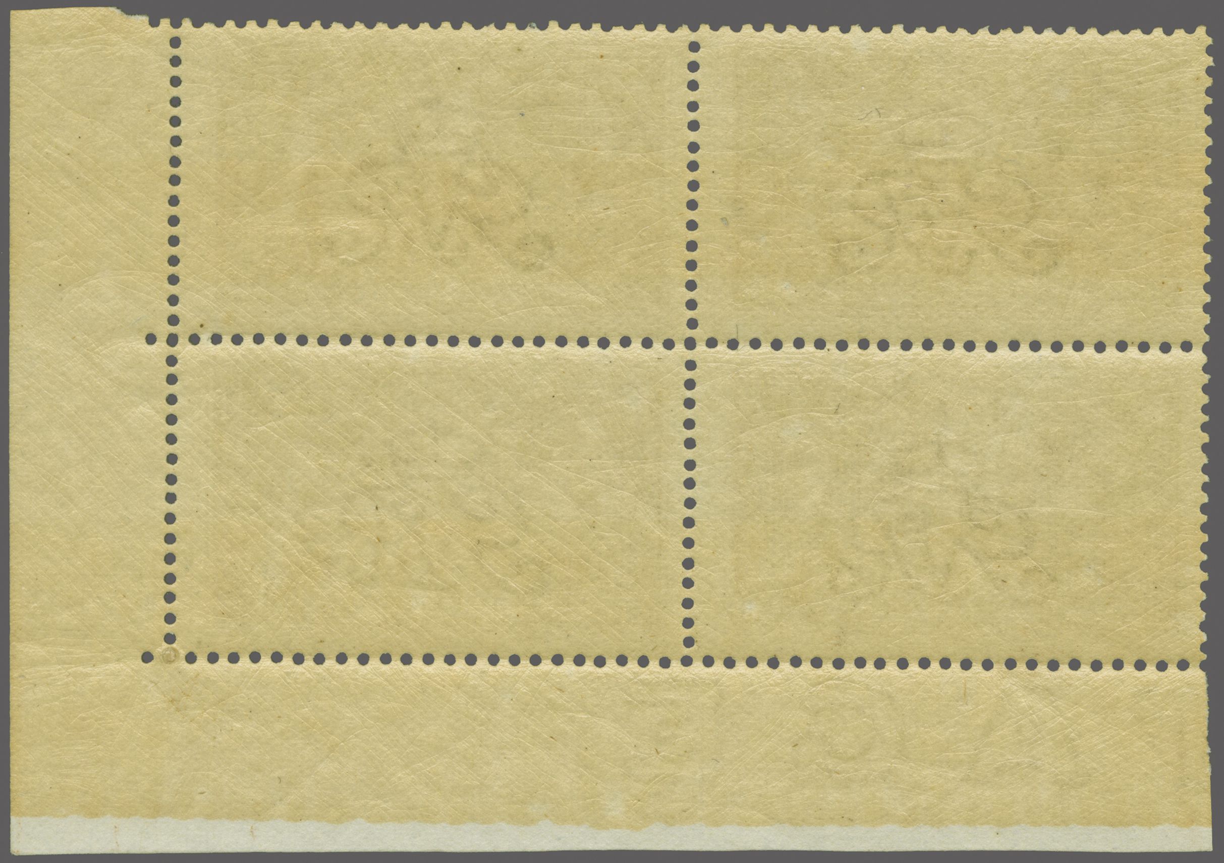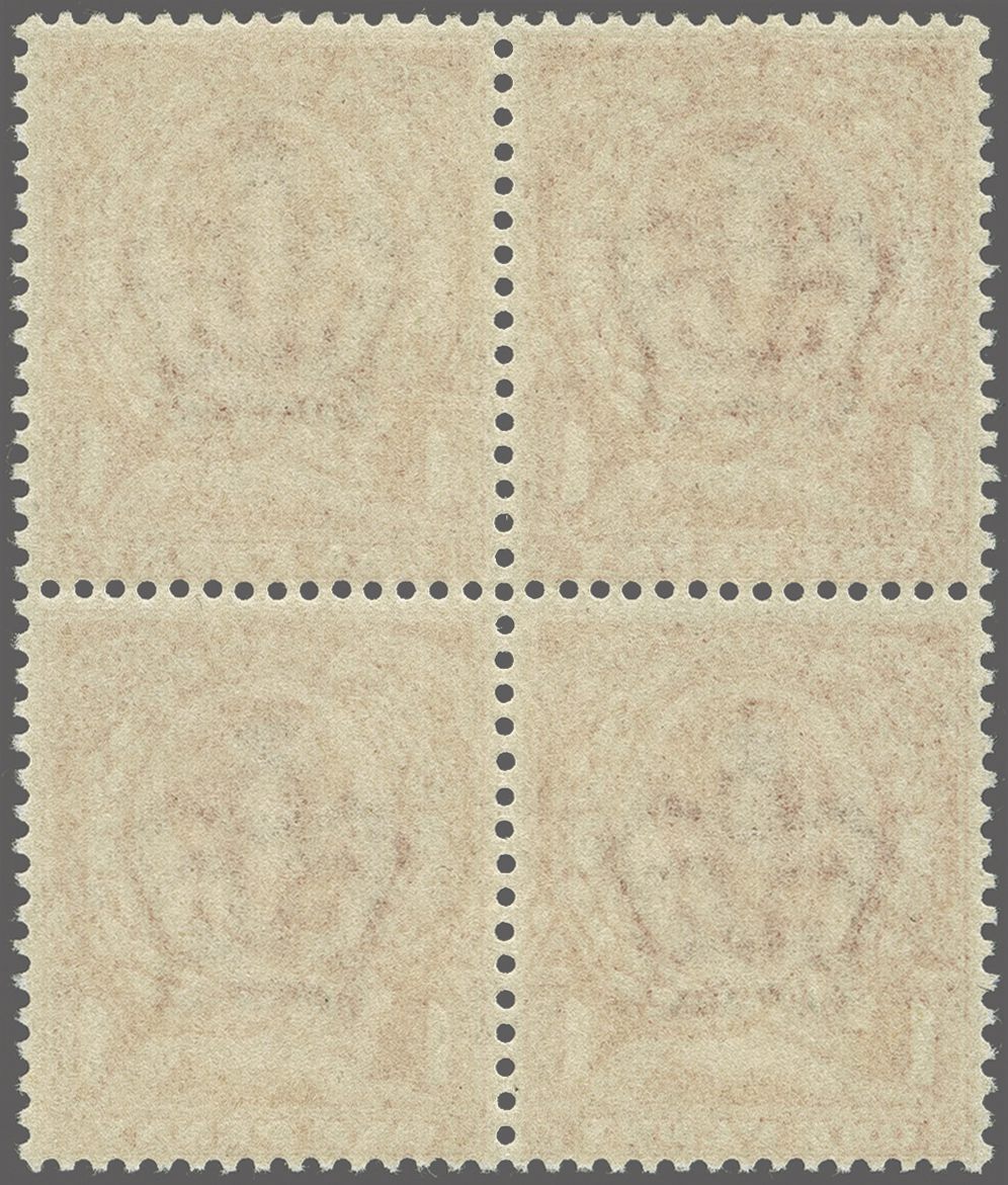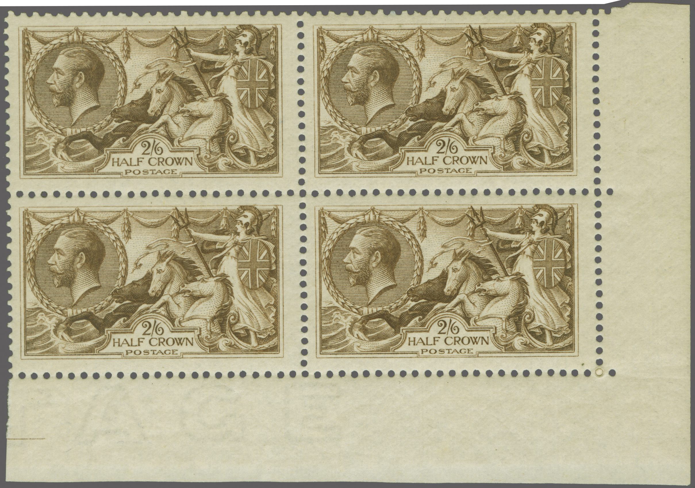 1918 (Dec): Bradbury Wilkinson Seahorse 2 s. 6 d. chocolate, an unused block of four, corner marginal from lower right of sheet, fresh and extremely fine, unmounted og. Gi = £ 1'300+ (Image 1)