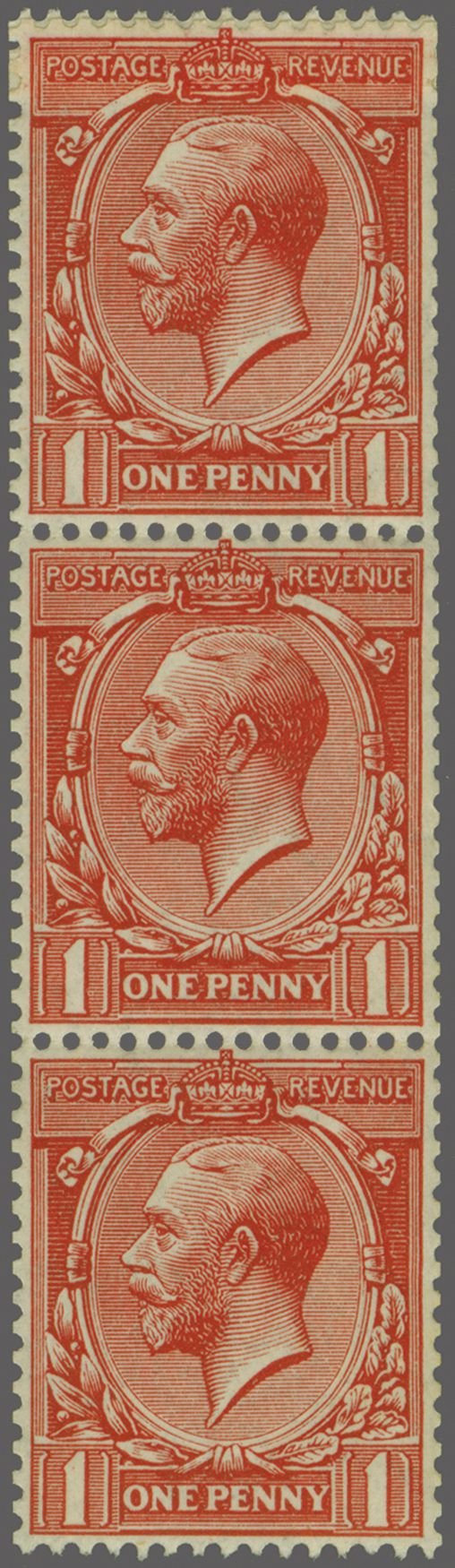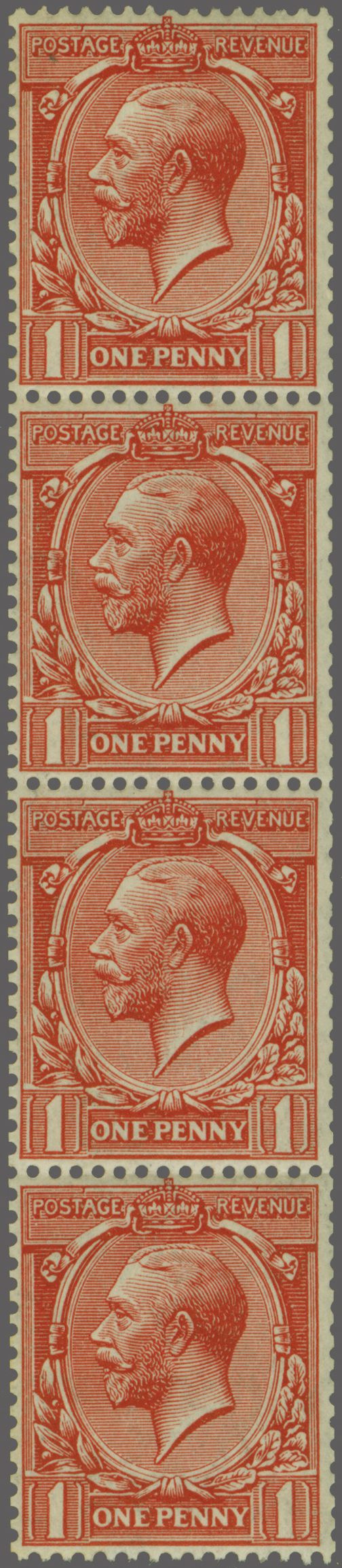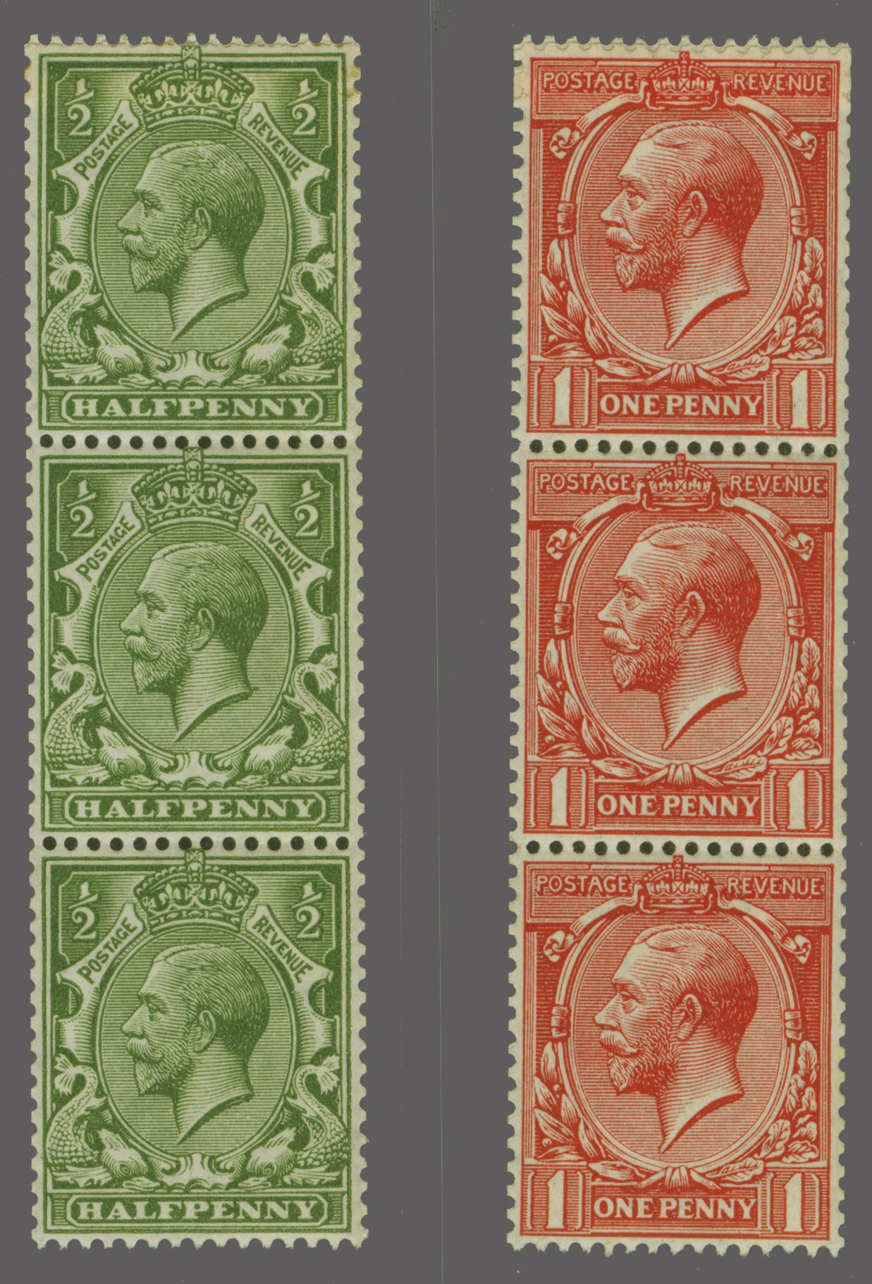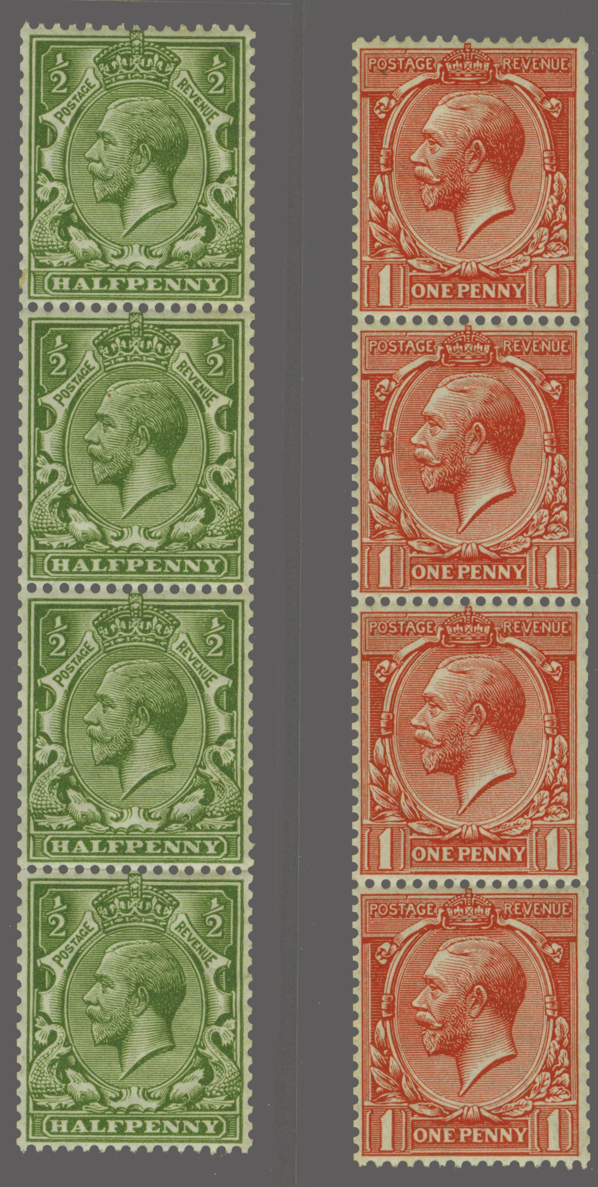 1913 (Aug): ½ d. bright green and 1 d. dull scarlet, wmk. Royal Cypher (Multiple), matching vertical Coil strips of four, each fresh and very fine, unmounted og. Gi = £ 2'400+ (Image 1)