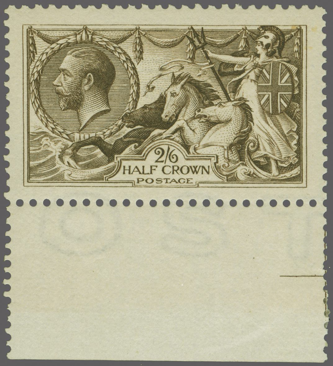 1913 (June 30): Waterlow Bros. & Layton, Seahorse 2 s. 6 d. deep sepia-brown, an unused example of rich colour, marginal from base of sheet, unmounted og. Superb Gi = £ 850 (Image 1)