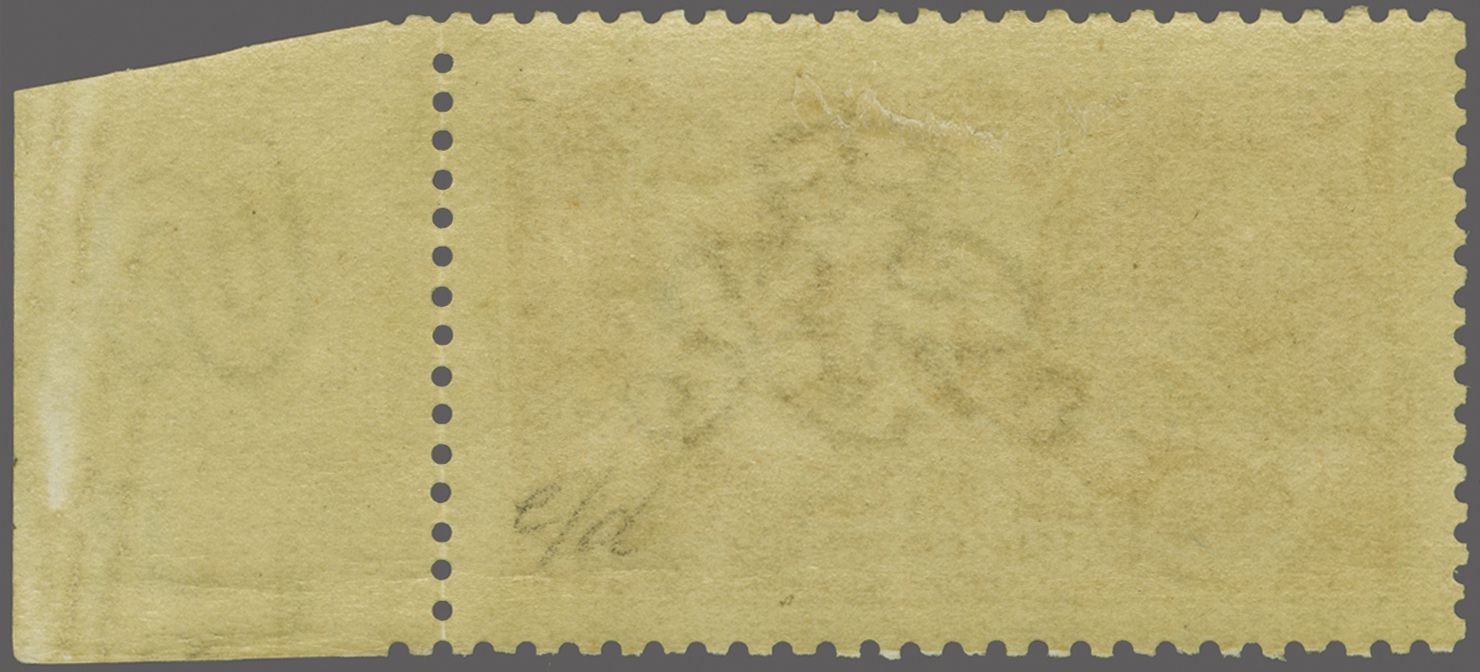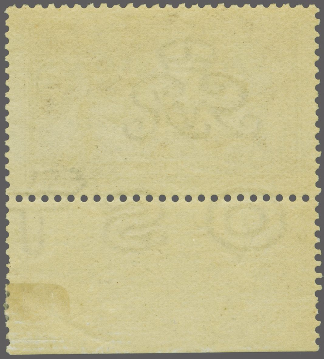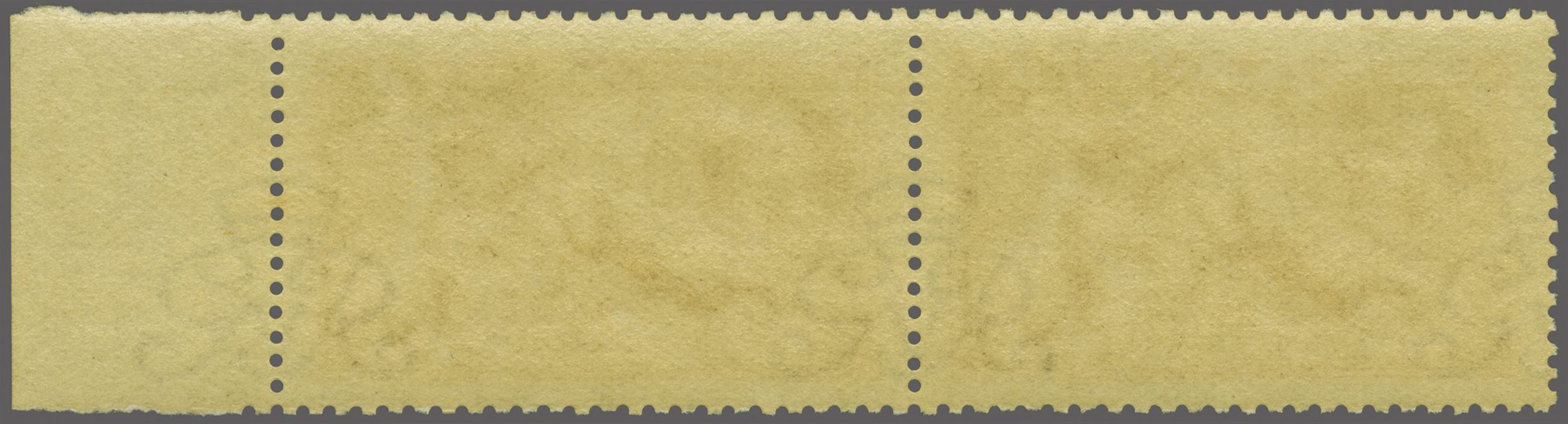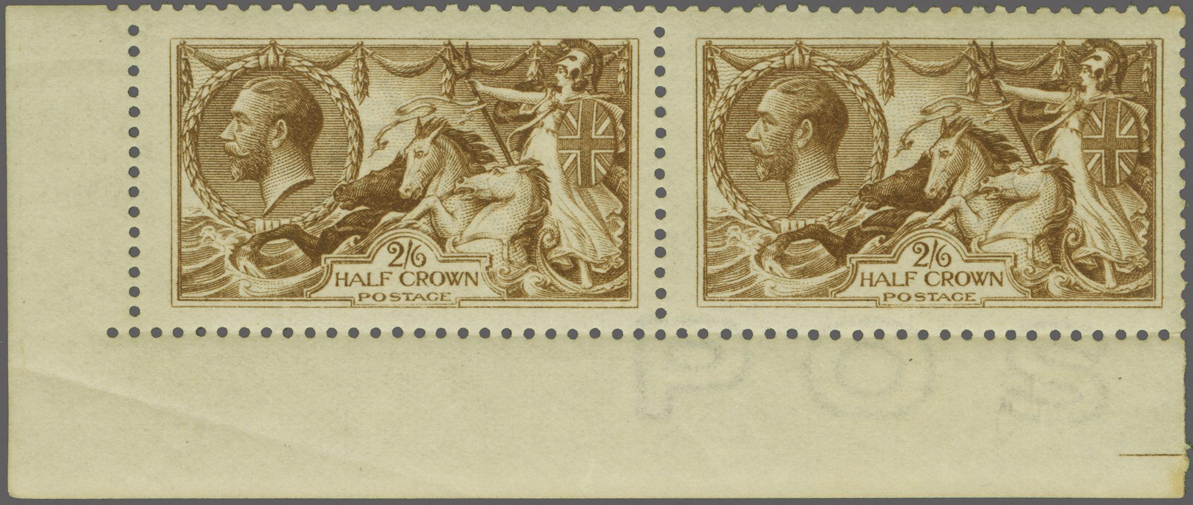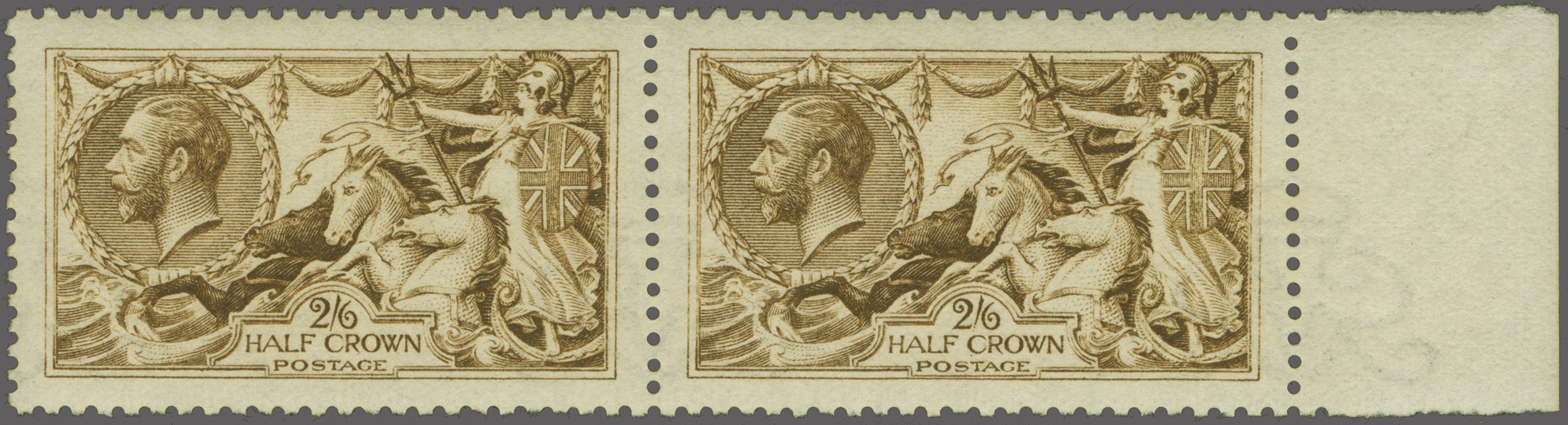1915 (Oct): De La Rue, Seahorse 2 s. 6 d. yellow-brown, an unused horizontal pair, marginal from right of sheet, of superb centering and colour, unmounted og. Scarce and most attractive Gi = £ 1'100 (Image 1)