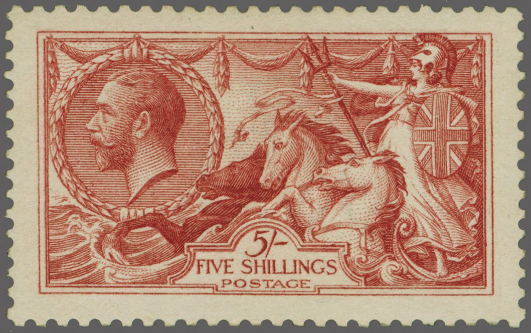 1913 (June 30): Waterlow Bros. & Layton, Seahorse 5 s. rose-carmine, an unused example of fresh colour and centering, very fine, unmounted og. Gi = £ 1'100 (Image 1)