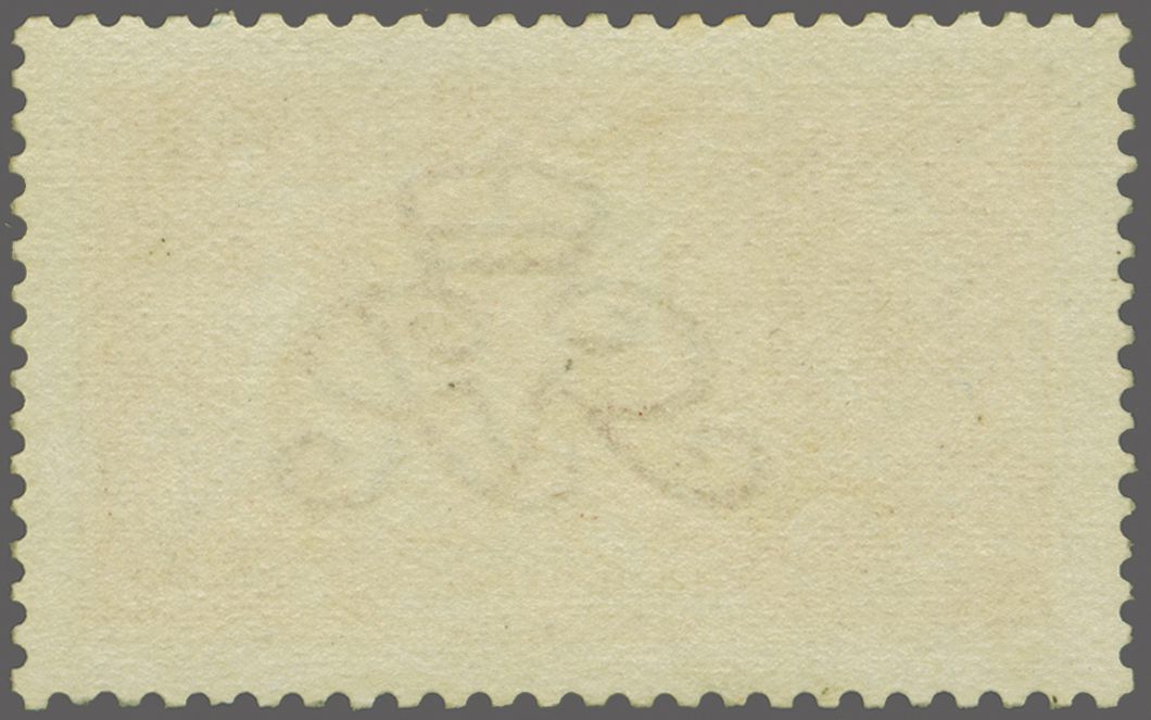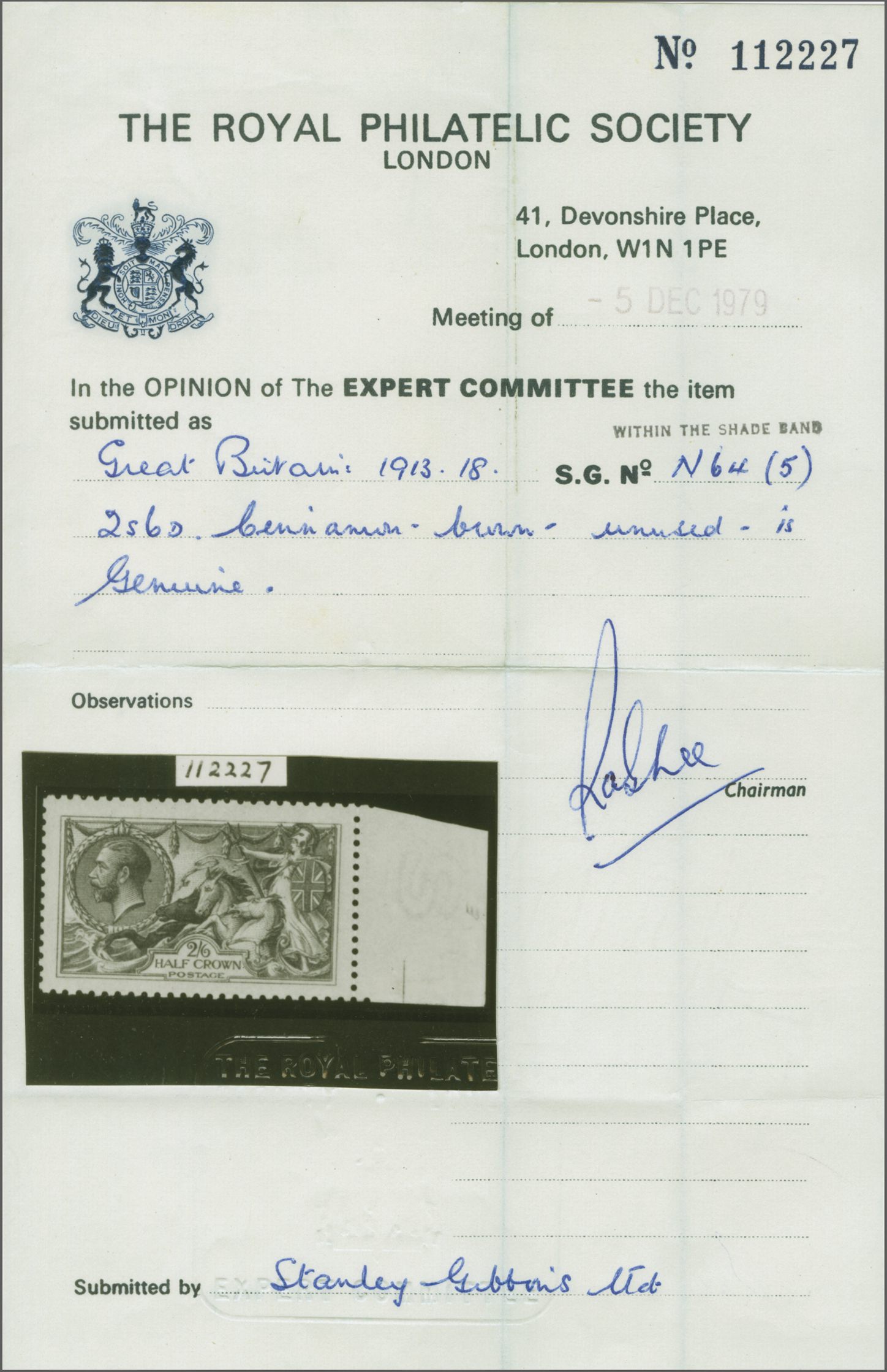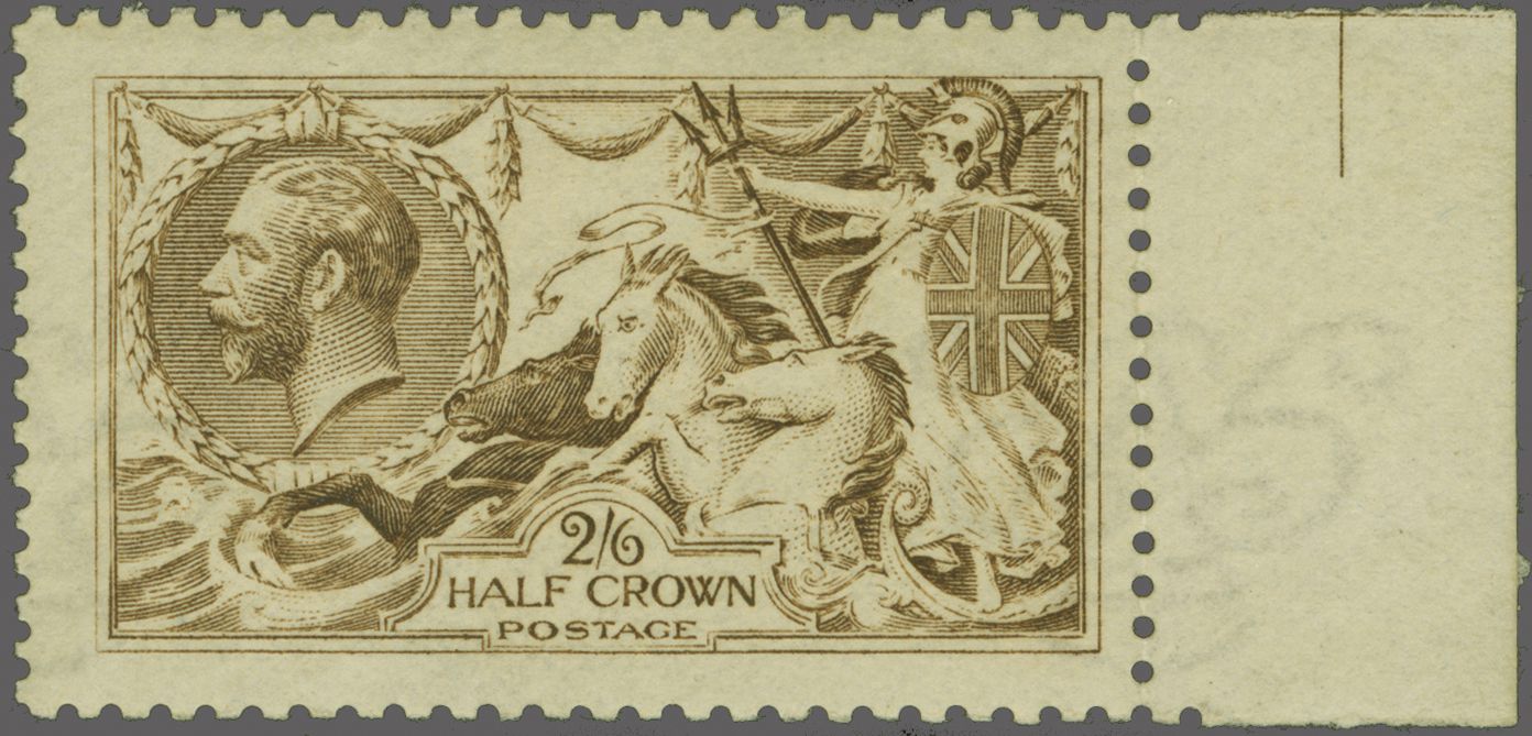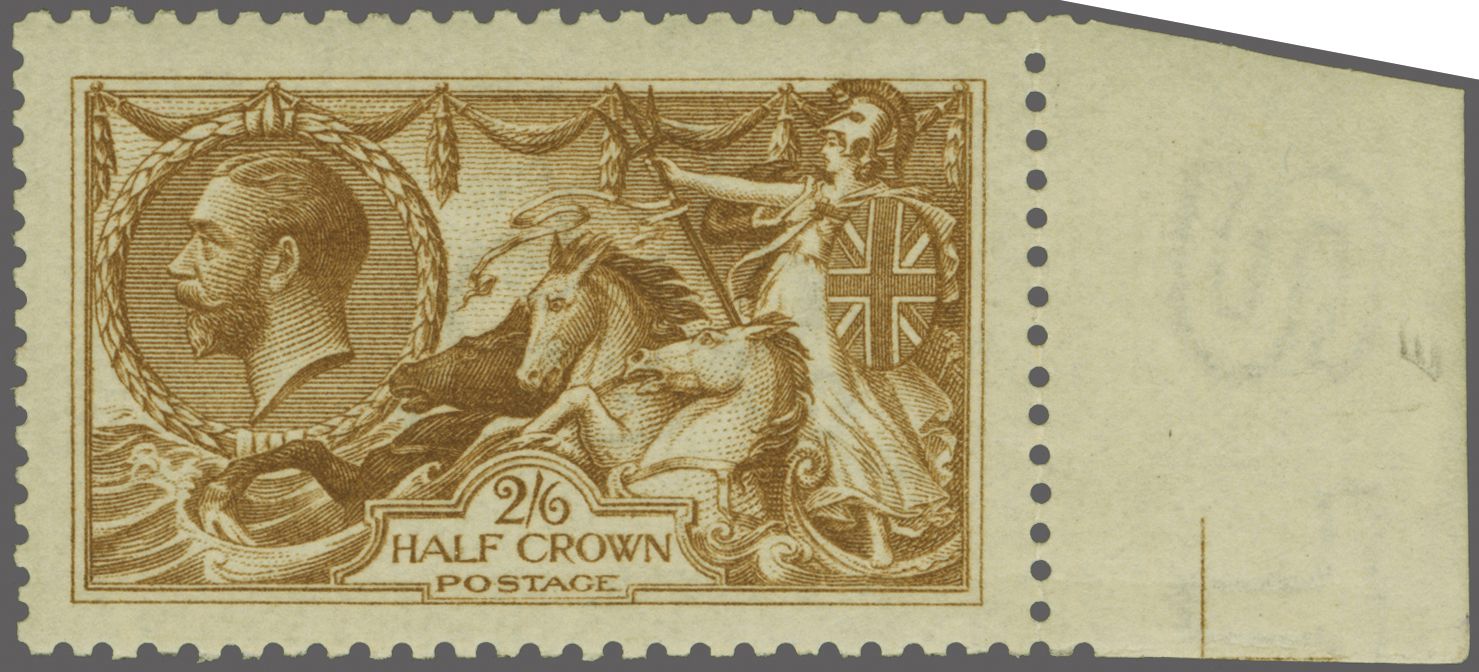 1915 (Oct): De La Rue, Seahorse 2 s. 6 d. grey-brown, an unused example, marginal from right of sheet, variety "Watermark Inverted" - easily seen in margin, fresh and fine, unmounted og. Rare Gi = £ 1'250 (Image 1)