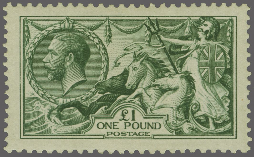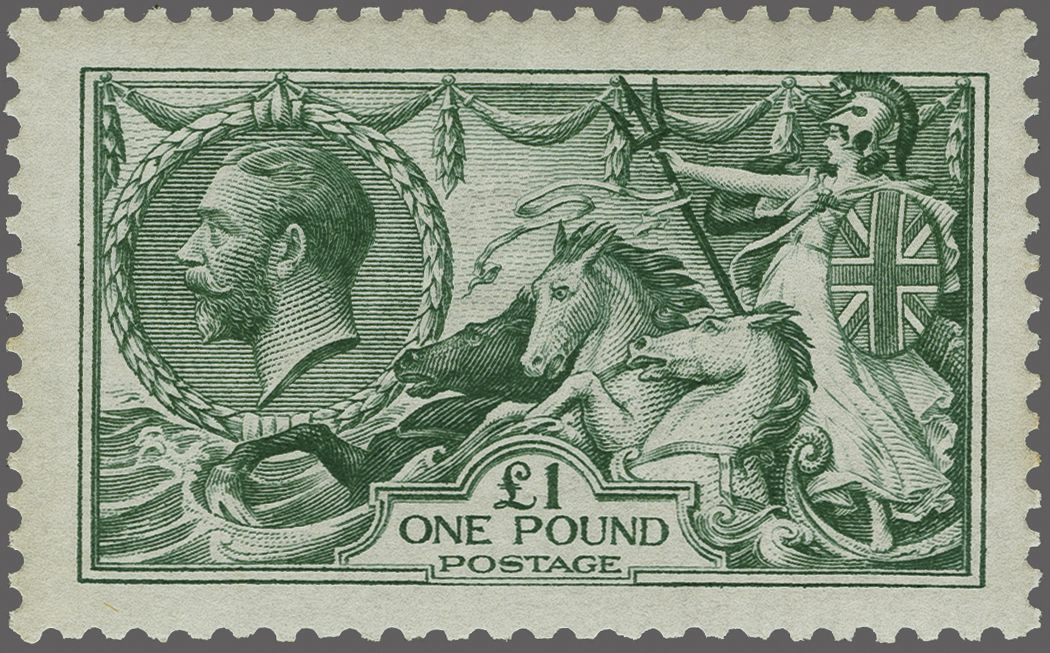 1913 (June 30): Waterlow Bros. & Layton, Seahorse £ 1 deep blue-green, an unused example, superbly centred and of fine rich colour, very fine og. Scarce so fine Gi = £ 2'800 (Image 1)