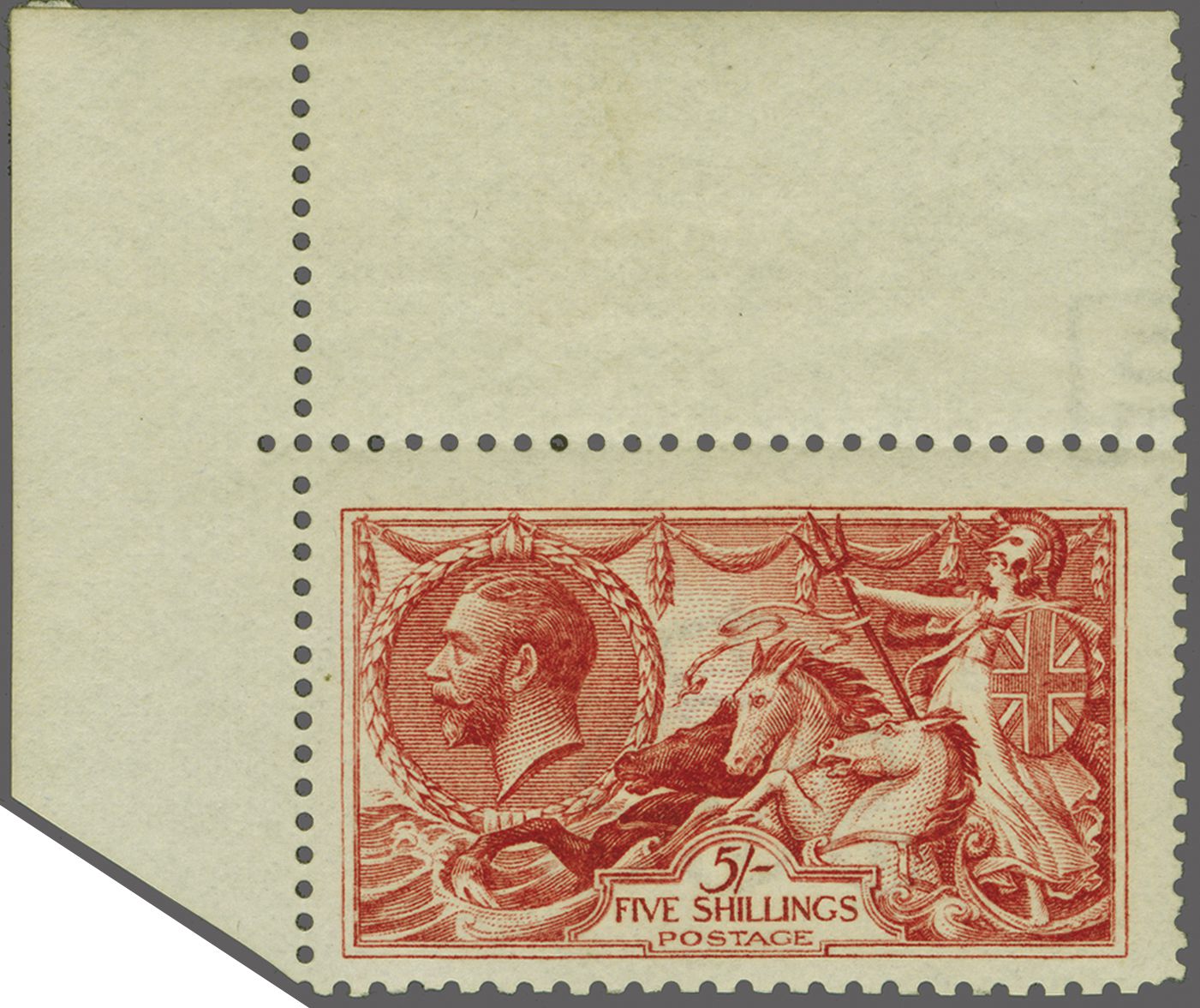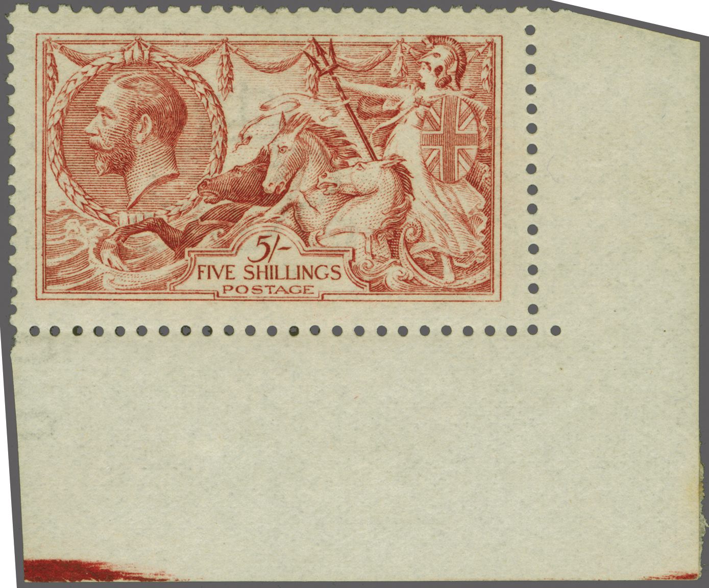 1915 (Oct): De La Rue, Seahorse 5 s. bright carmine, an unused example in a deep shade, corner marginal from top left of sheet, fresh and very fine, unmounted og. Gi = £ 1'100 (Image 1)