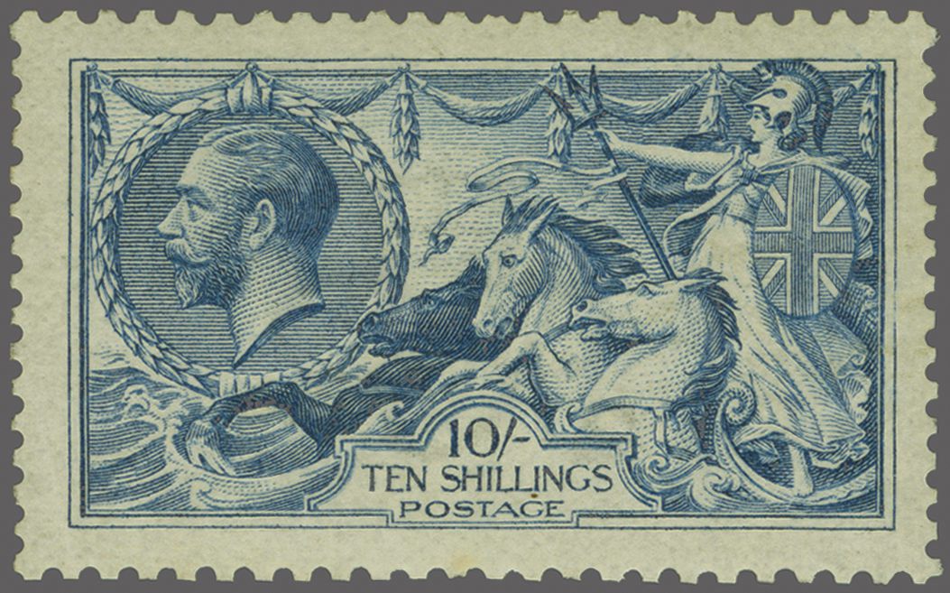 1915 (Dec): De La Rue, Seahorse 10 s. blue, an unused example in a rich shade, fresh and very fine, superb large part og. A rare stamp Gi = £ 2'500 (Image 1)