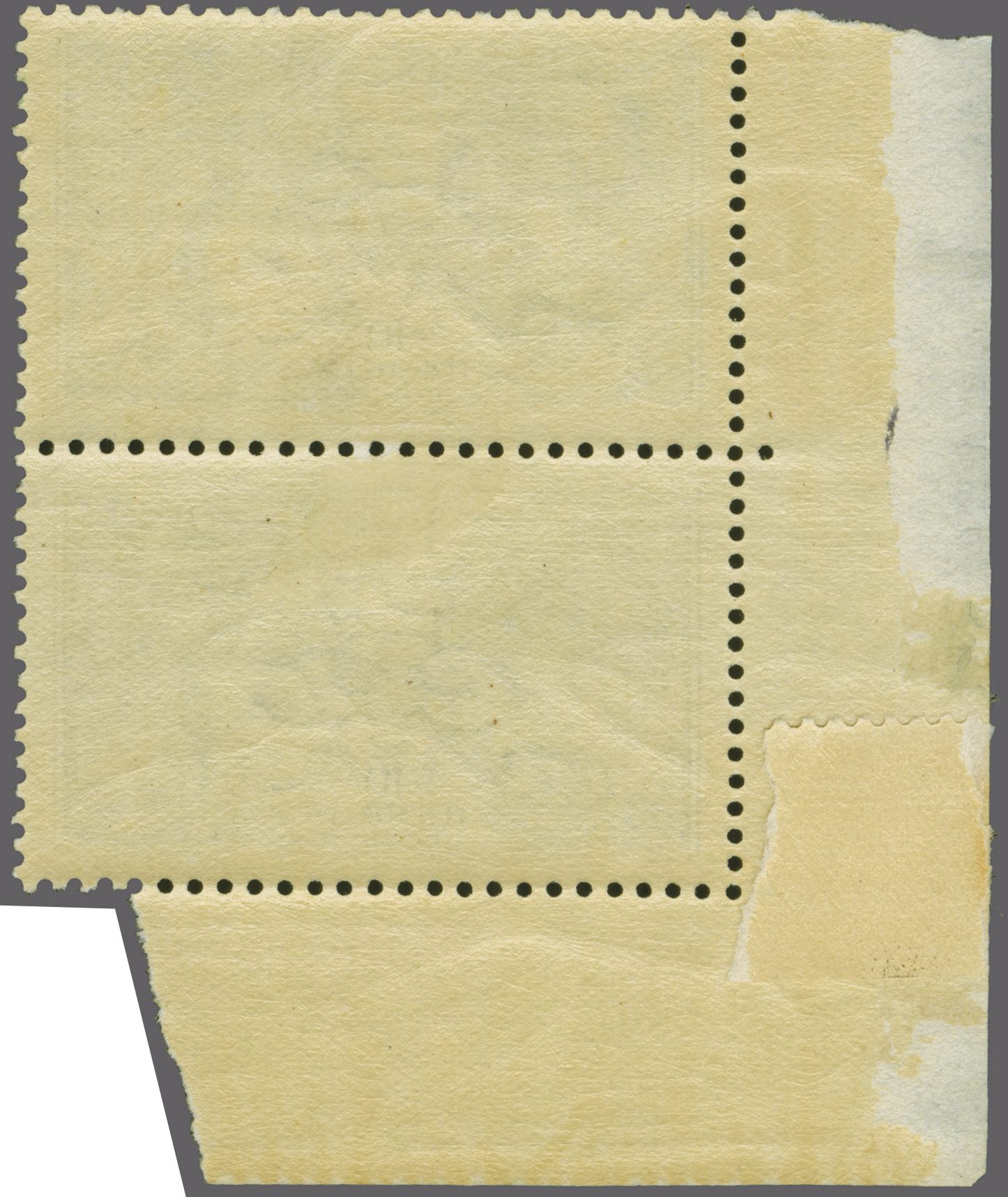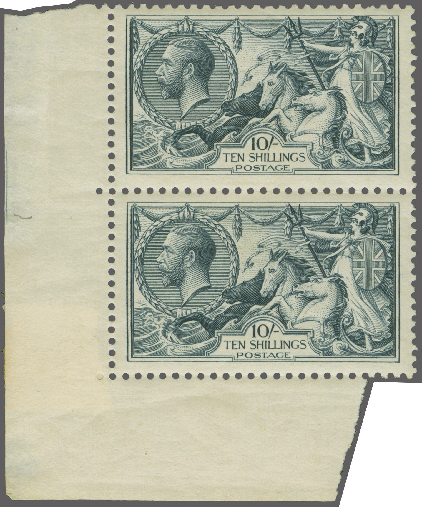 1918/19: Bradbury Wilkinson Seahorse 10 s. dull grey-blue, an unused vertical pair, corner marginal from lower left of the sheet, of fine fresh colour, typical minor wrinkle on gum and margin with backing paper adherence,