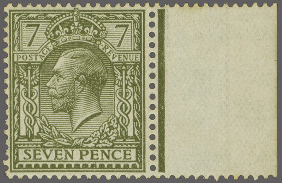 1913/15: 7 d. olive-grey, wmk. Block Cypher, an unused sheet marginal example, variety "No Watermark", fresh and very fine, unmounted og. Rare Gi N27(2)a = £ 750 (Image 1)