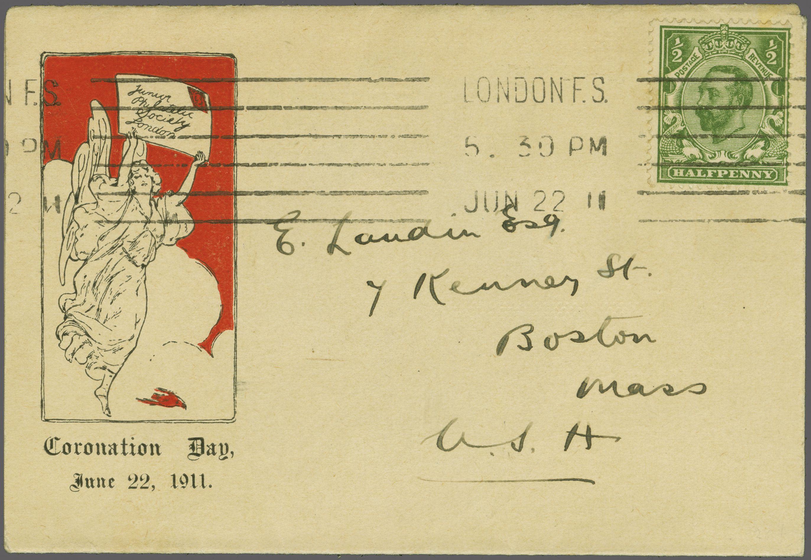 1911 (June 22): George V Downey Head ½ d. green, a used example on delightful fold-out "Coronation Day" printed letter-card produced by the Junior Philatelic Society, well tied by London machine cancel (June 22, 1911) of the