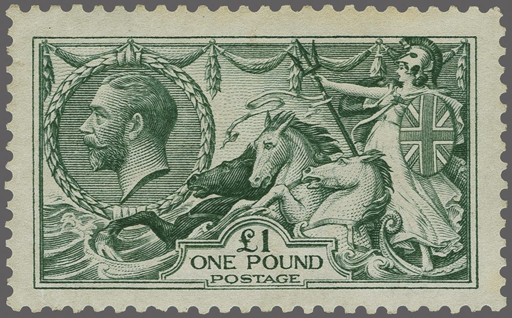 1913 (August 1): Waterlow Seahorse, £ 1 dull blue-green, large part original gum, well centred, fresh colour, light bends in places, a fine appearing example of this challenging stamp. Cert. RPSL (1986) Gi = £ 2'800