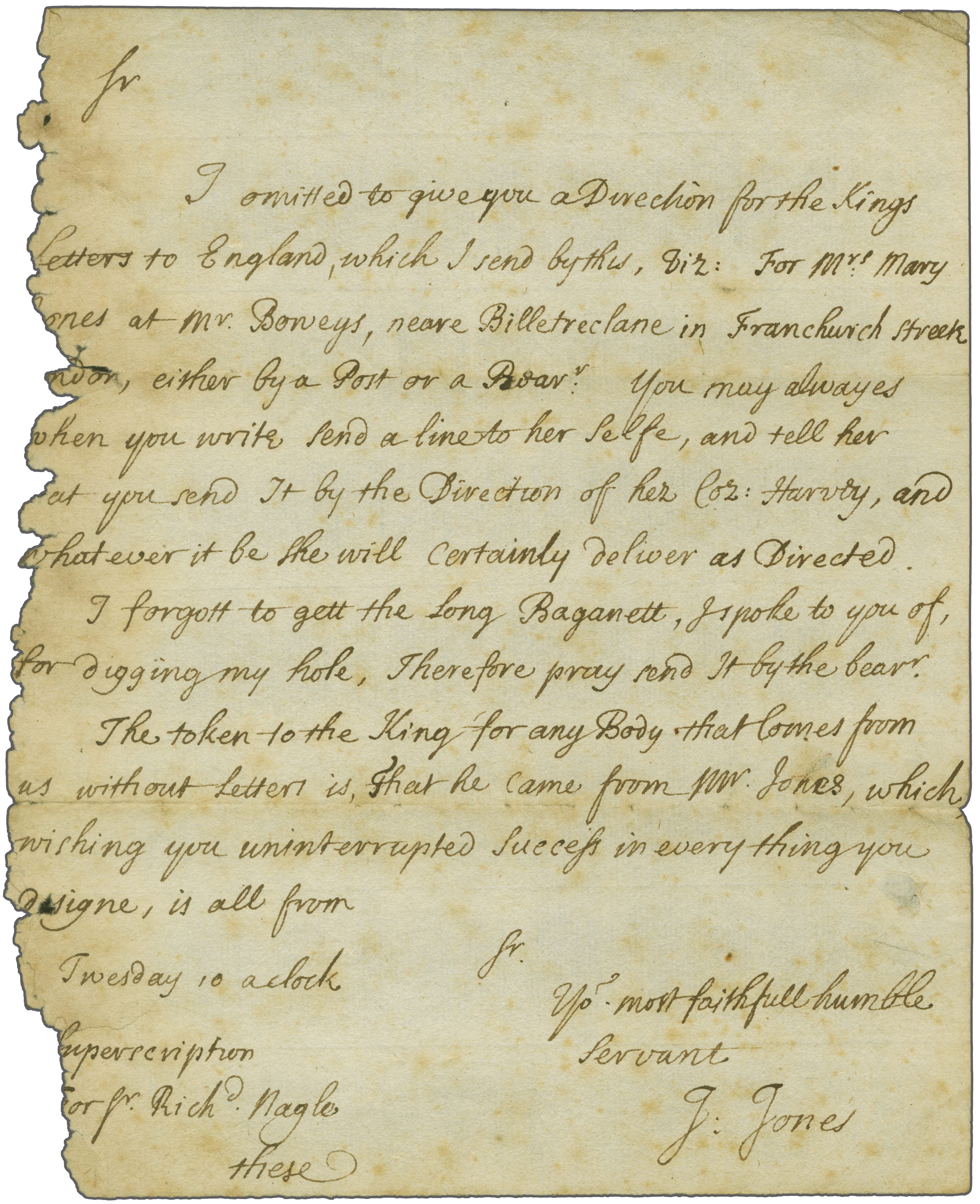 1655c.: Letter from "J. Jones" to the Attorney-General, Sir Richard Nagle, with directions for the safe sending of letters, to and from Charles II, currently in exile in France; "I omitted to give you a Direction for the Kings