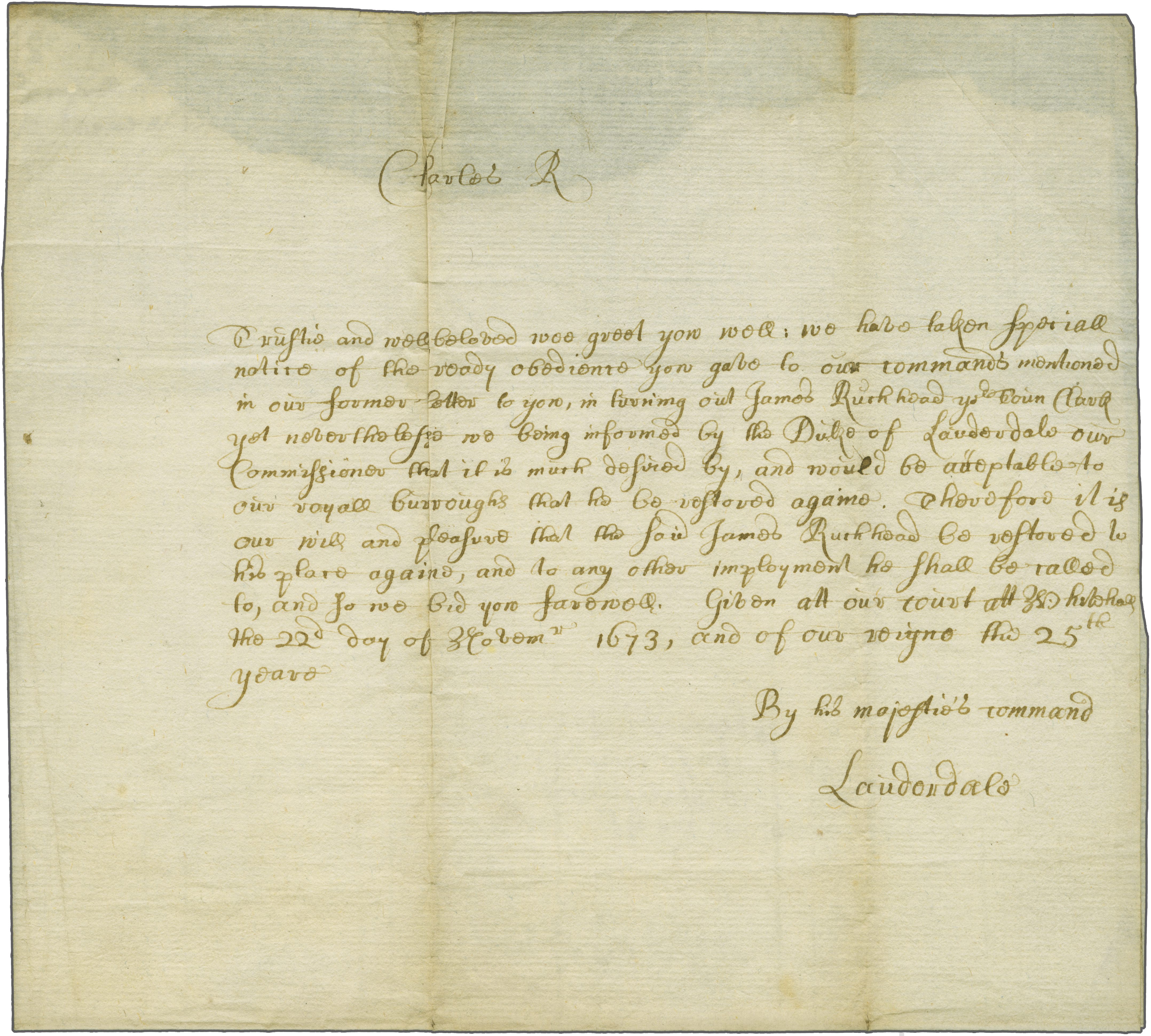 1673 (Nov 22): Entire letter from King Charles II to the Lord Provost of Edinburgh, Scotland written and signed at base by King Charles II's commissioner, the Duke of Lauderdale "Given at our Court...the 22 day of November