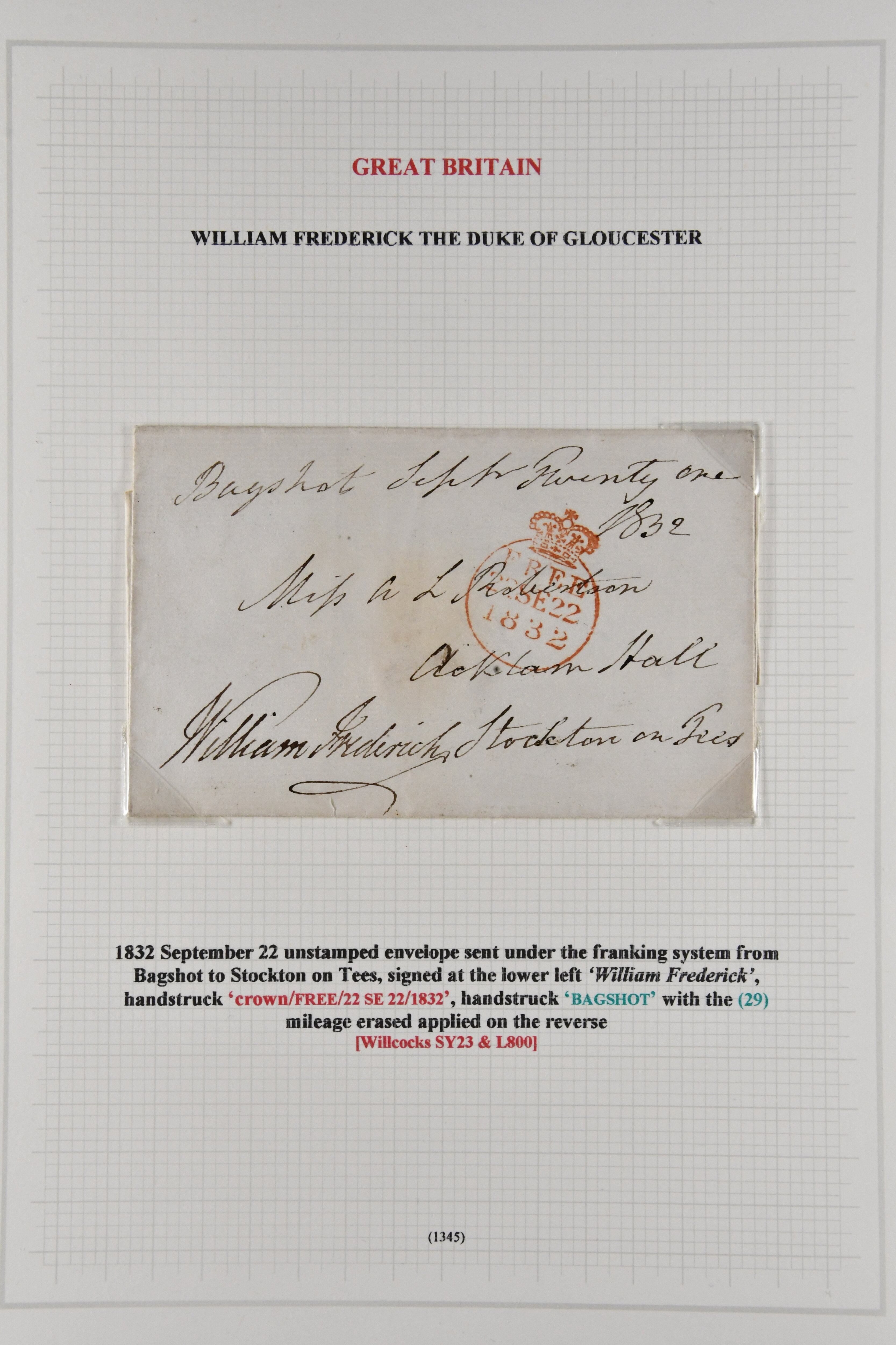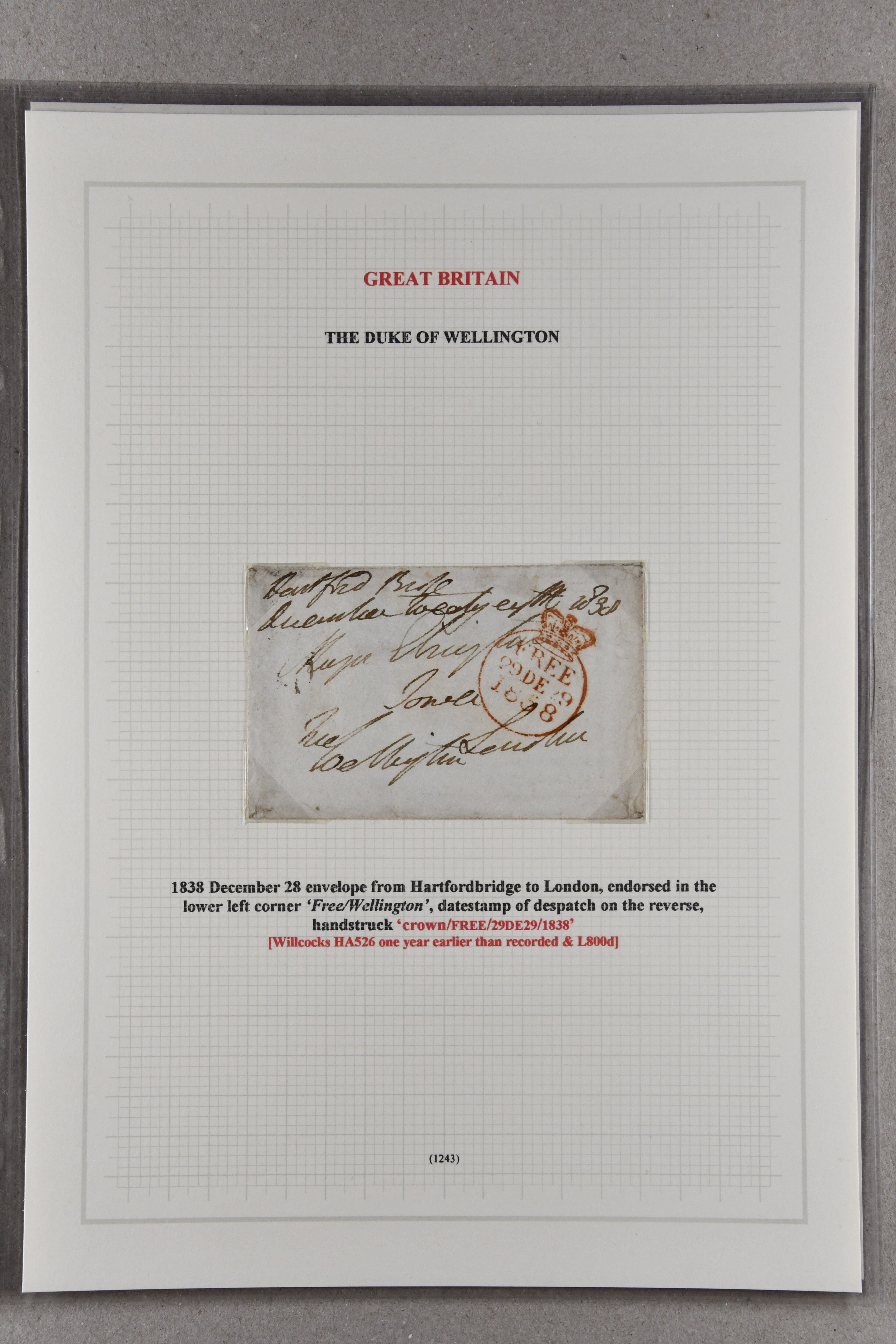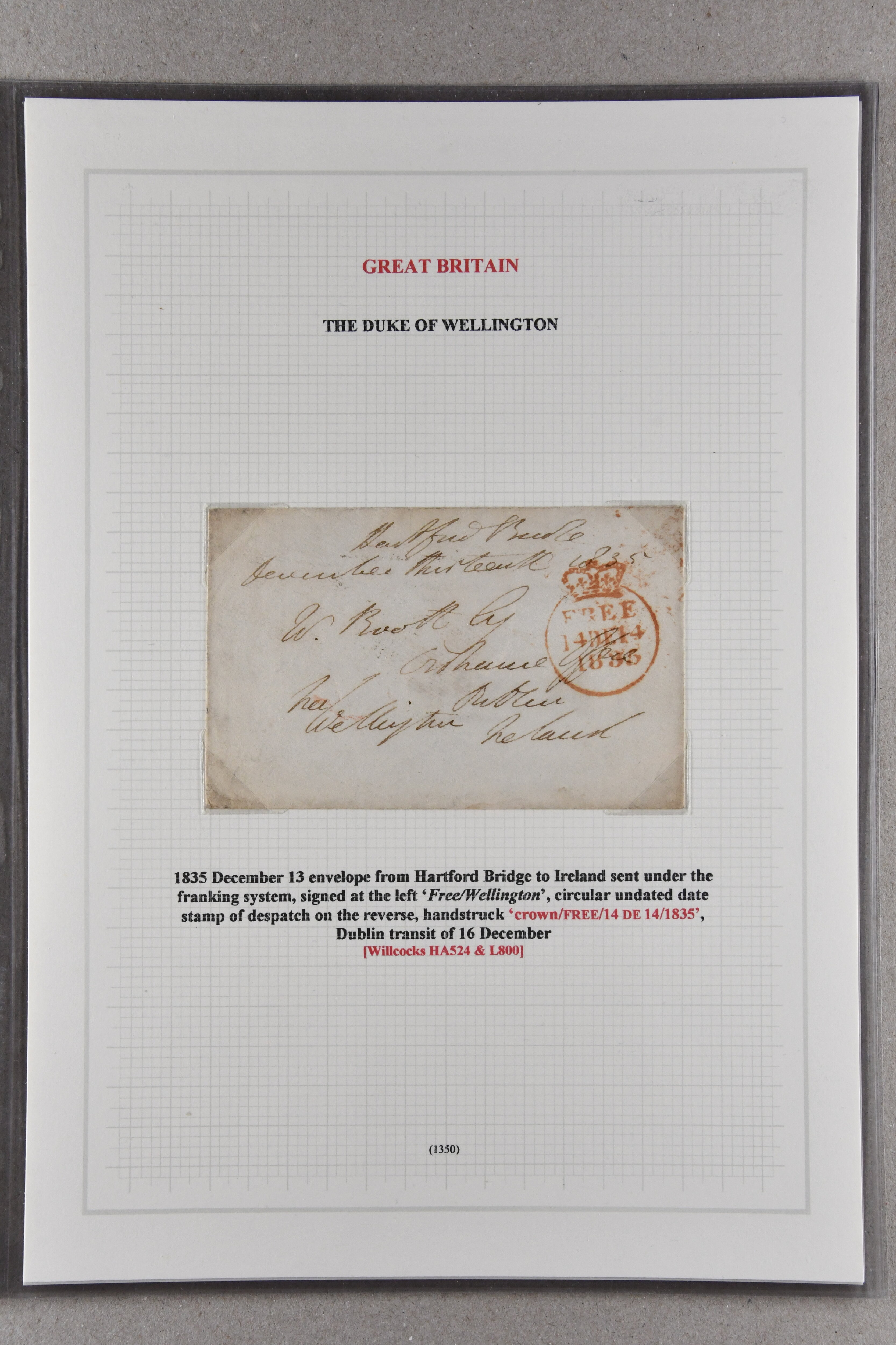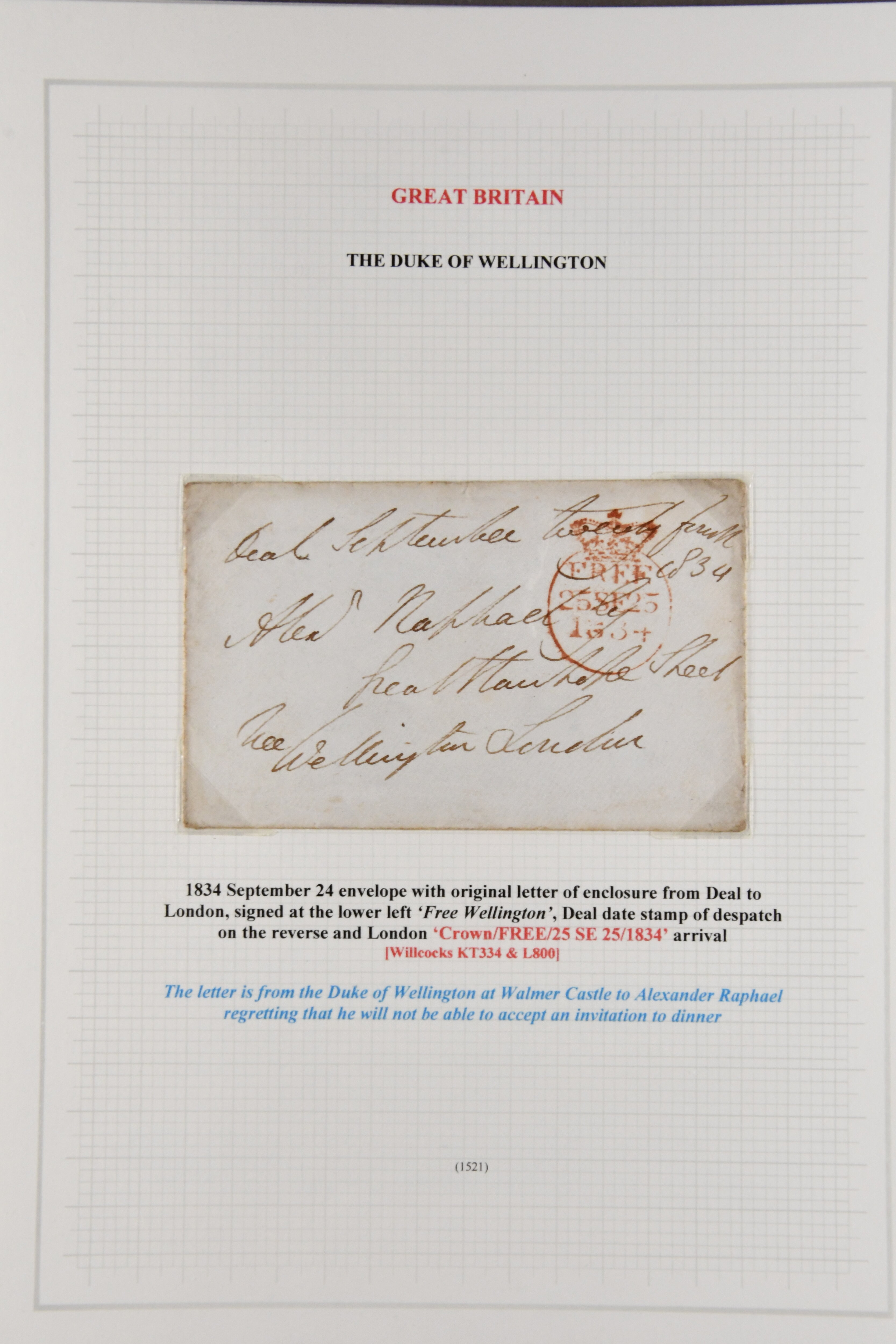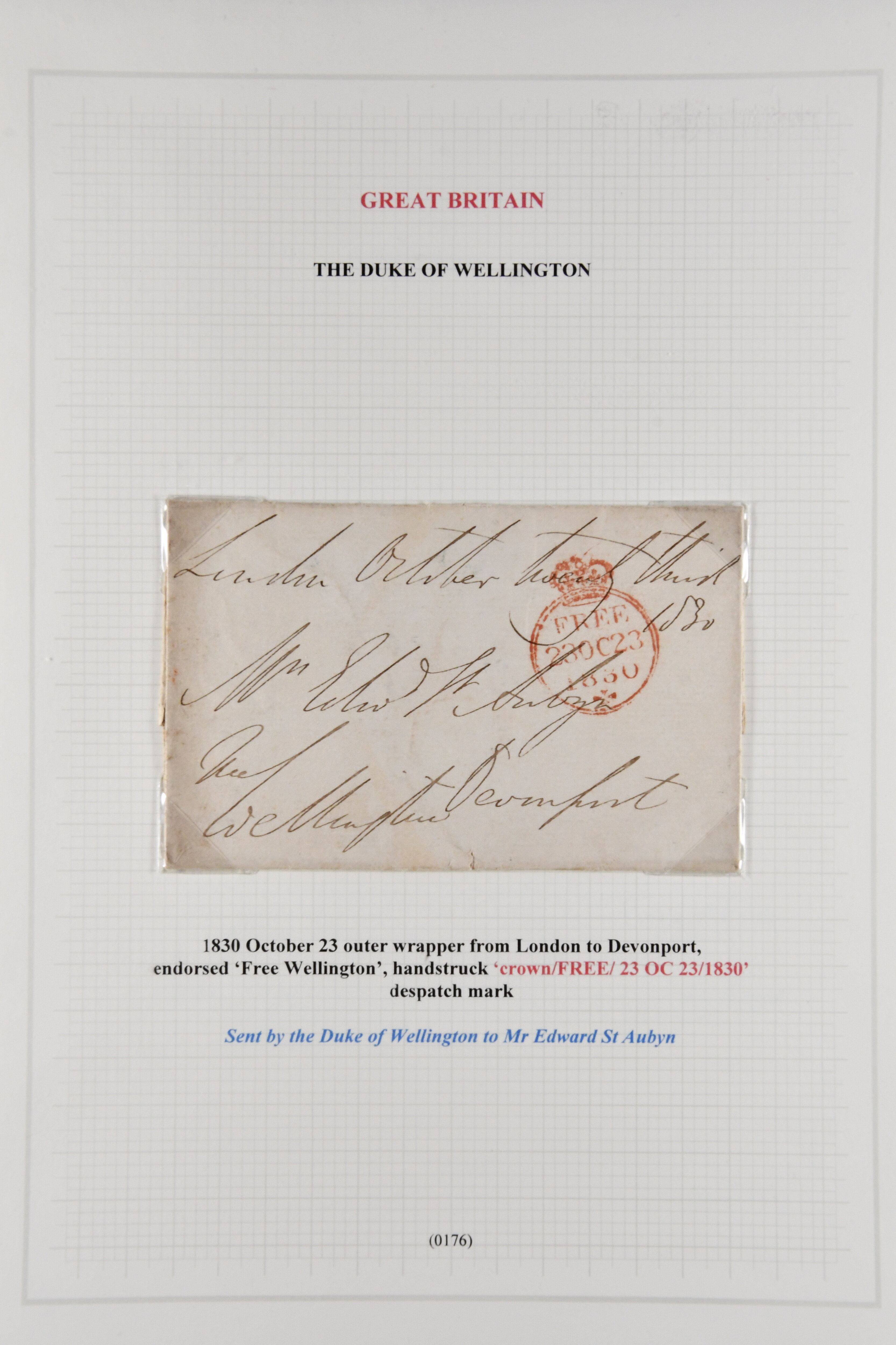 Duke of Wellington 1830/50: Collection on leaves (4 items) with 1830 Free Frank cover to Edward St. Aubyn in Devonport endorsed "Free Wellington" with "♚ / FREE" cds in red (Oct 23), 1834 Free Frank cover and