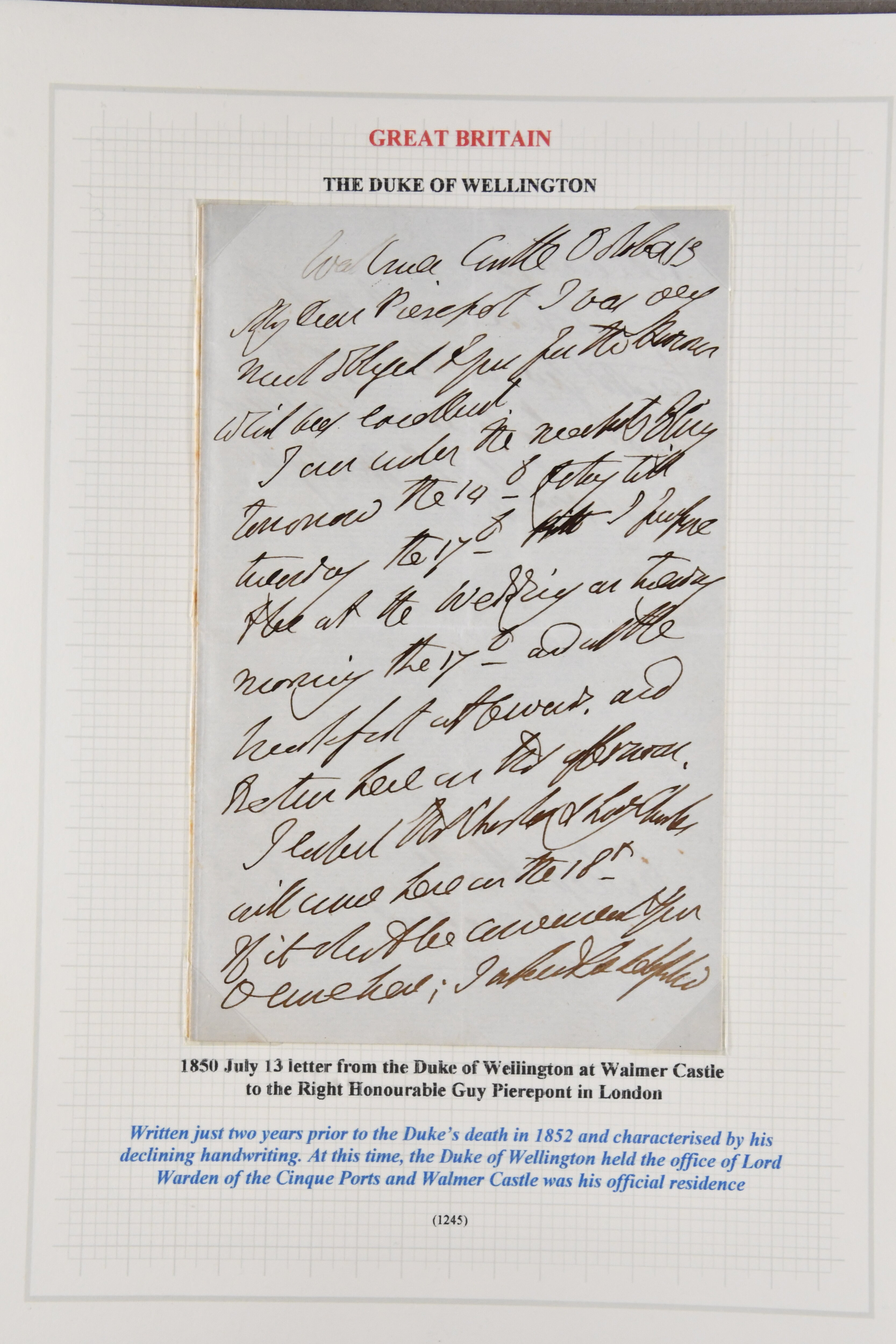 contents from Walmer Castle, Deal to London endorsed "Free Wellington" with "♚ / FREE" cds (Sept 25) in red; 1850 signed letter from Walmer Castle (with handwriting now getting worse due to age) to Guy Pierrepont; and printed Invitation to the