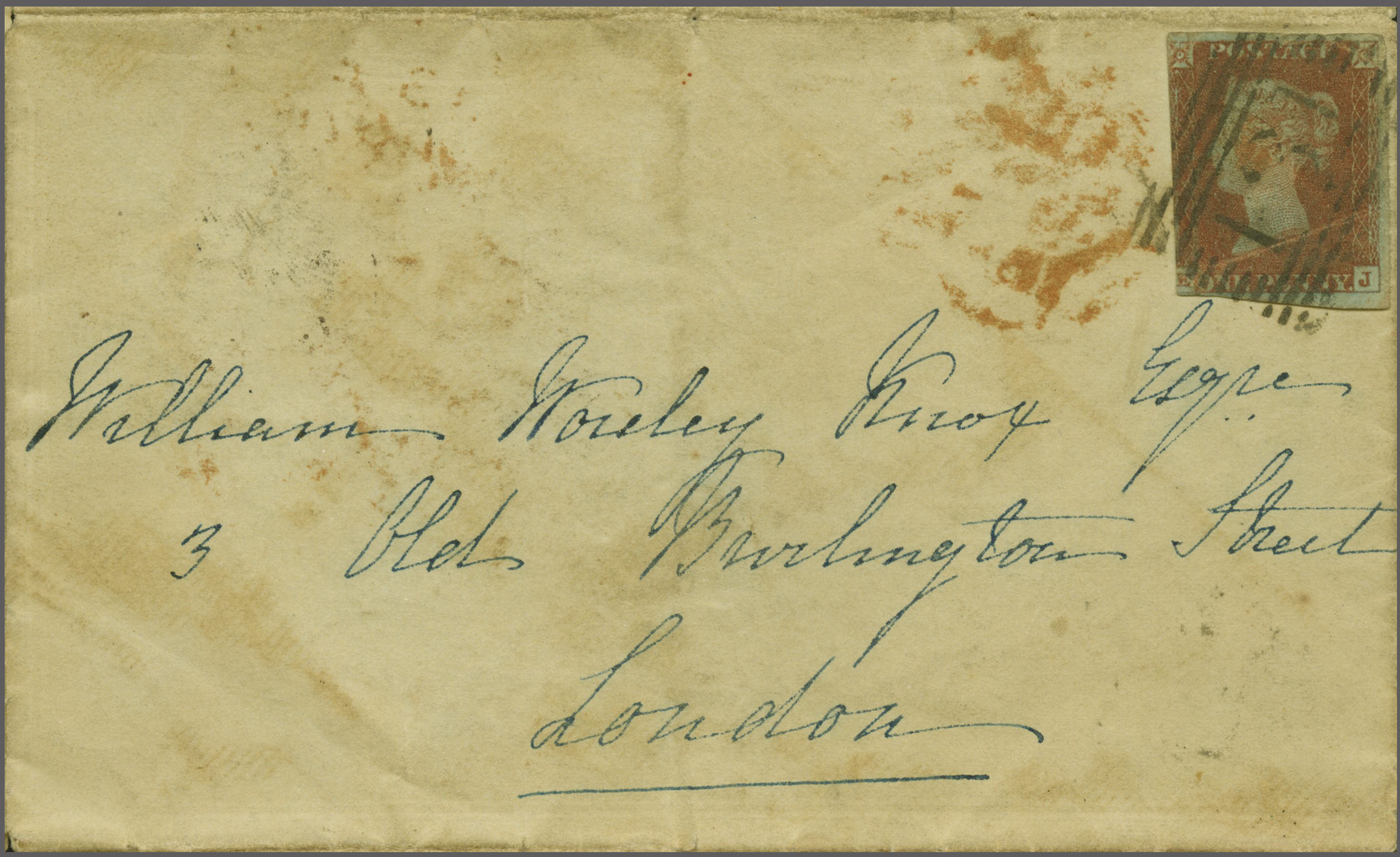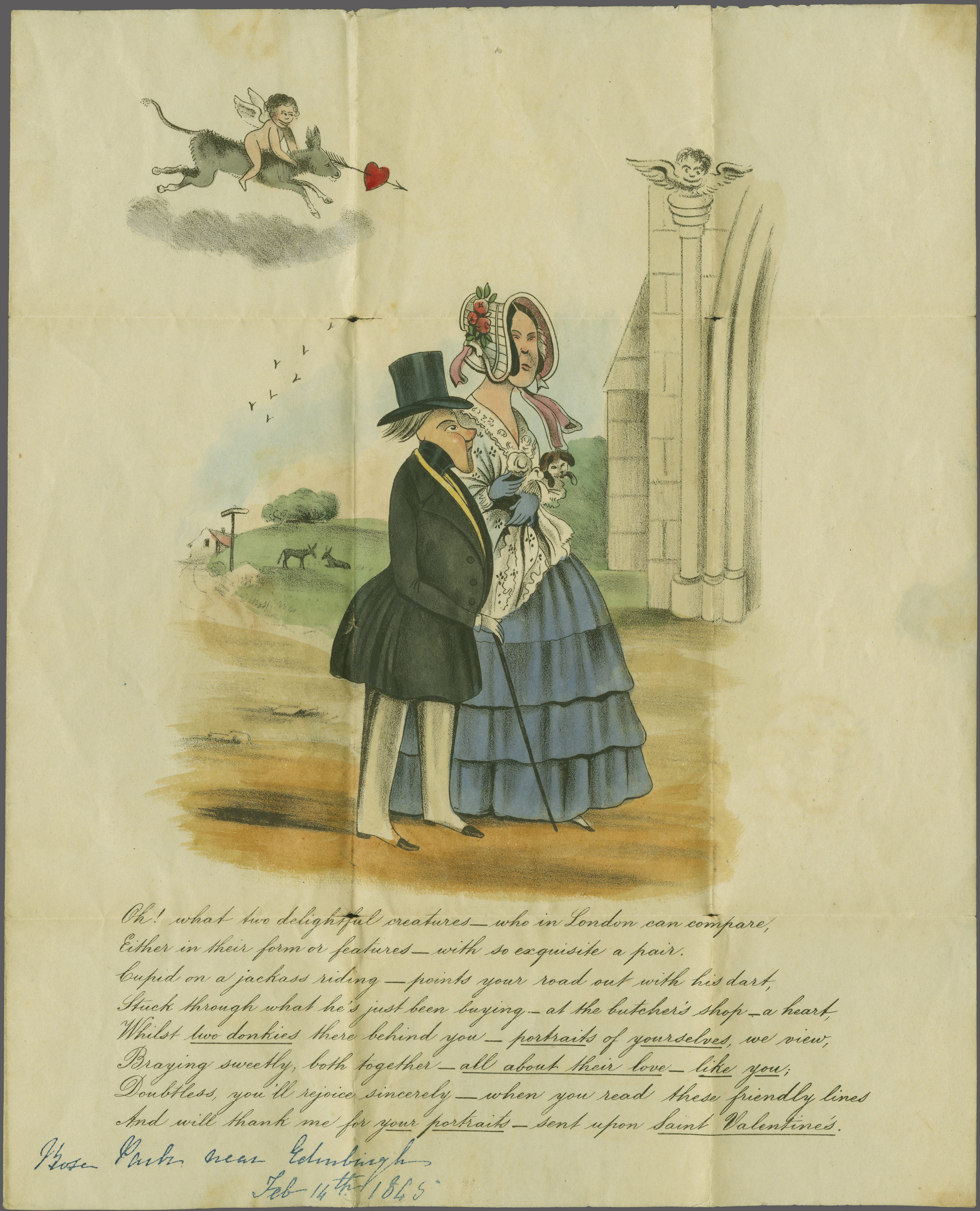 Valentine 1841: 1 d. red-brown on blued, a single example with shaved to good margins, used on delightful full page Printed Valentine entire from Edinburgh to London, tied by "131" numeral obliterator with despatch (Feb 11)