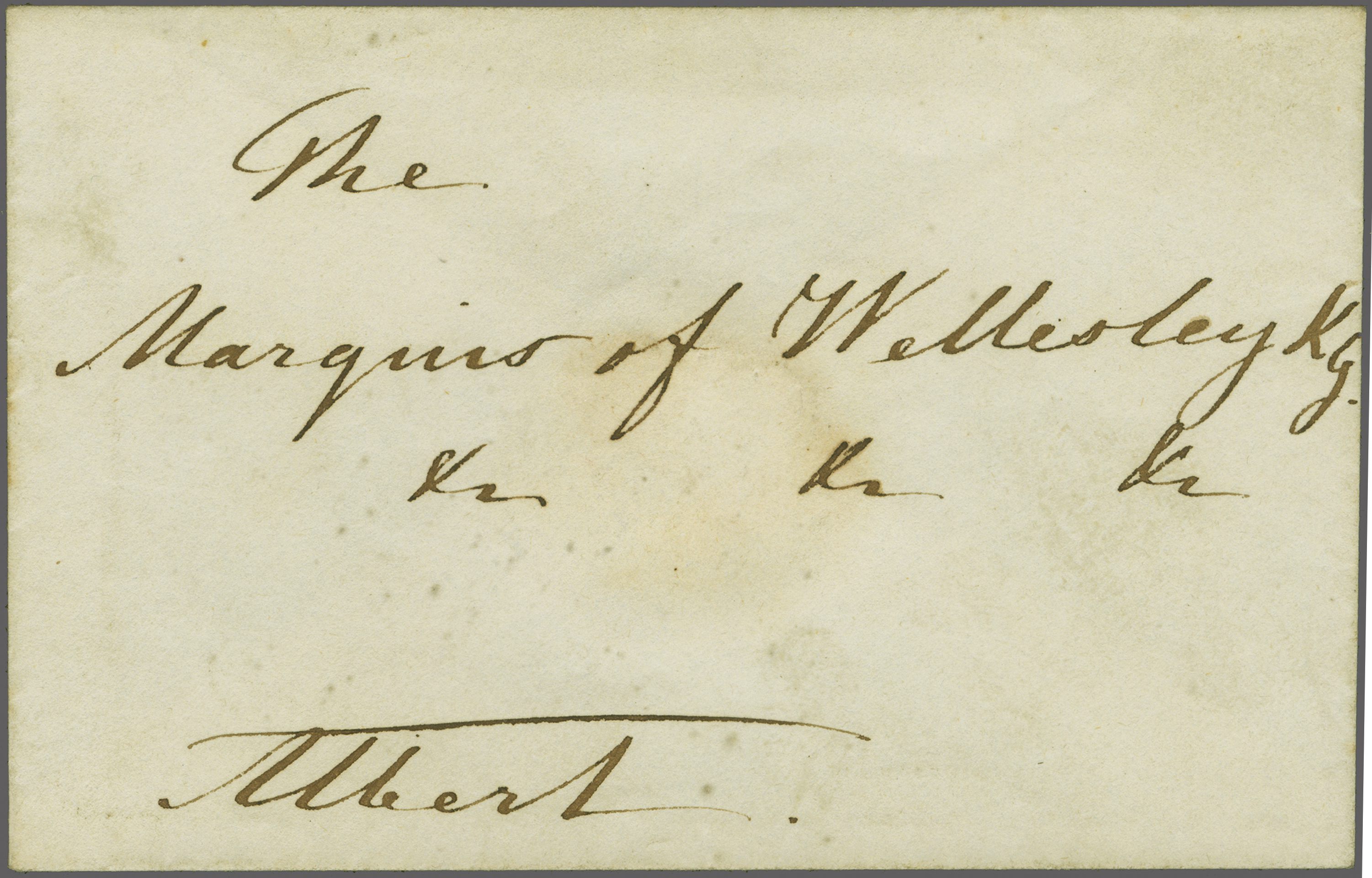 H.R.H. Prince Albert 1850c.: Envelope written in the hand of Prince Albert, addressed to the Marquis of Wellesley (Duke of Wellington) and signed at lower left "Albert". Prince Albert's royal wax seal on reverse, complete in